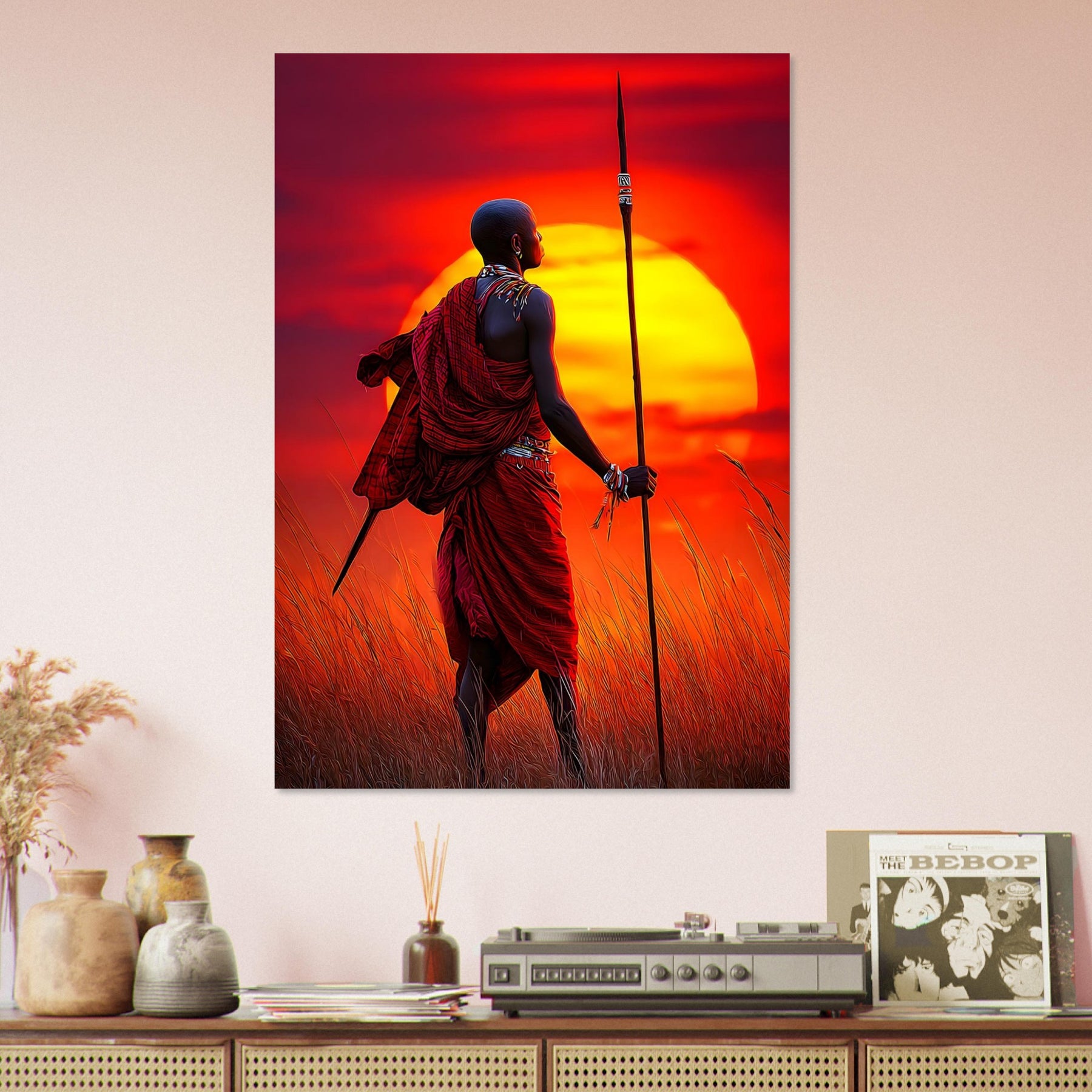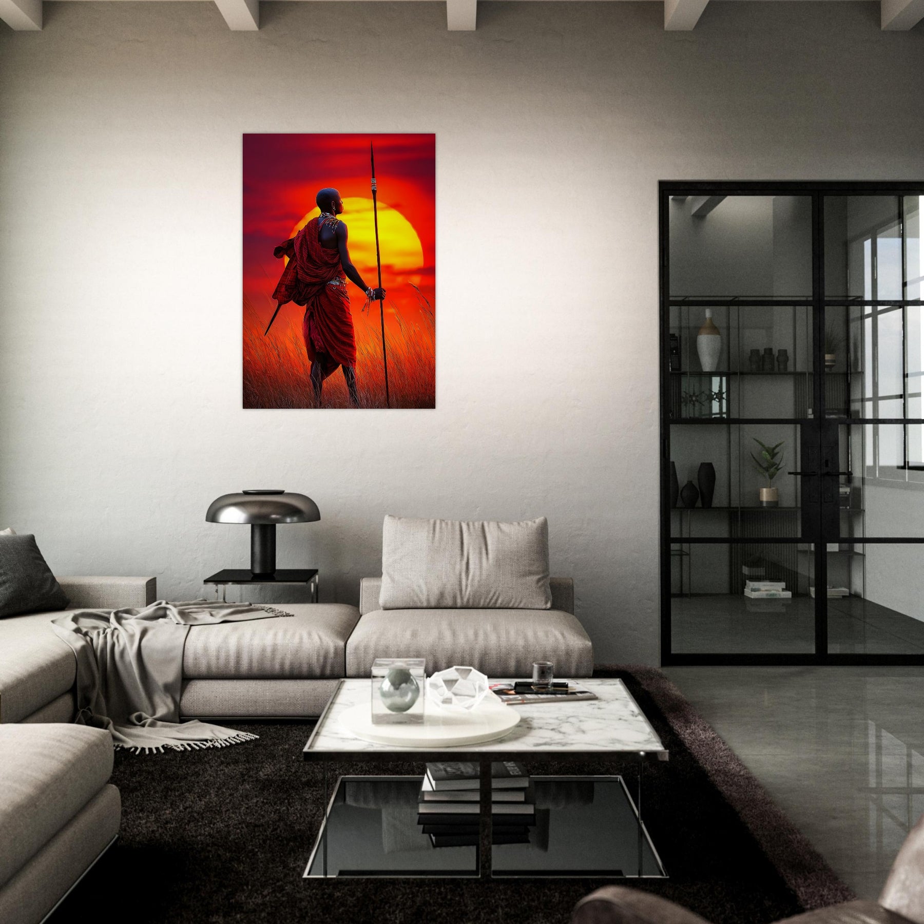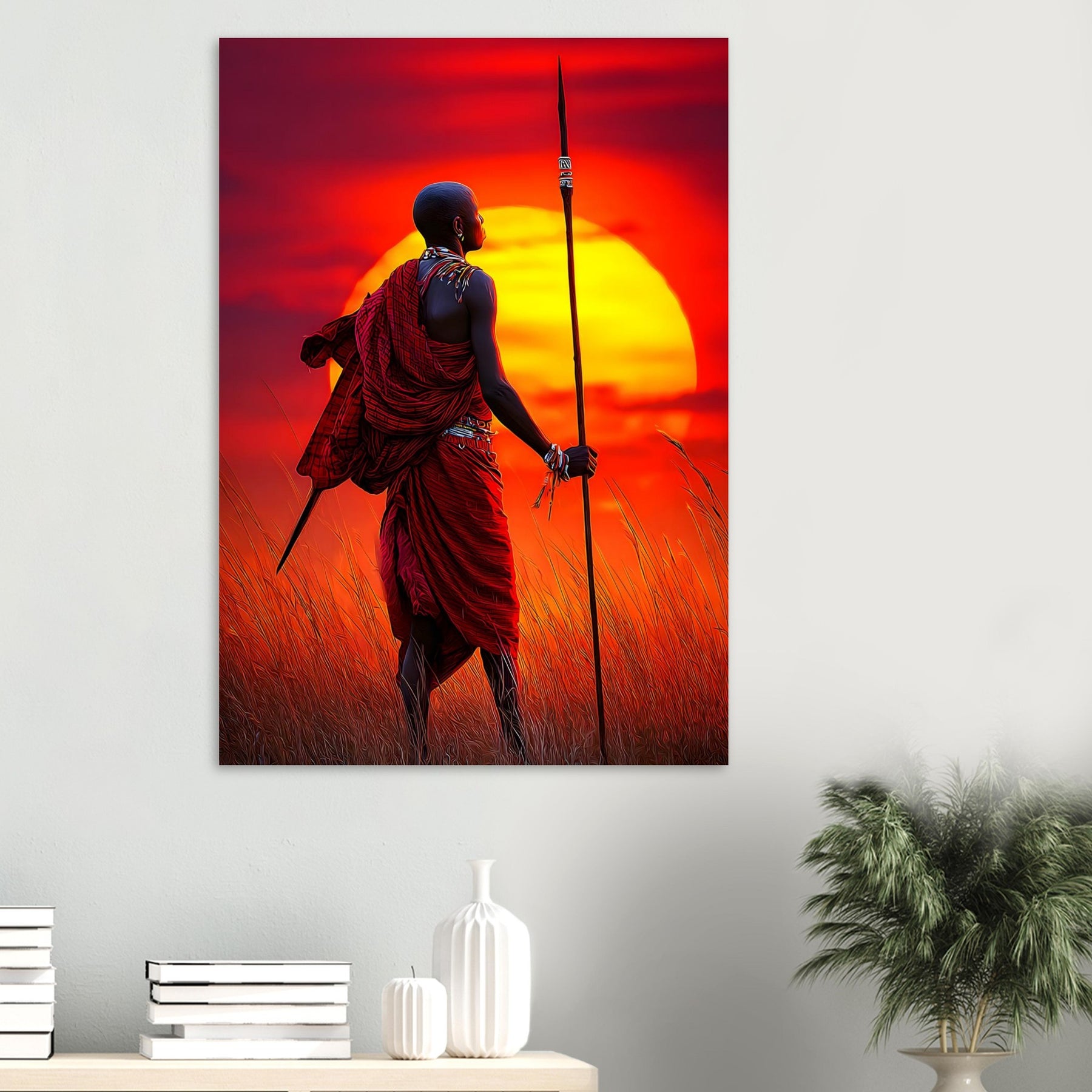 Add strength and cultural depth to your space with Maasai Sunset Warrior, a striking aluminum wall art featuring a proud Maasai warrior standing against a vibrant sunset. The powerful composition and rich colors celebrate heritage, resilience, and the beauty of tradition in a bold, modern presentation.