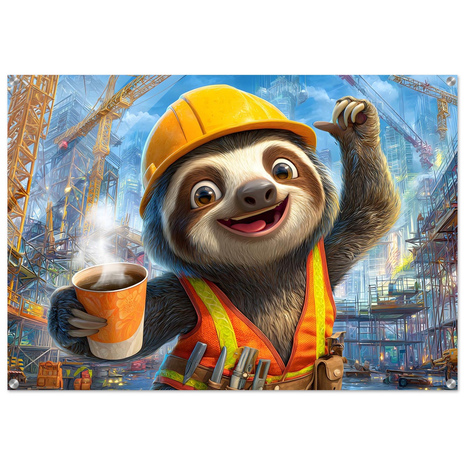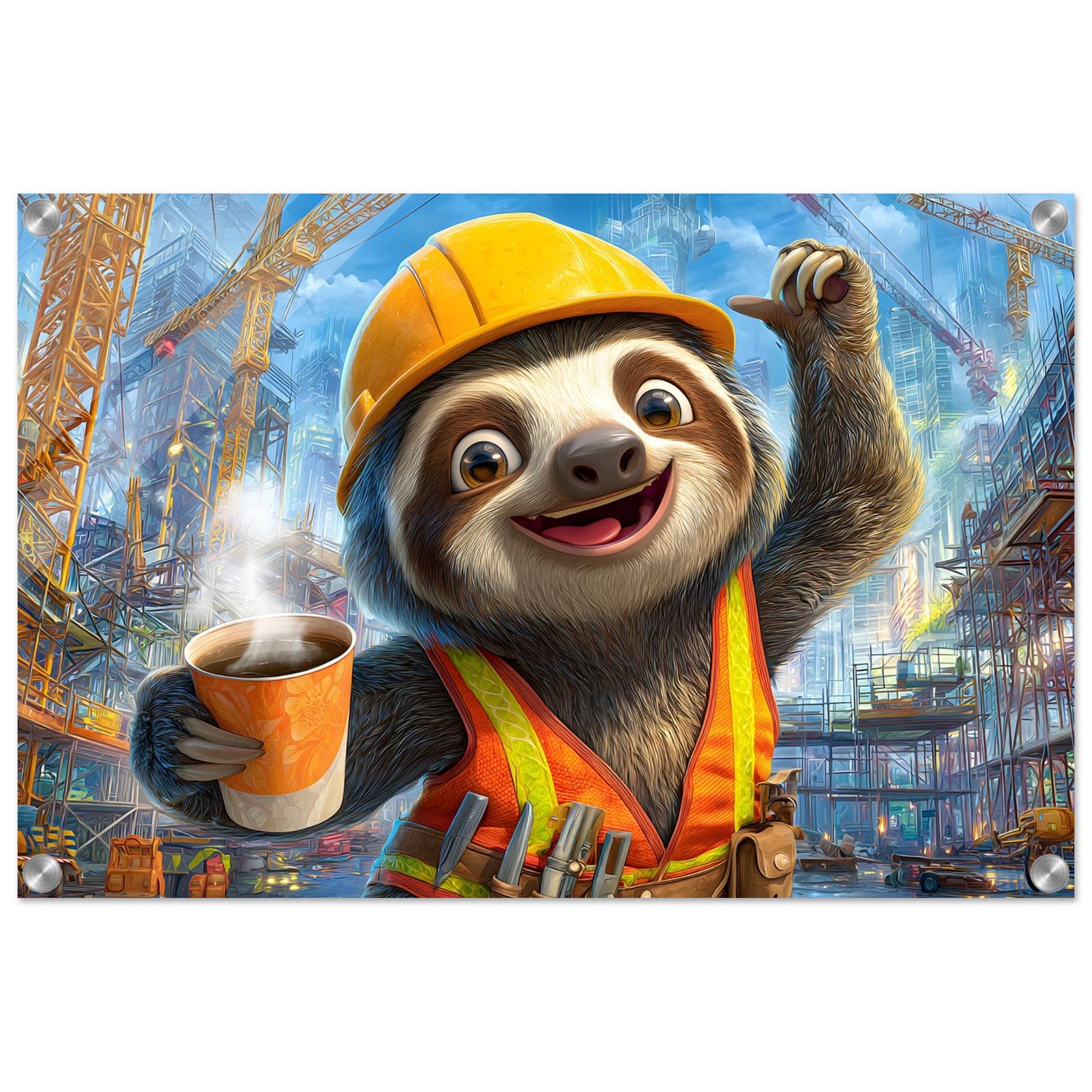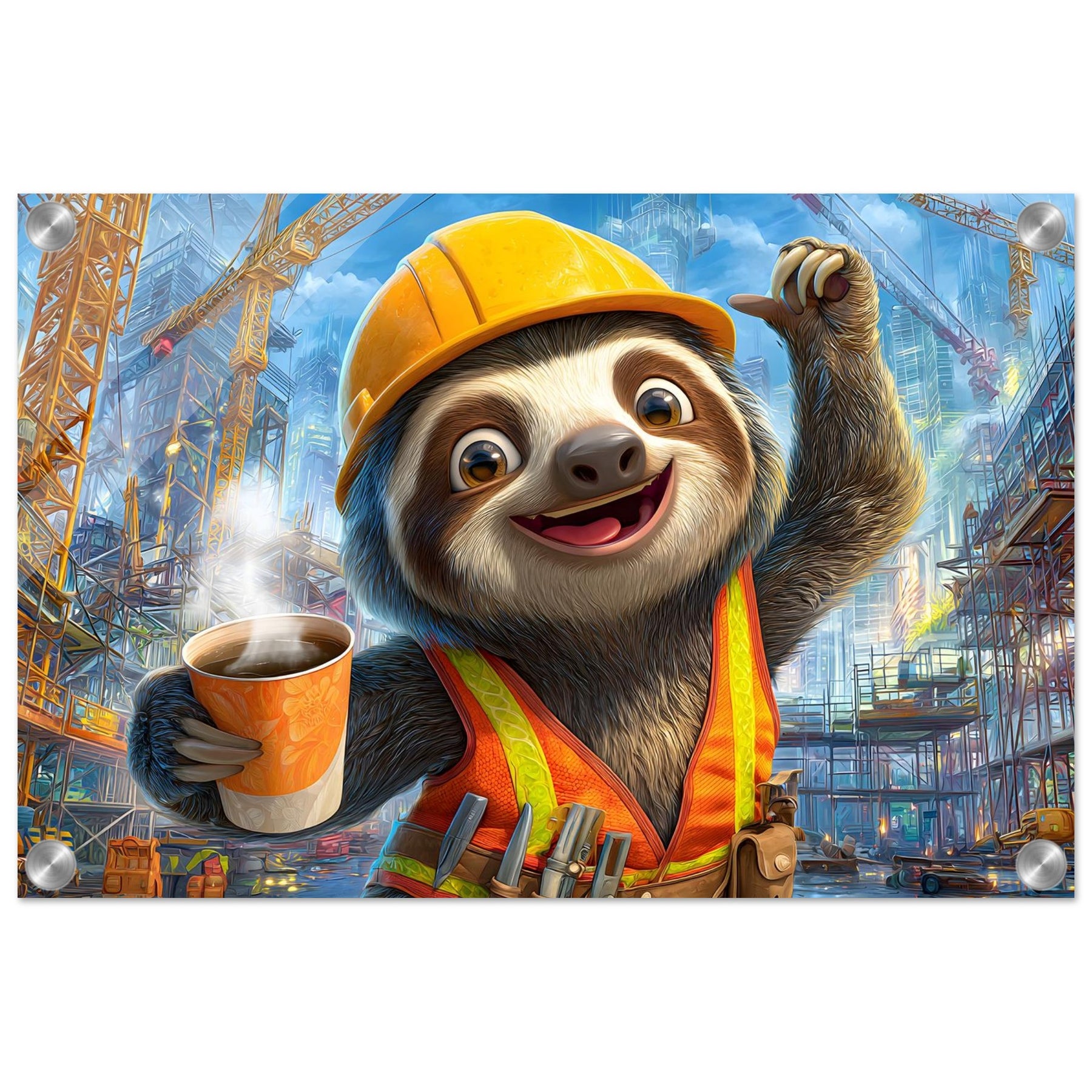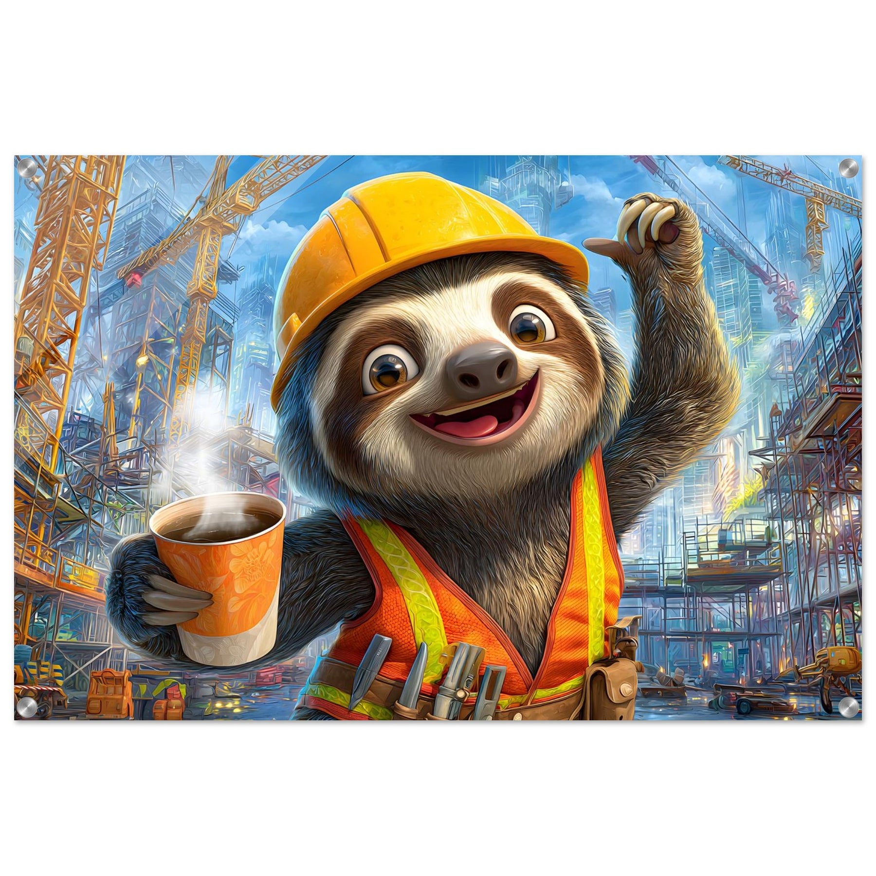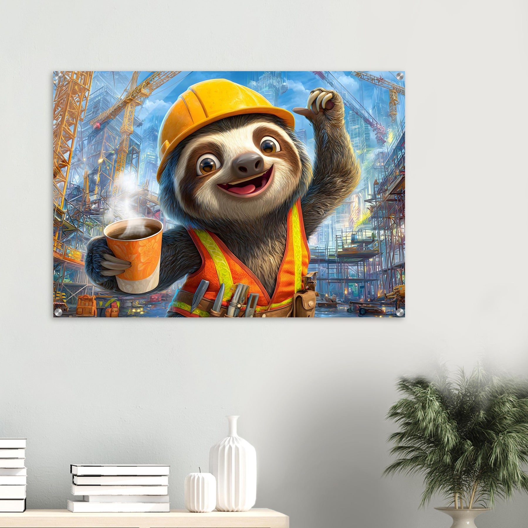 Transform your child’s space with Little Builder, a vibrant acrylic wall art piece featuring a happy sloth builder in a lively construction setting. The glossy acrylic surface enhances color brightness and detail, creating a bold and joyful focal point.