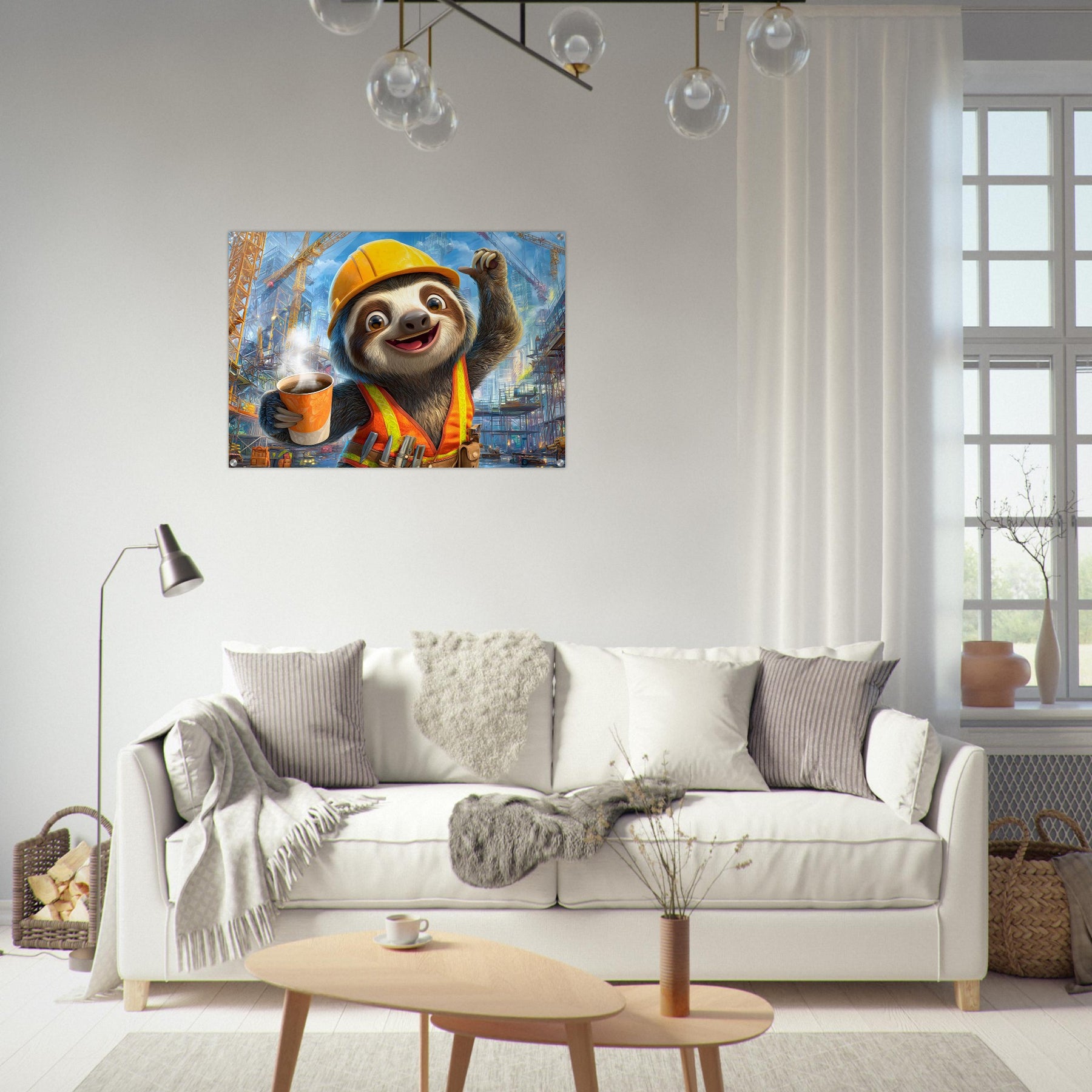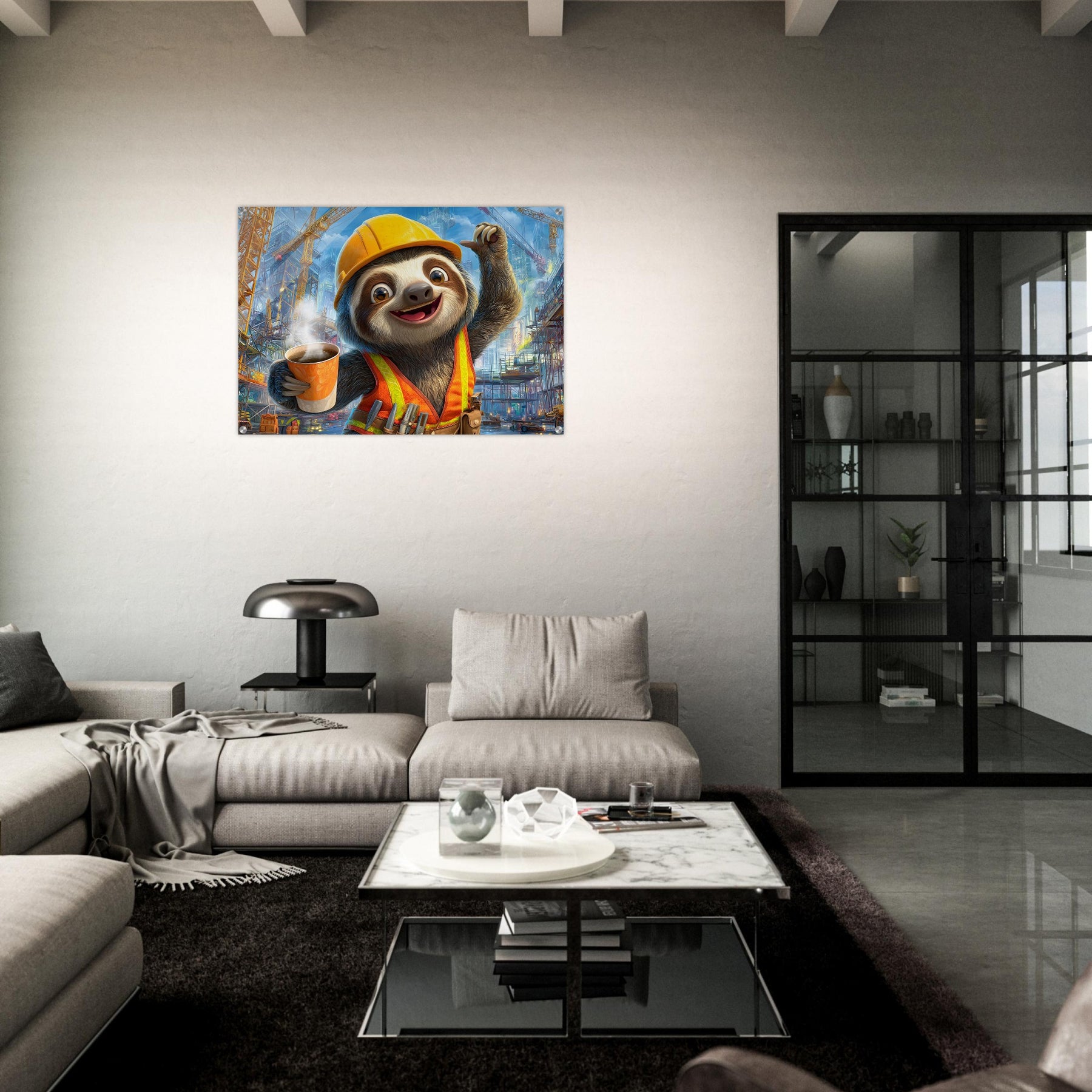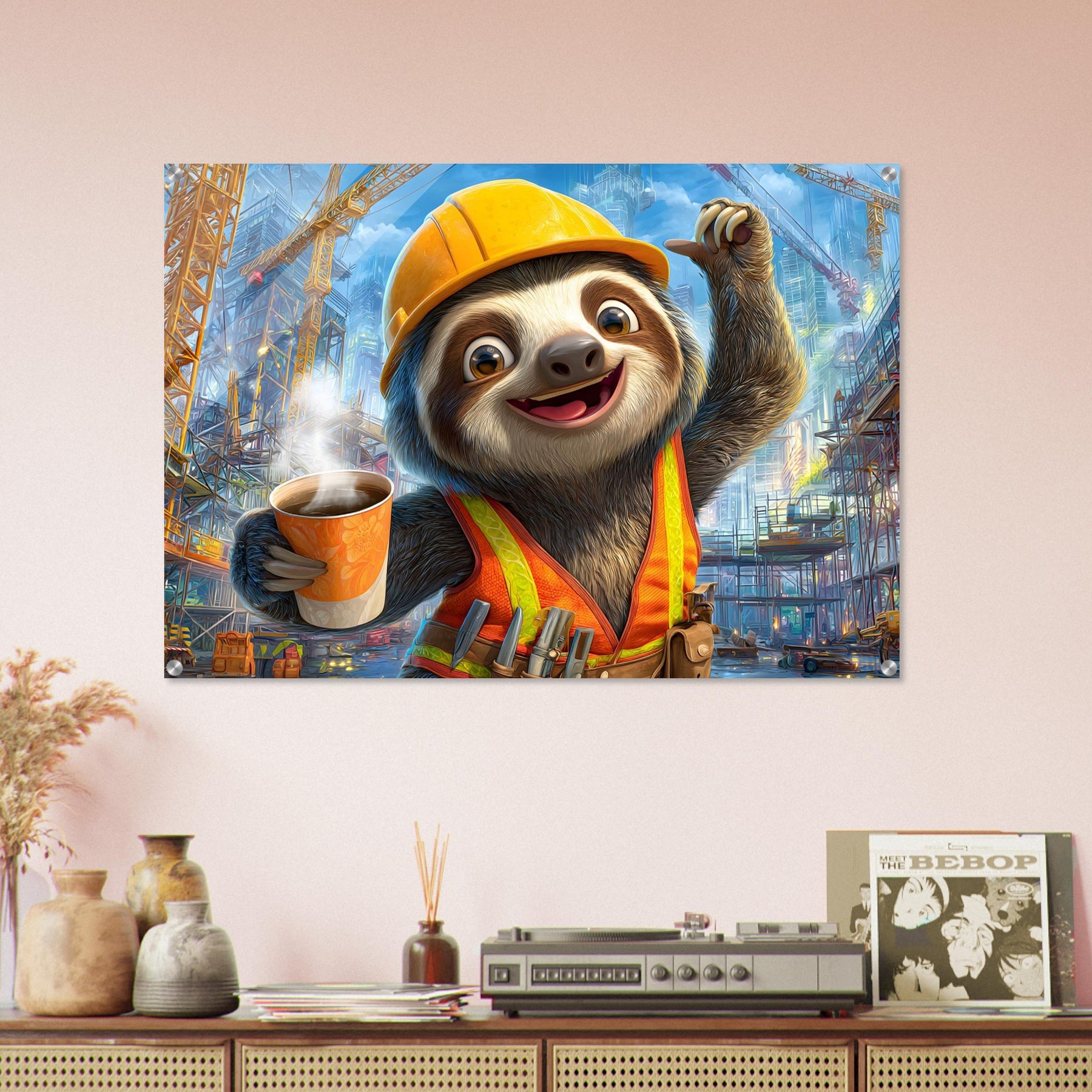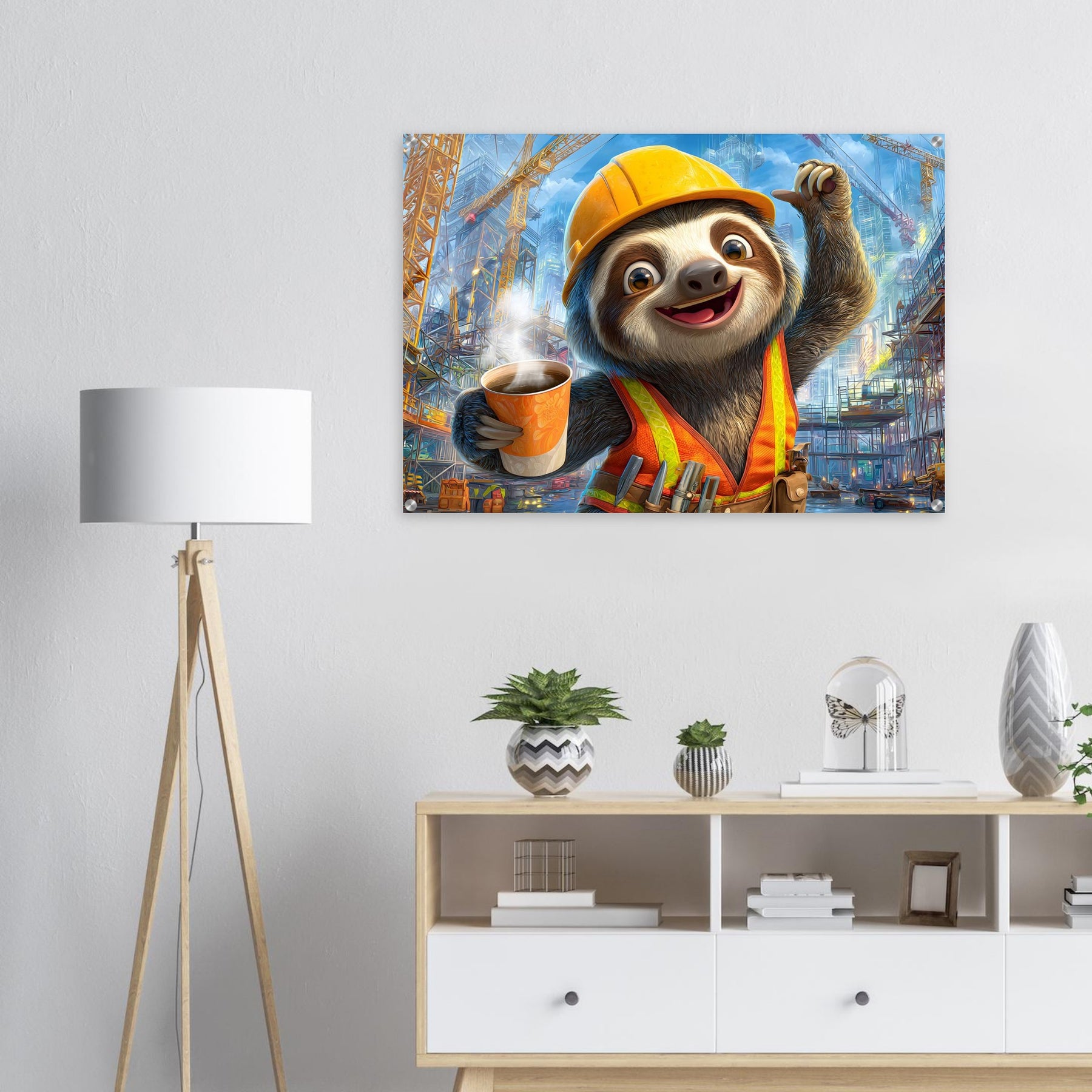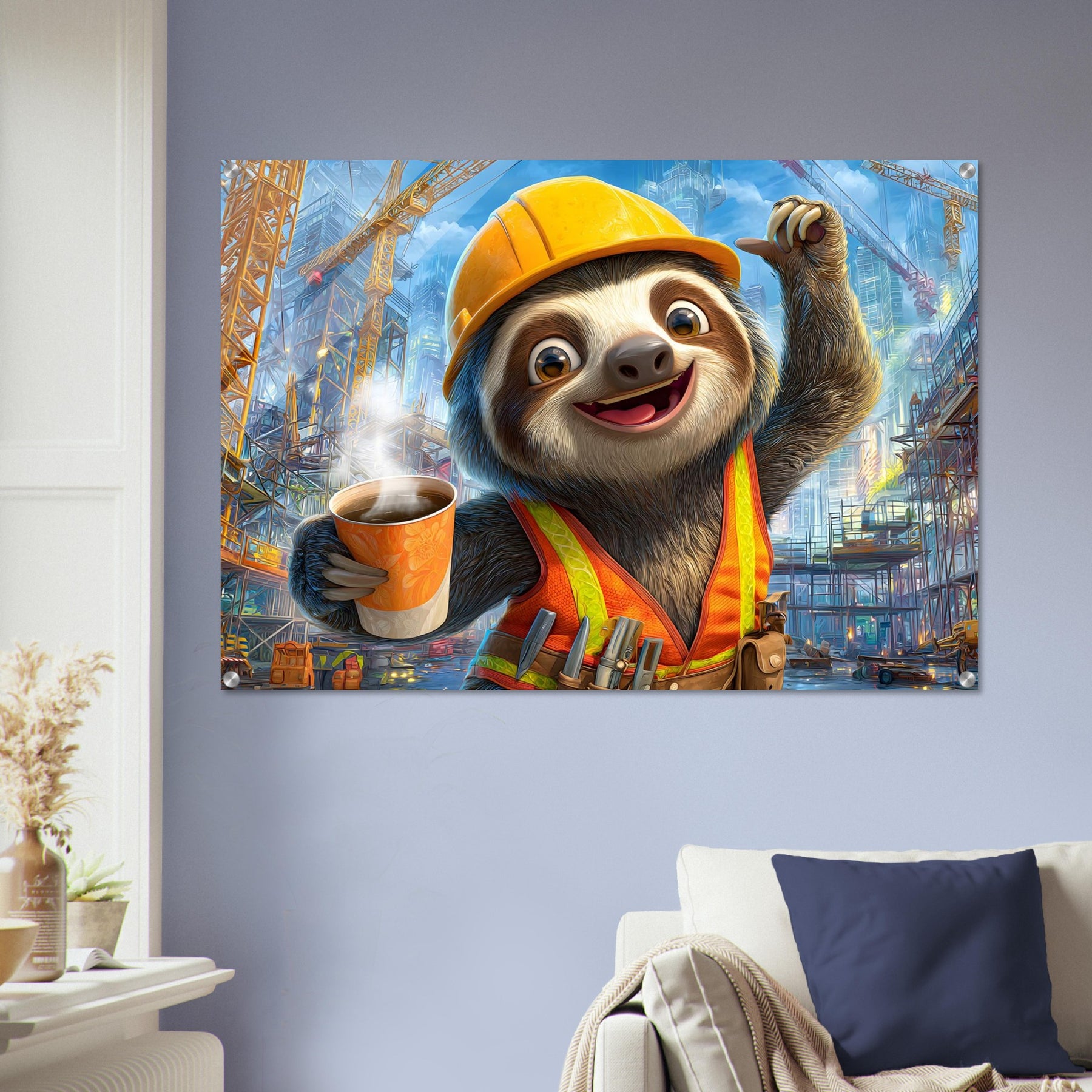 Transform your child’s space with Little Builder, a vibrant acrylic wall art piece featuring a happy sloth builder in a lively construction setting. The glossy acrylic surface enhances color brightness and detail, creating a bold and joyful focal point.