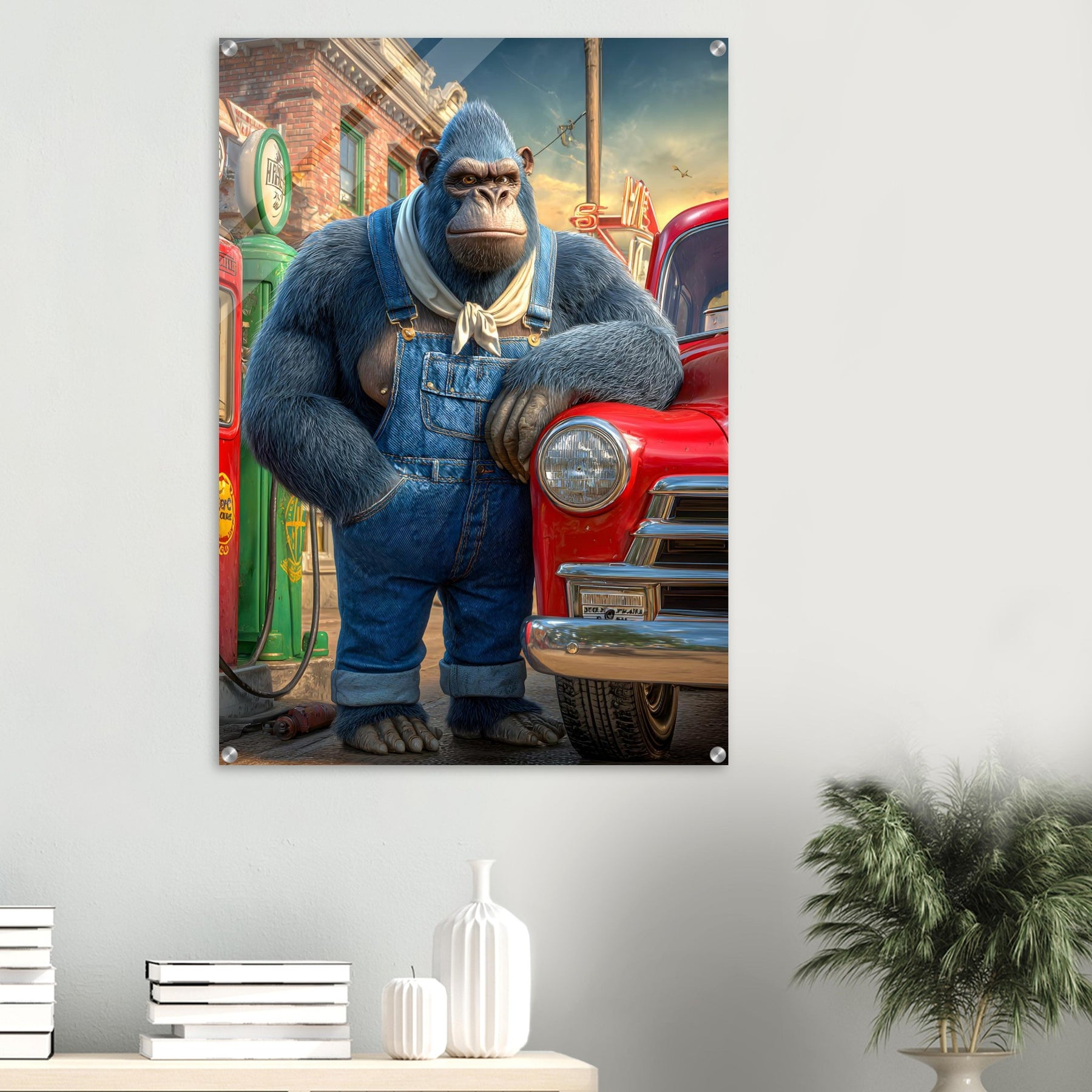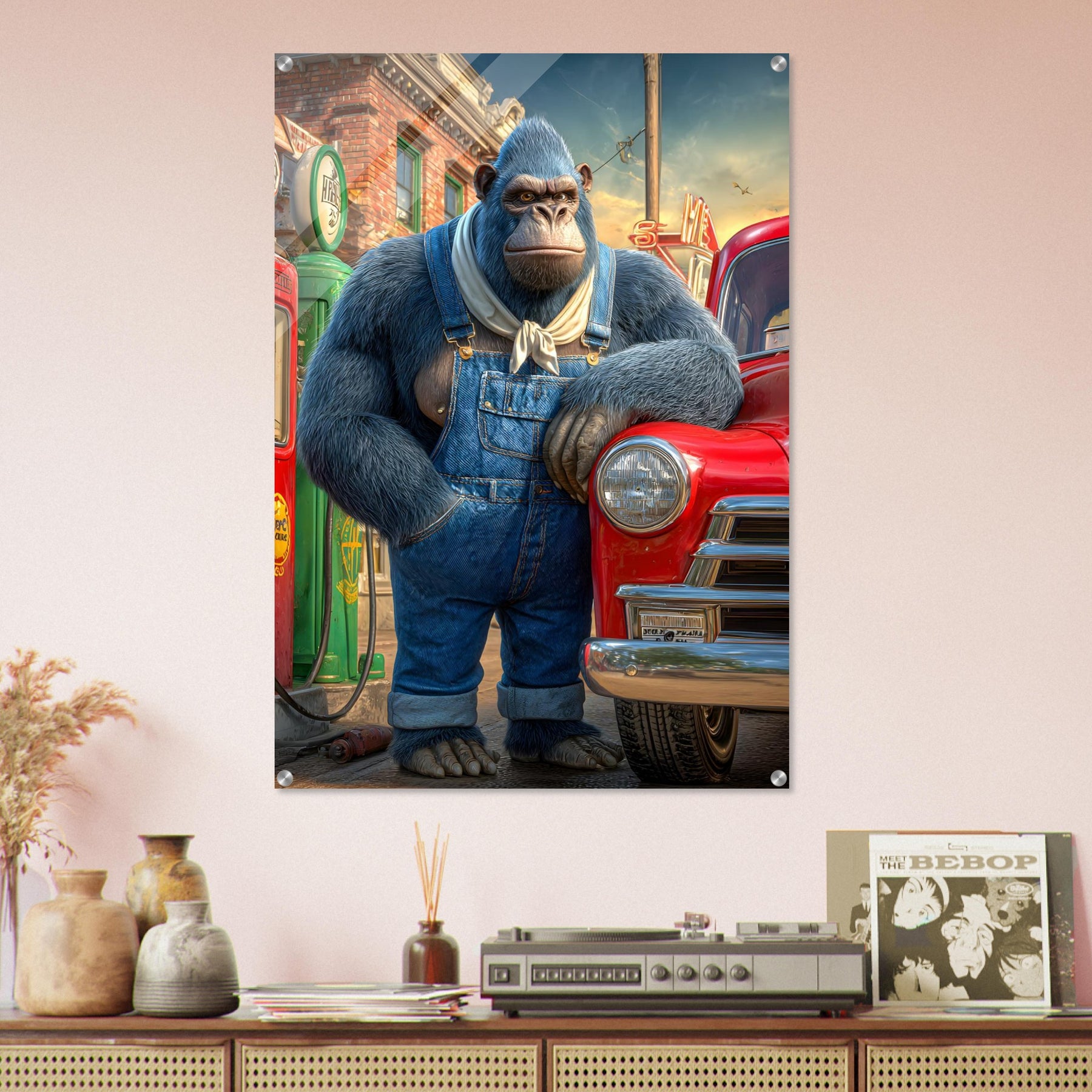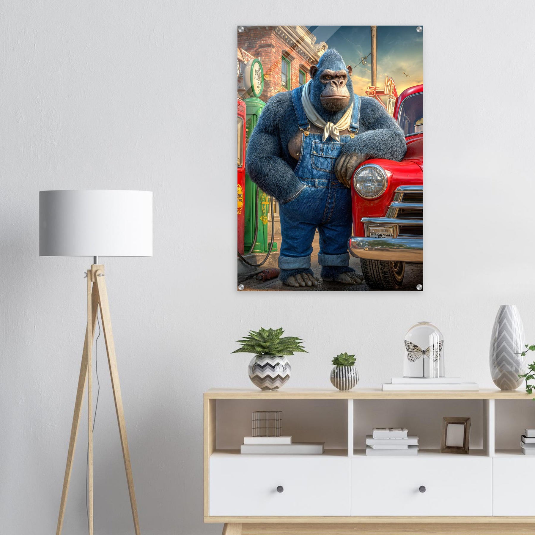 Transform your space with Retro Strength, a striking acrylic wall art piece featuring a gorilla in denim overalls leaning against a classic red truck at a nostalgic gas station. The glossy acrylic surface enhances color depth, contrast, and realism, creating a powerful and immersive visual statement.