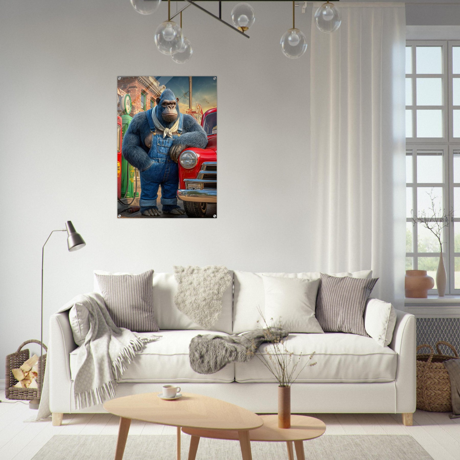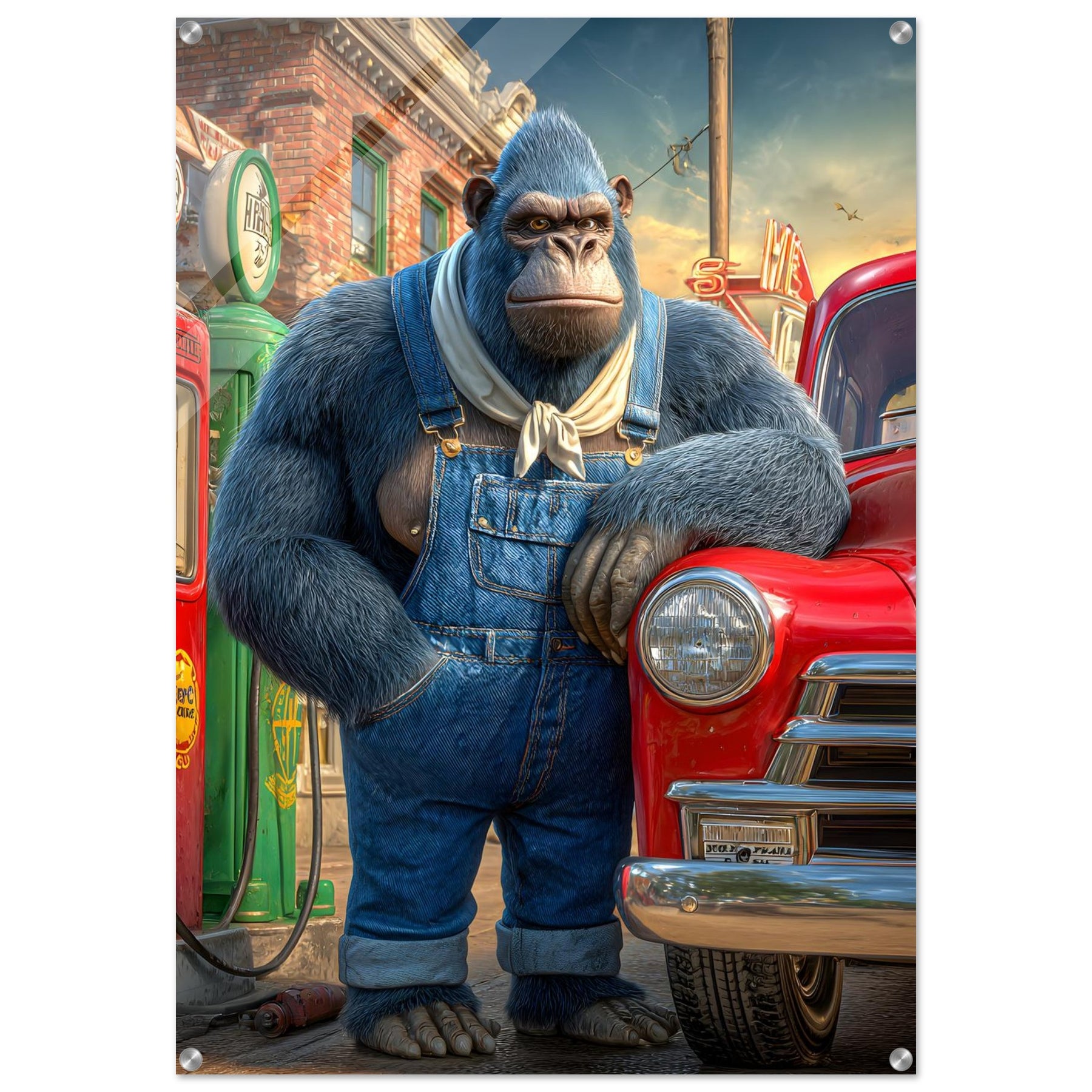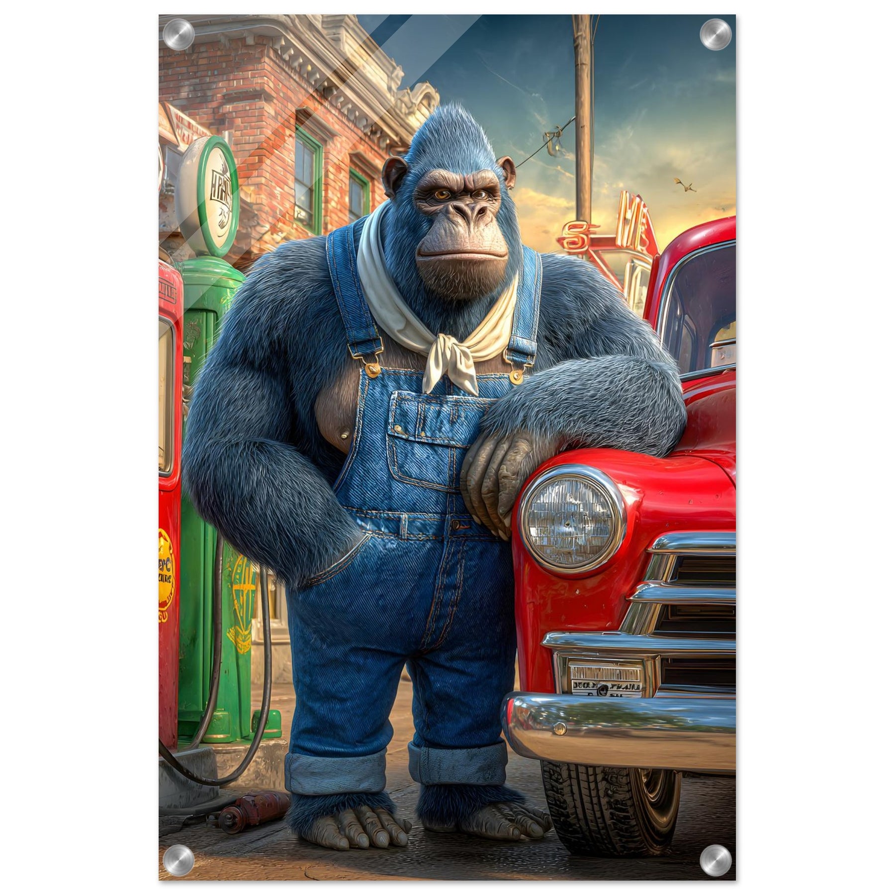Transform your space with Retro Strength, a striking acrylic wall art piece featuring a gorilla in denim overalls leaning against a classic red truck at a nostalgic gas station. The glossy acrylic surface enhances color depth, contrast, and realism, creating a powerful and immersive visual statement.