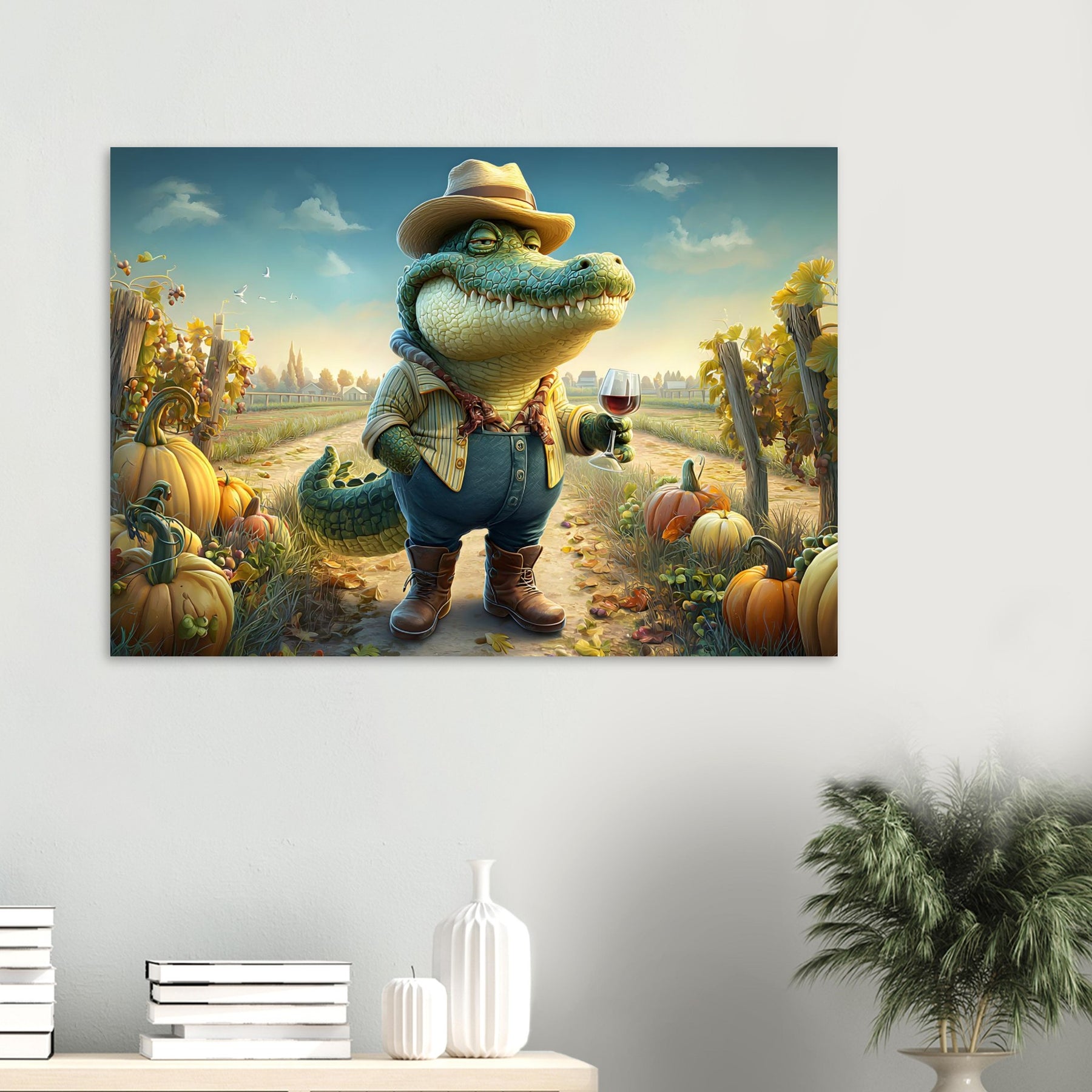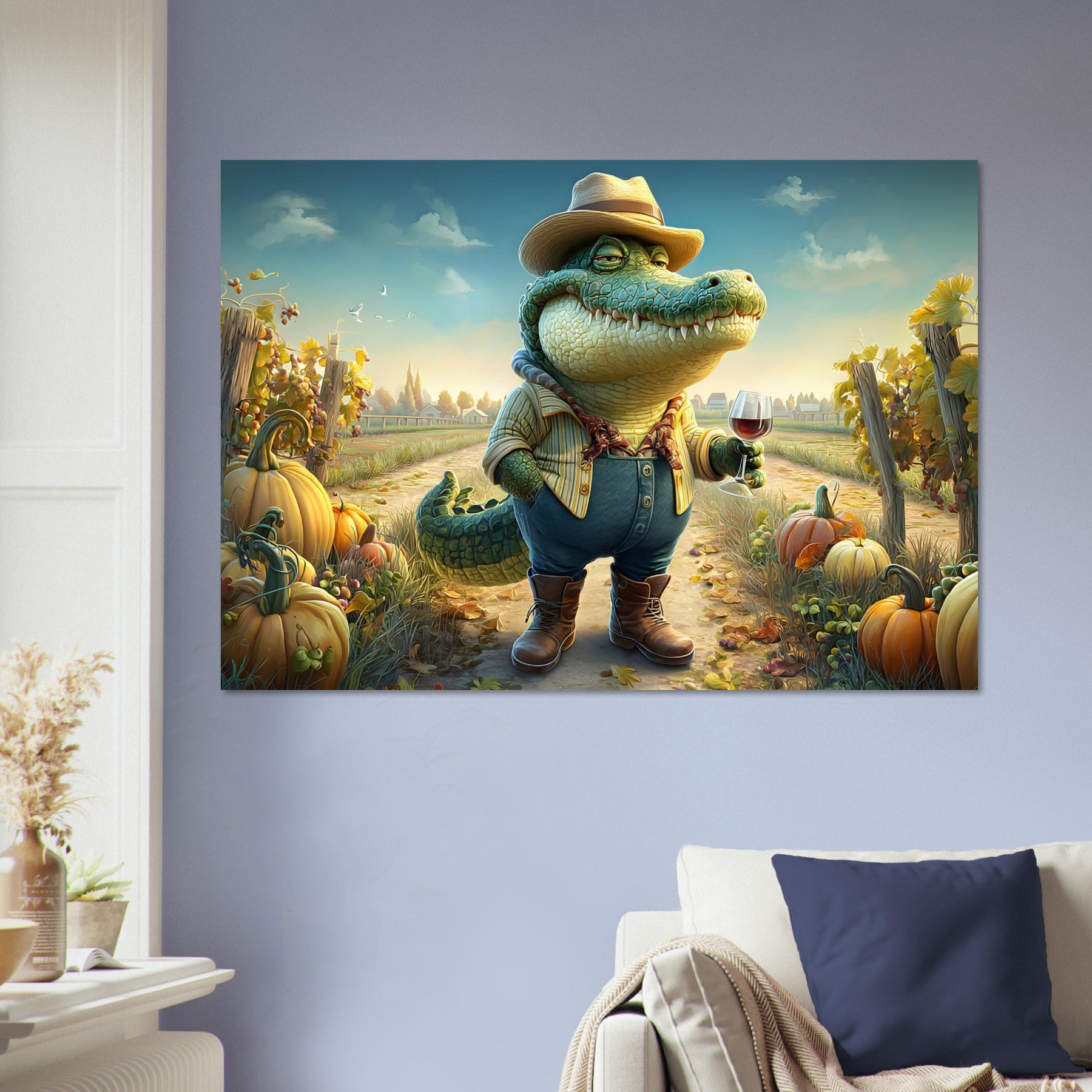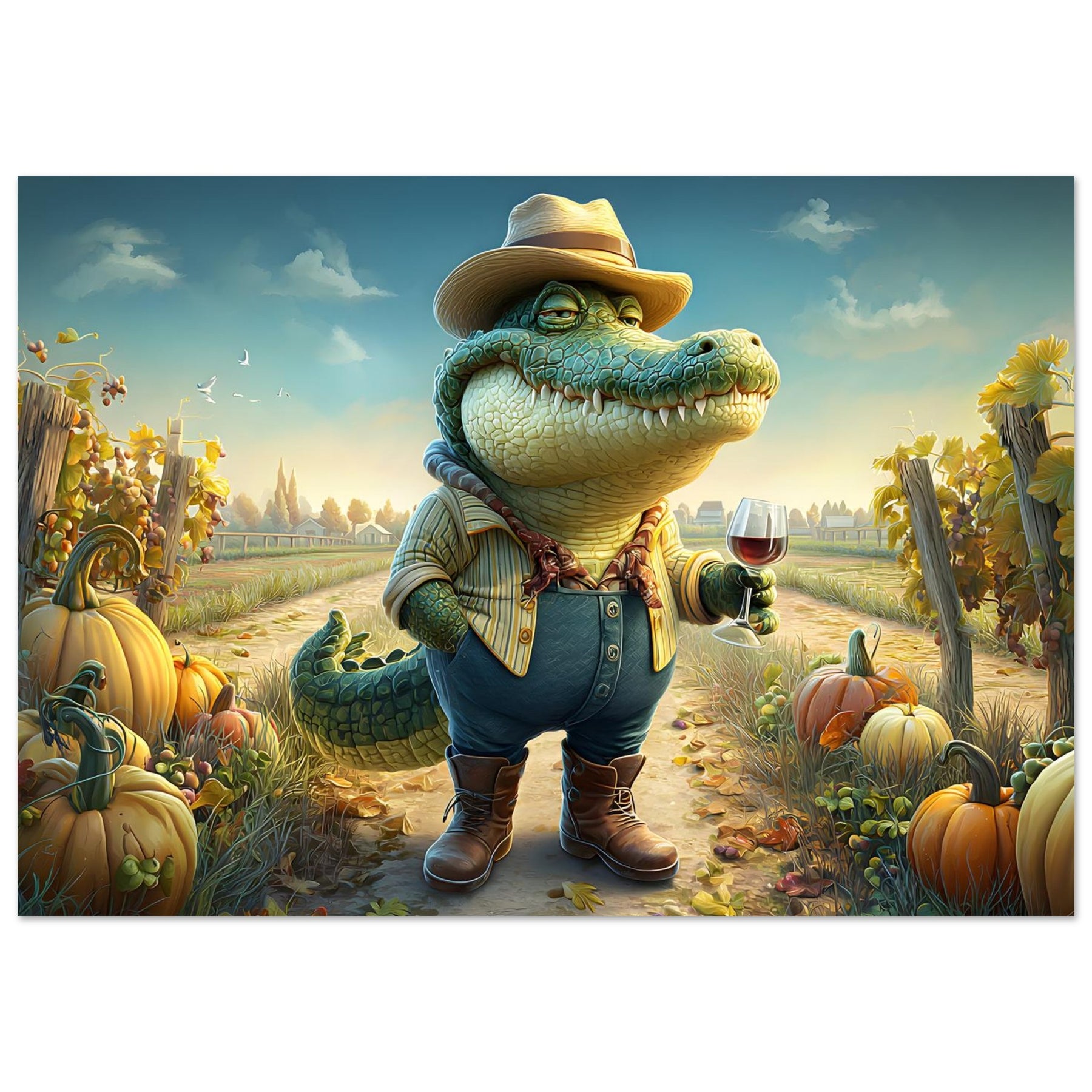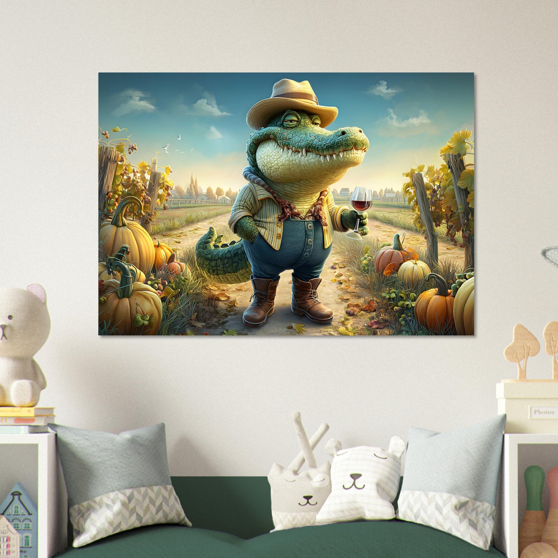 Bring charm, color, and imagination into your child’s space with Crocodile Connoisseur, a delightful whimsical aluminum wall art illustration that blends humor, personality, and storytelling. This enchanting artwork features a confident crocodile dressed as a winemaker, proudly holding a glass of red wine while standing in a picturesque vineyard bursting with autumn pumpkins and lush grapevines.