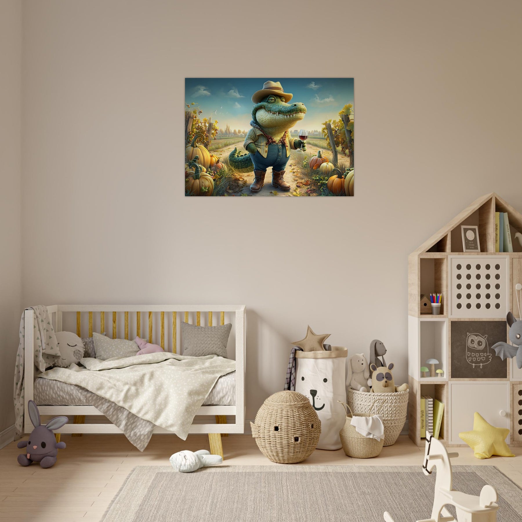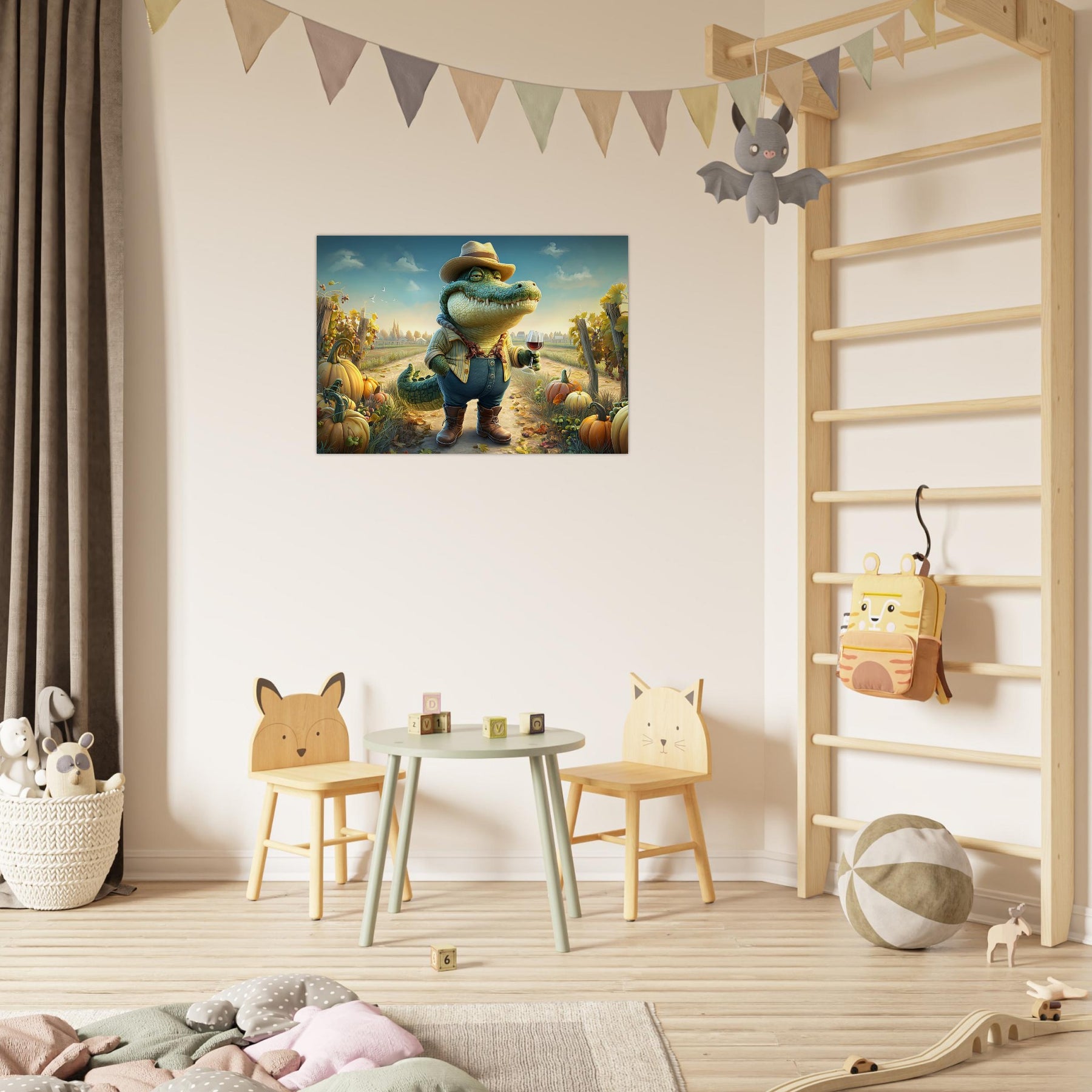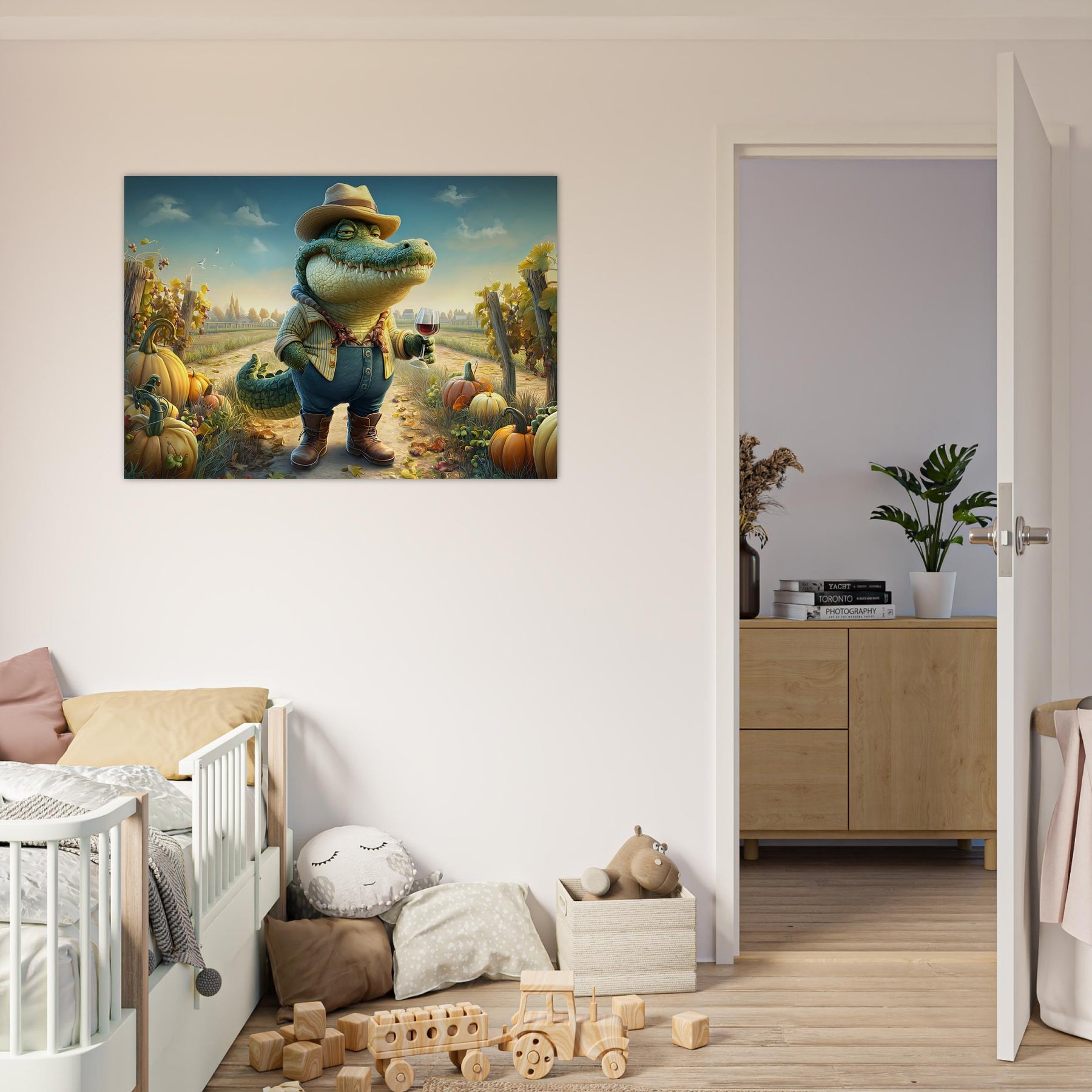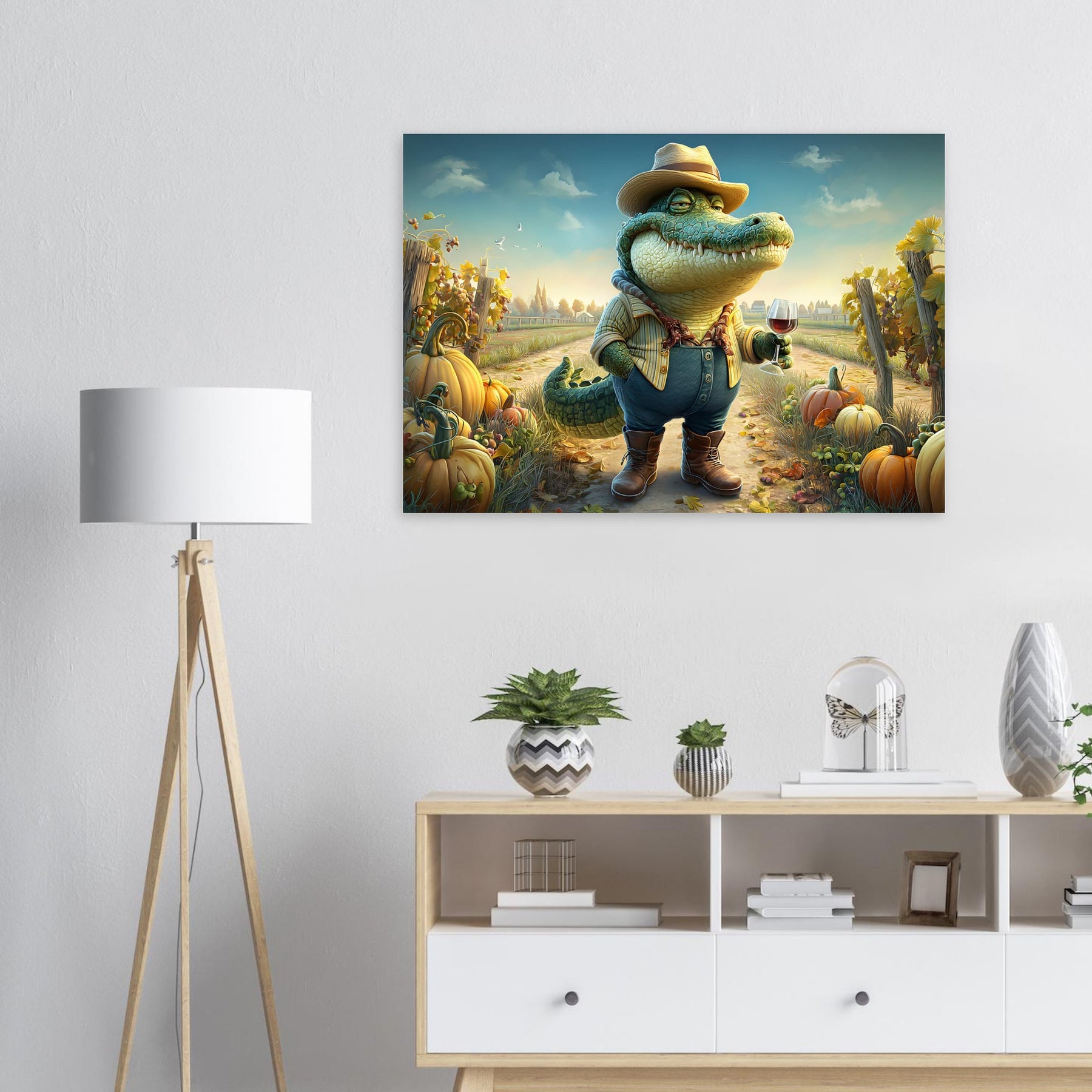 Bring charm, color, and imagination into your child’s space with Crocodile Connoisseur, a delightful whimsical aluminum wall art illustration that blends humor, personality, and storytelling. This enchanting artwork features a confident crocodile dressed as a winemaker, proudly holding a glass of red wine while standing in a picturesque vineyard bursting with autumn pumpkins and lush grapevines.