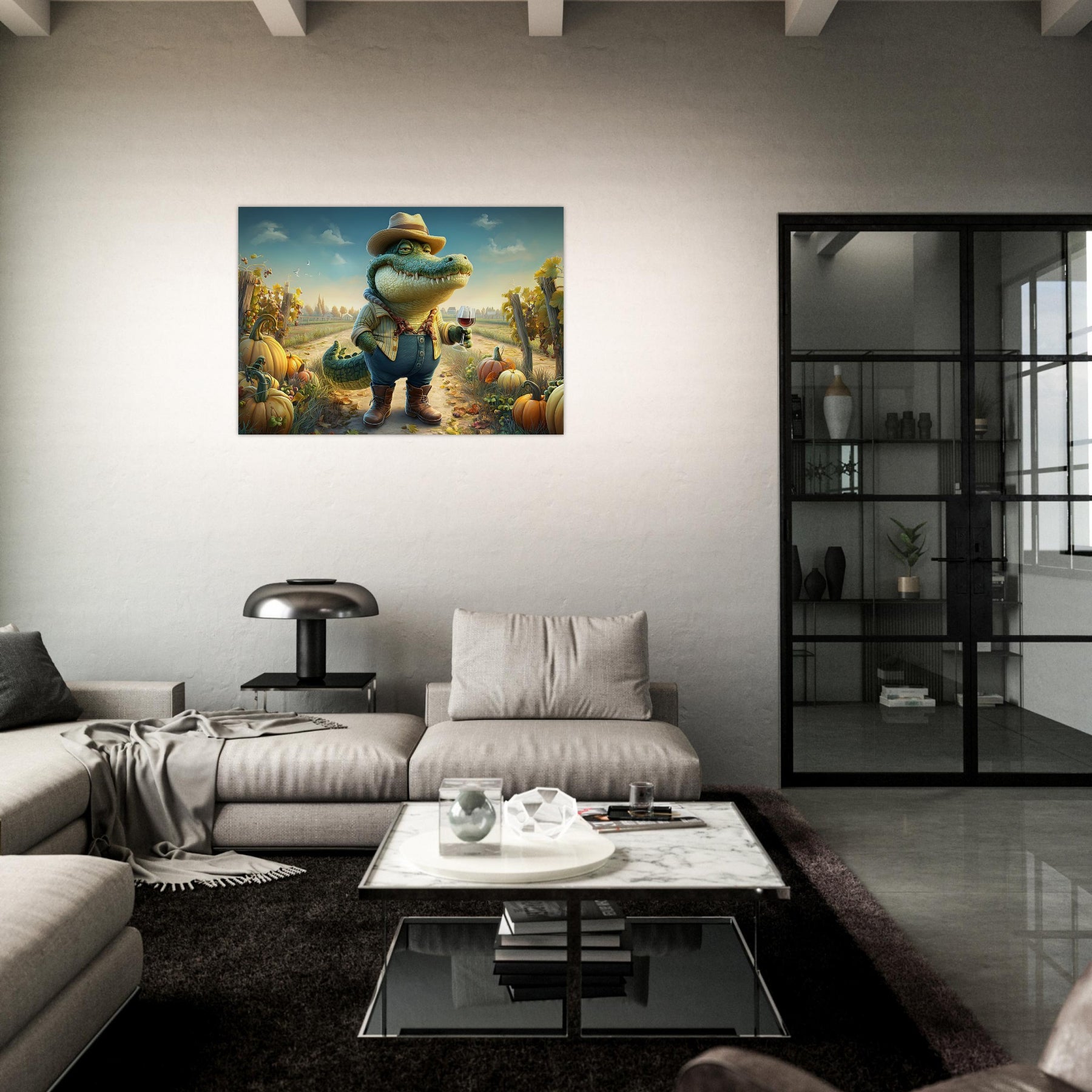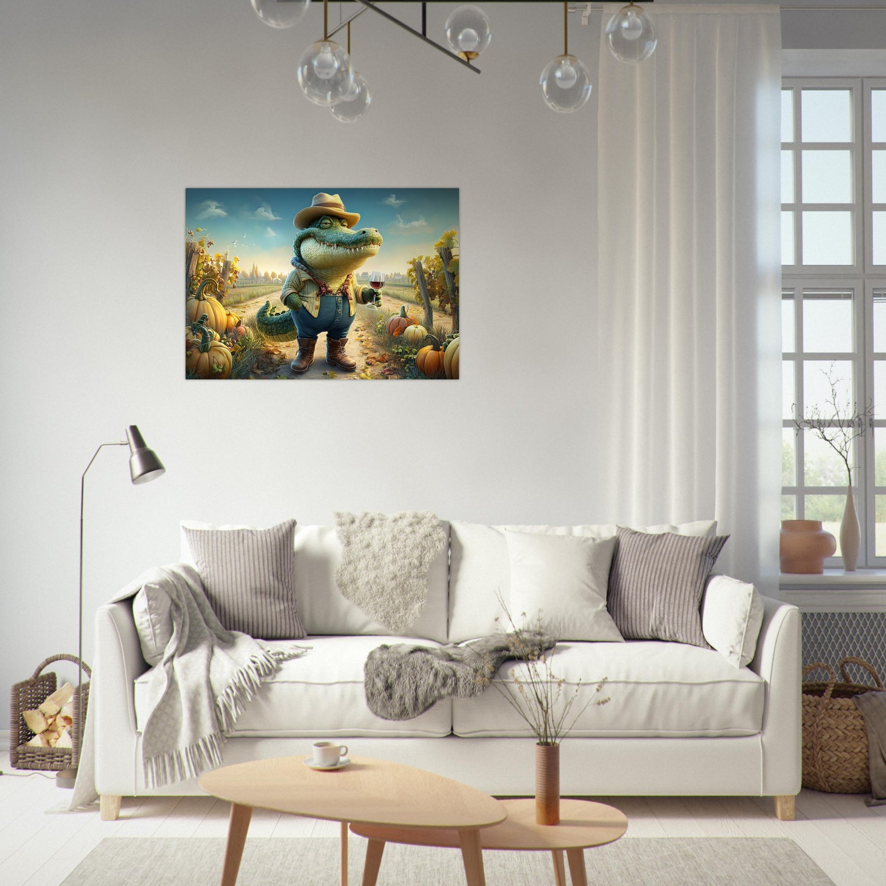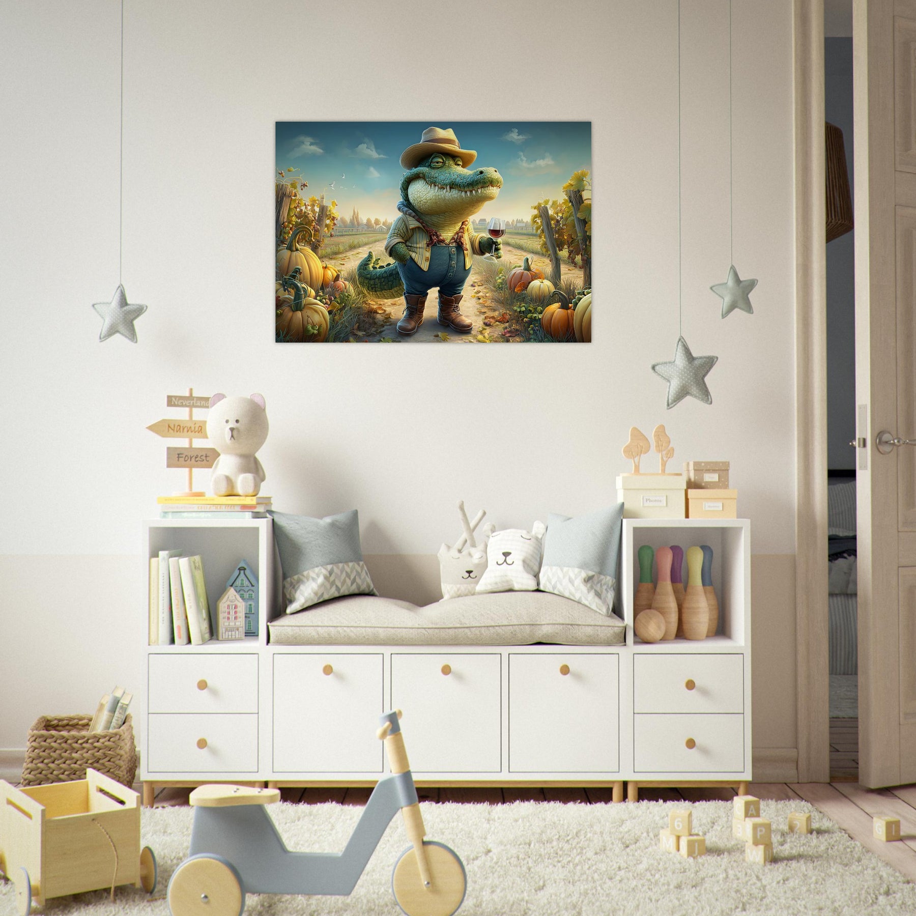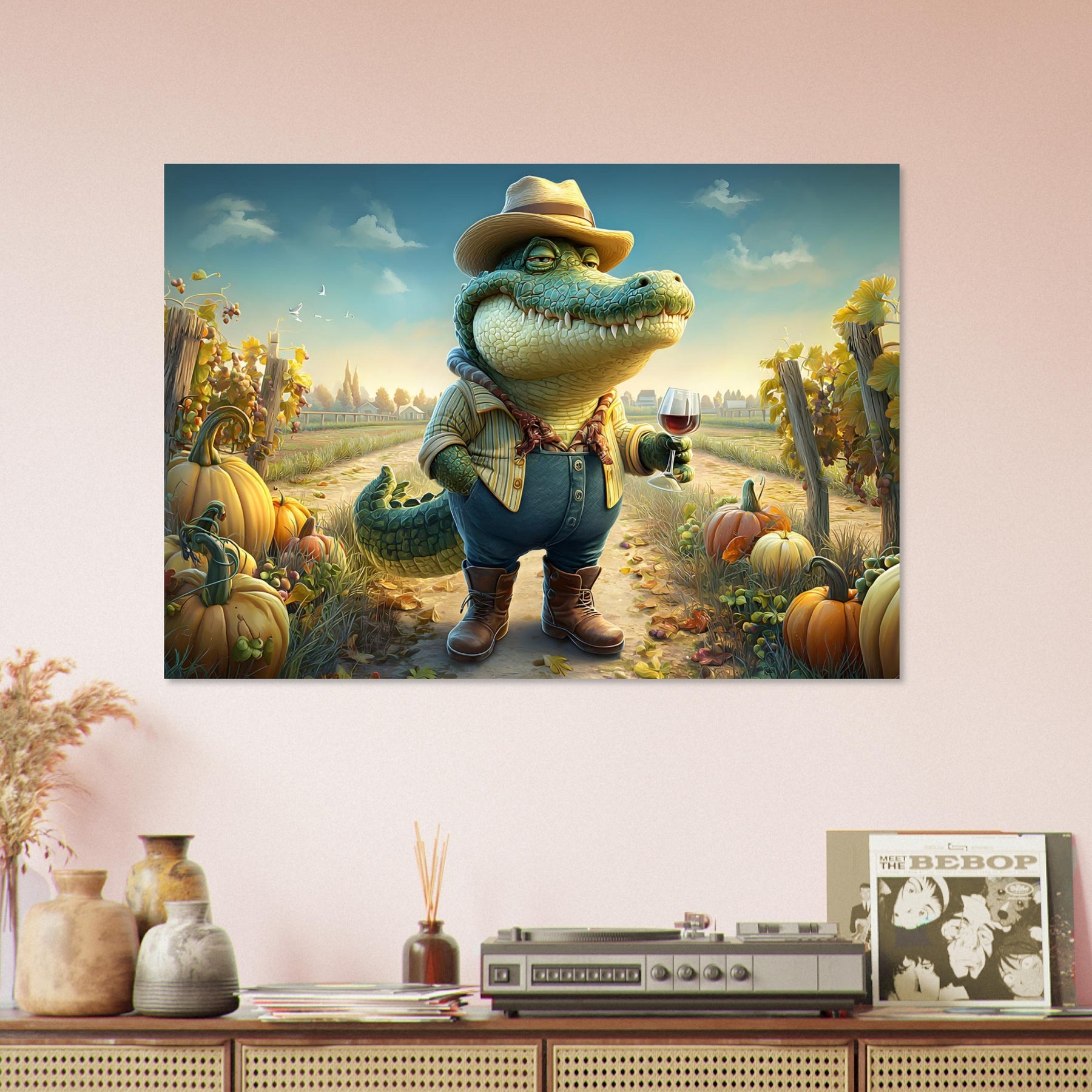 Bring charm, color, and imagination into your child’s space with Crocodile Connoisseur, a delightful whimsical aluminum wall art illustration that blends humor, personality, and storytelling. This enchanting artwork features a confident crocodile dressed as a winemaker, proudly holding a glass of red wine while standing in a picturesque vineyard bursting with autumn pumpkins and lush grapevines.