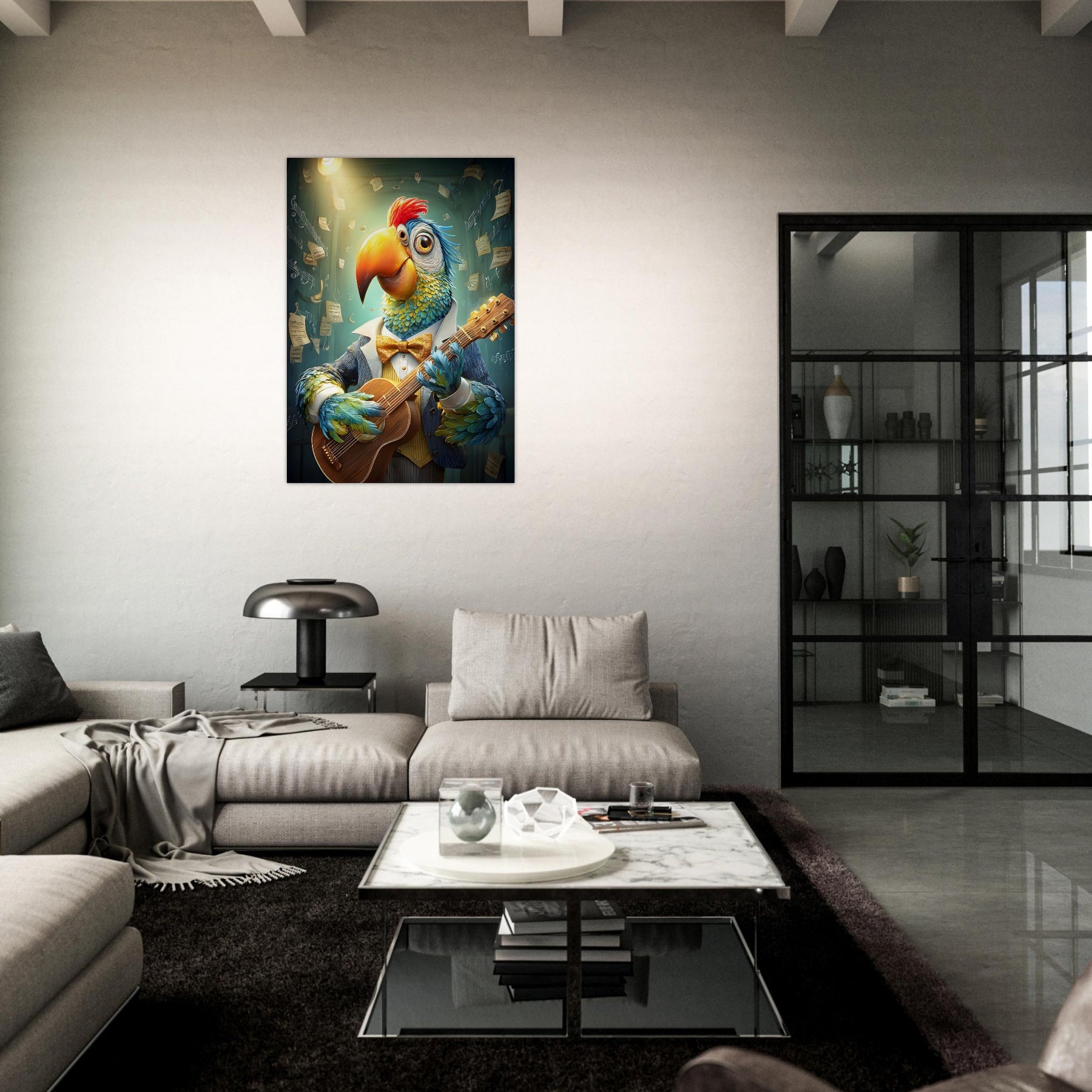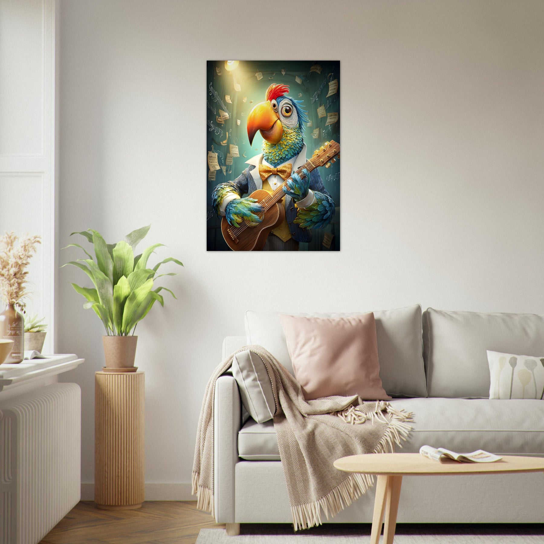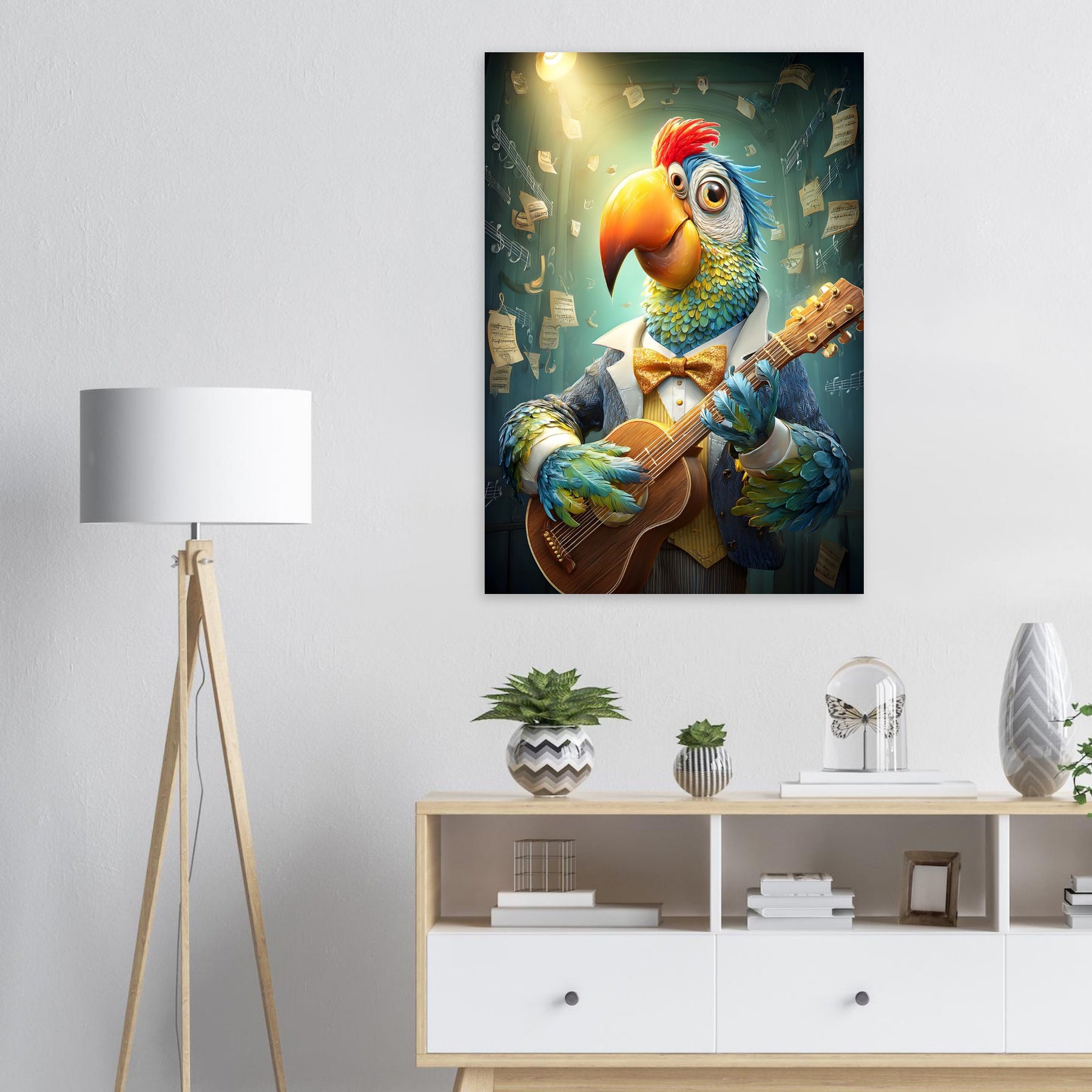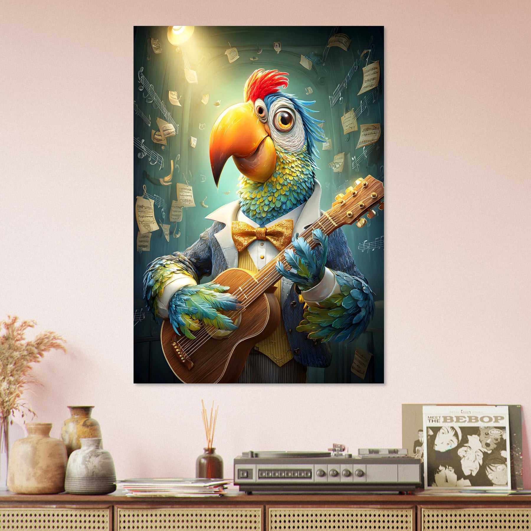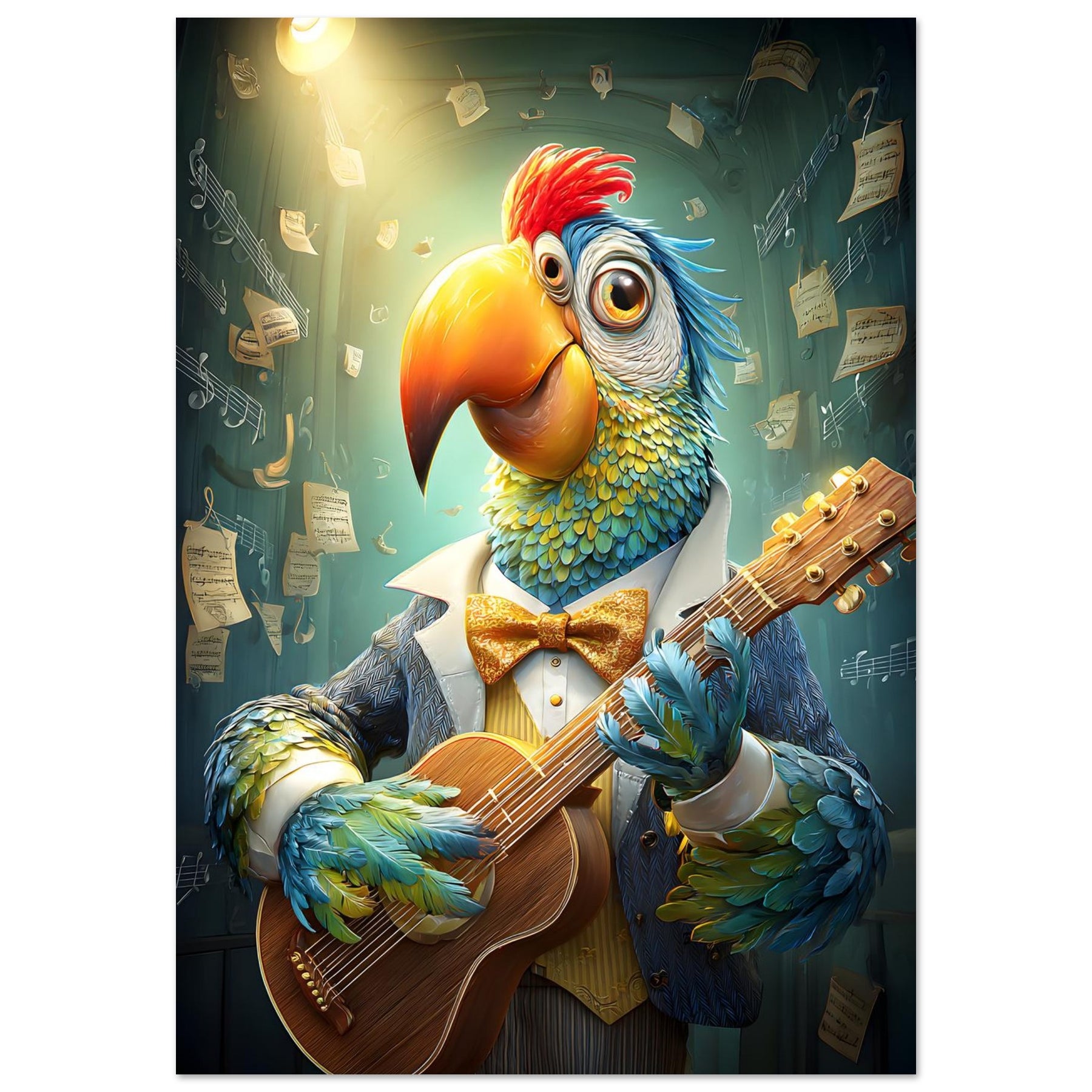 🎸 Musical Whimsy – A guitar-playing parrot brings humor, charm, and artistic brilliance.