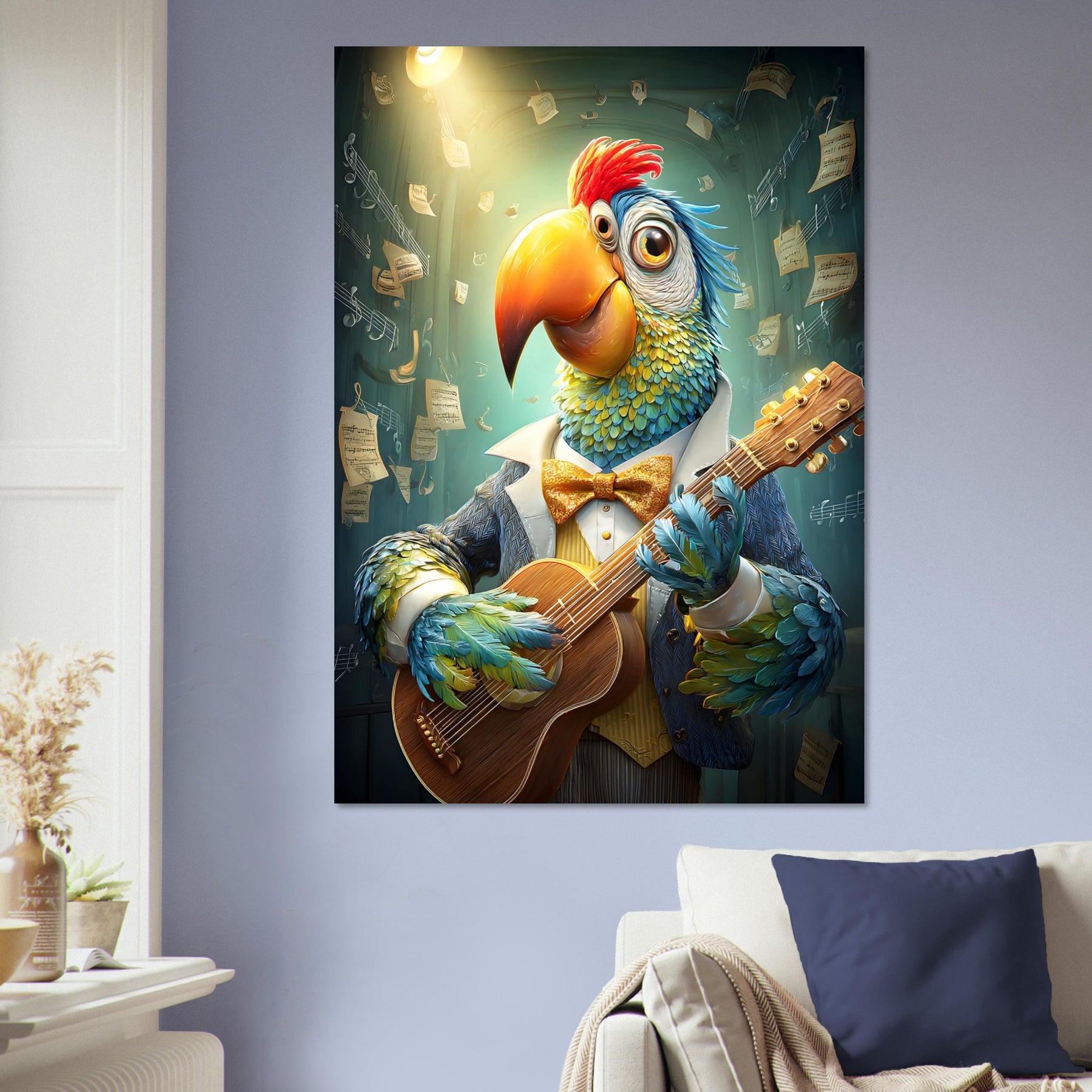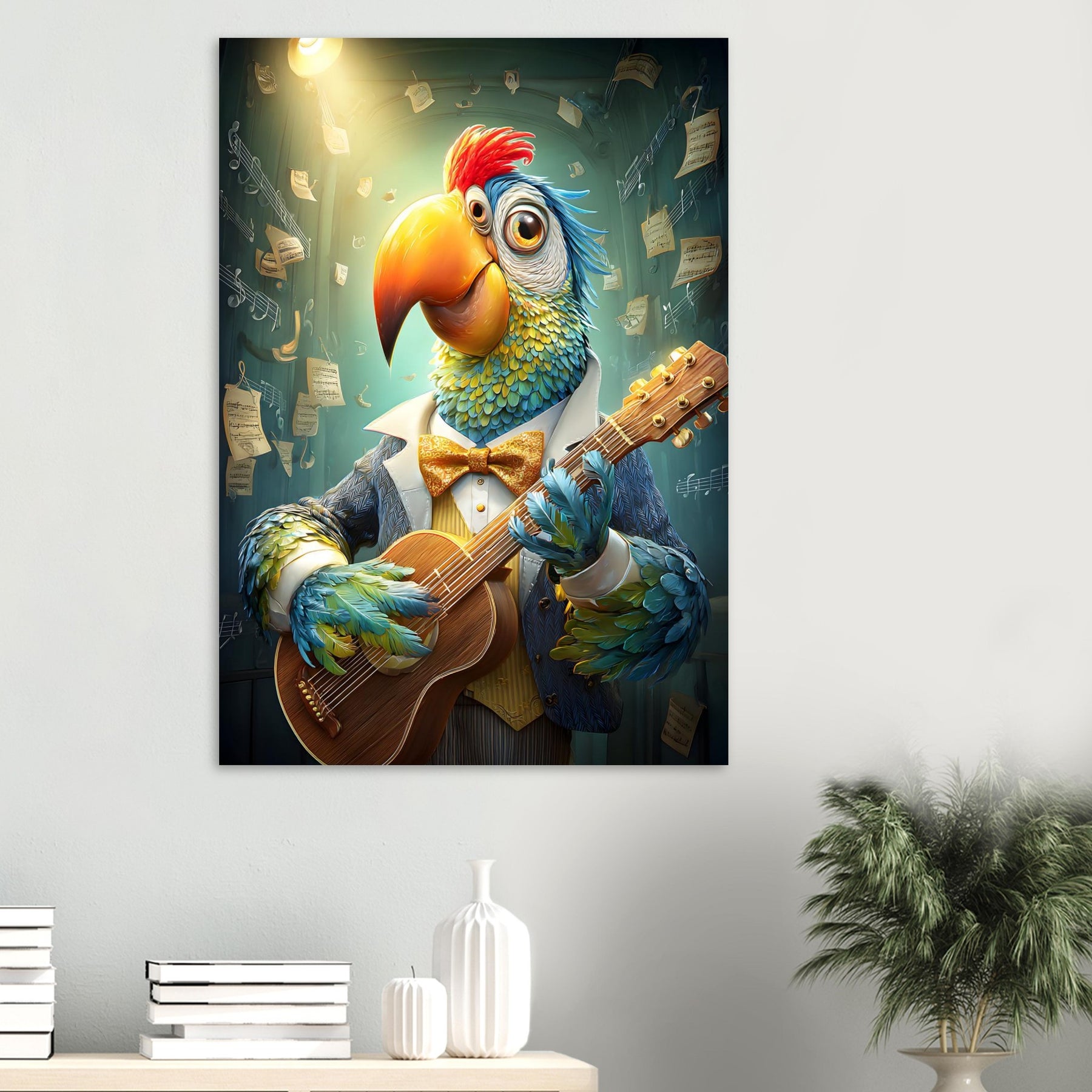 Brighten your child’s space with Spotlight Serenade, a captivating aluminum wall art illustration featuring a whimsical, colorful parrot dressed in a charming tuxedo and performing joyfully under a glowing spotlight. With a guitar in its wings and floating music sheets dancing around the scene, this vibrant artwork radiates creativity, fun, and musical magic.