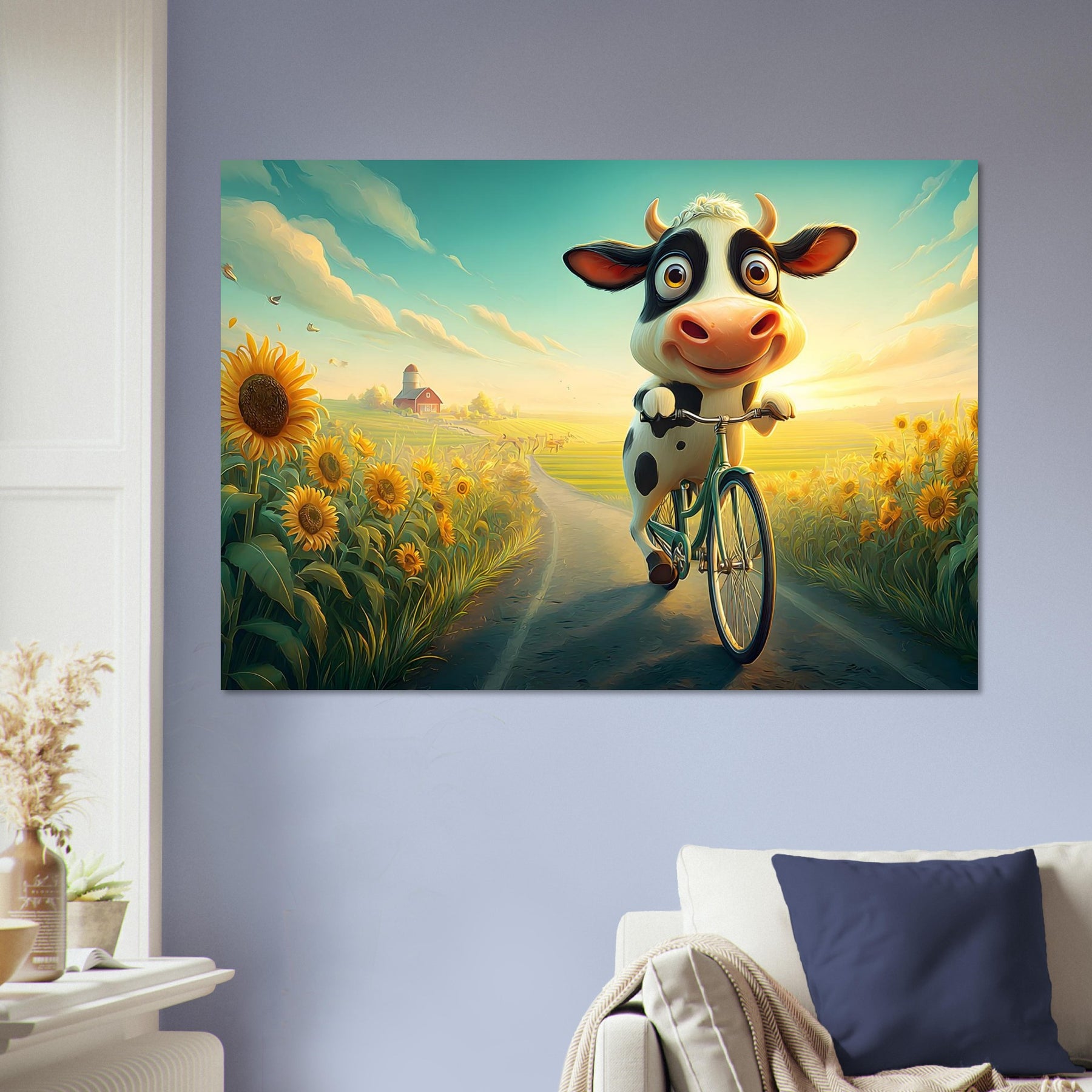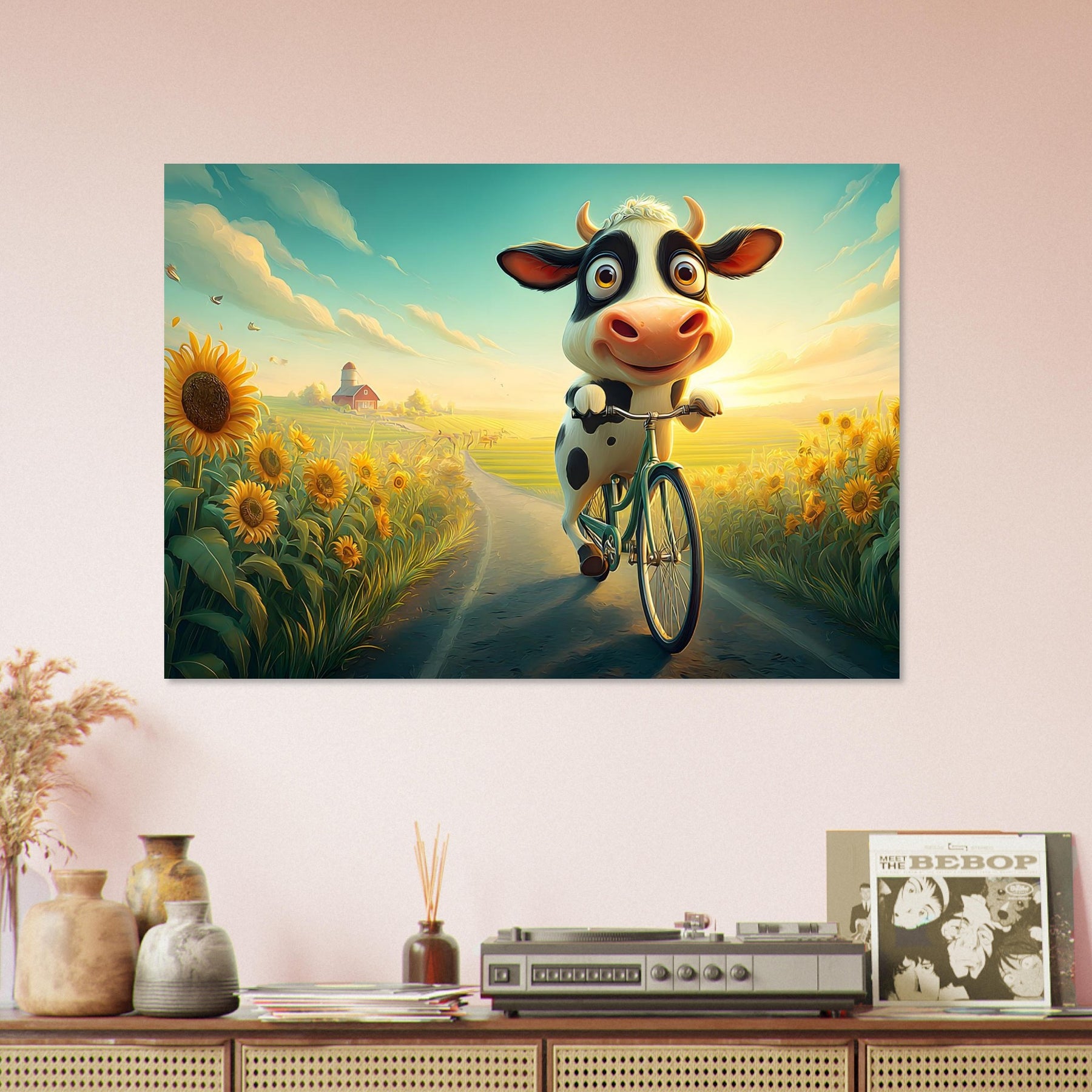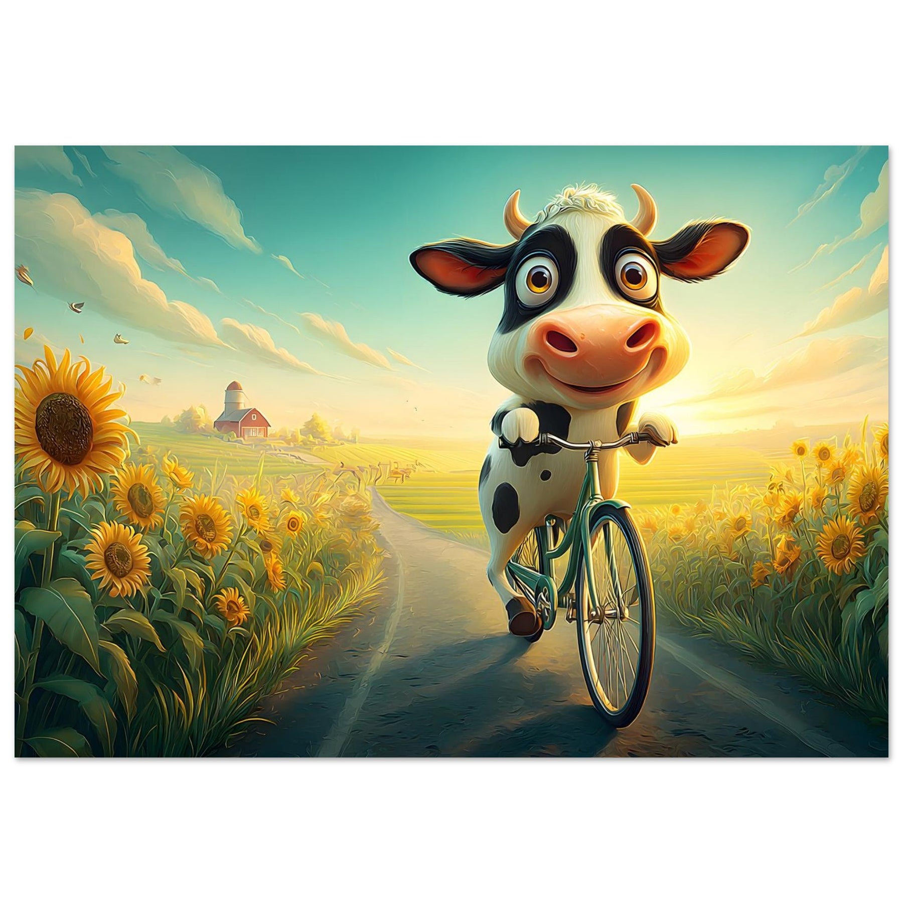 🚲 Playful Adventure – A happy cow riding through sunflower fields brings humor, joy, and fun energy.