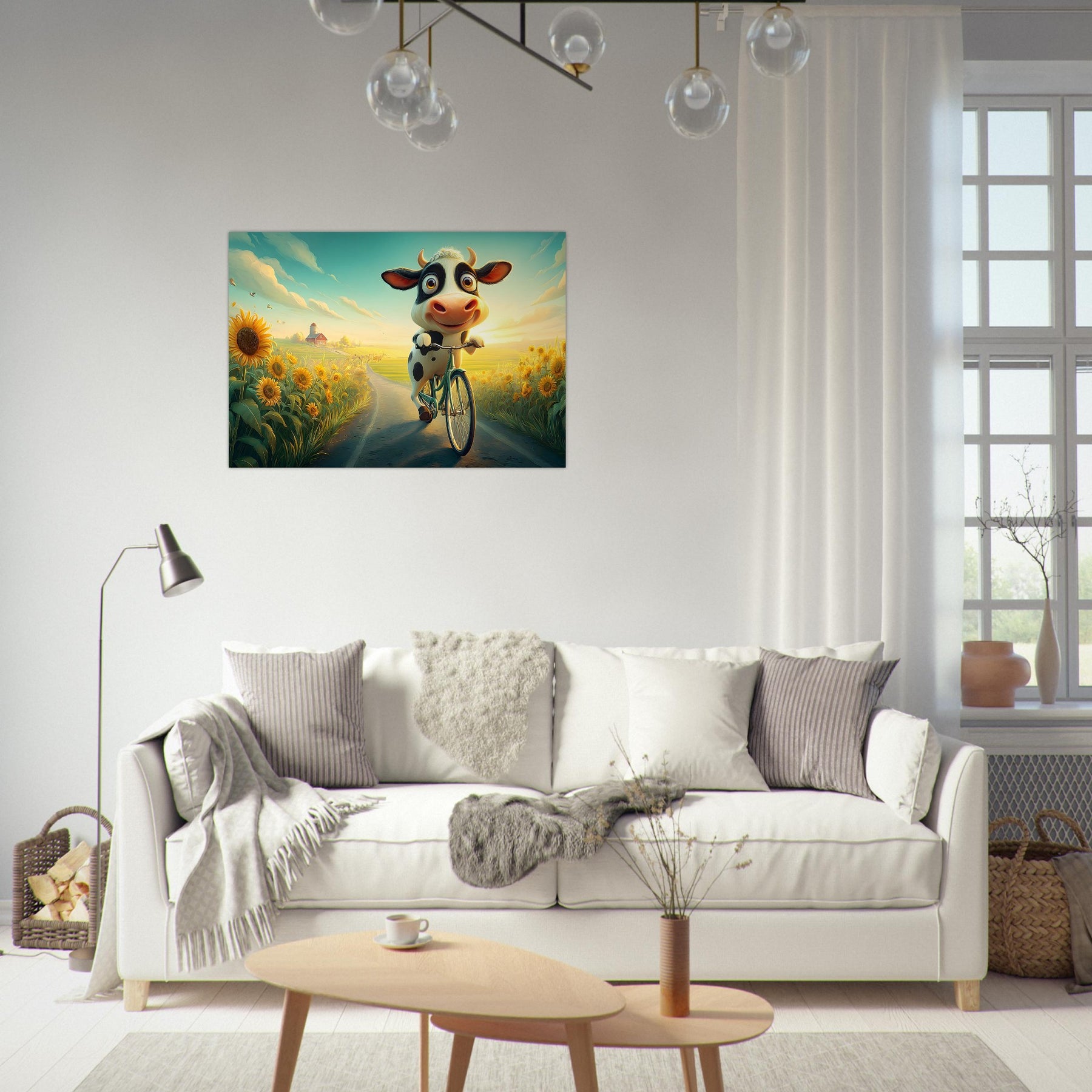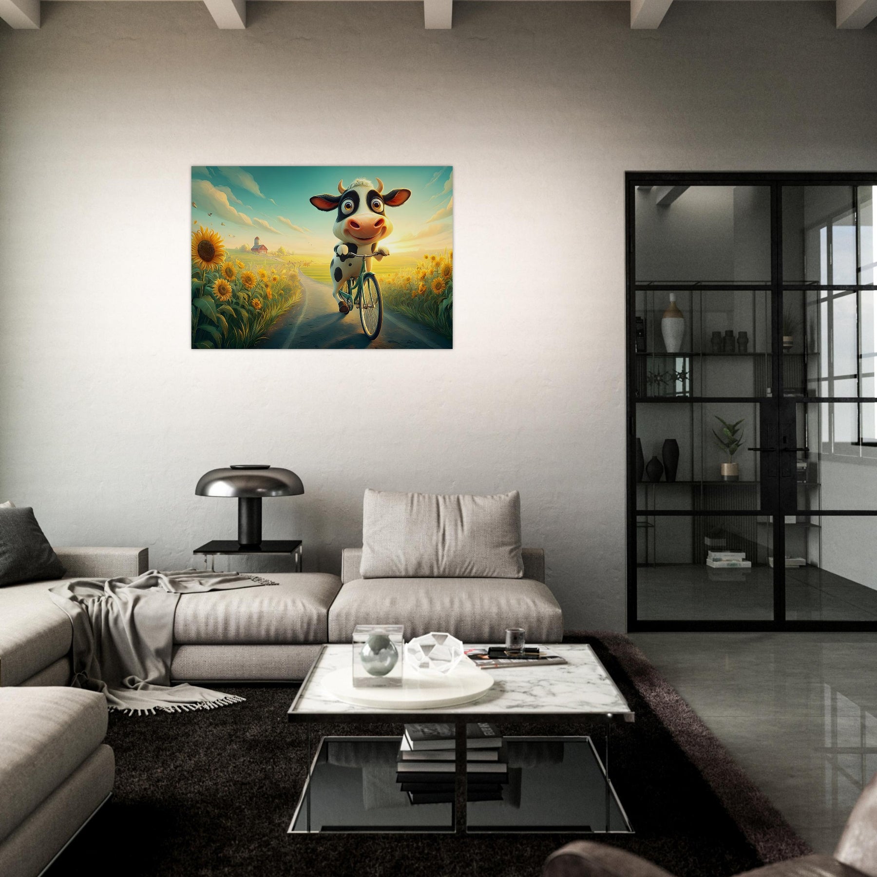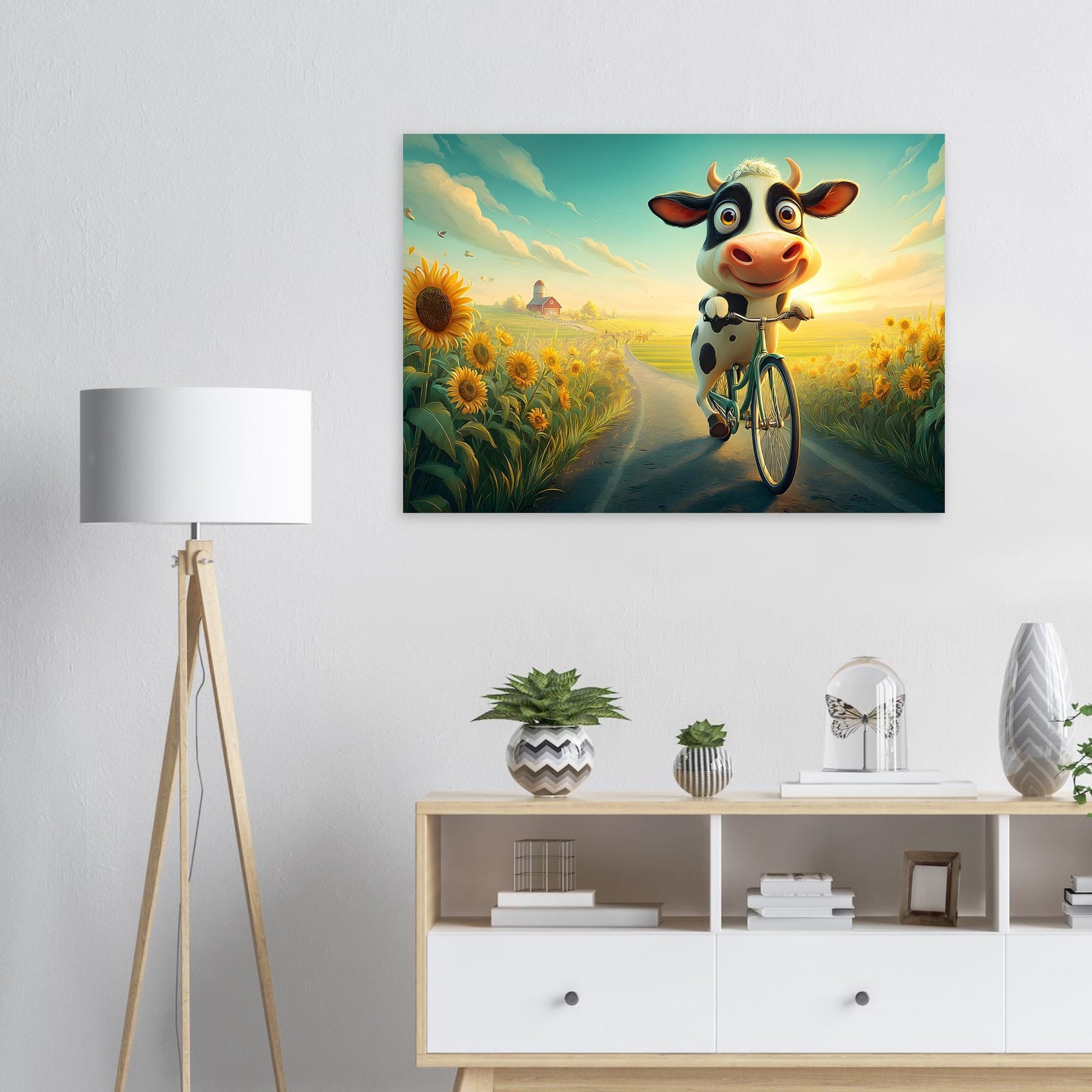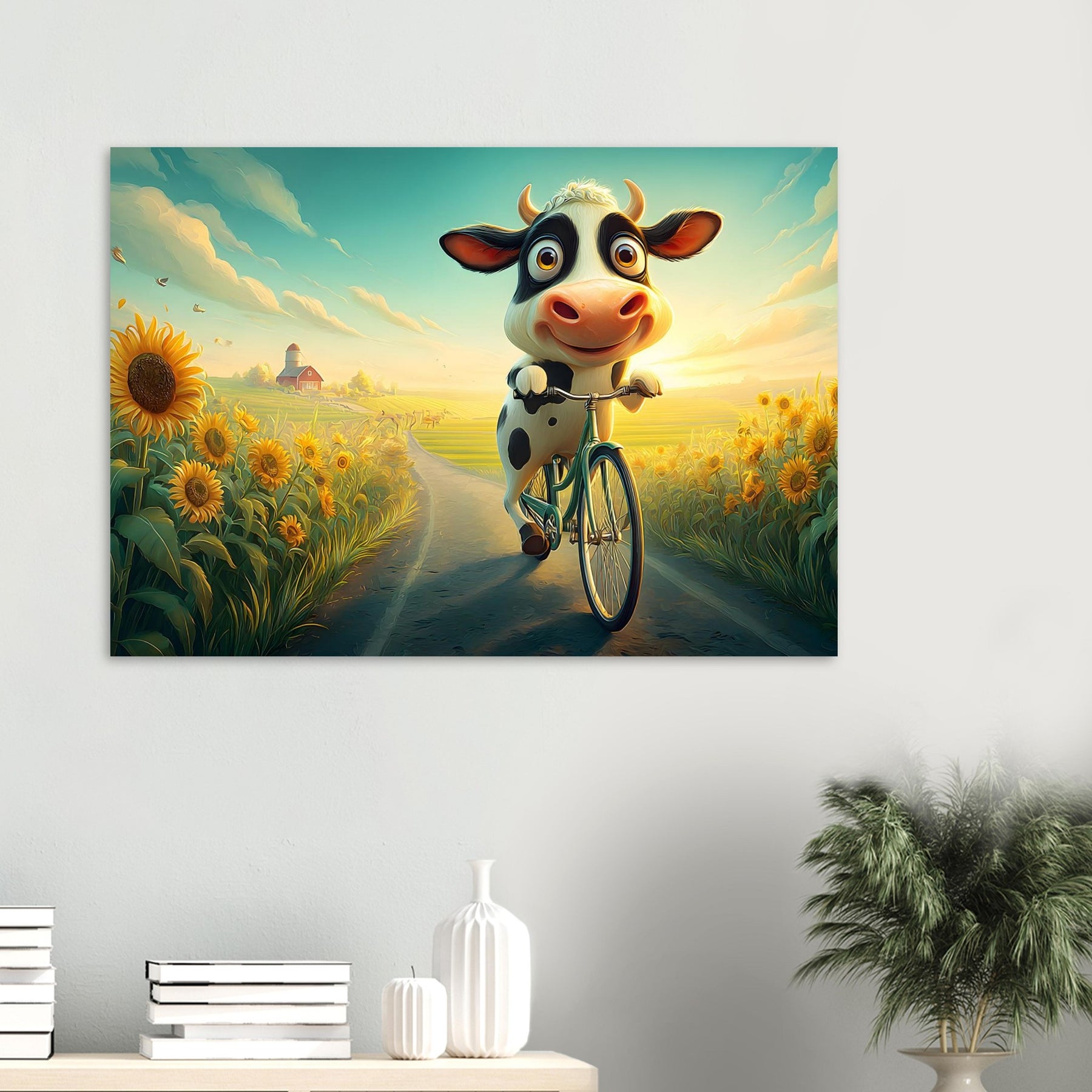 🚲 Playful Adventure – A happy cow riding through sunflower fields brings humor, joy, and fun energy.