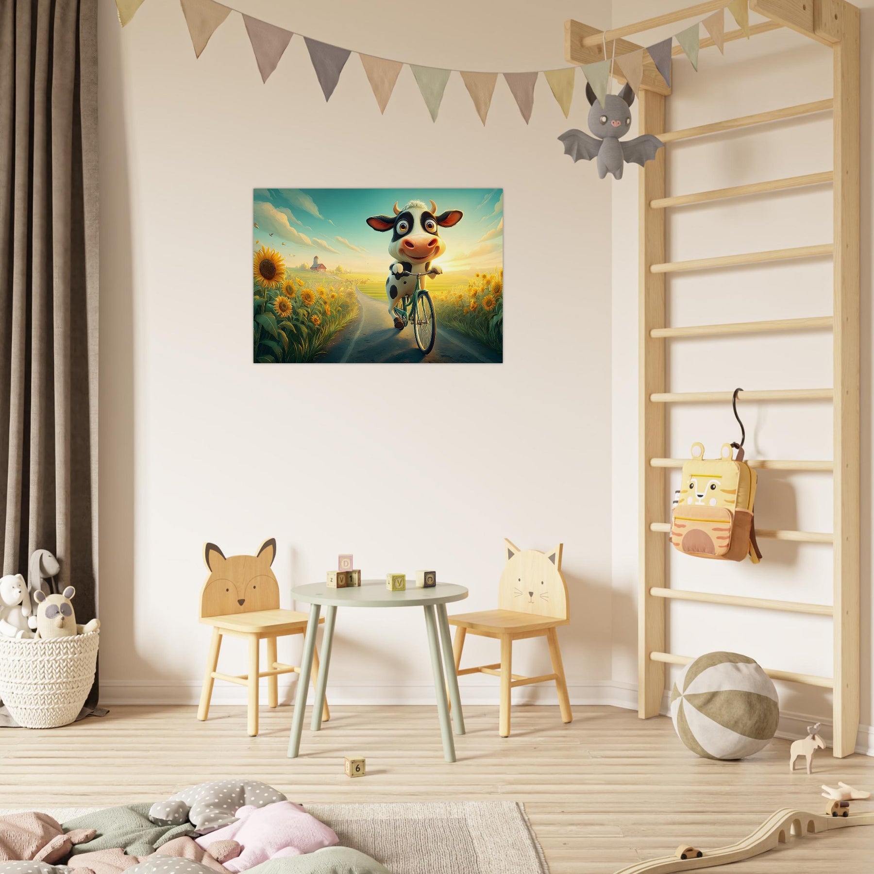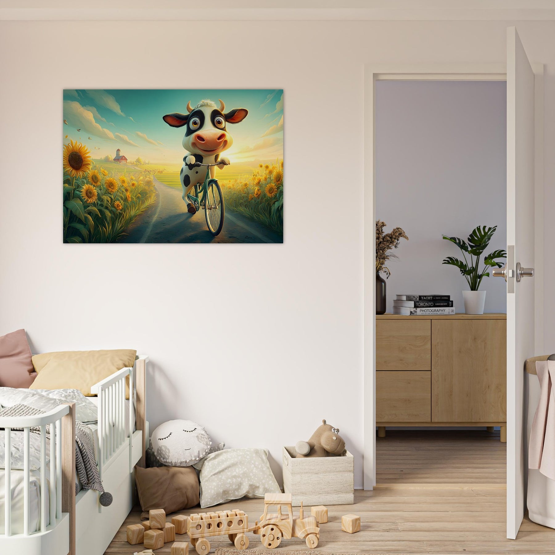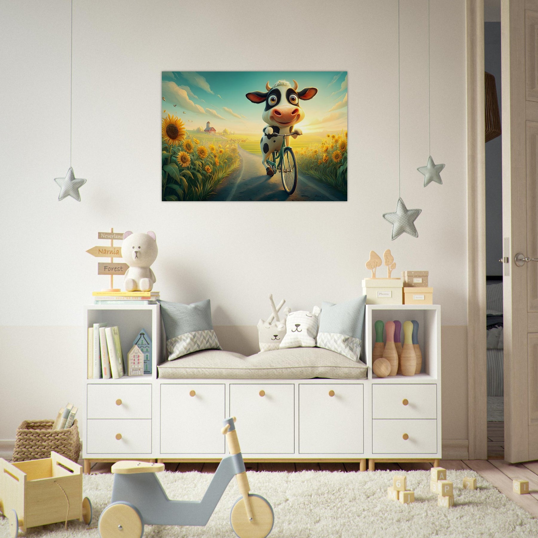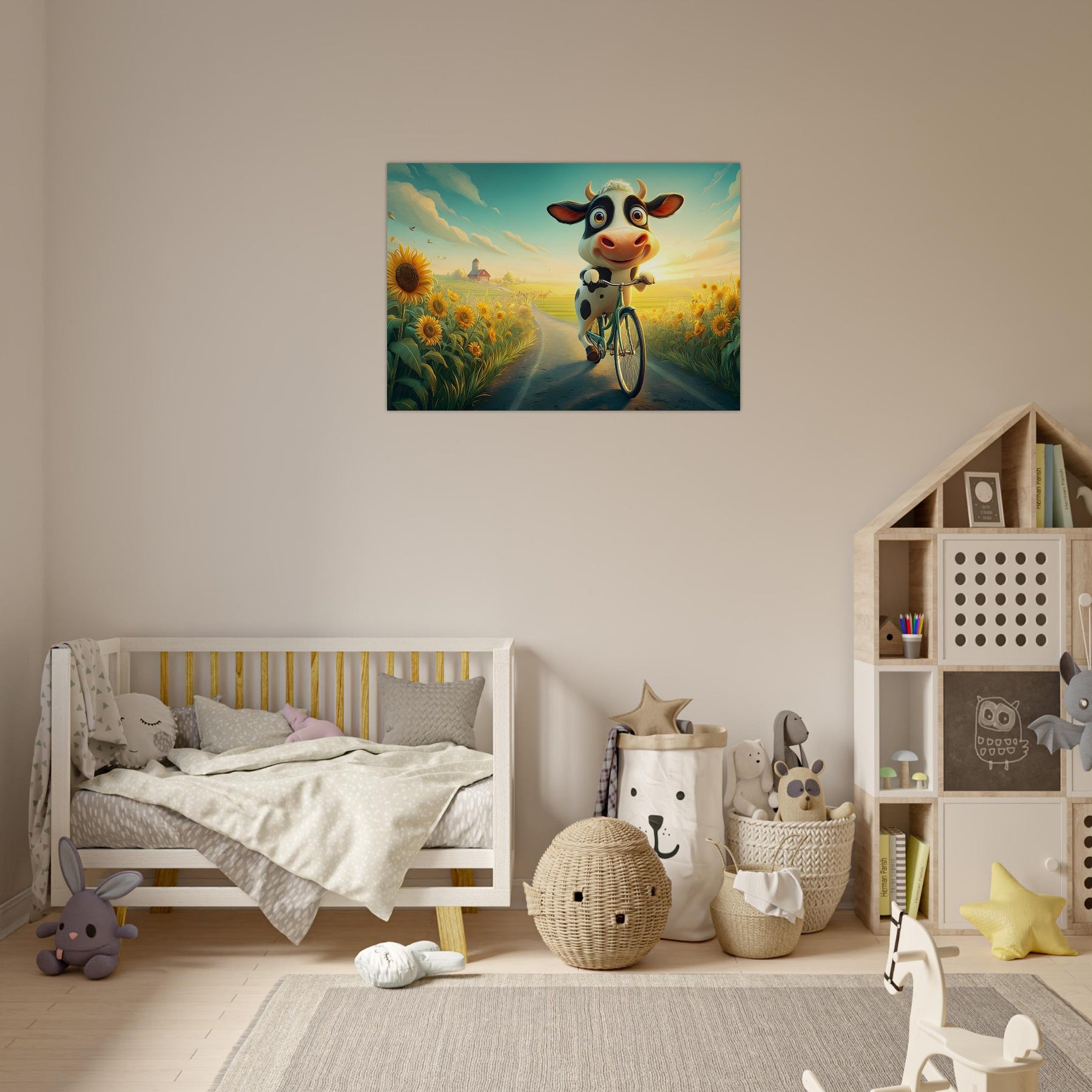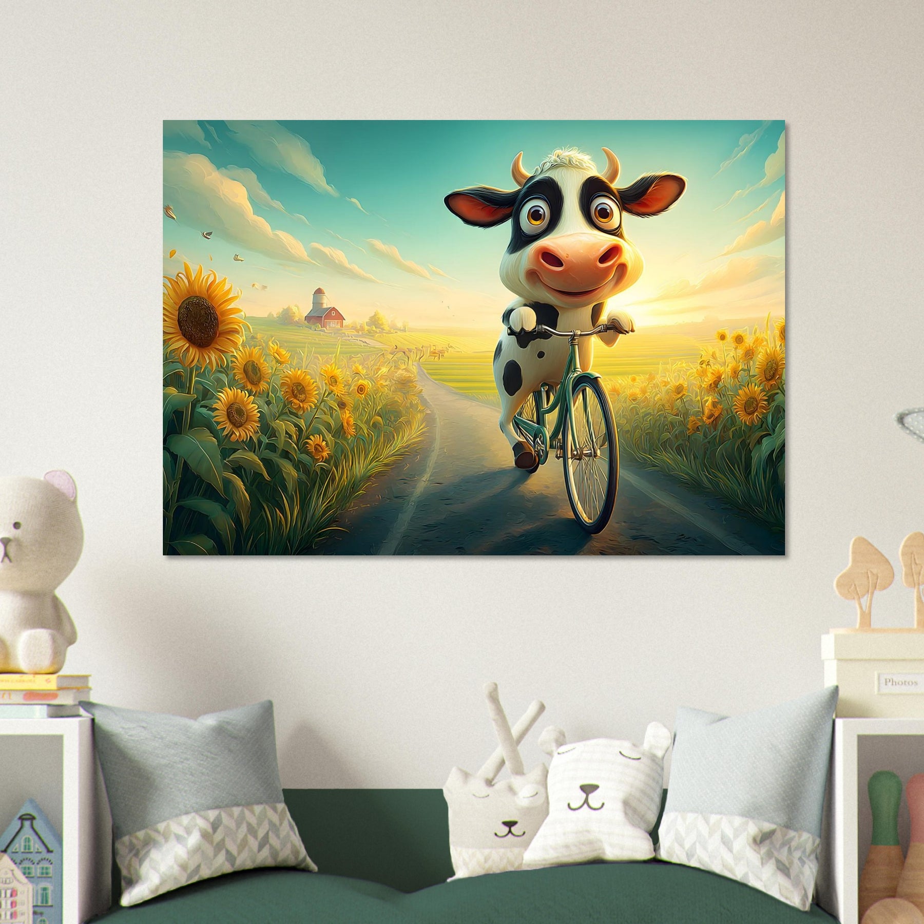 Brighten your child’s space with Sunflower Ride, a delightful aluminum wall art illustration featuring a joyful, whimsical cow pedaling a bicycle through a golden field of vibrant sunflowers. This charming scene captures the essence of happiness, freedom, and playful adventure in the heart of nature.