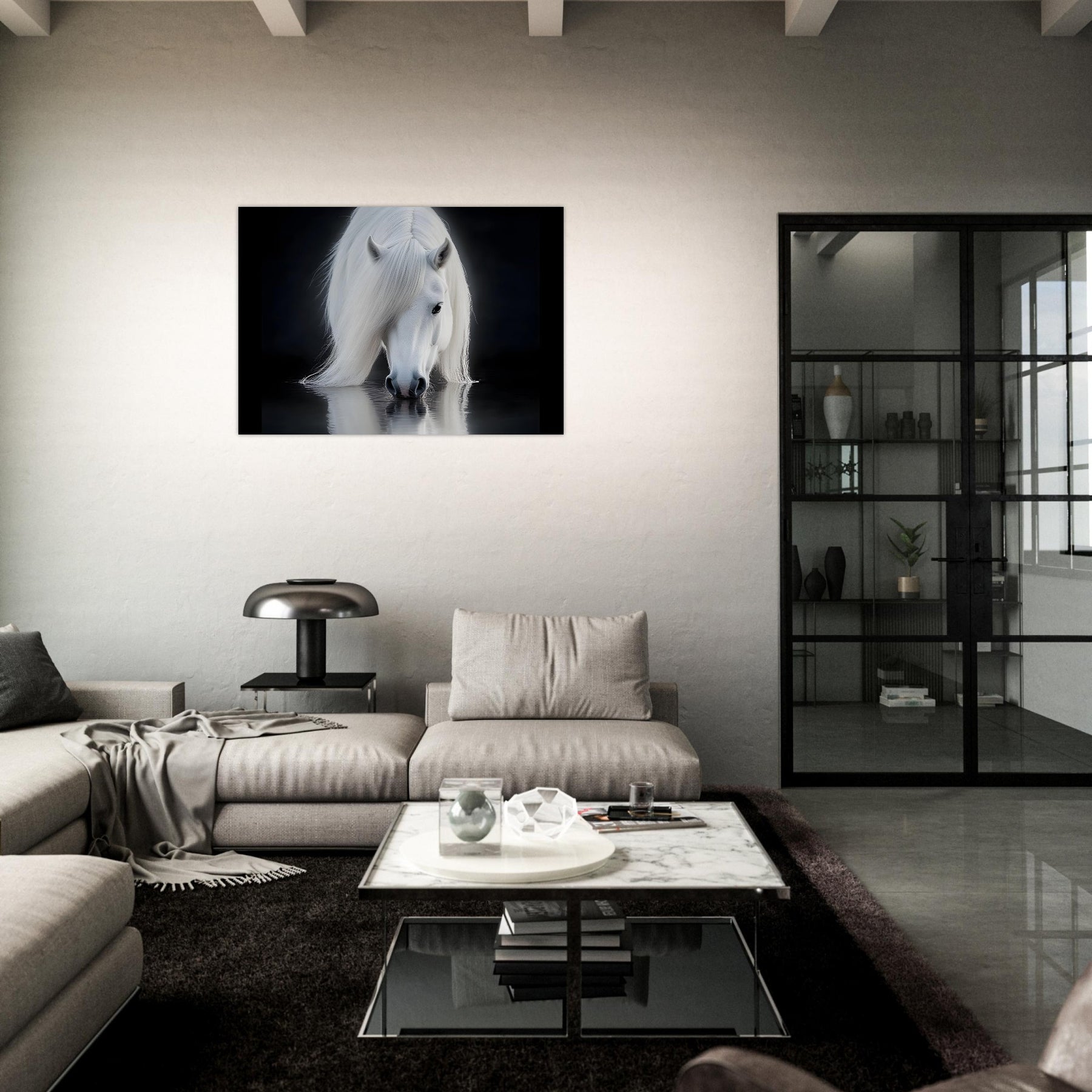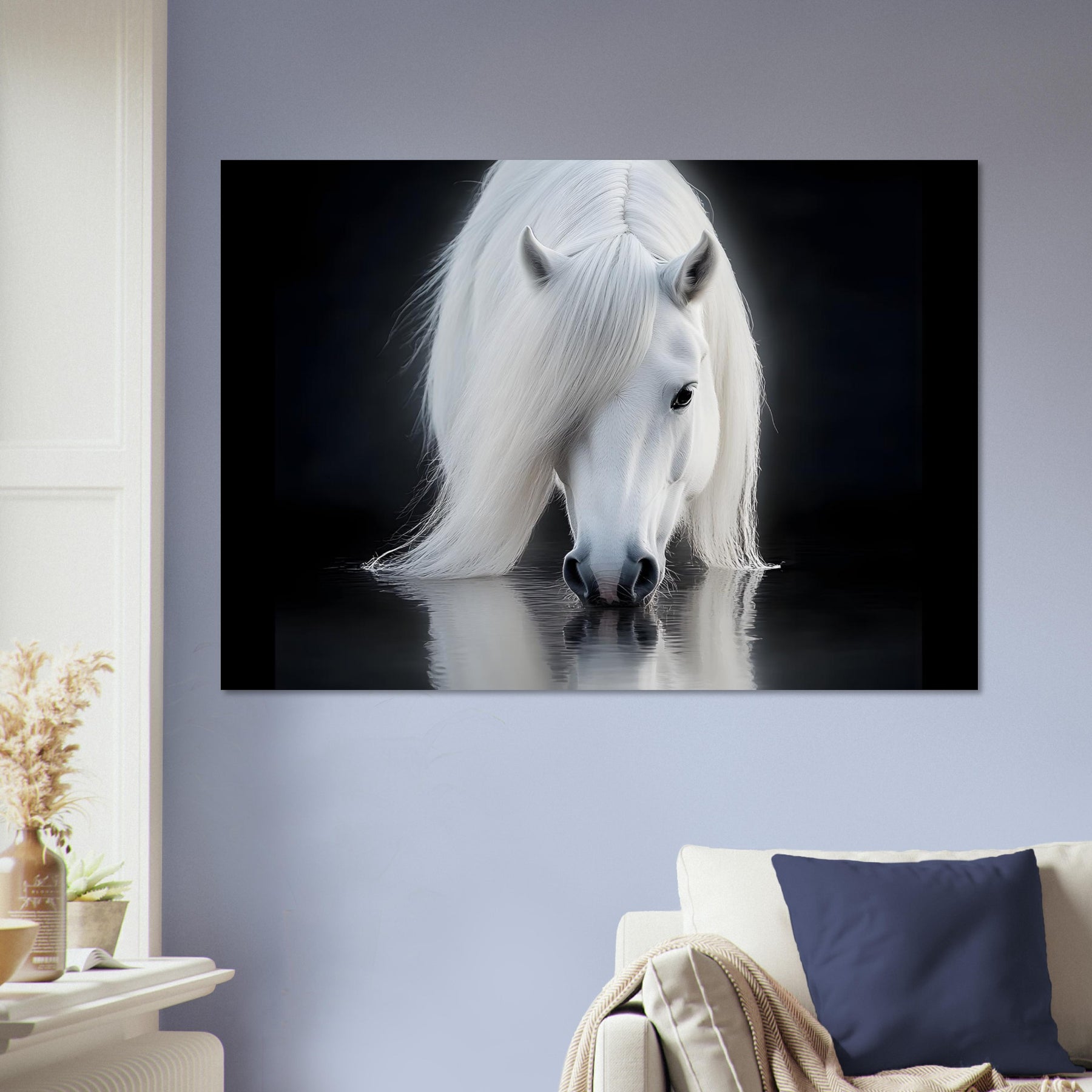 Add a serene focal point to your space with Silent Reflection, a lightweight foam wall art piece featuring a majestic white horse mirrored in still waters. The clean composition and gentle lighting make it a calming decorative accent.
