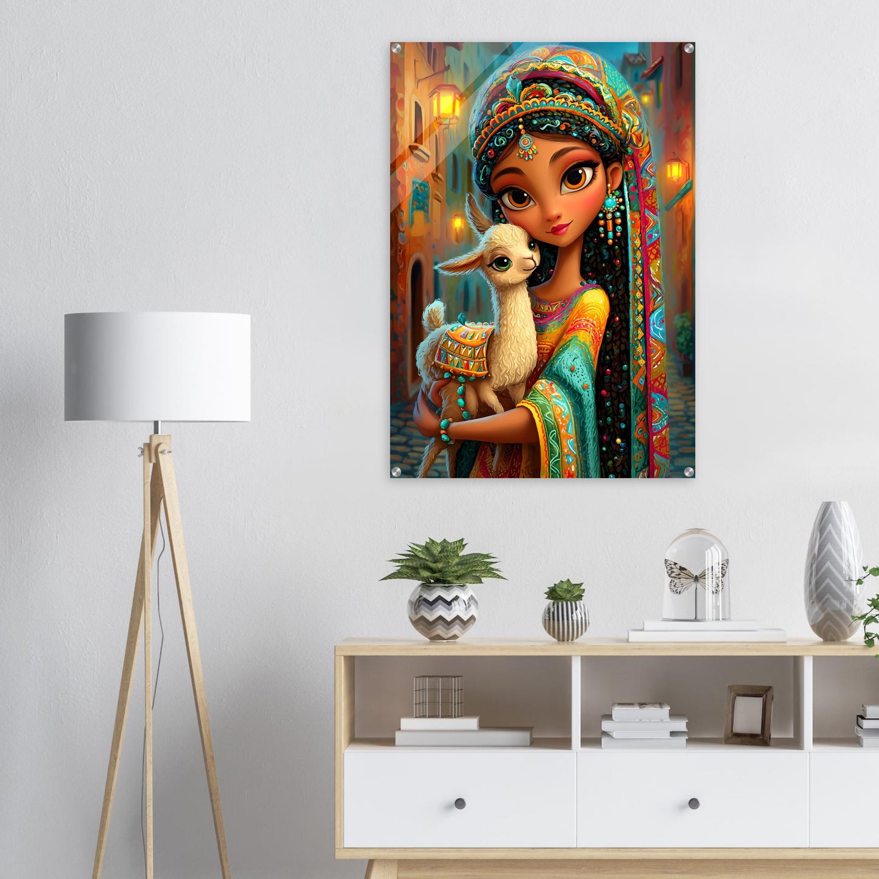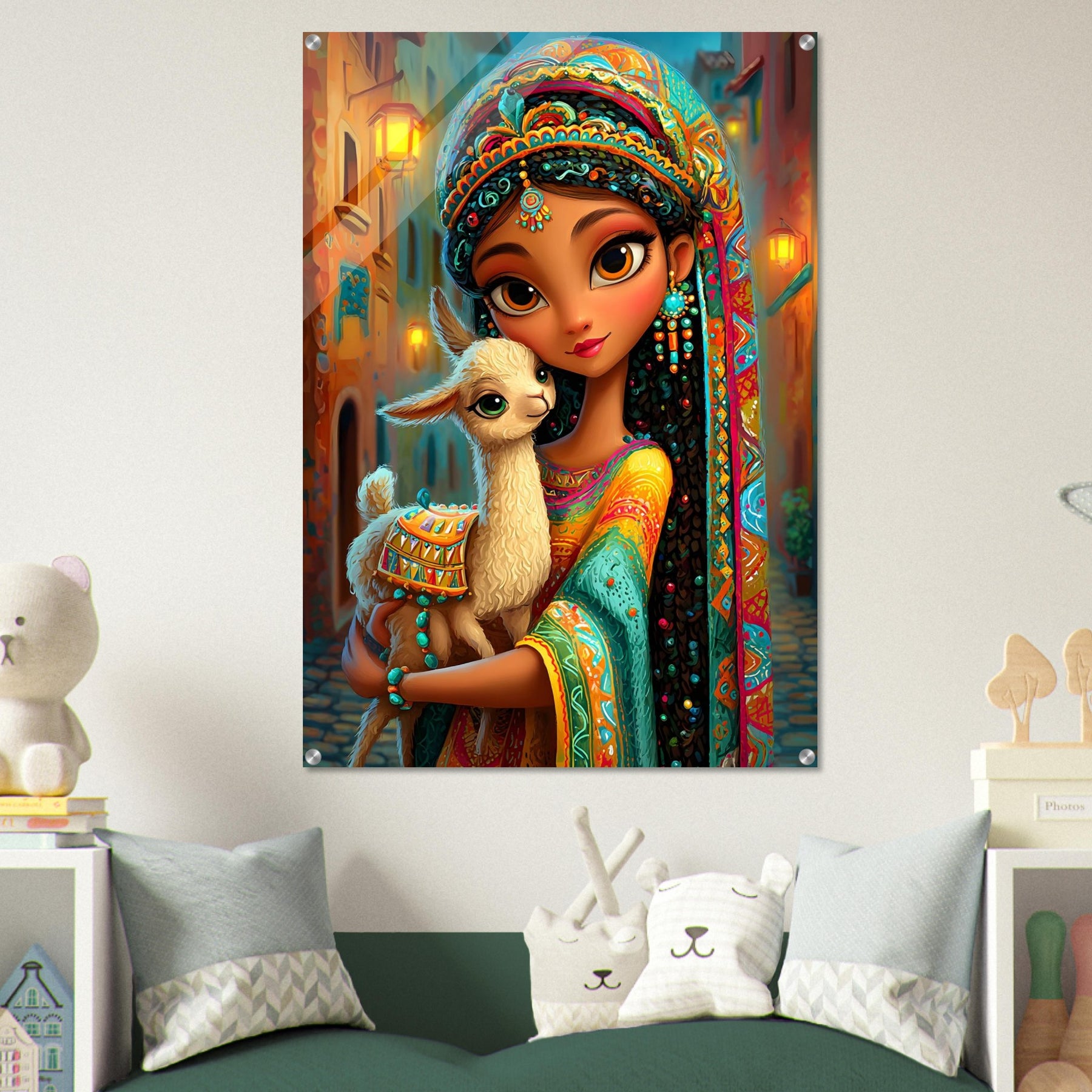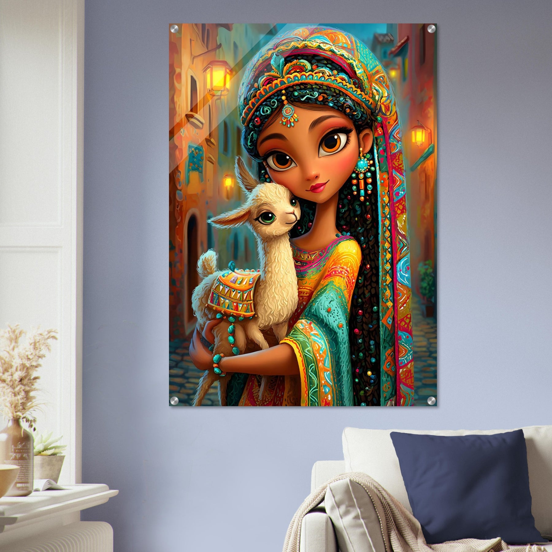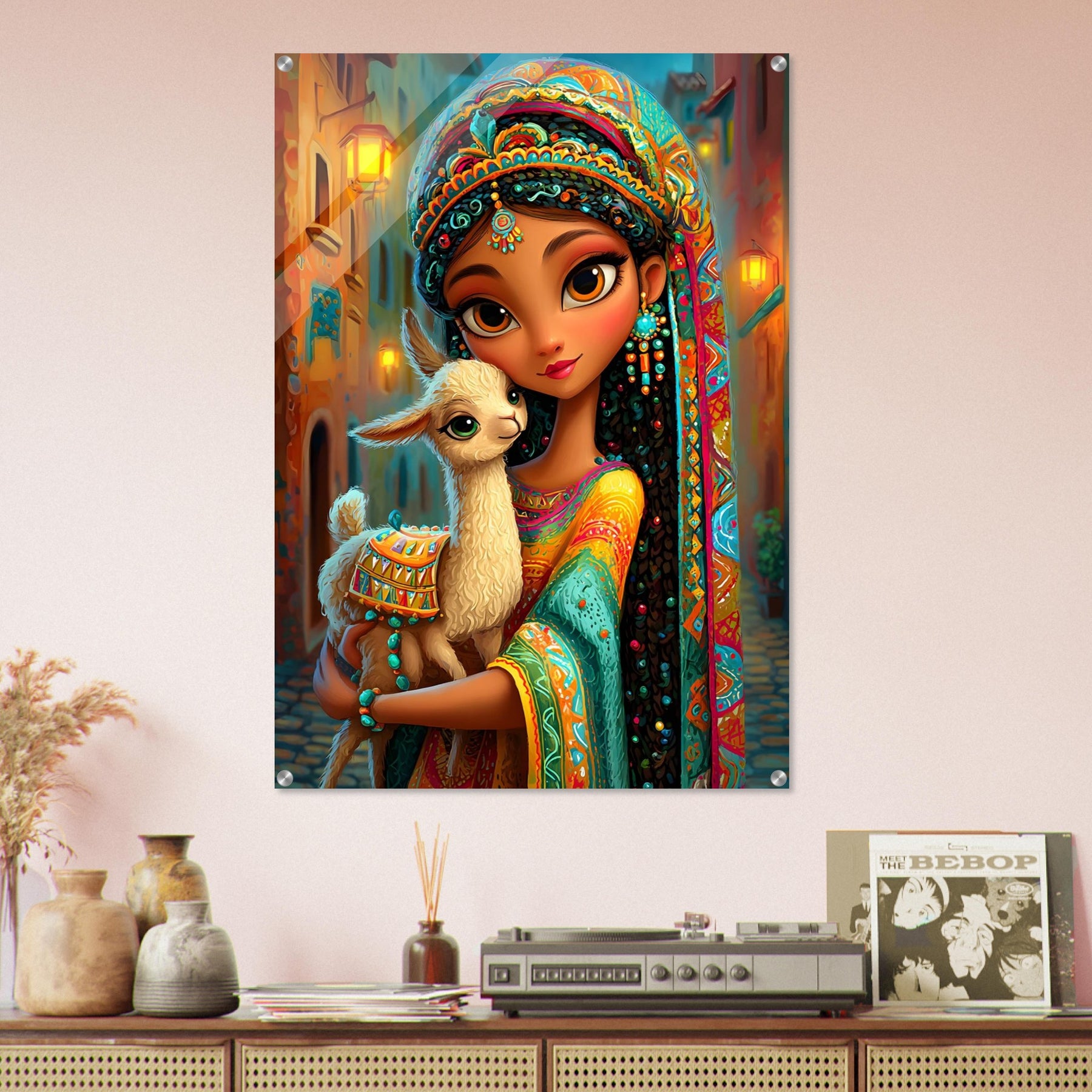 Transform your space with Llama Lane Dreams, a premium acrylic wall art piece that brings this magical street scene to life with luminous depth and clarity. The vibrant attire, cozy streetlights, and gentle llama shine beneath a glossy acrylic surface, creating a striking modern presentation.