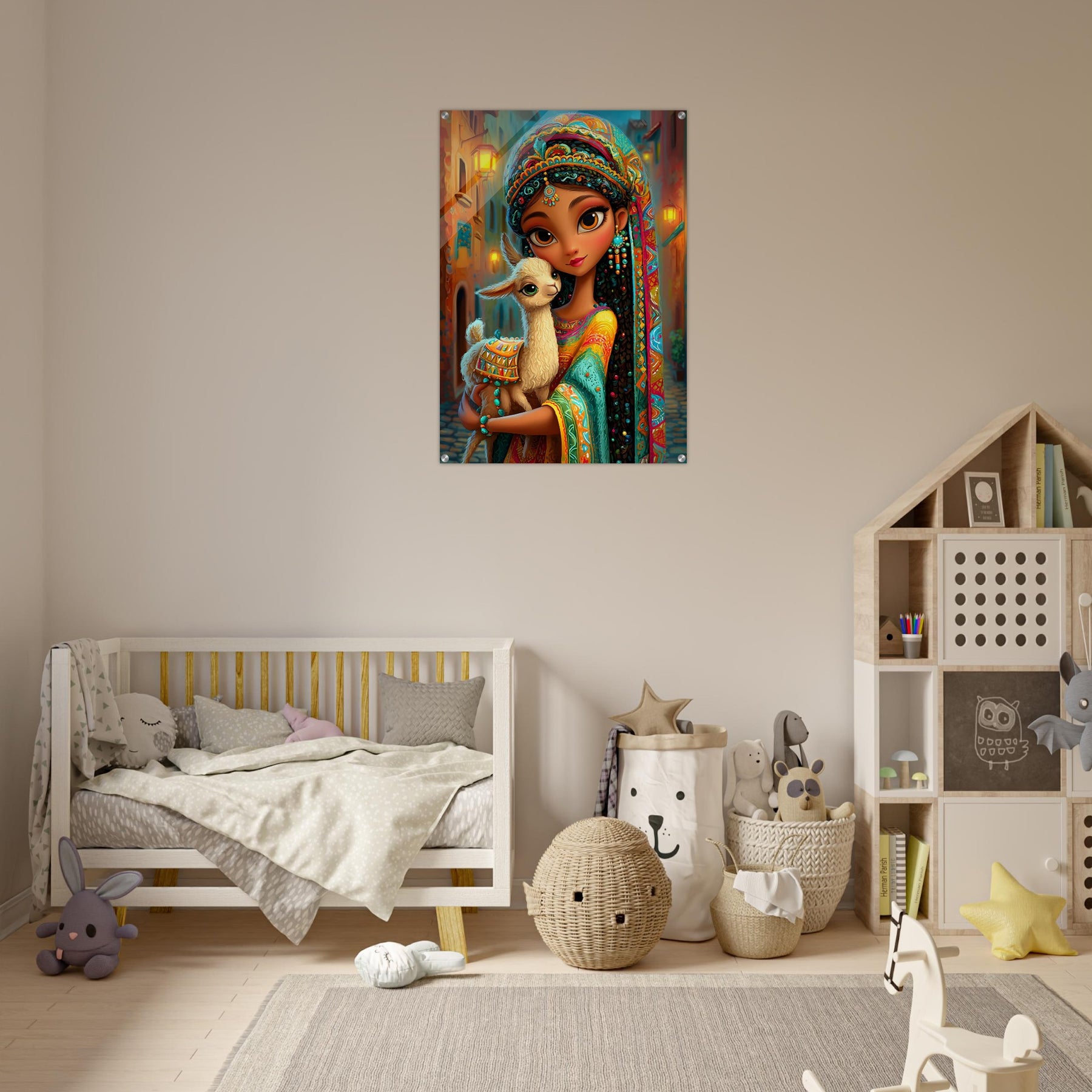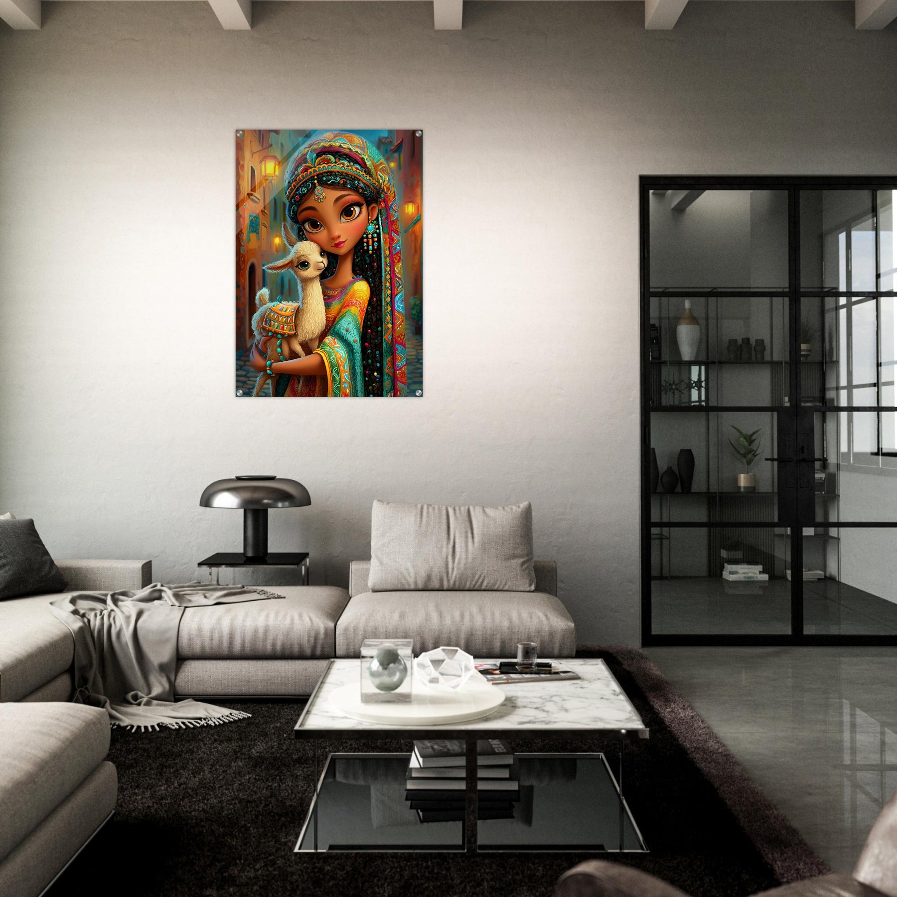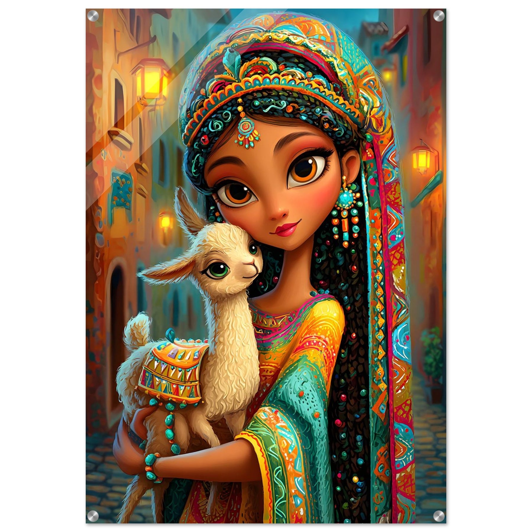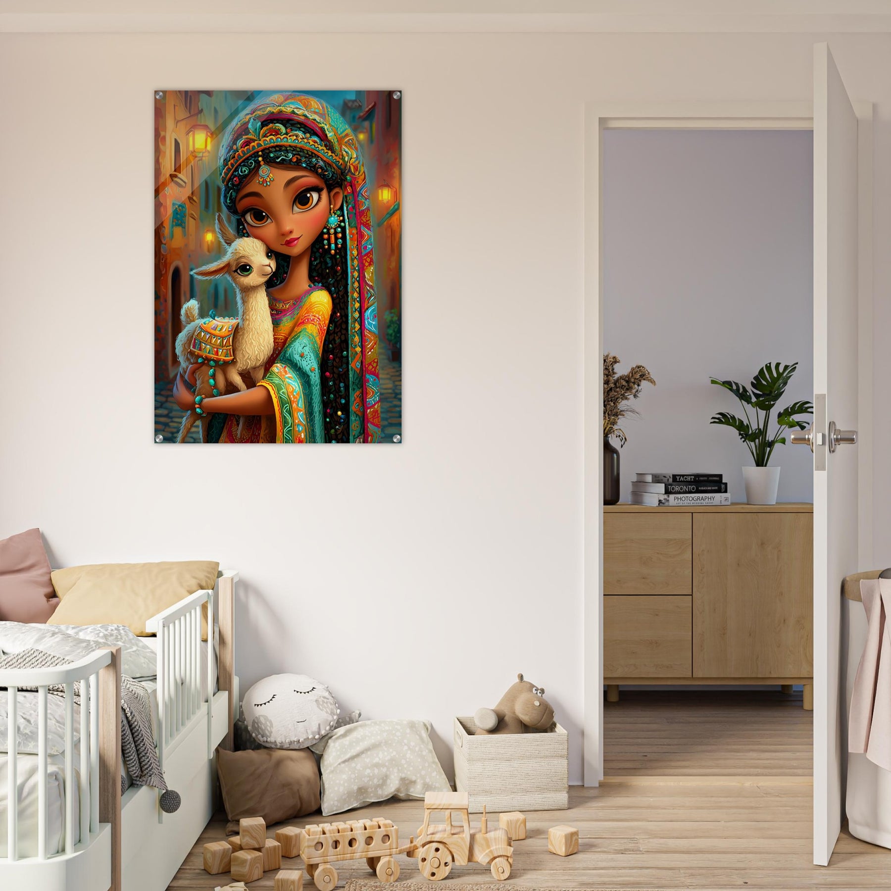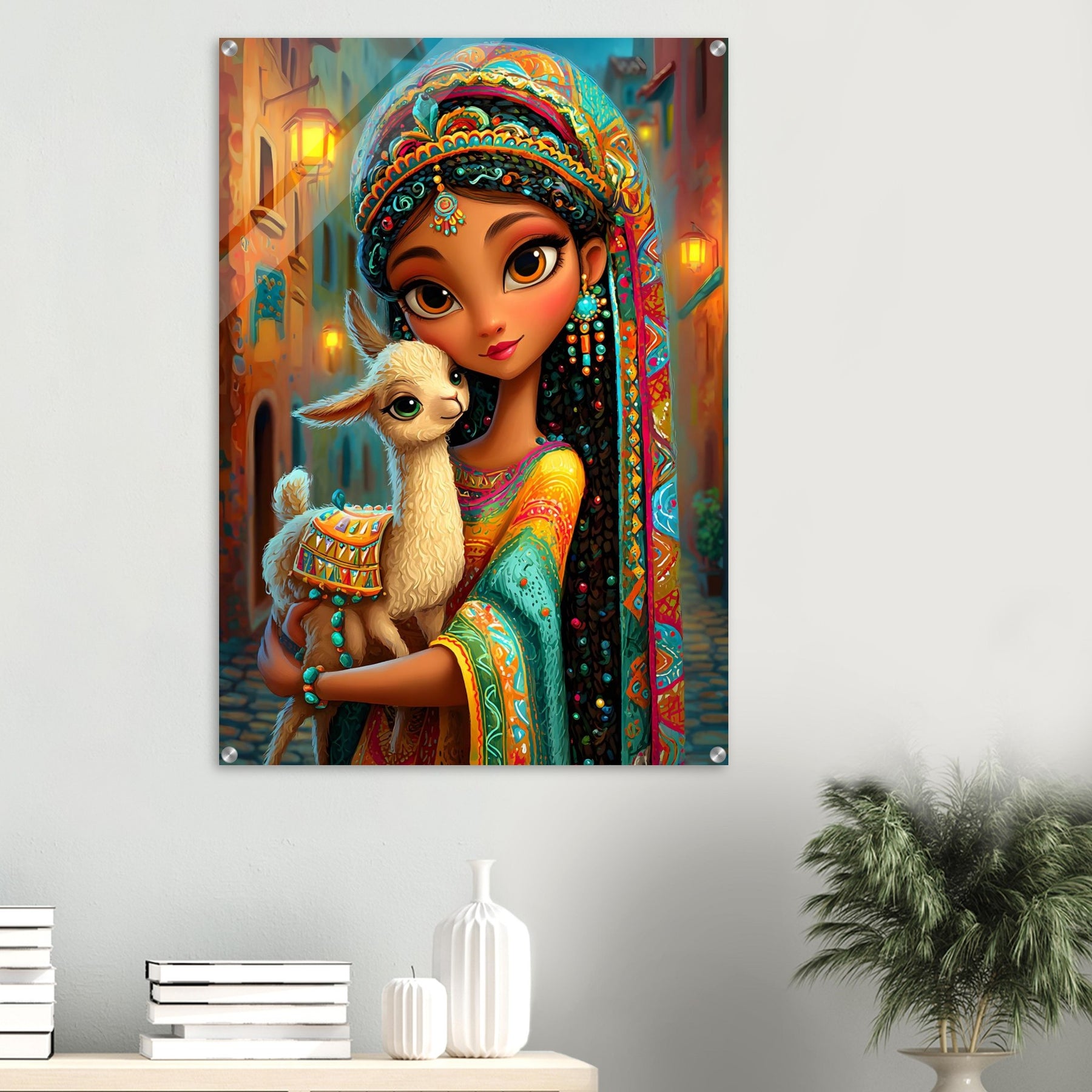 Transform your space with Llama Lane Dreams, a premium acrylic wall art piece that brings this magical street scene to life with luminous depth and clarity. The vibrant attire, cozy streetlights, and gentle llama shine beneath a glossy acrylic surface, creating a striking modern presentation.