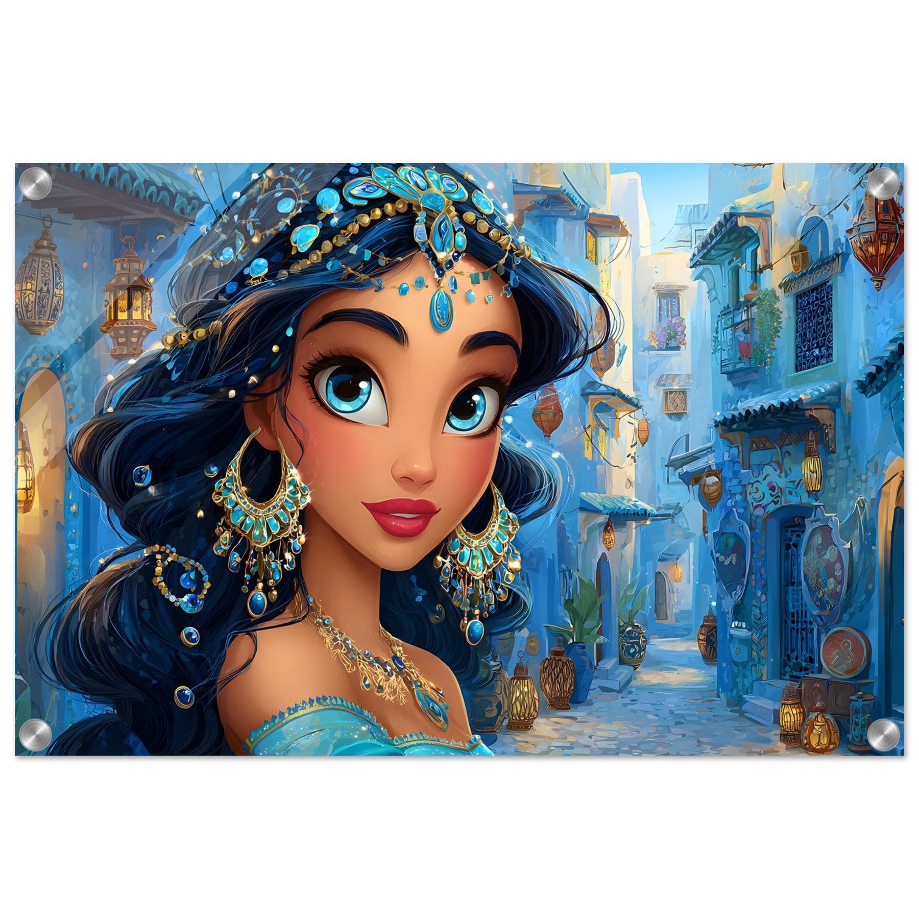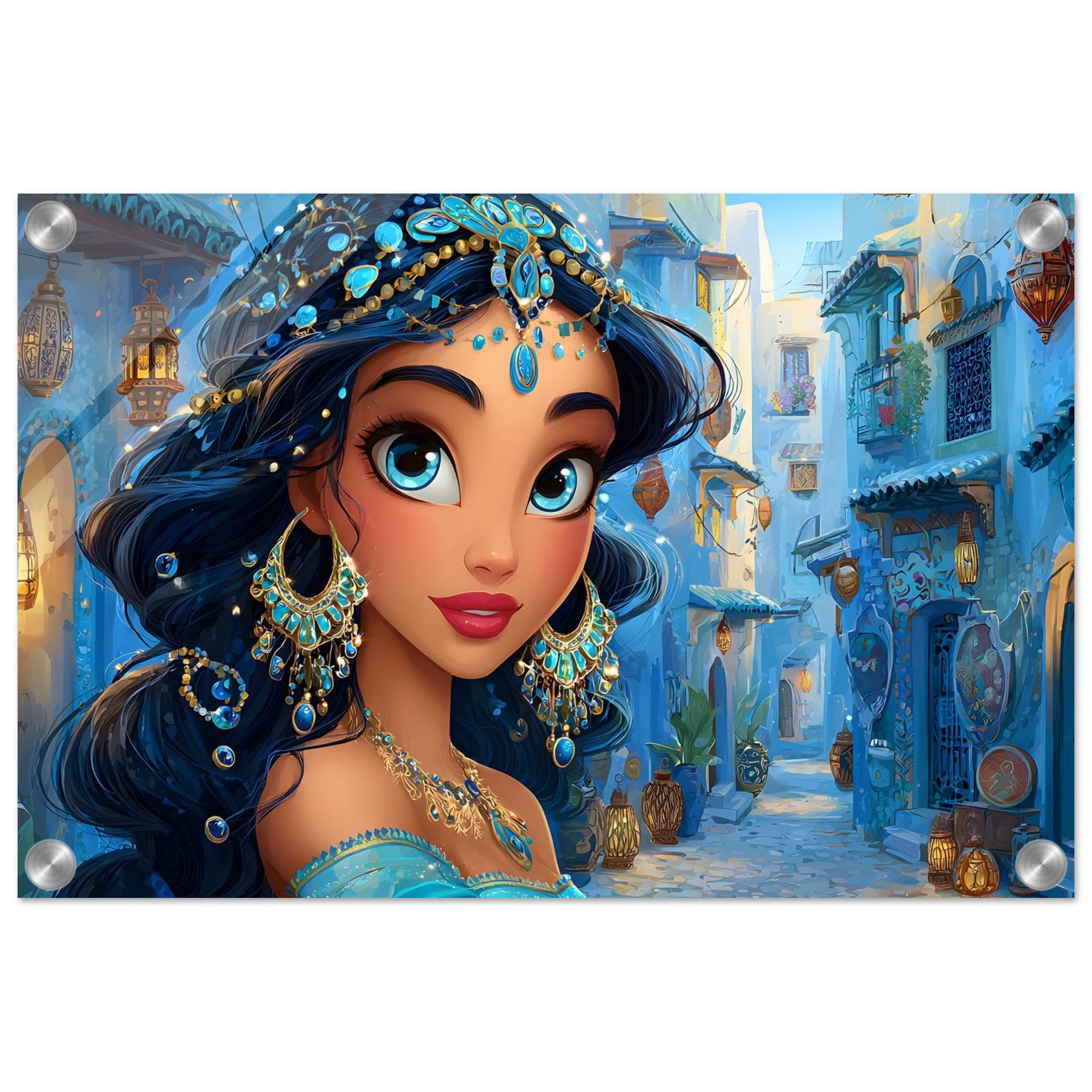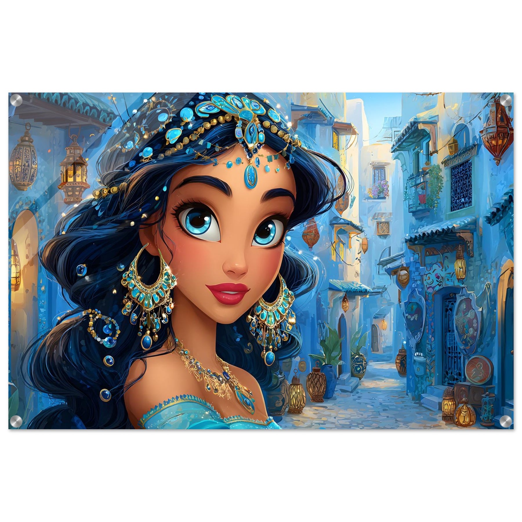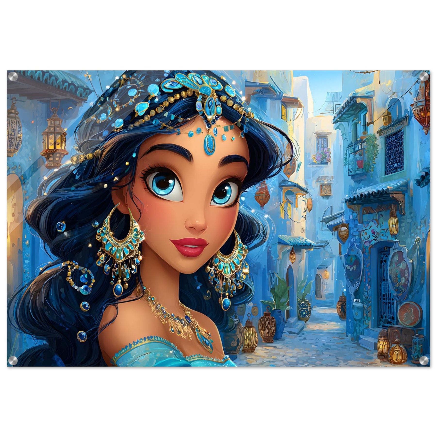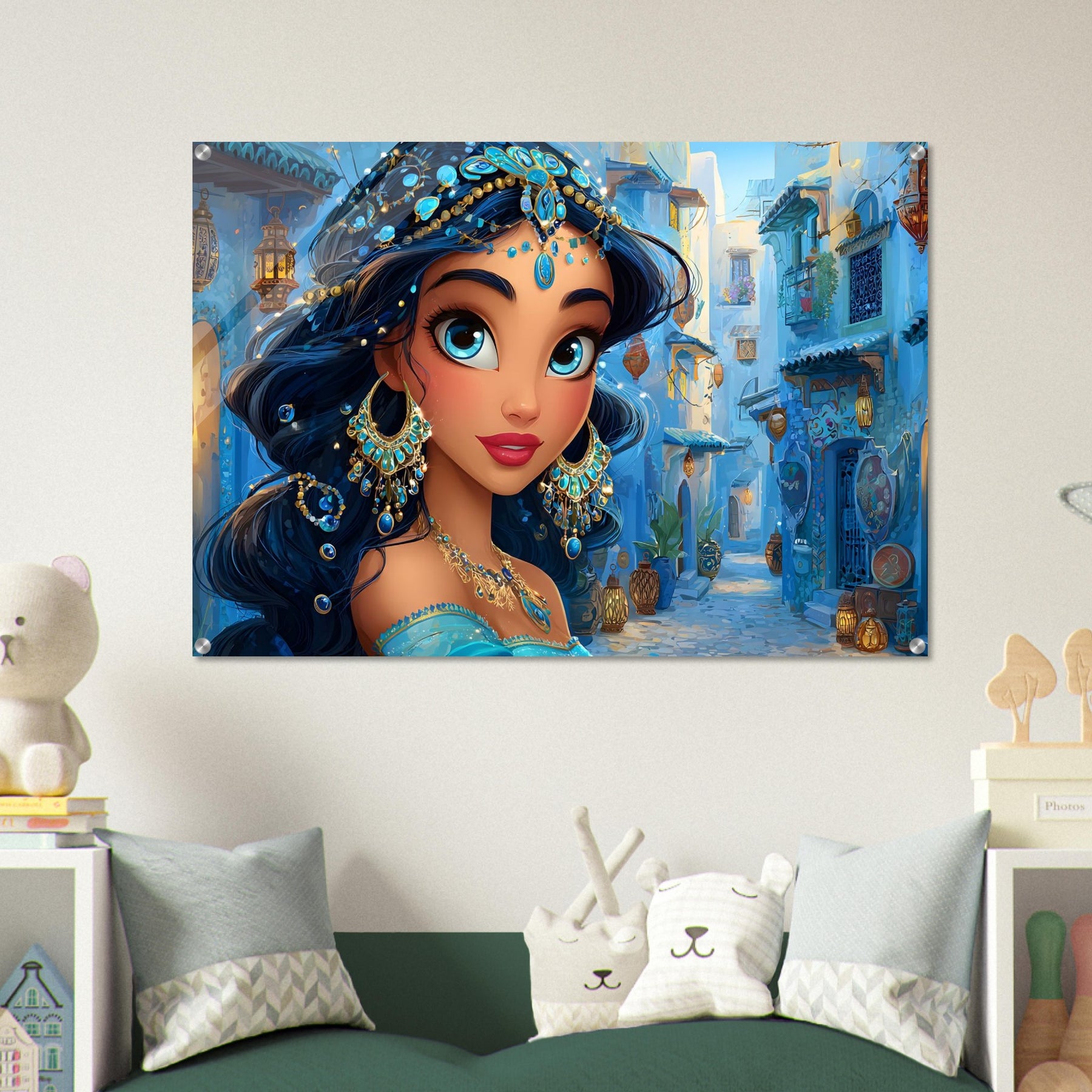 Transform your child’s room with Blue Jewel Streets, a stunning acrylic wall art piece that radiates elegance, imagination, and vibrant color. This beautiful illustration features a woman adorned in intricate blue jewelry and a turquoise outfit, set against a charming blue-toned street that glows with dreamy ambience.