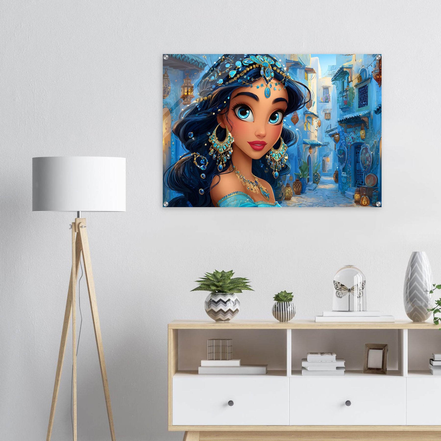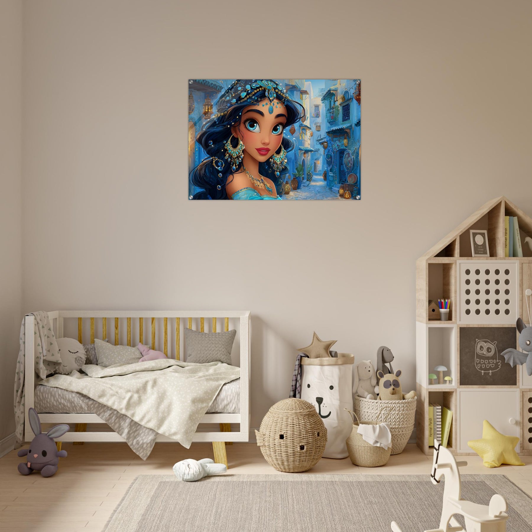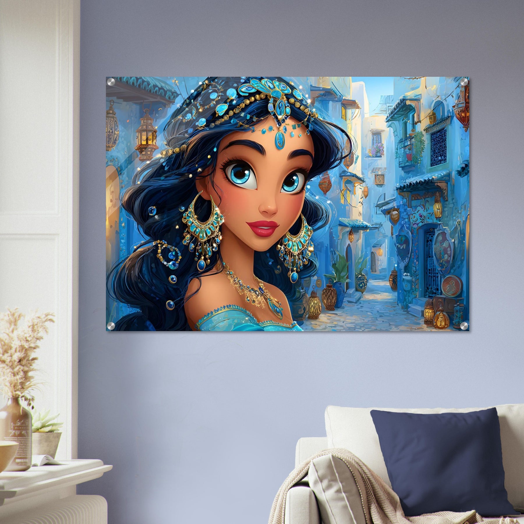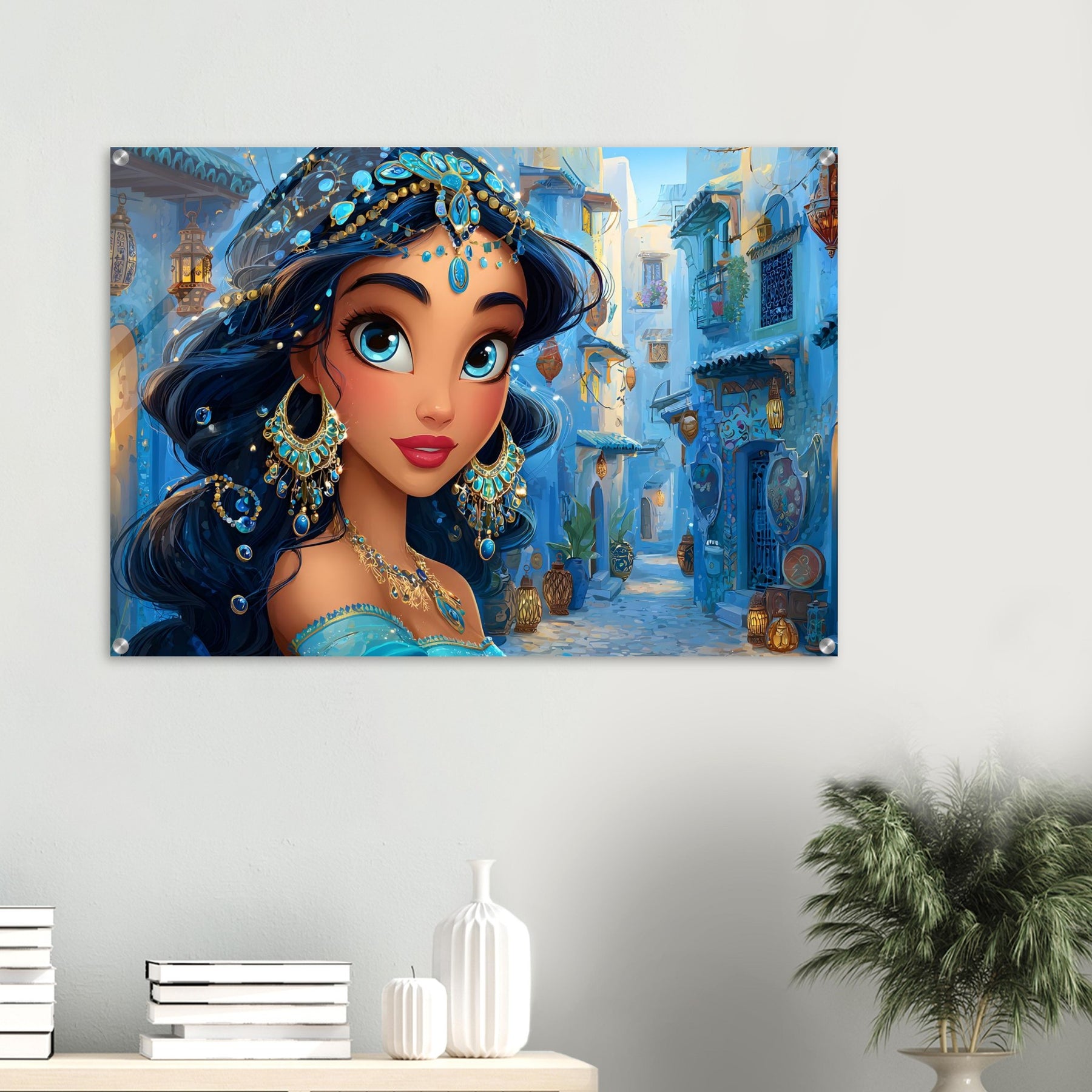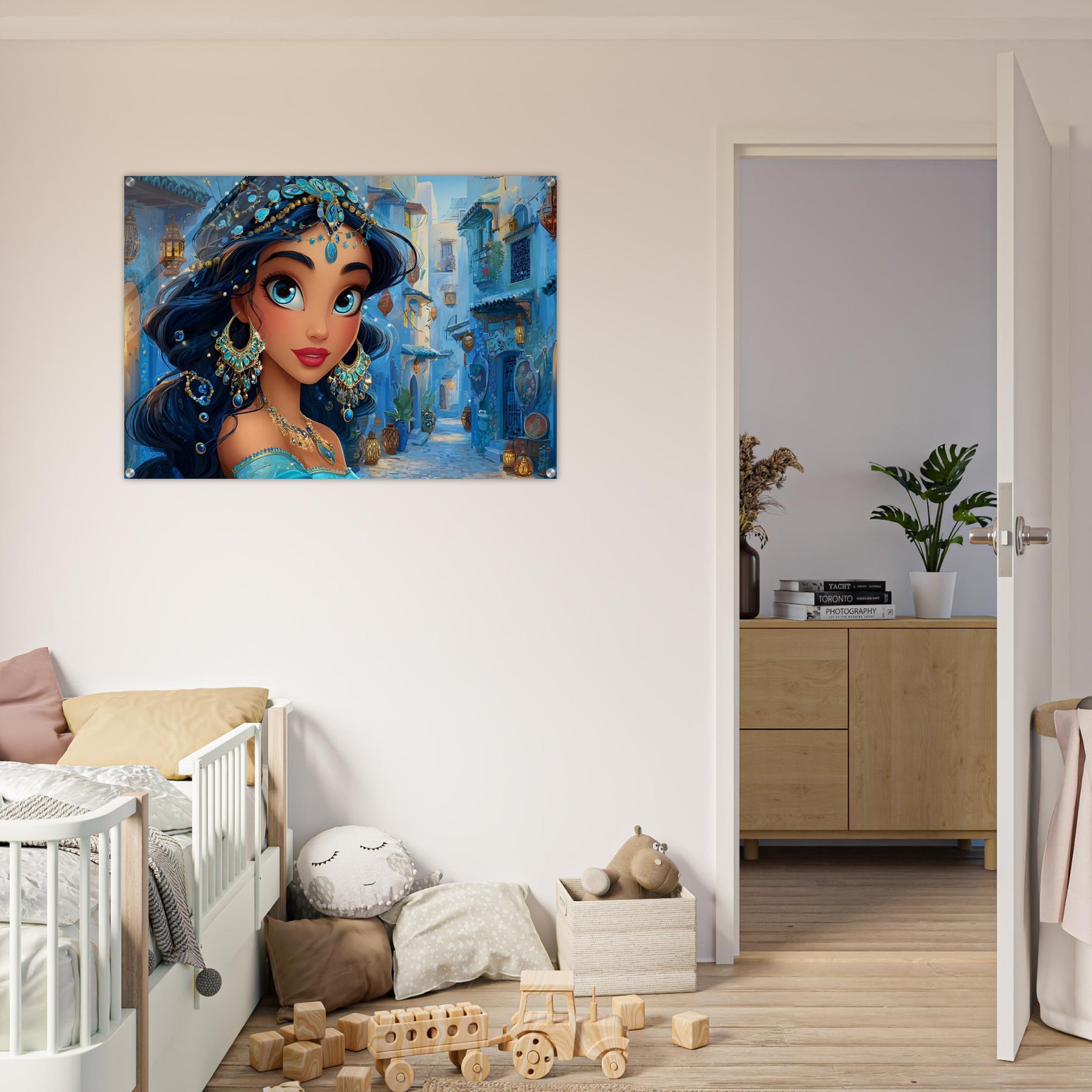 Transform your child’s room with Blue Jewel Streets, a stunning acrylic wall art piece that radiates elegance, imagination, and vibrant color. This beautiful illustration features a woman adorned in intricate blue jewelry and a turquoise outfit, set against a charming blue-toned street that glows with dreamy ambience.
