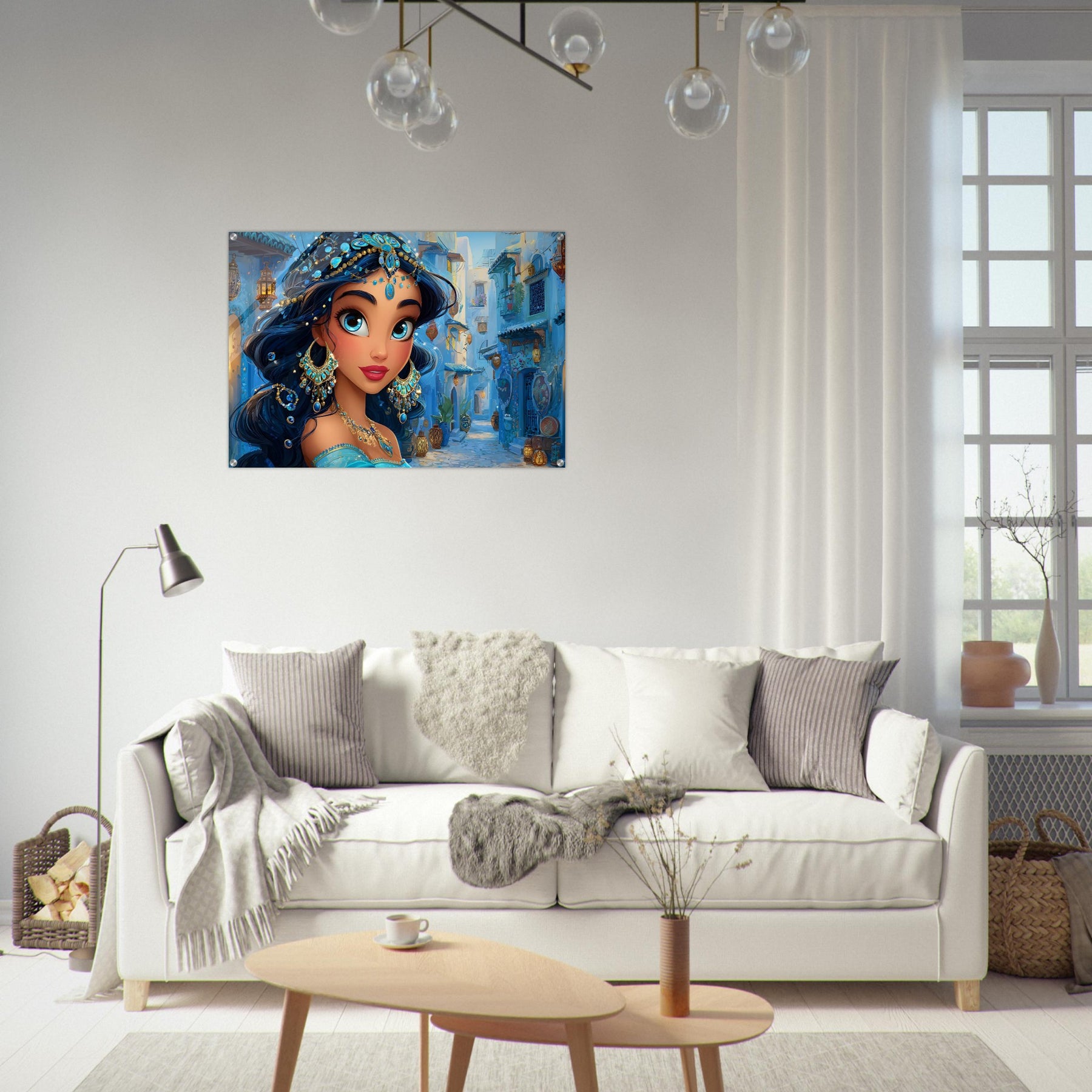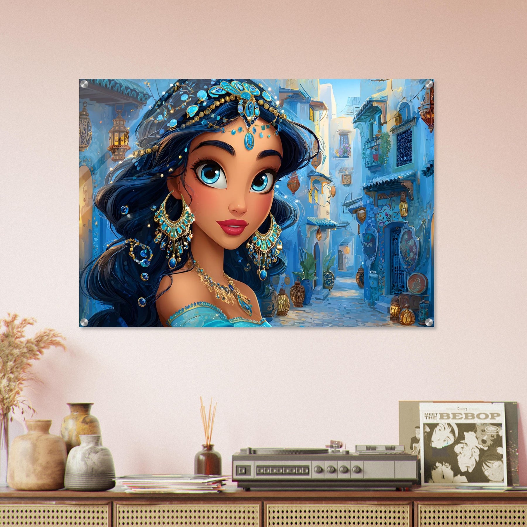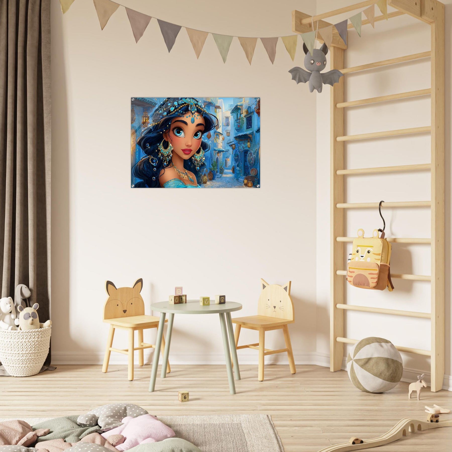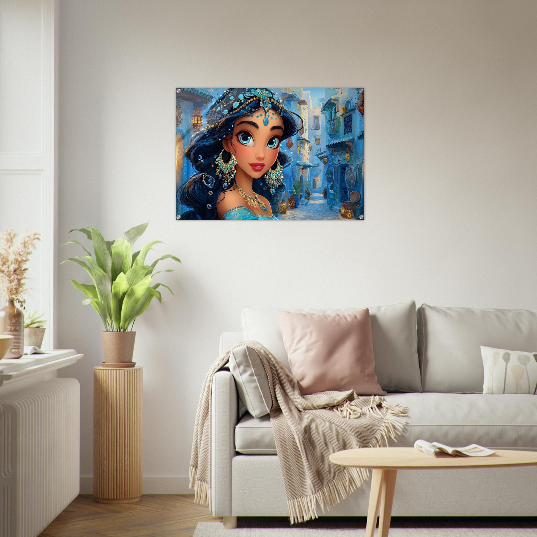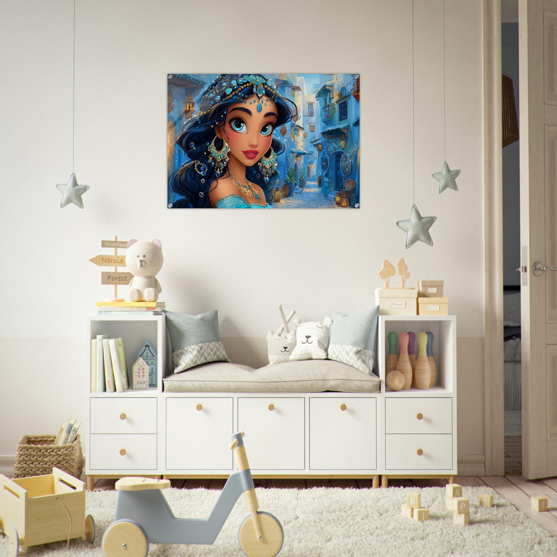 Transform your child’s room with Blue Jewel Streets, a stunning acrylic wall art piece that radiates elegance, imagination, and vibrant color. This beautiful illustration features a woman adorned in intricate blue jewelry and a turquoise outfit, set against a charming blue-toned street that glows with dreamy ambience.