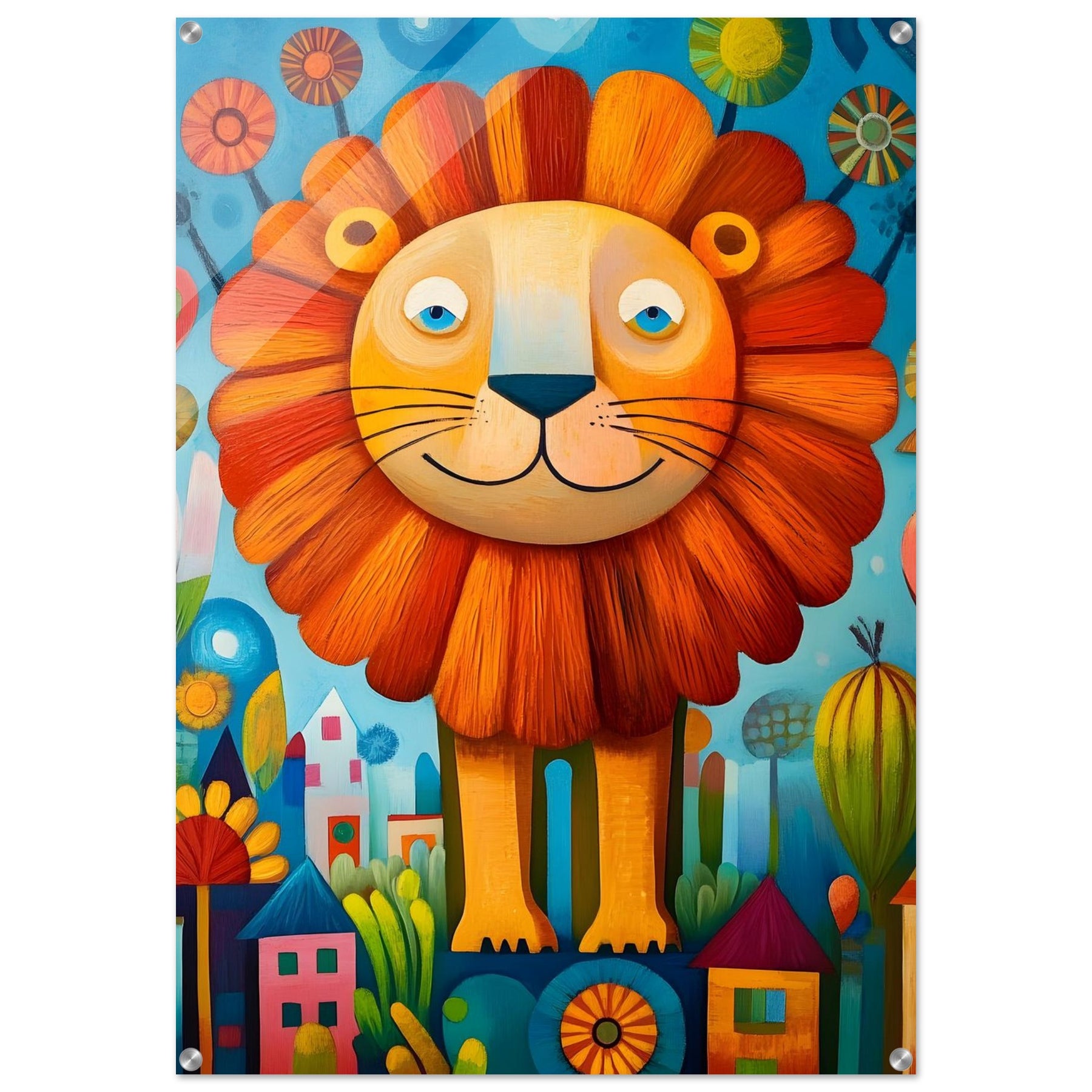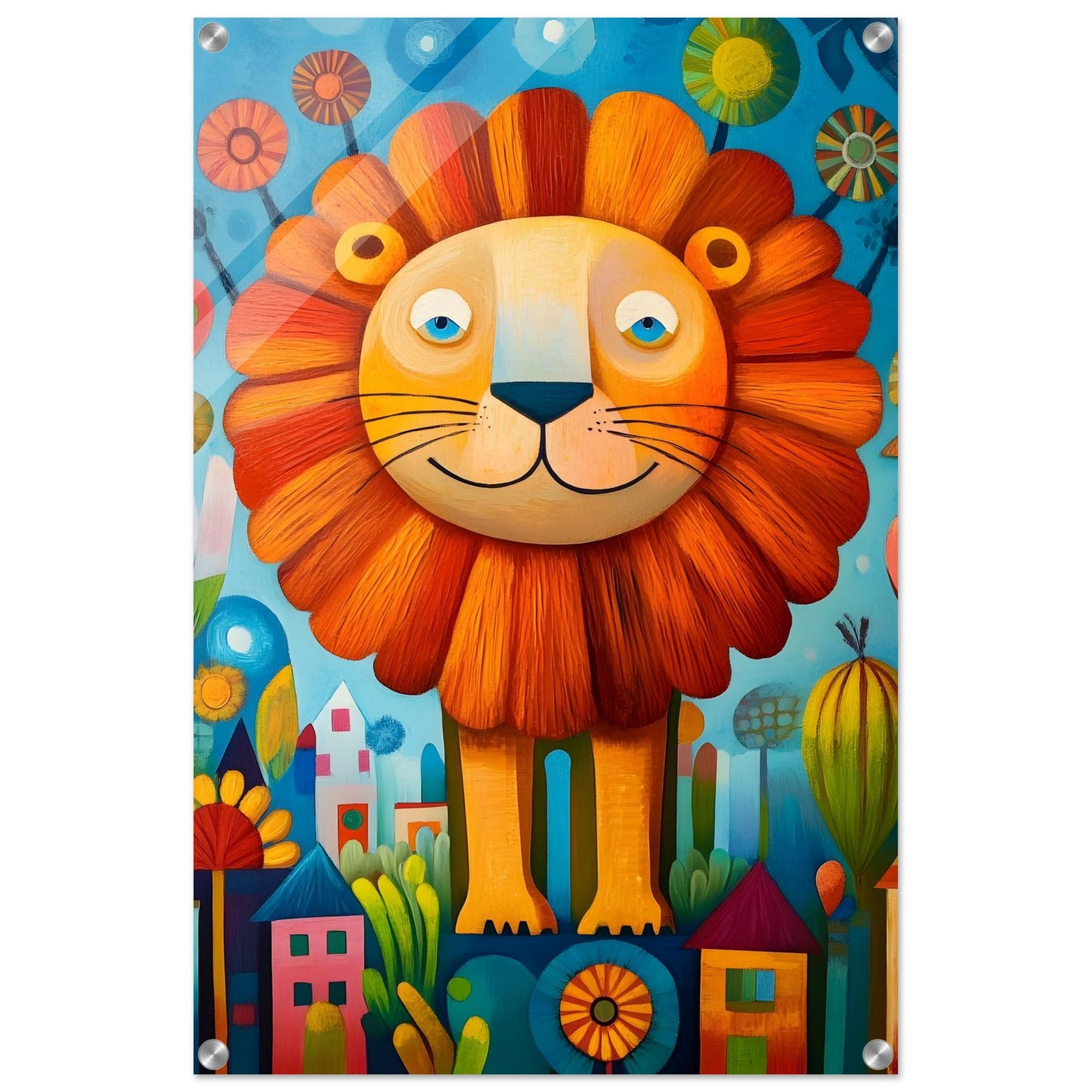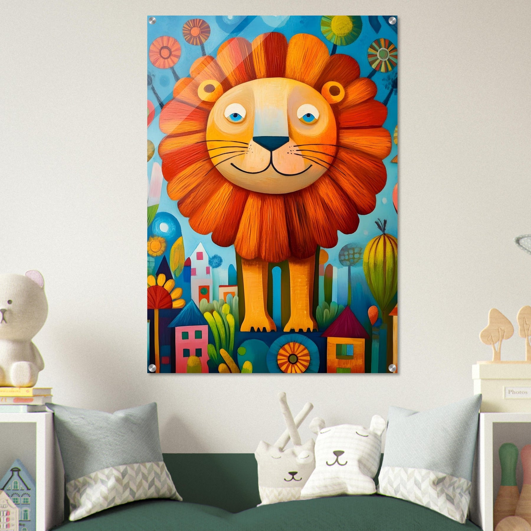Bring playful magic to your child’s room with Happy Lion Wonderland, a vibrant acrylic wall art piece designed for modern kids’ spaces. The joyful lion, colorful flowers, and abstract houses shine with brilliant depth and clarity, creating a fun and eye-catching focal point.