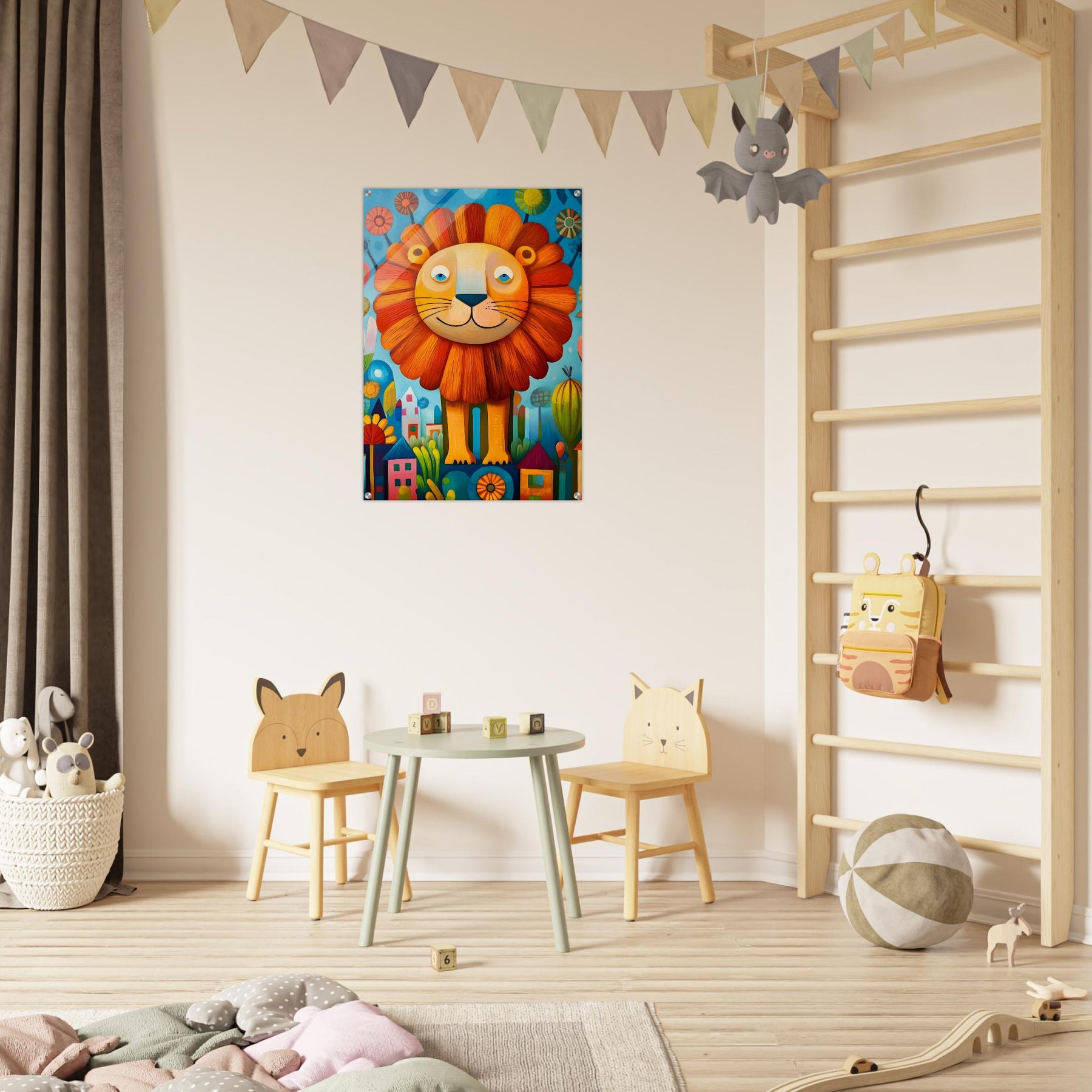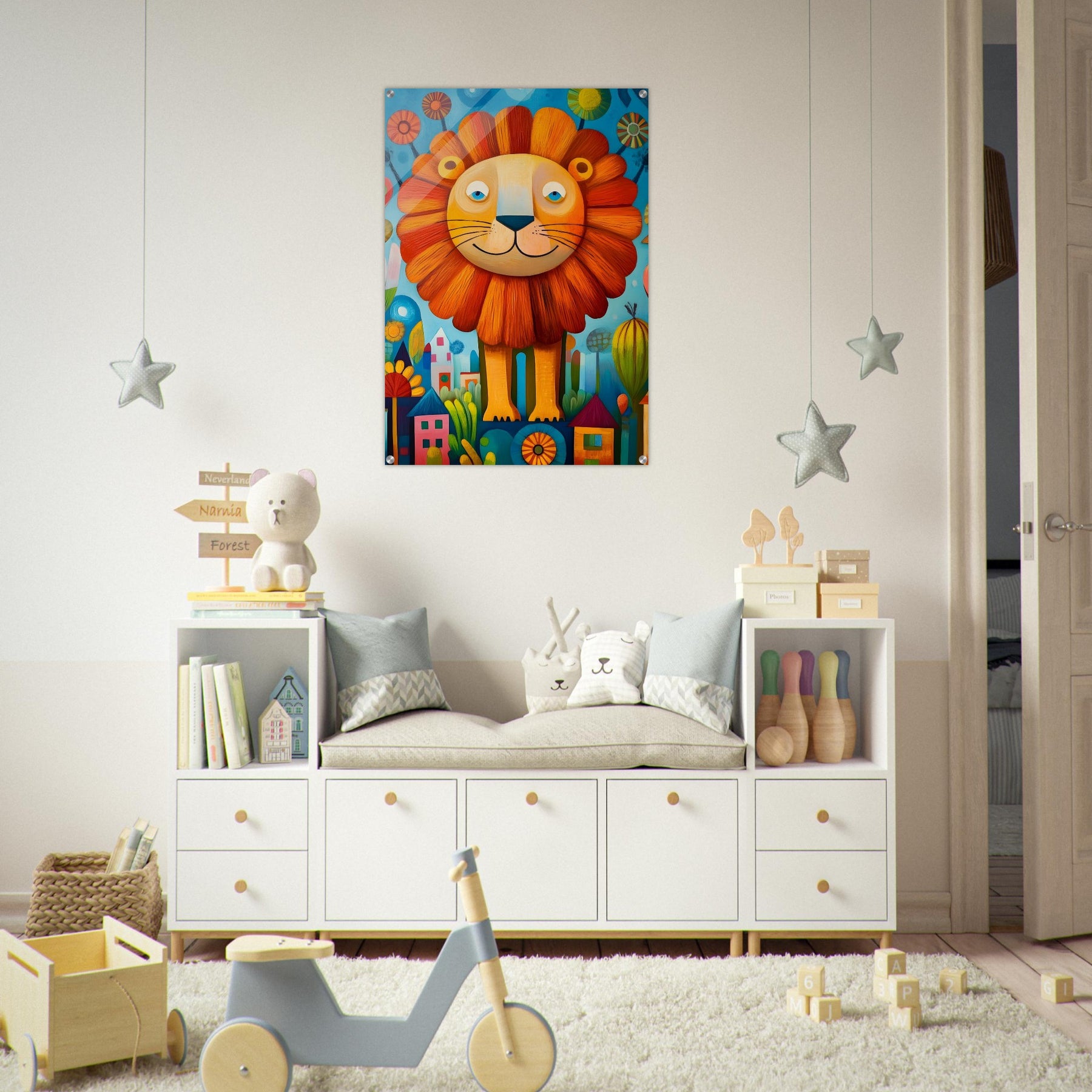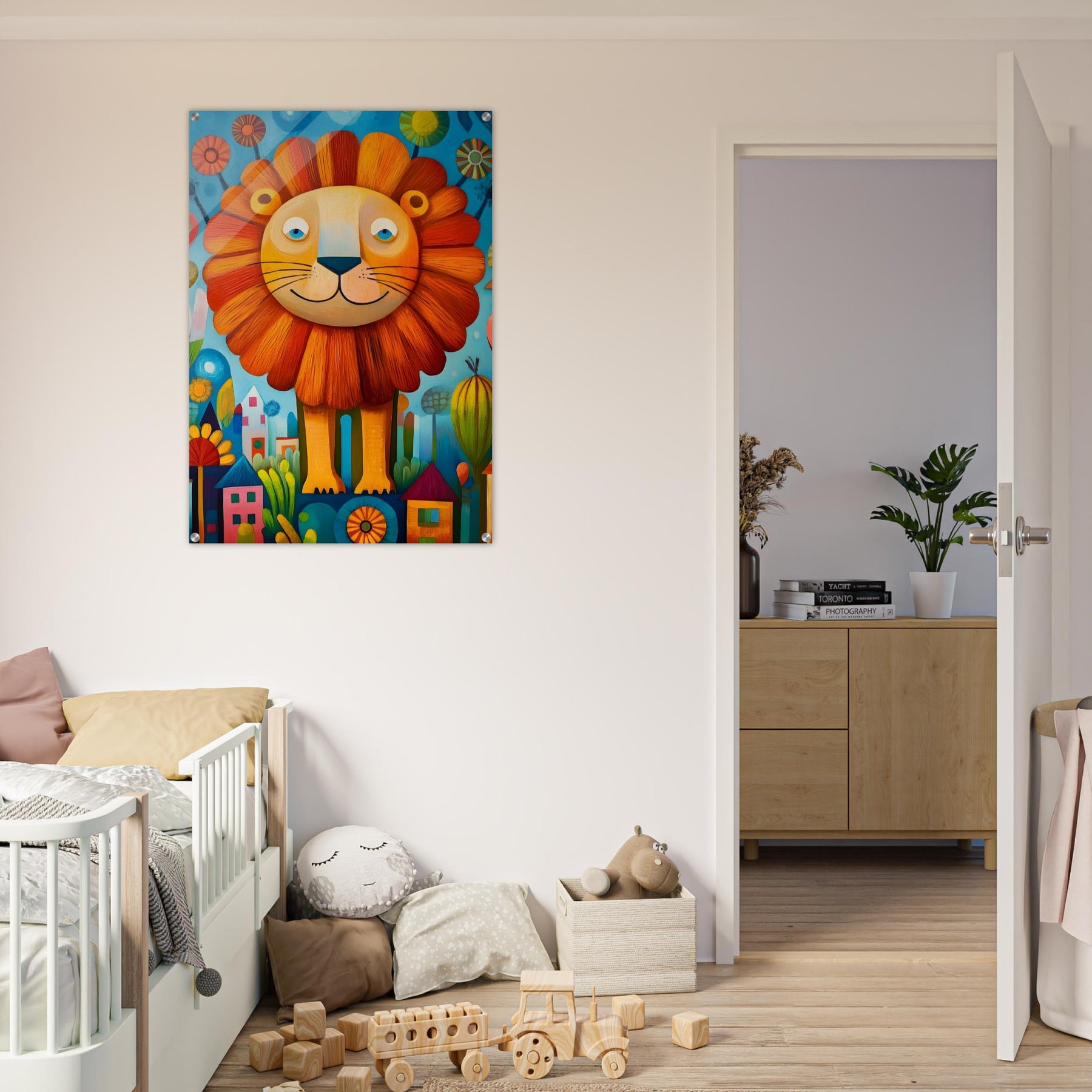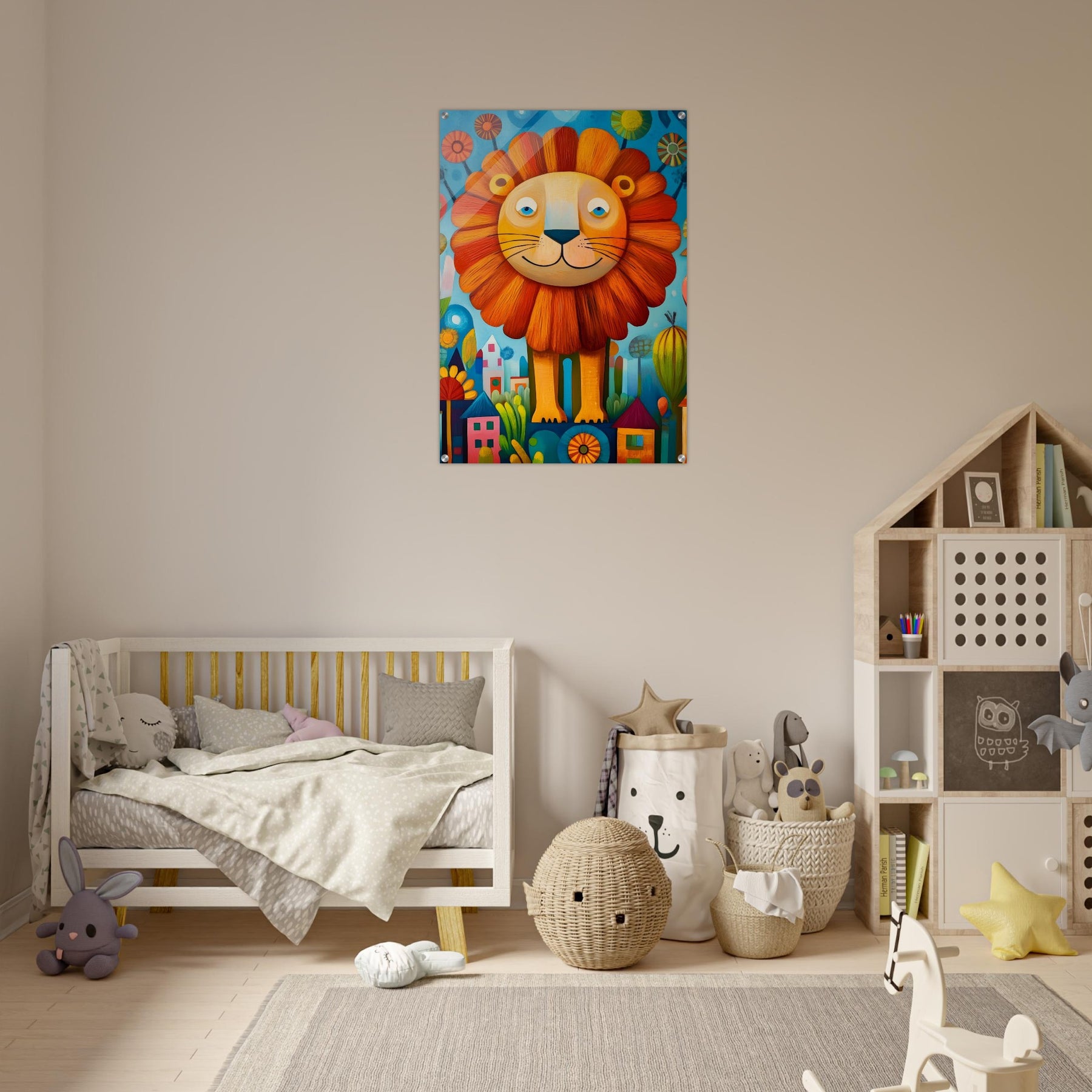 Bring playful magic to your child’s room with Happy Lion Wonderland, a vibrant acrylic wall art piece designed for modern kids’ spaces. The joyful lion, colorful flowers, and abstract houses shine with brilliant depth and clarity, creating a fun and eye-catching focal point.