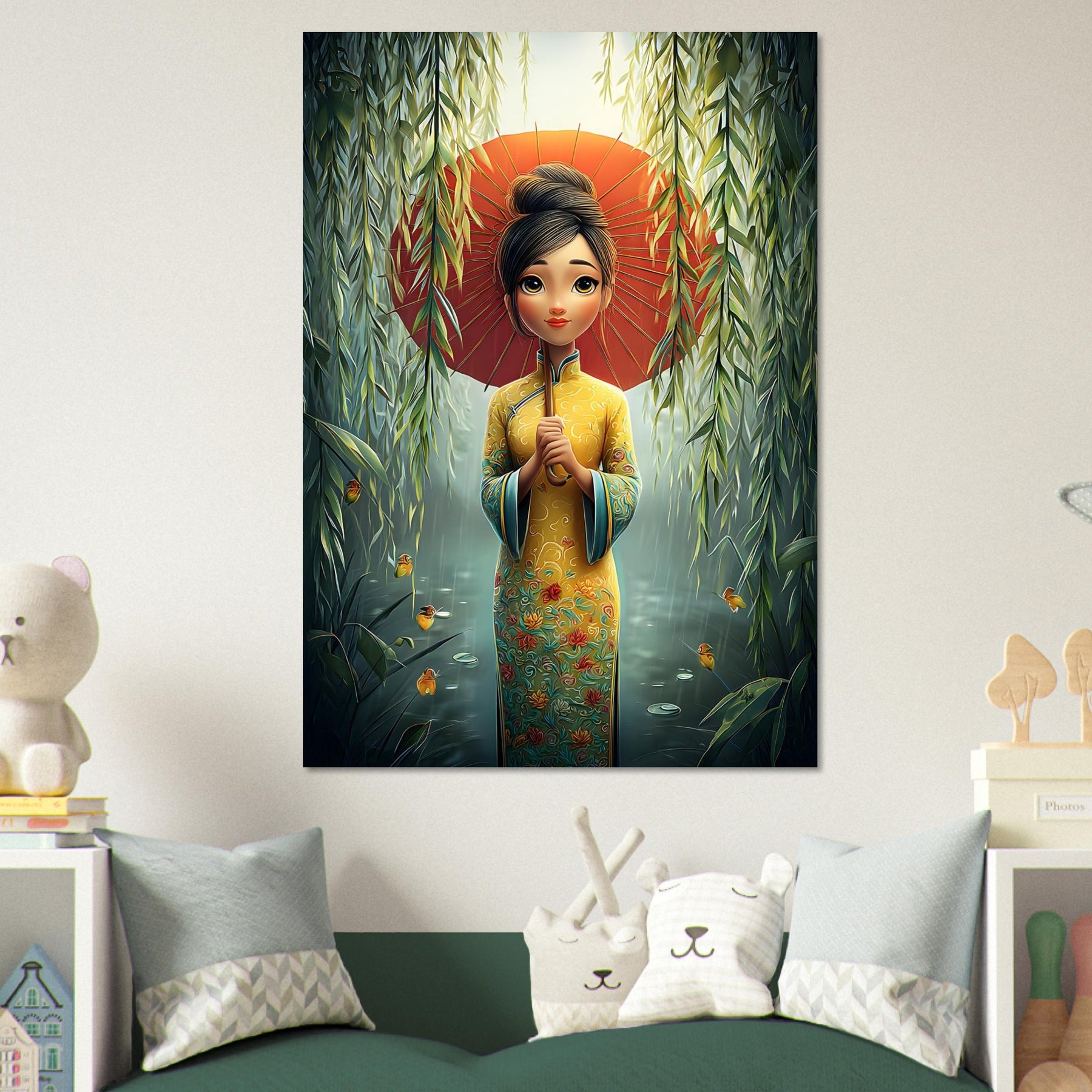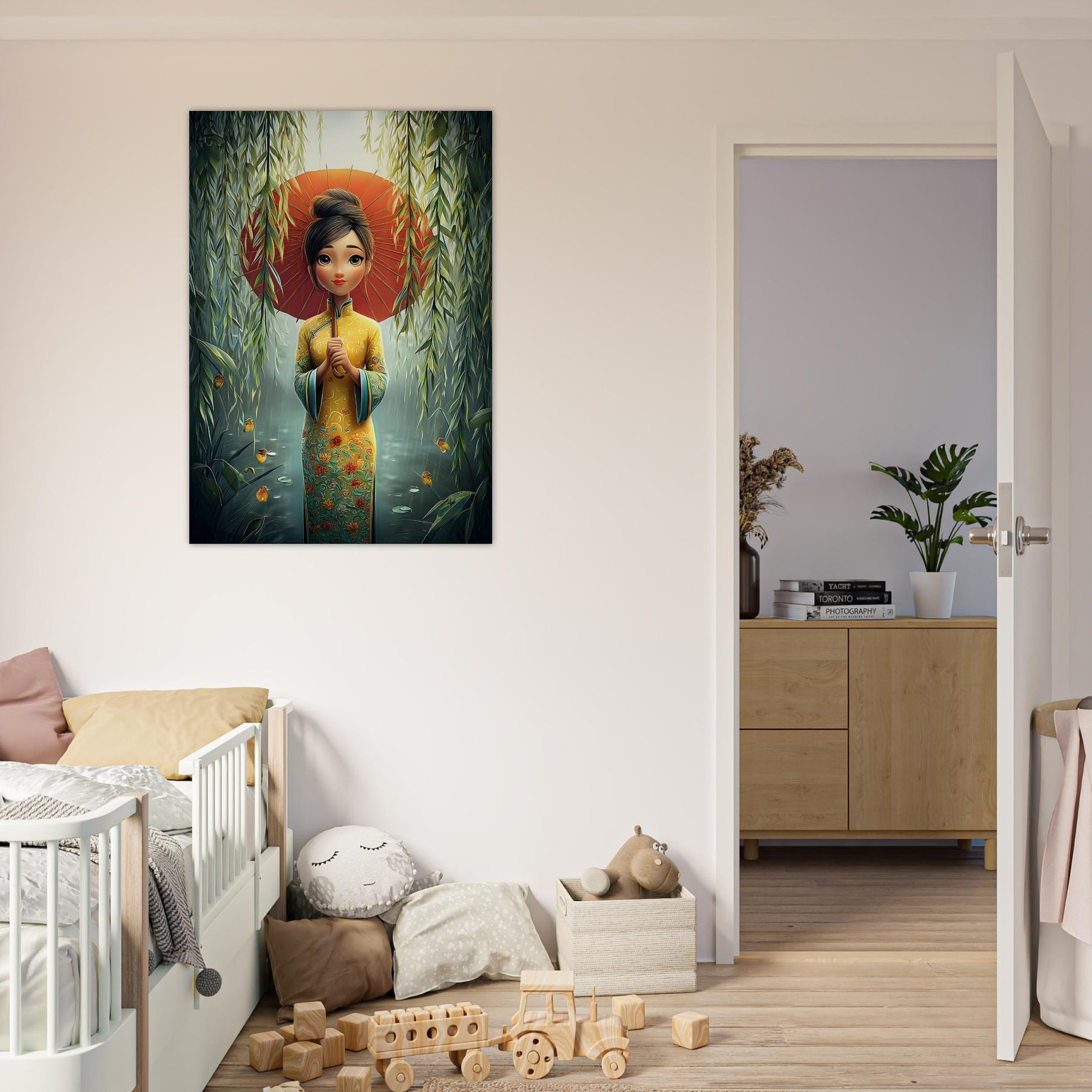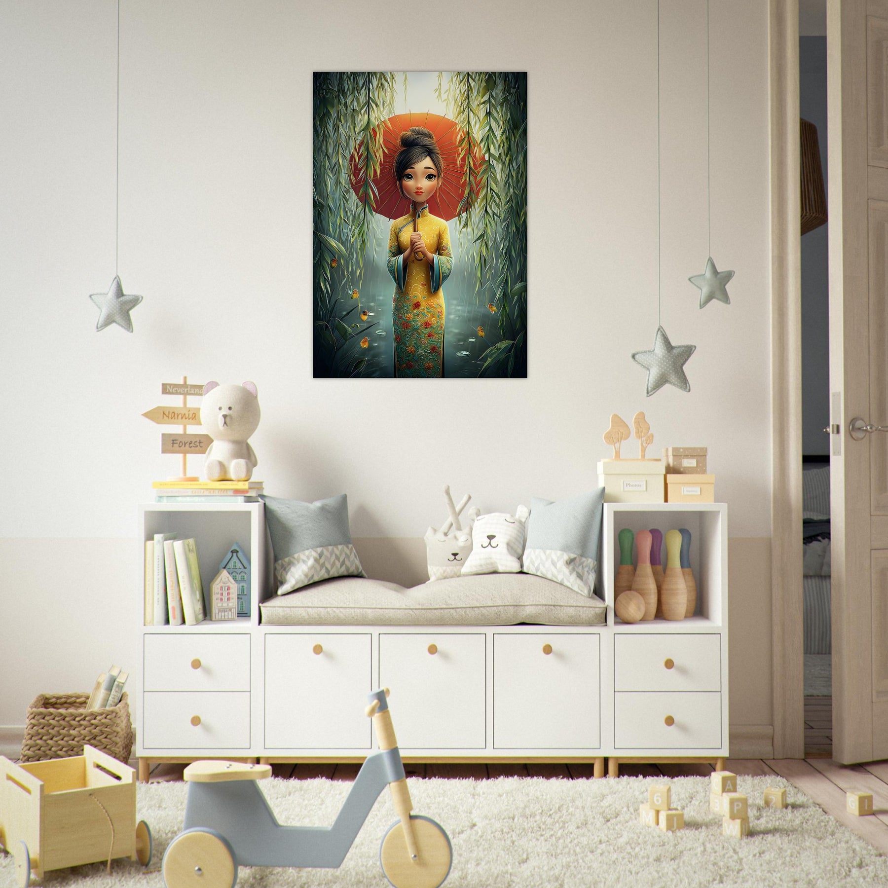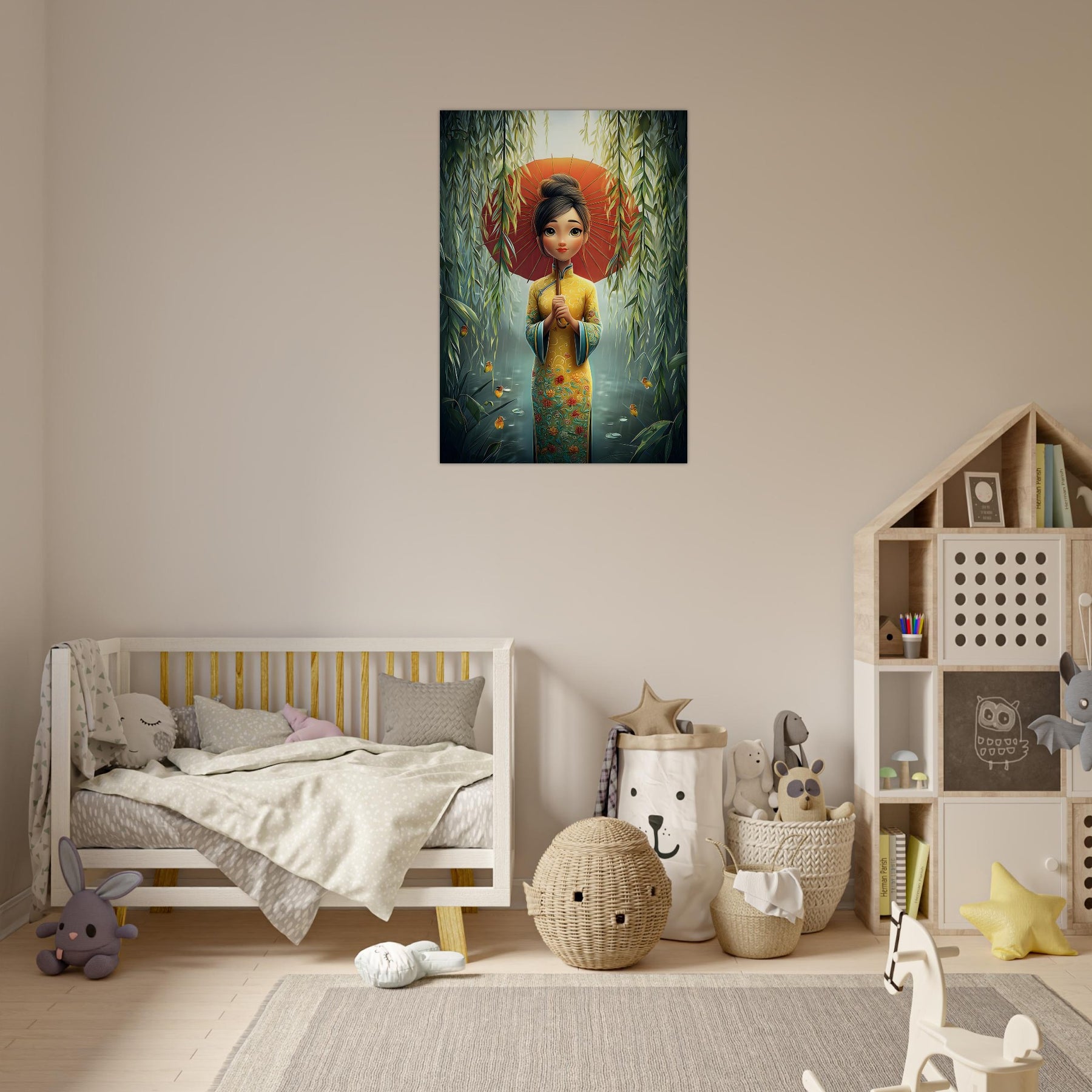 Bring elegance, color, and imagination into your child’s room with Grace in the Garden, a stunning whimsical aluminum illustration designed to create a serene and enchanting atmosphere. This captivating artwork features a beautiful woman dressed in traditional attire, gently holding a vibrant red parasol as she stands amidst lush greenery in a dreamy, nature-inspired scene.