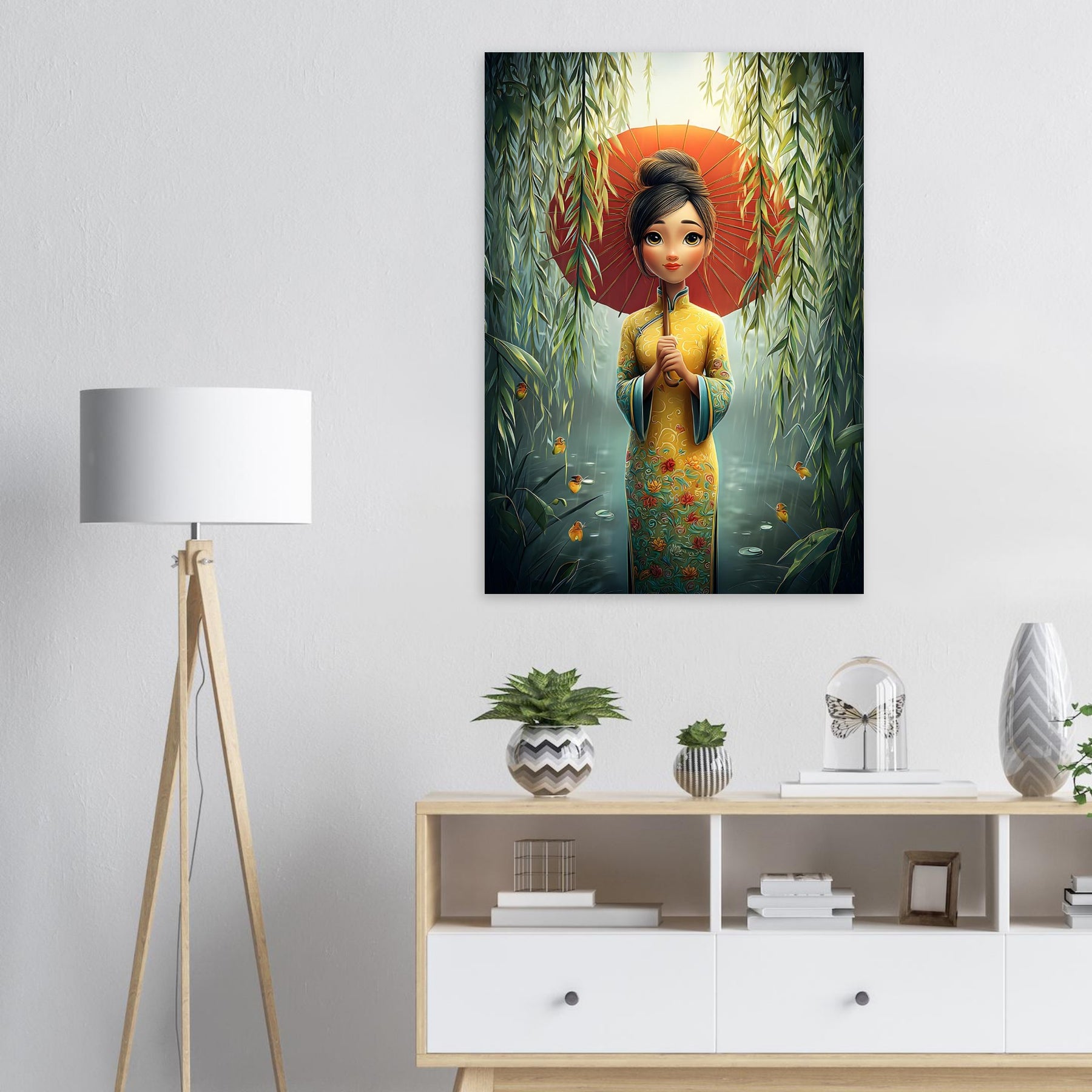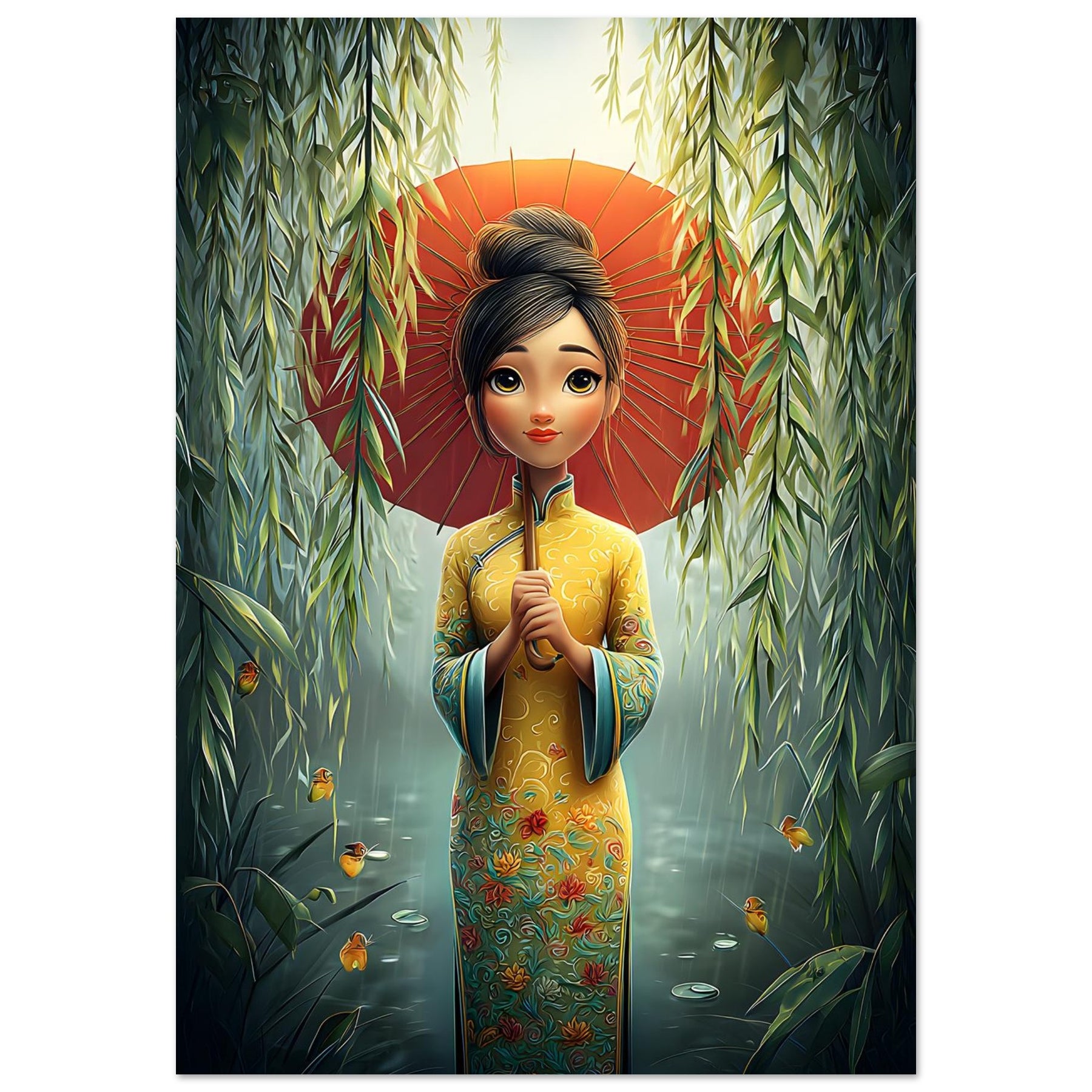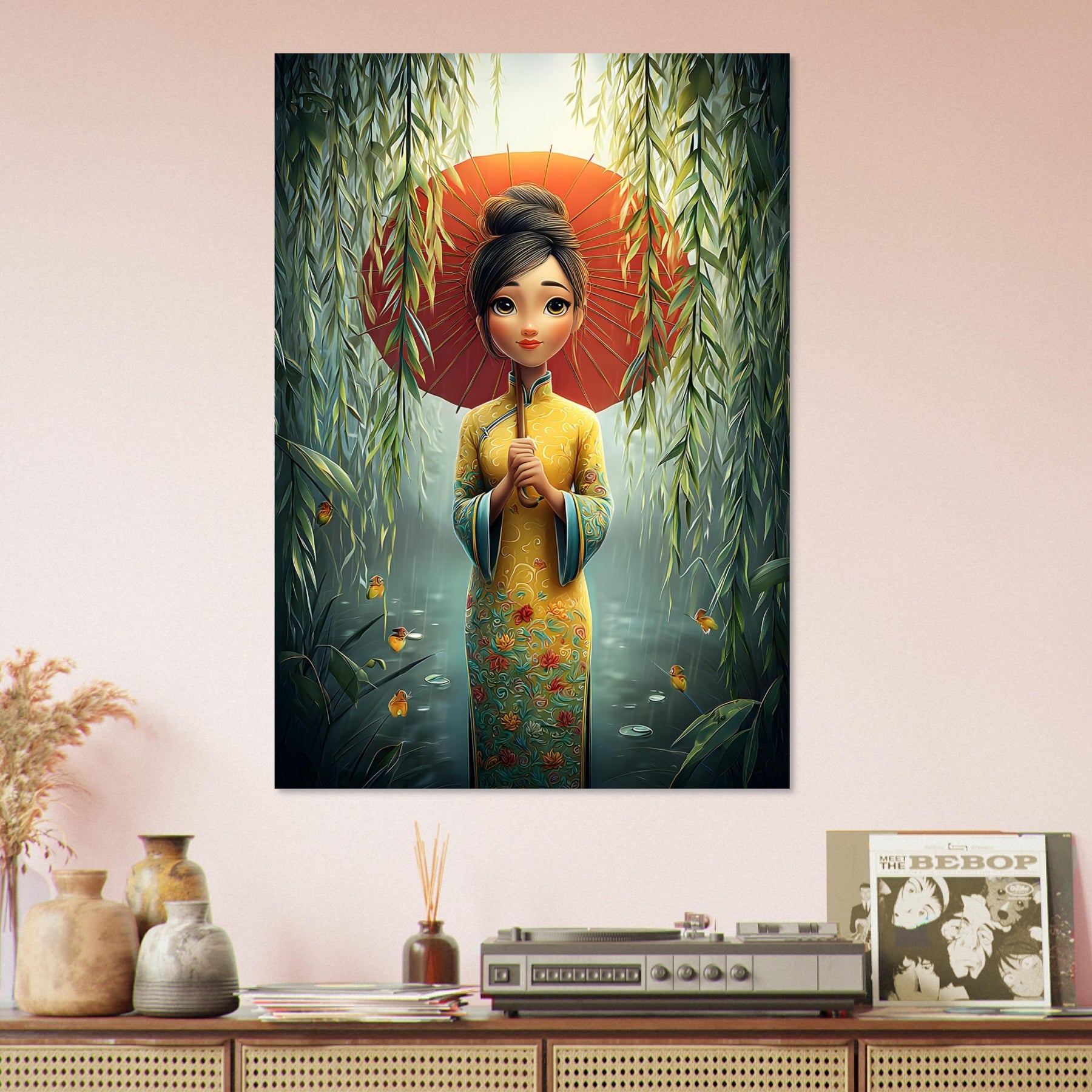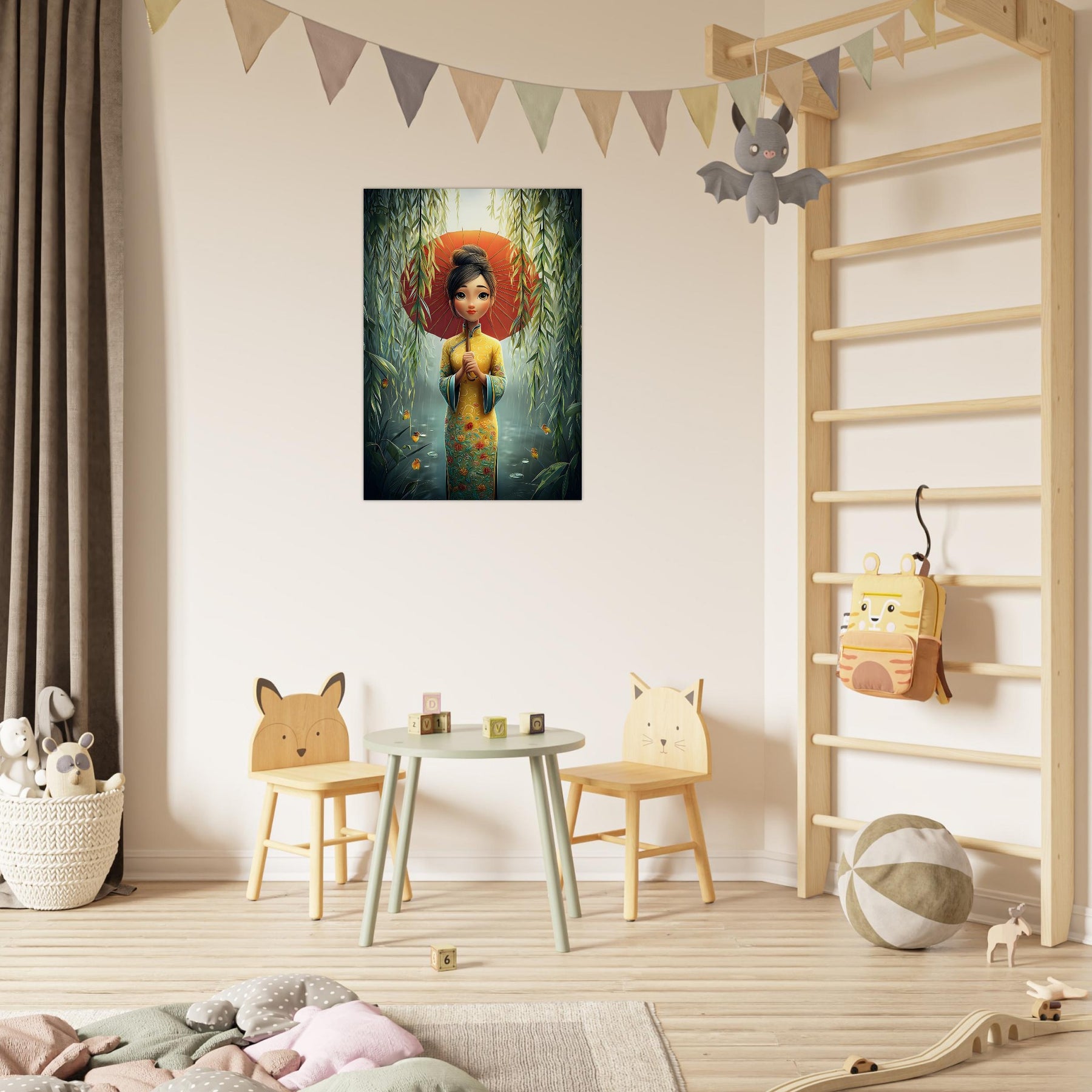 Bring elegance, color, and imagination into your child’s room with Grace in the Garden, a stunning whimsical aluminum illustration designed to create a serene and enchanting atmosphere. This captivating artwork features a beautiful woman dressed in traditional attire, gently holding a vibrant red parasol as she stands amidst lush greenery in a dreamy, nature-inspired scene.