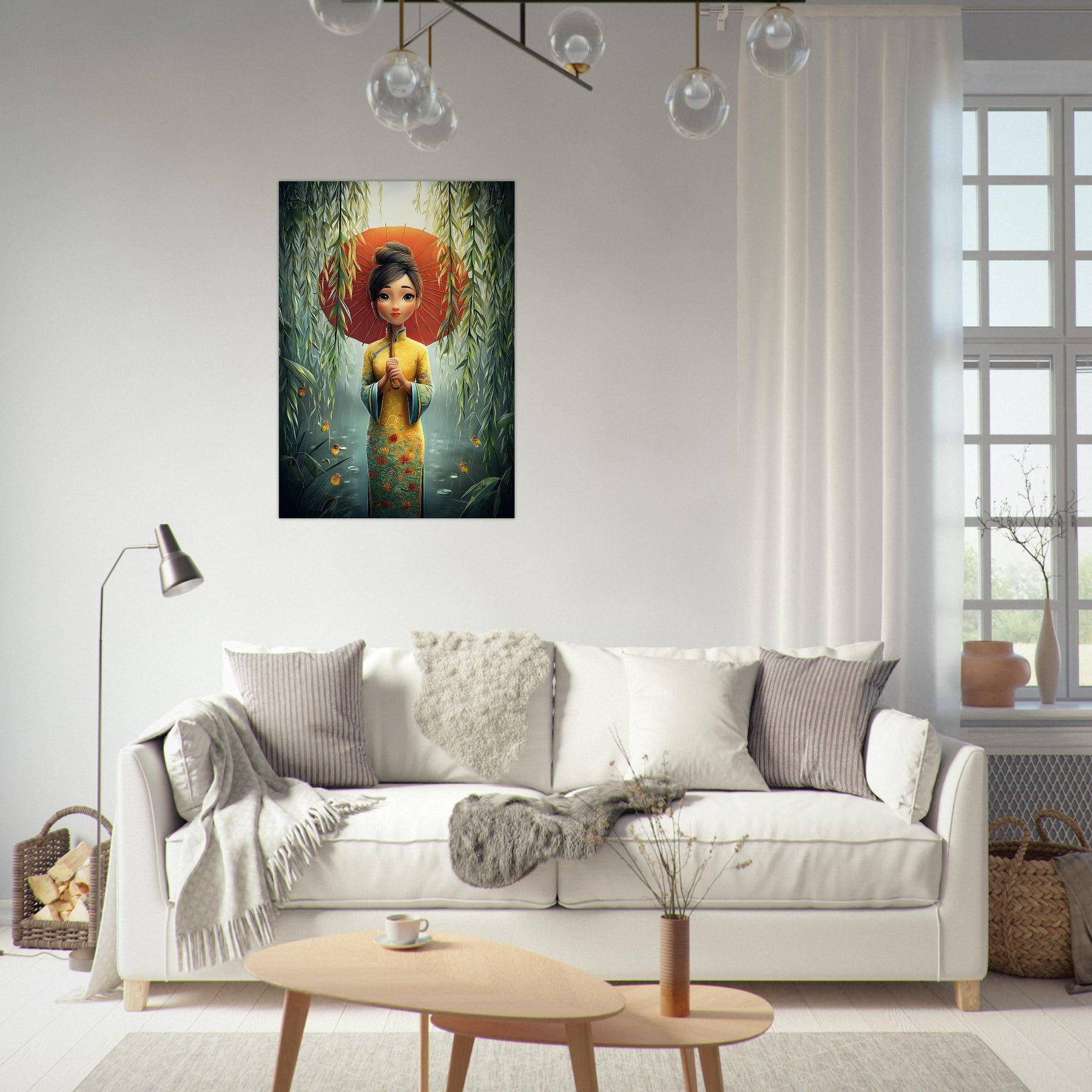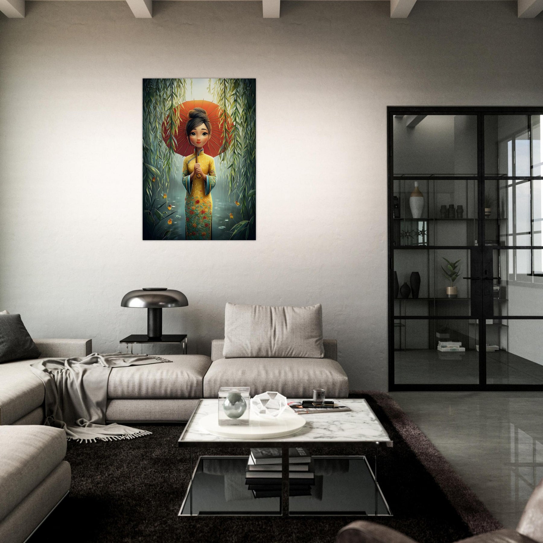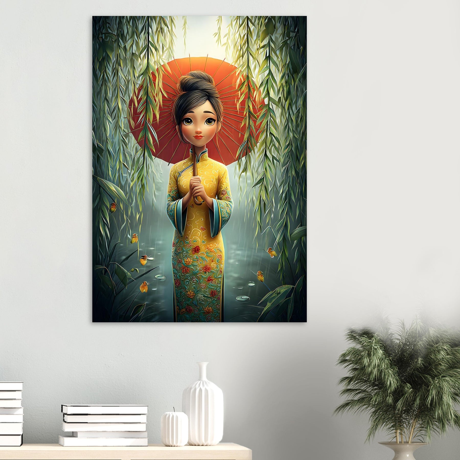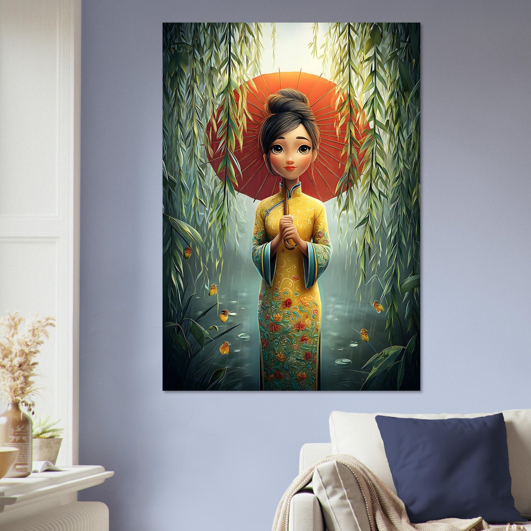 Bring elegance, color, and imagination into your child’s room with Grace in the Garden, a stunning whimsical aluminum illustration designed to create a serene and enchanting atmosphere. This captivating artwork features a beautiful woman dressed in traditional attire, gently holding a vibrant red parasol as she stands amidst lush greenery in a dreamy, nature-inspired scene.