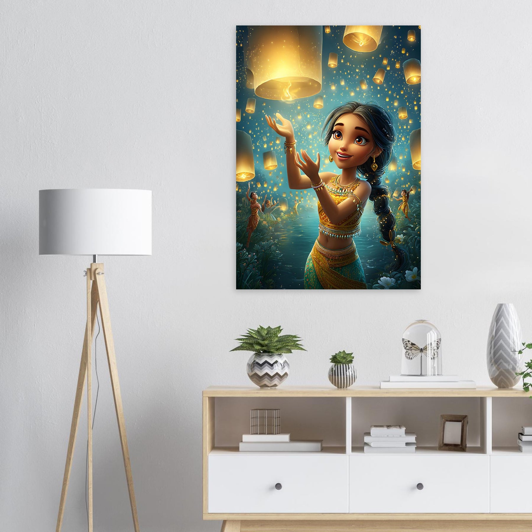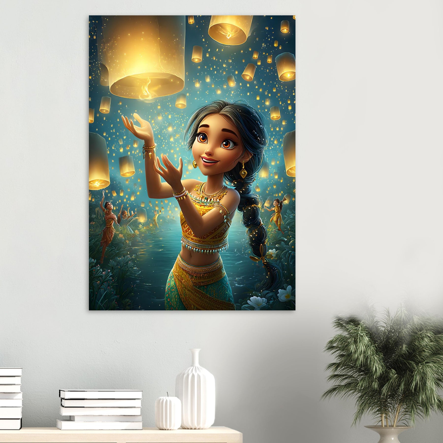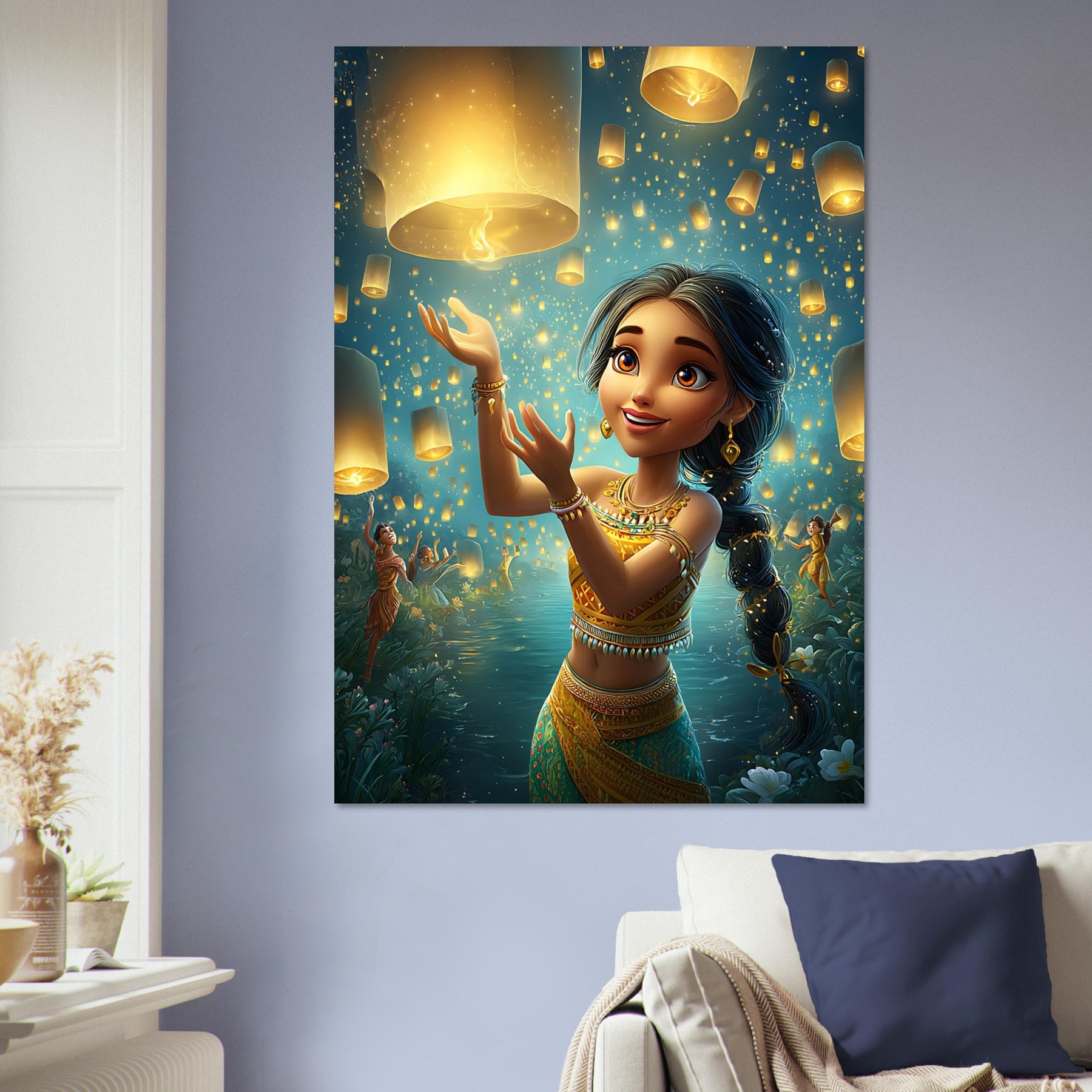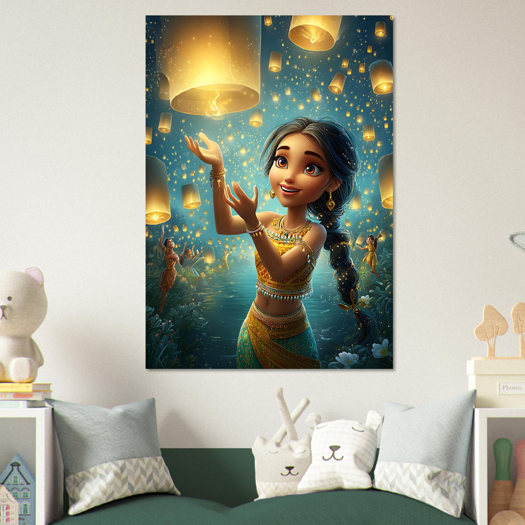 Bring a sense of magic and wonder to your child’s room with our Lanterns of Joy Aluminum Wall Art. This enchanting illustration captures a whimsical young girl joyfully releasing glowing lanterns into the tranquil night sky, their golden light reflecting over shimmering waters and the silhouettes of dancers beneath the stars. The scene evokes a feeling of celebration, hope, and imagination, filling any space with warmth and serenity.