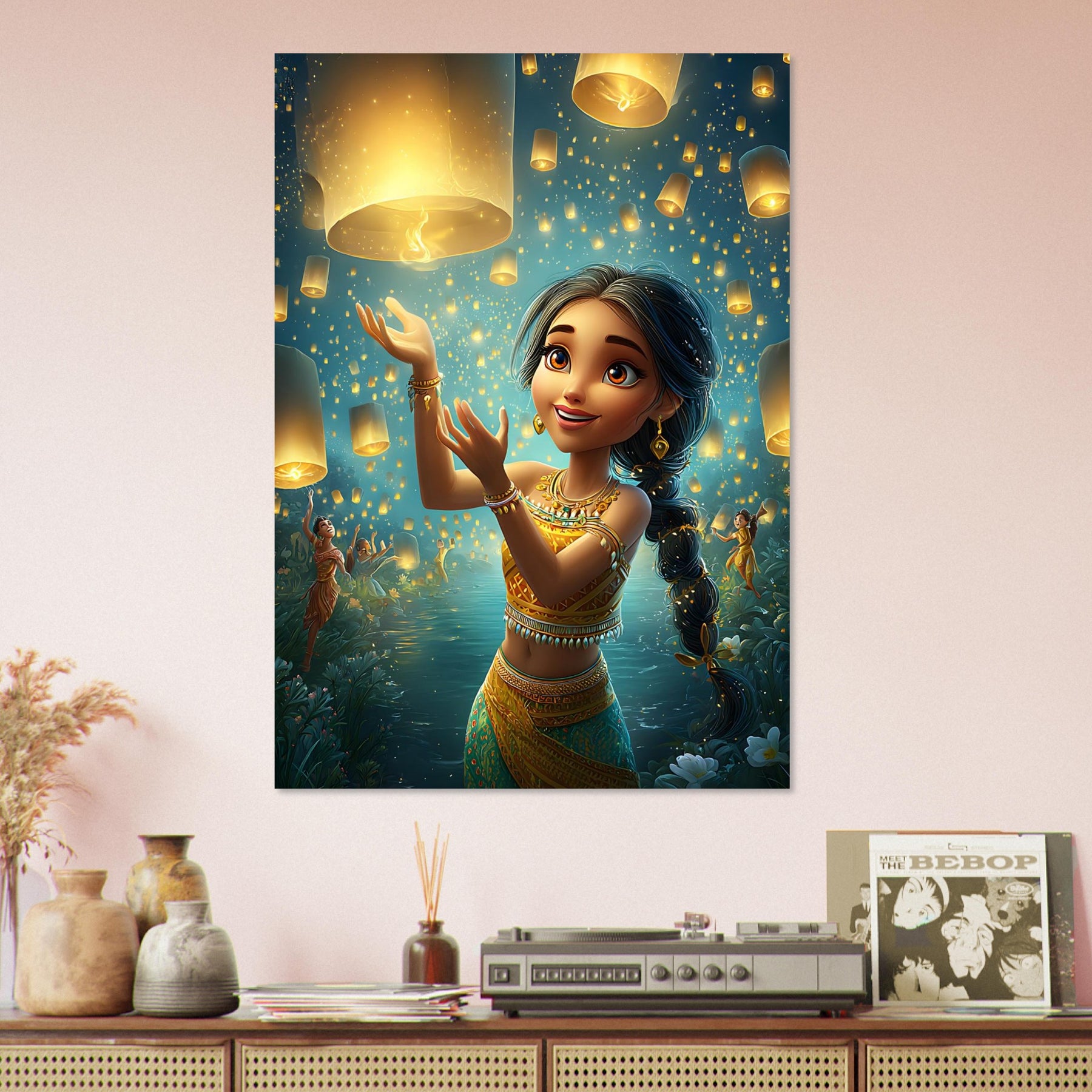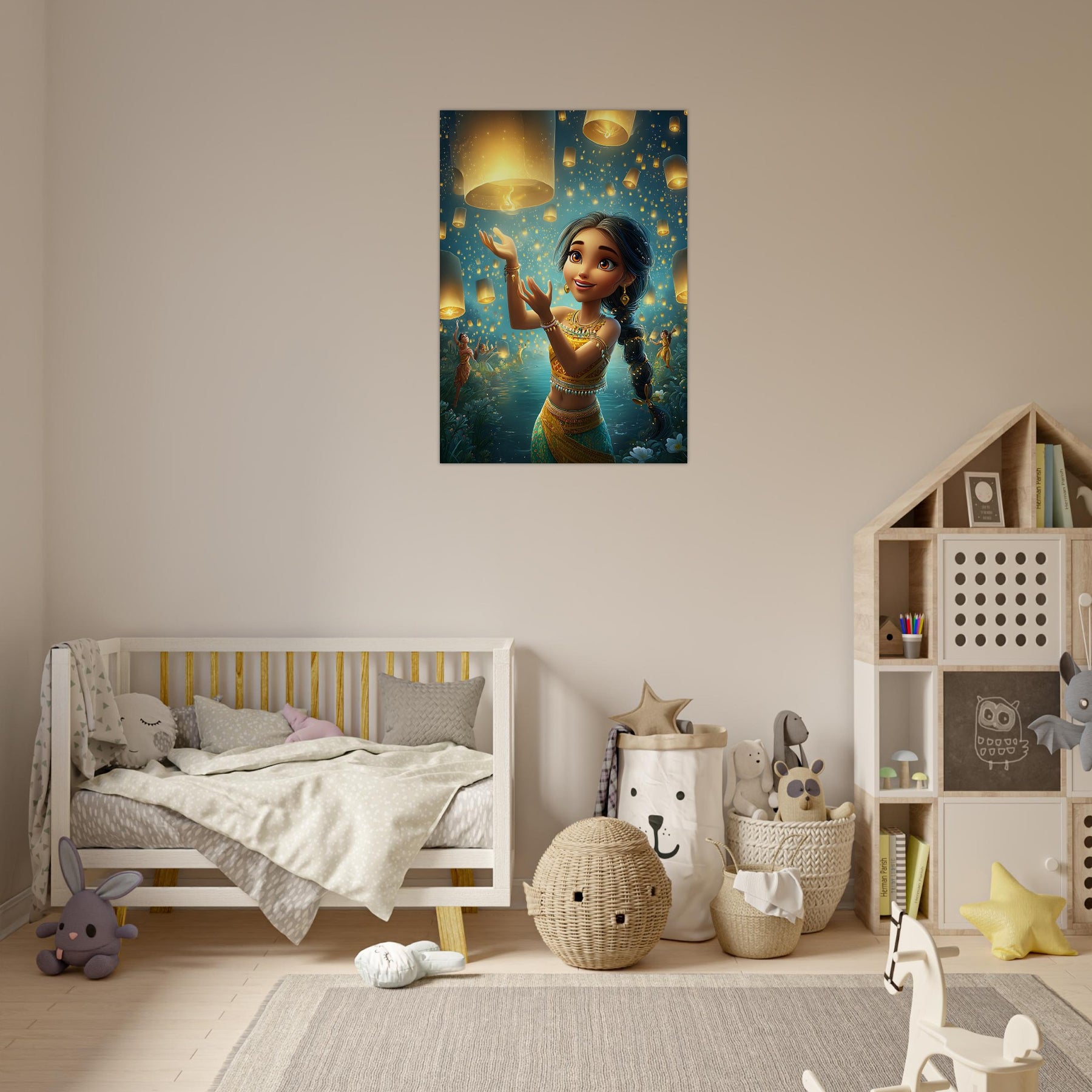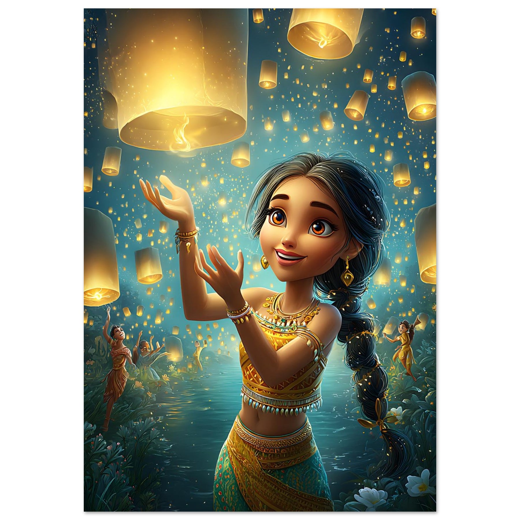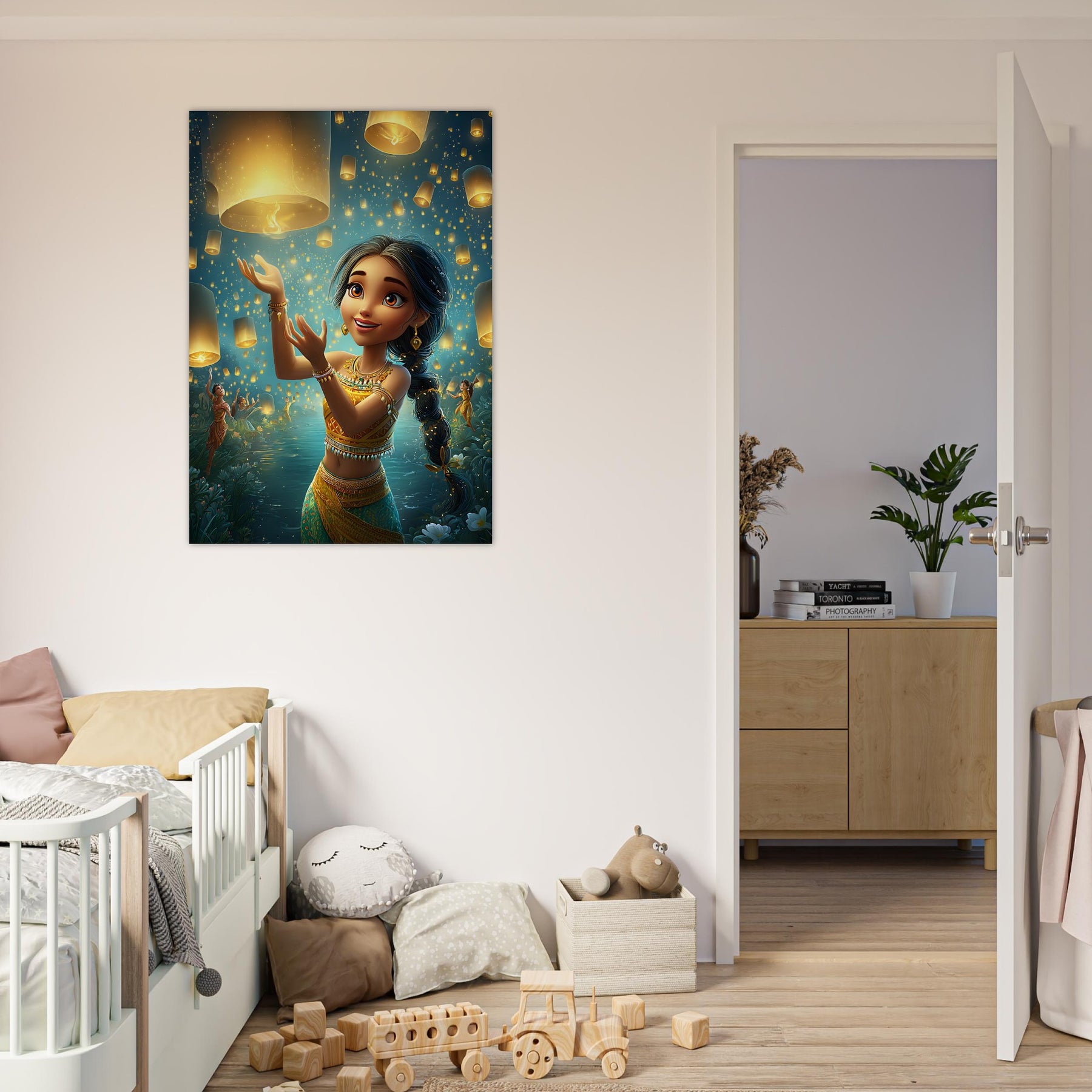 Bring a sense of magic and wonder to your child’s room with our Lanterns of Joy Aluminum Wall Art. This enchanting illustration captures a whimsical young girl joyfully releasing glowing lanterns into the tranquil night sky, their golden light reflecting over shimmering waters and the silhouettes of dancers beneath the stars. The scene evokes a feeling of celebration, hope, and imagination, filling any space with warmth and serenity.