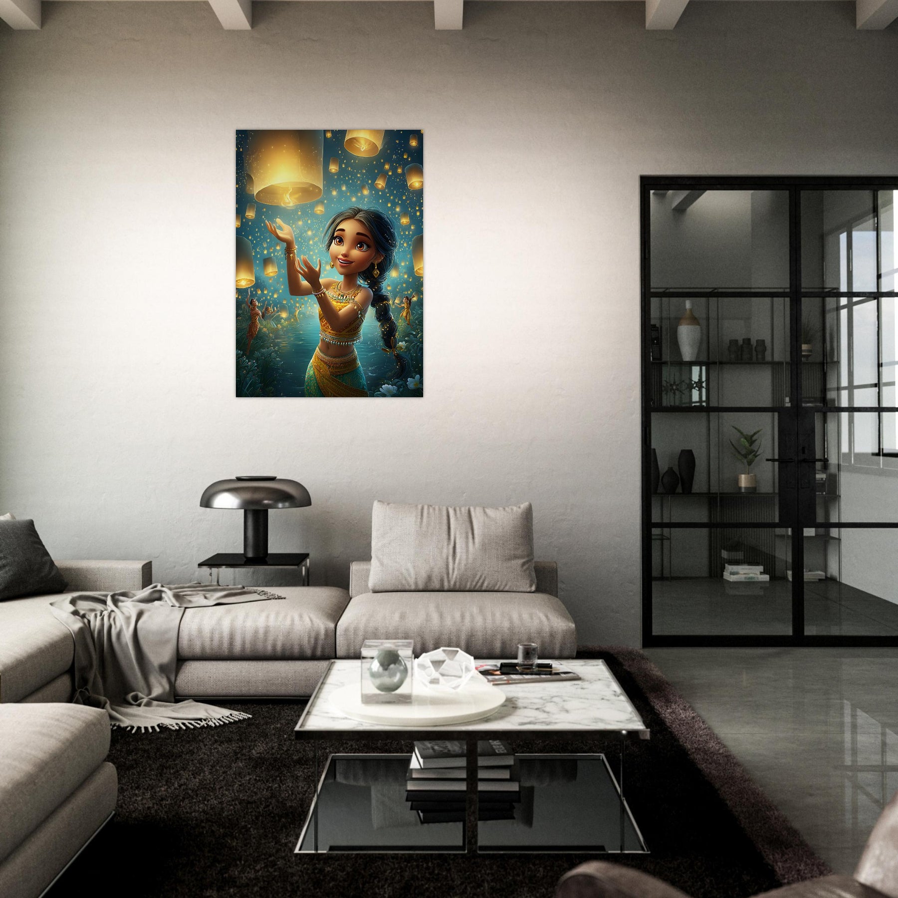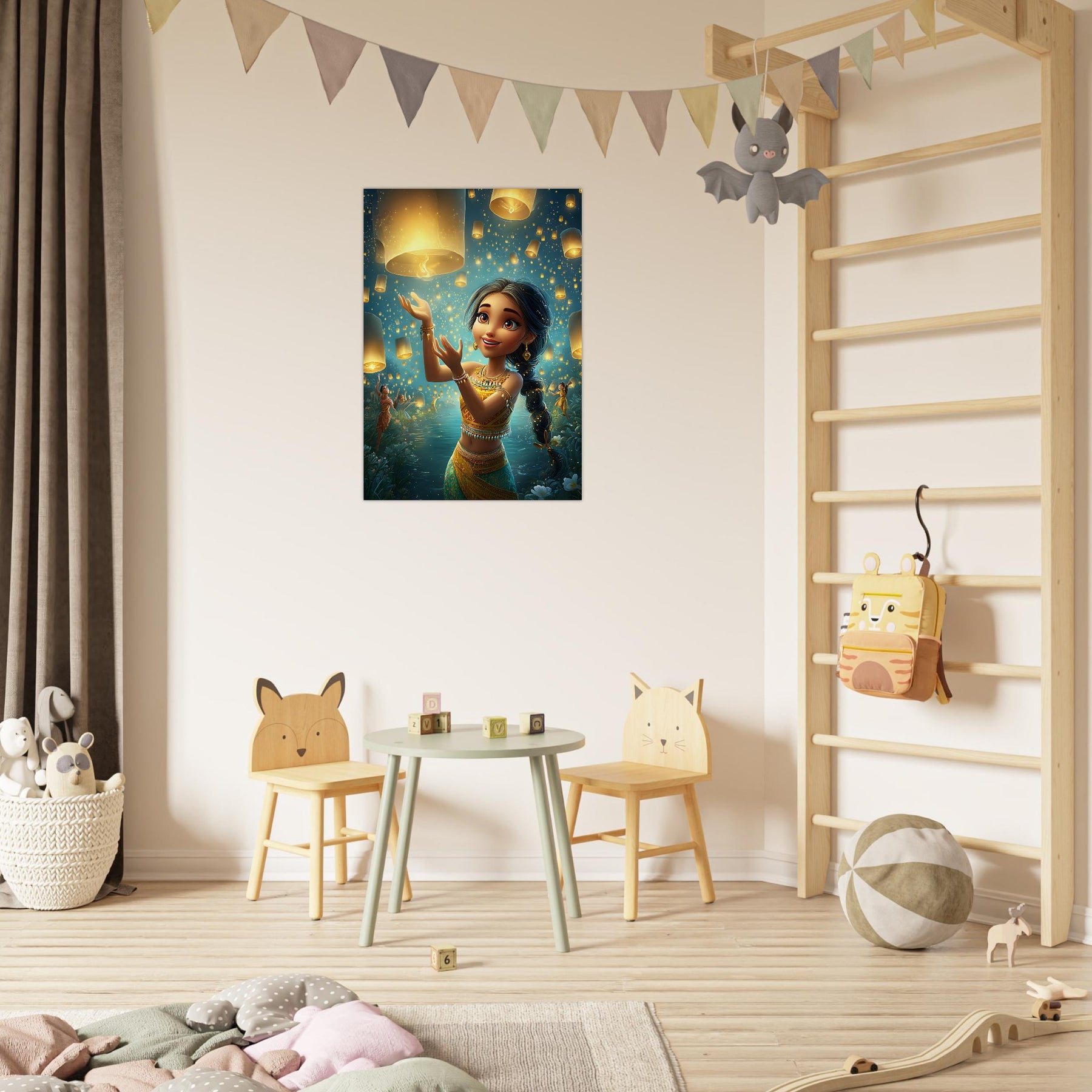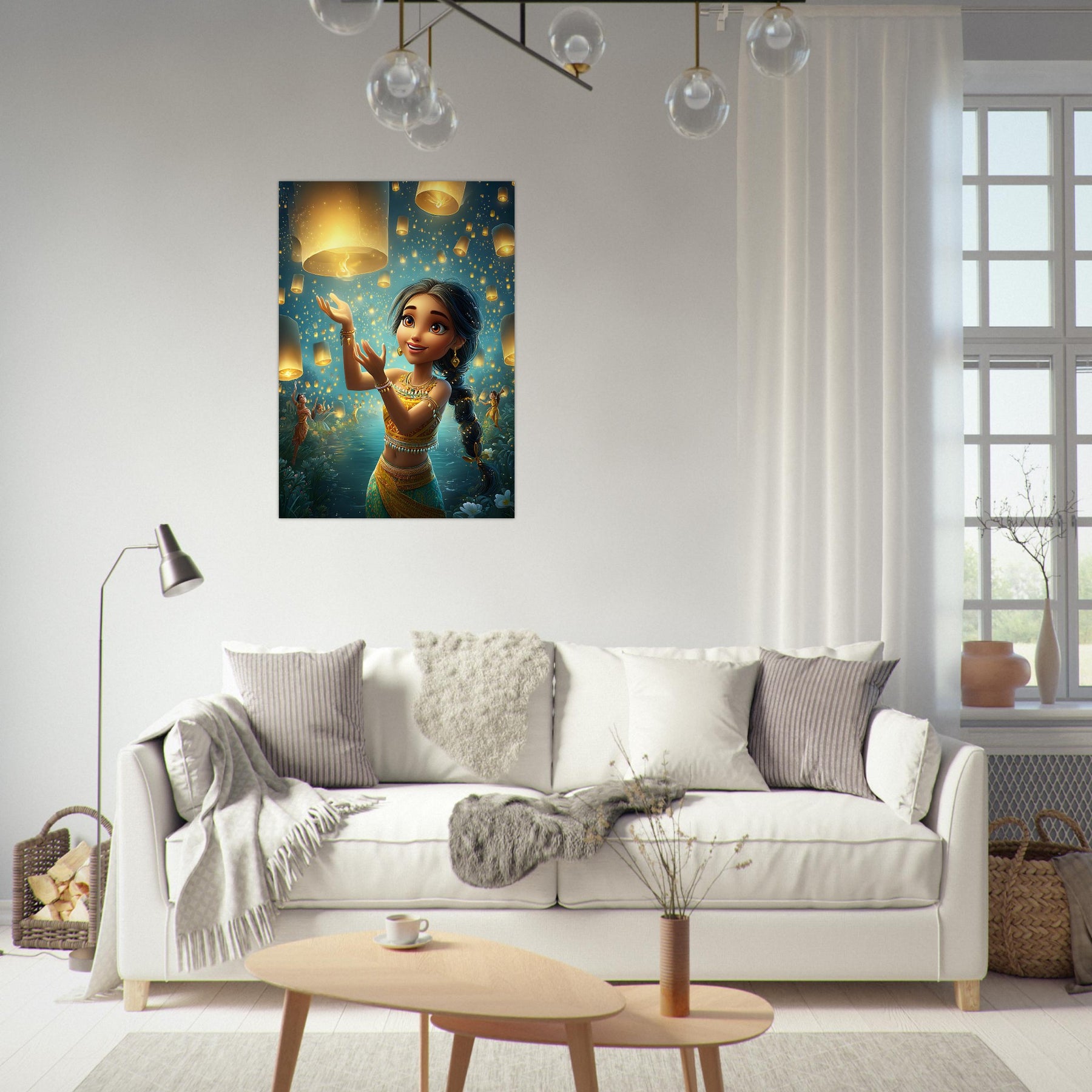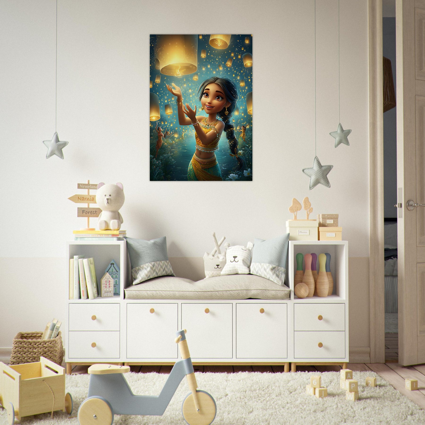 Bring a sense of magic and wonder to your child’s room with our Lanterns of Joy Aluminum Wall Art. This enchanting illustration captures a whimsical young girl joyfully releasing glowing lanterns into the tranquil night sky, their golden light reflecting over shimmering waters and the silhouettes of dancers beneath the stars. The scene evokes a feeling of celebration, hope, and imagination, filling any space with warmth and serenity.