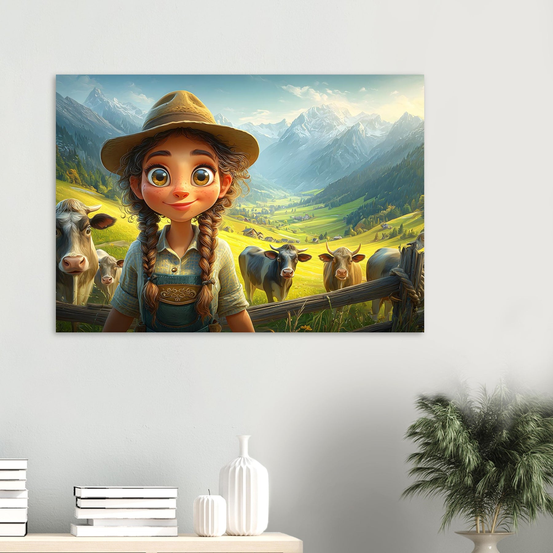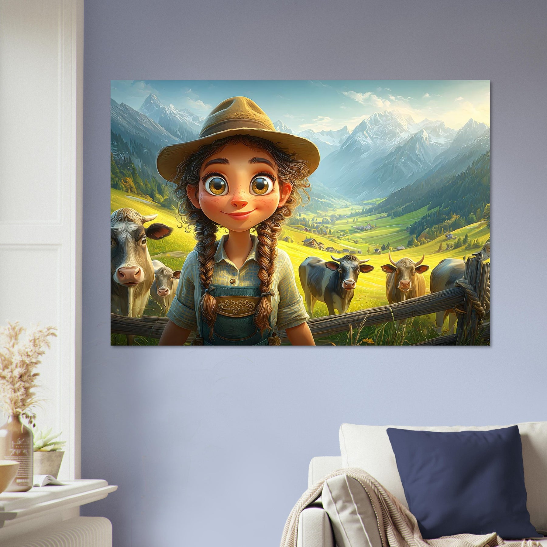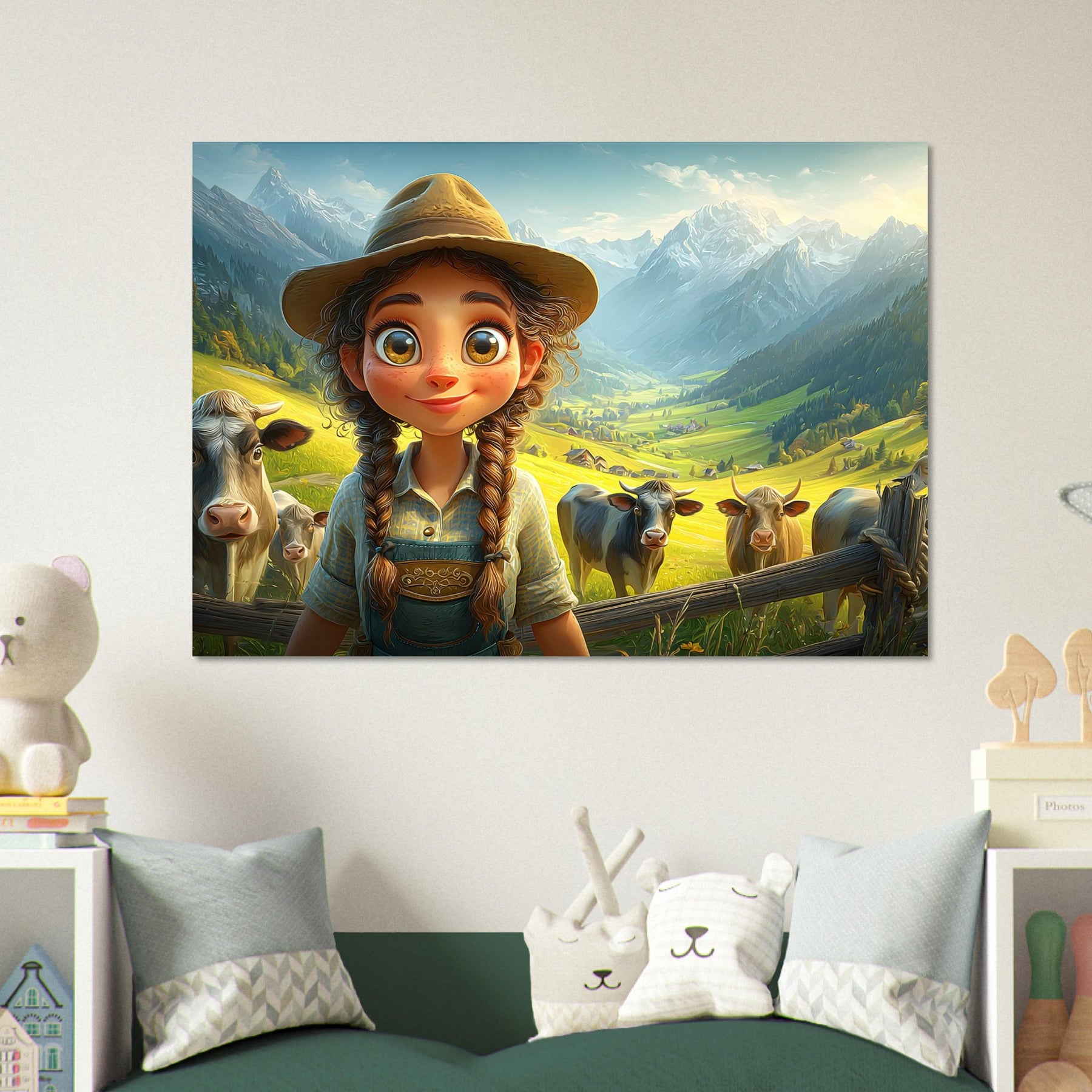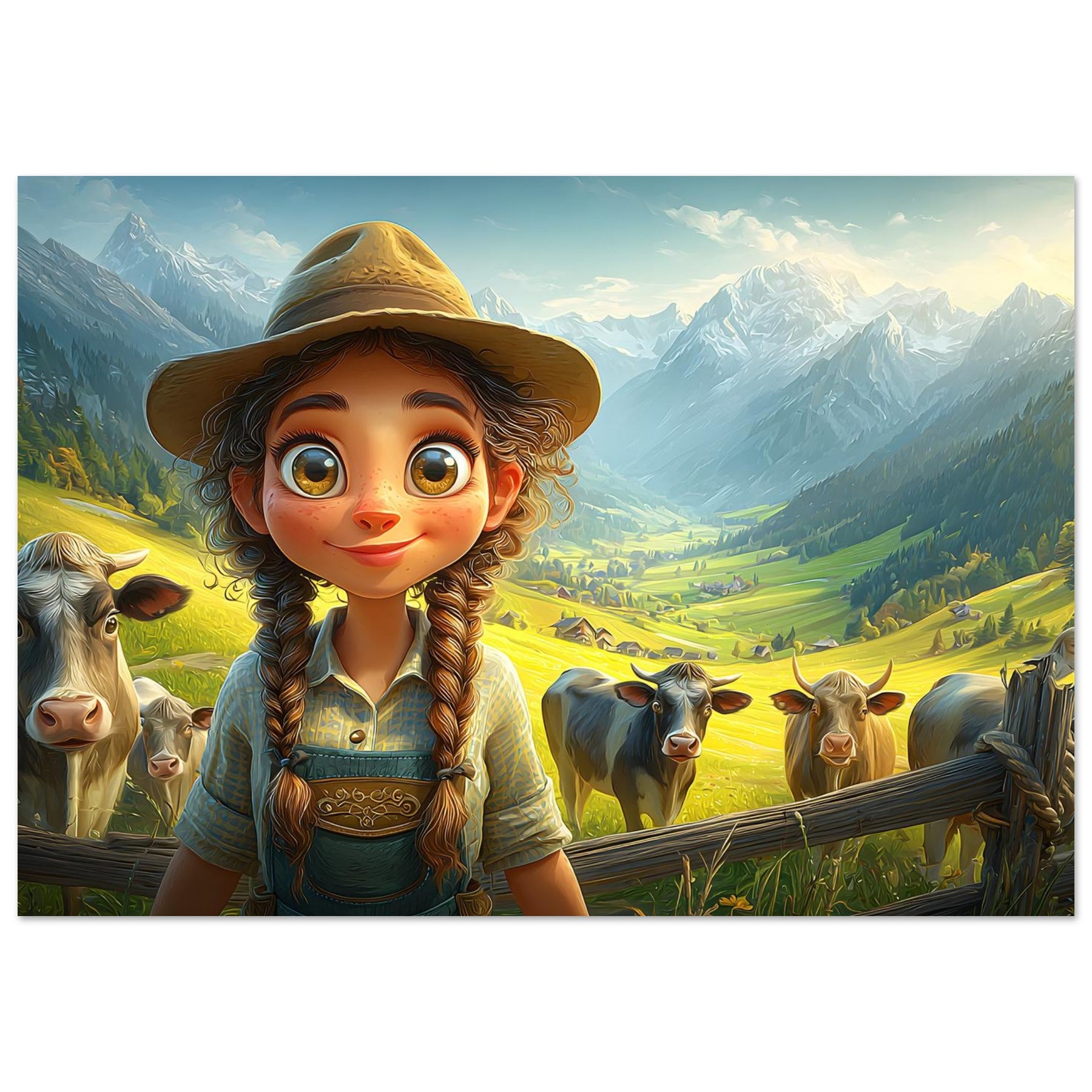Bring the beauty of the countryside to your child’s room with Whispers of the Meadow, a charming aluminum wall artpiece that celebrates the joy of simple living and the magic of nature. This whimsical illustration features a young girl standing amidst peaceful cows and majestic mountains, bathed in soft light and surrounded by lush greenery. The vibrant colors and cheerful atmosphere perfectly capture the essence of rural life, evoking a sense of serenity and wonder.