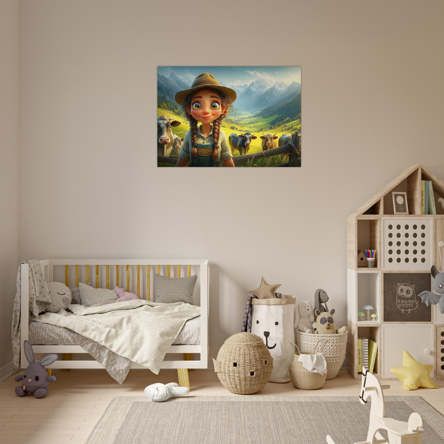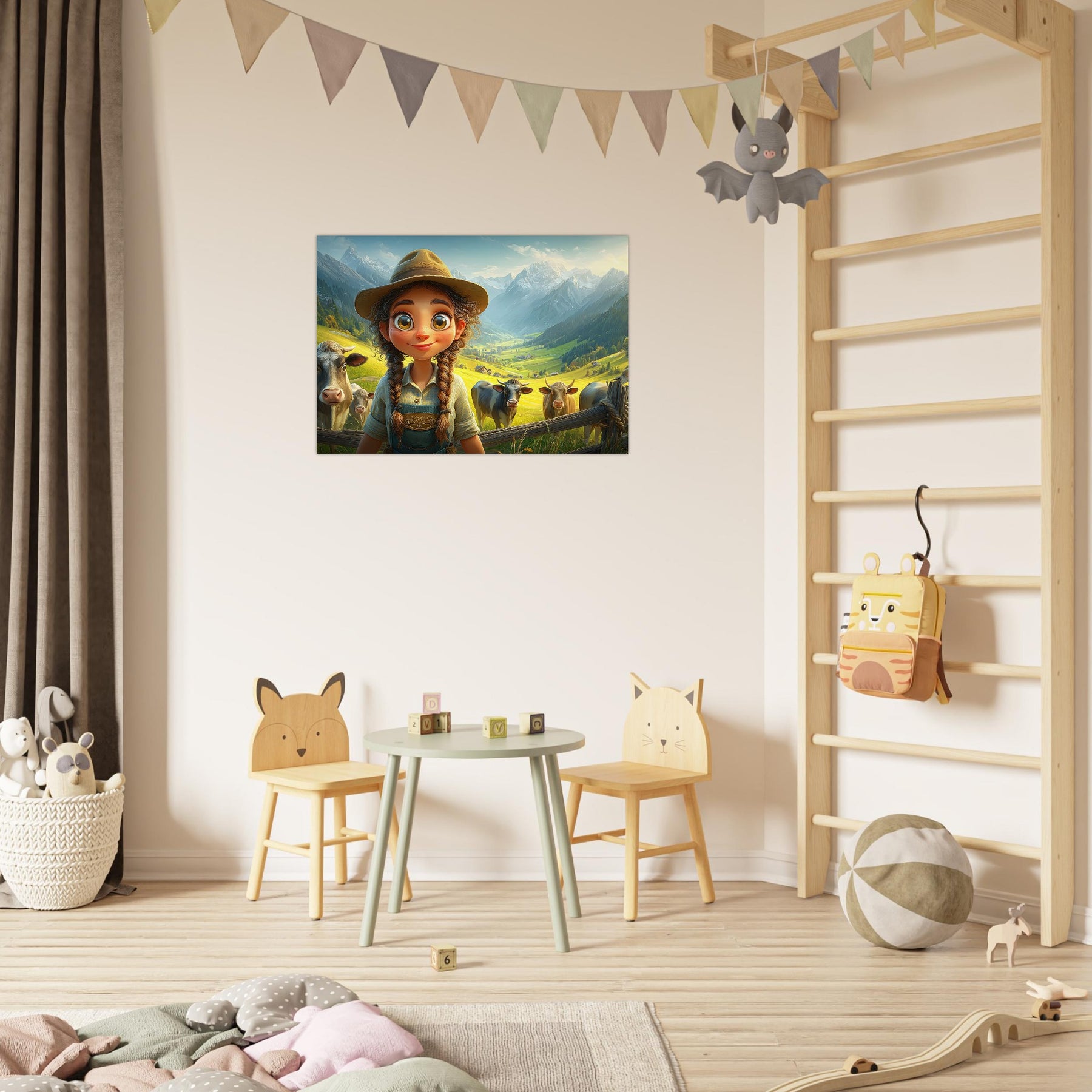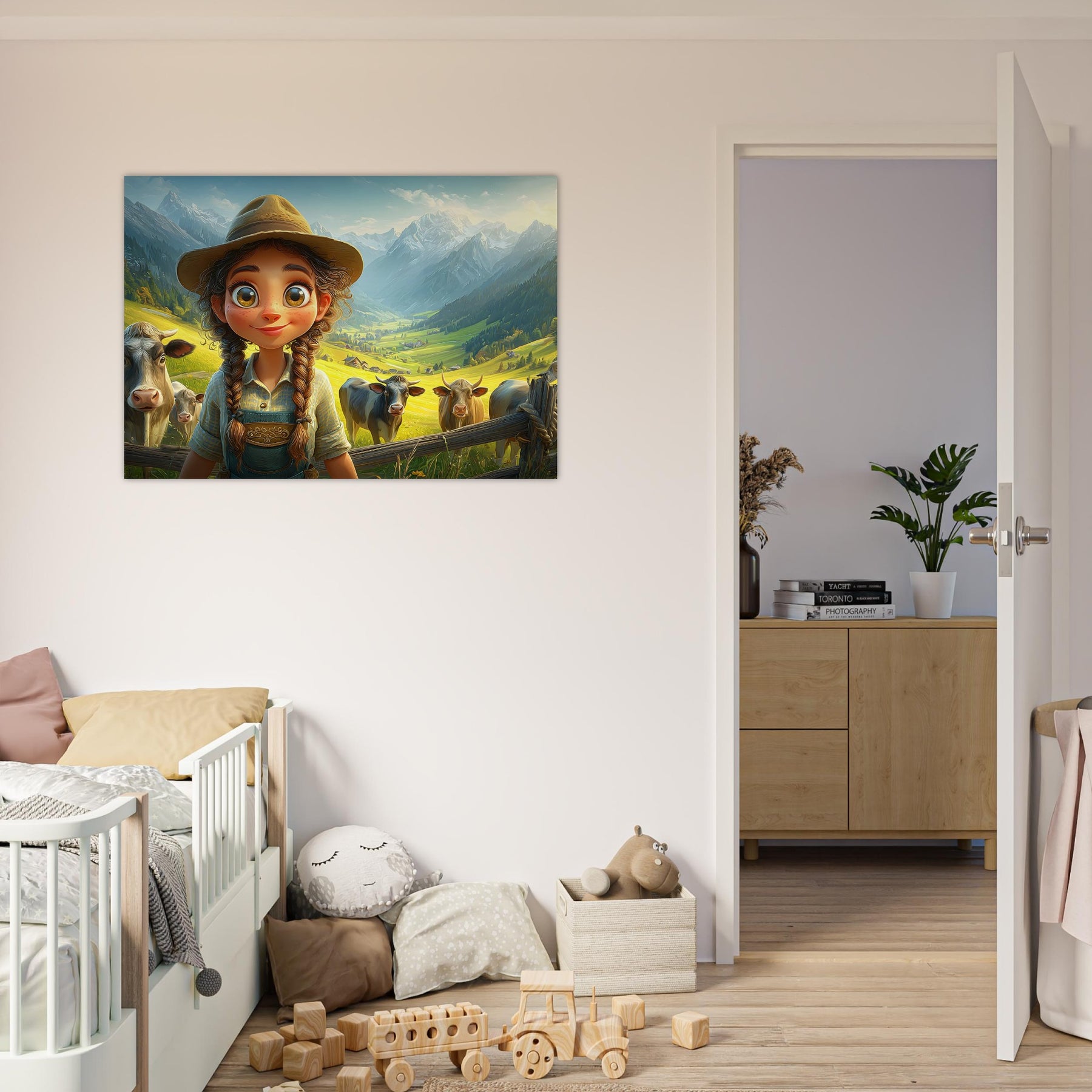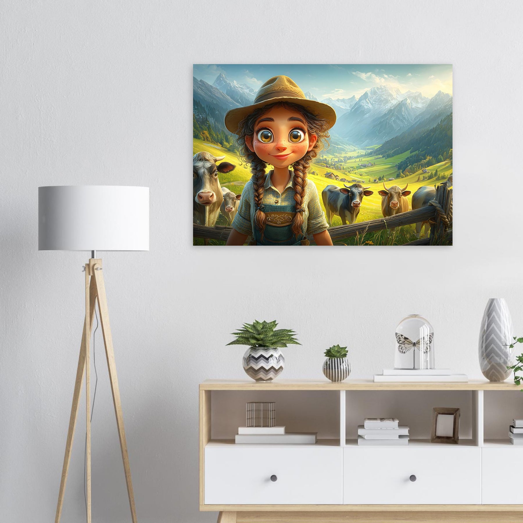Bring the beauty of the countryside to your child’s room with Whispers of the Meadow, a charming aluminum wall artpiece that celebrates the joy of simple living and the magic of nature. This whimsical illustration features a young girl standing amidst peaceful cows and majestic mountains, bathed in soft light and surrounded by lush greenery. The vibrant colors and cheerful atmosphere perfectly capture the essence of rural life, evoking a sense of serenity and wonder.