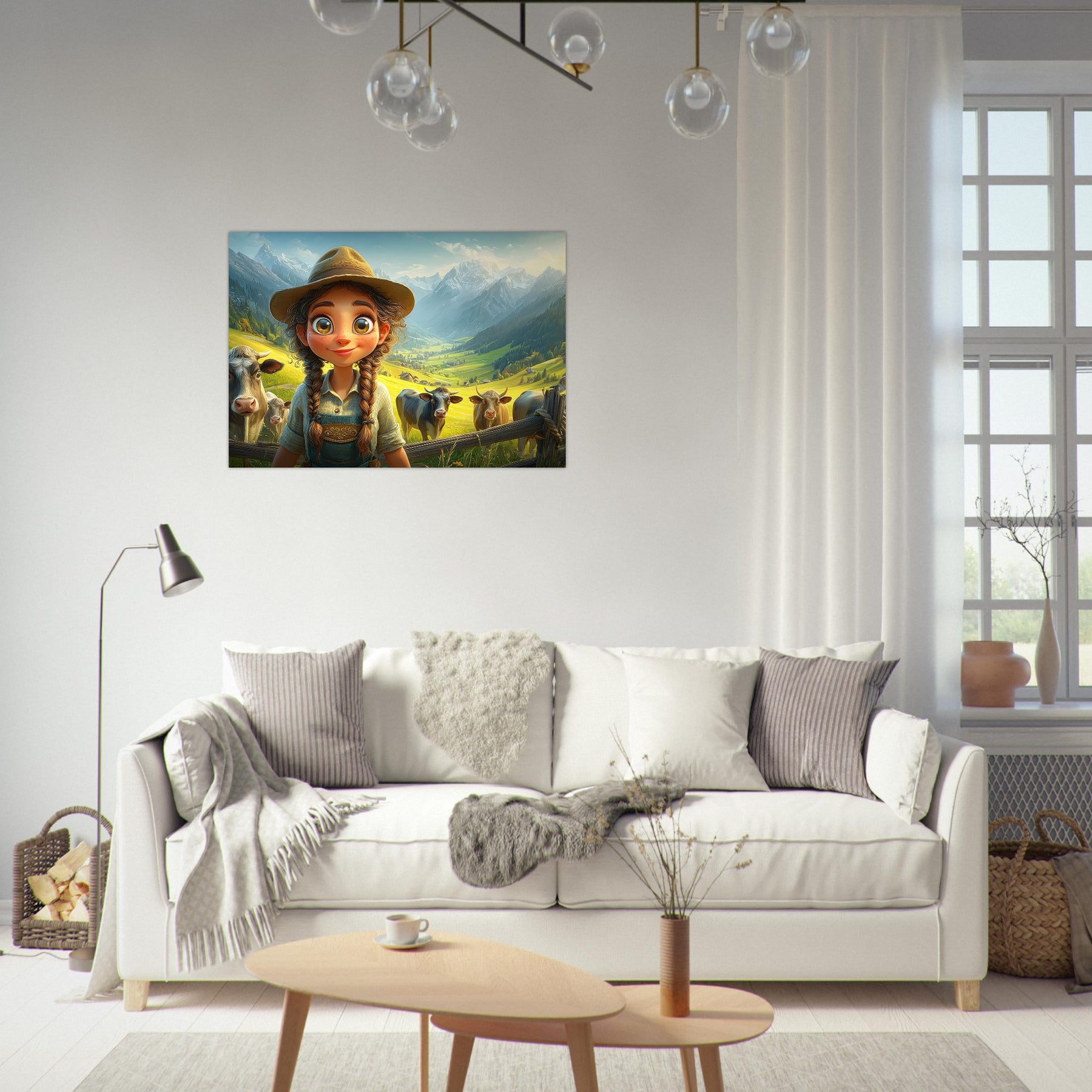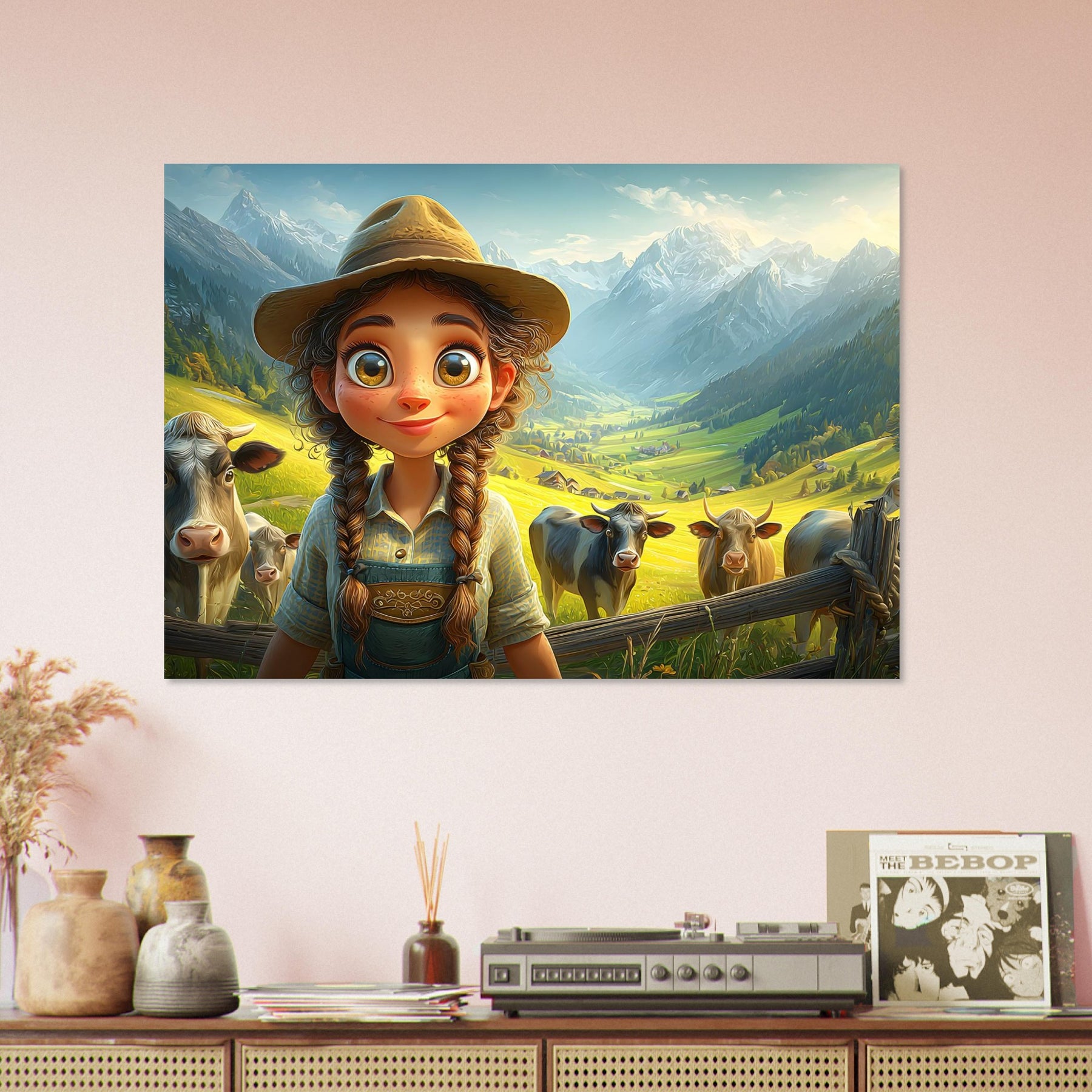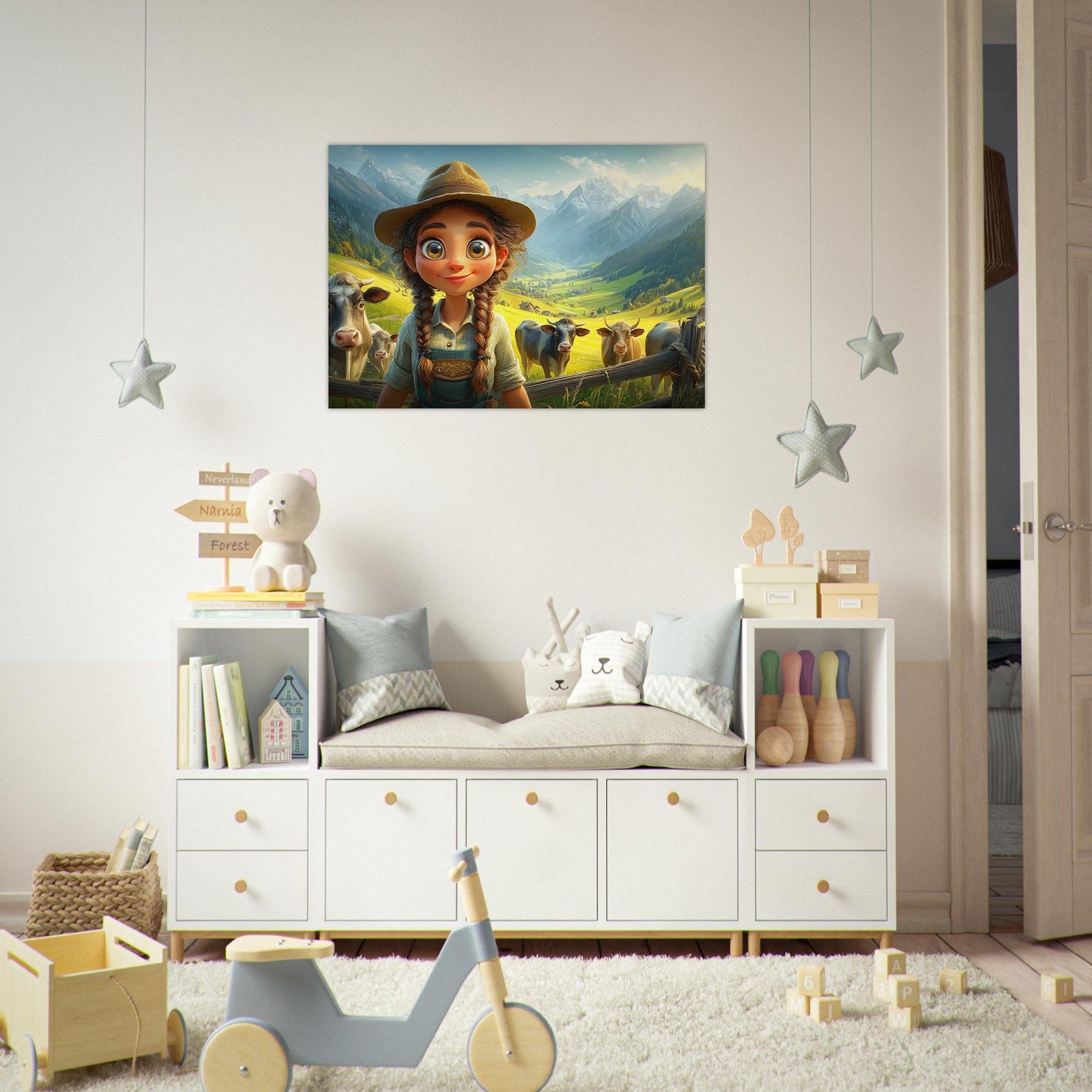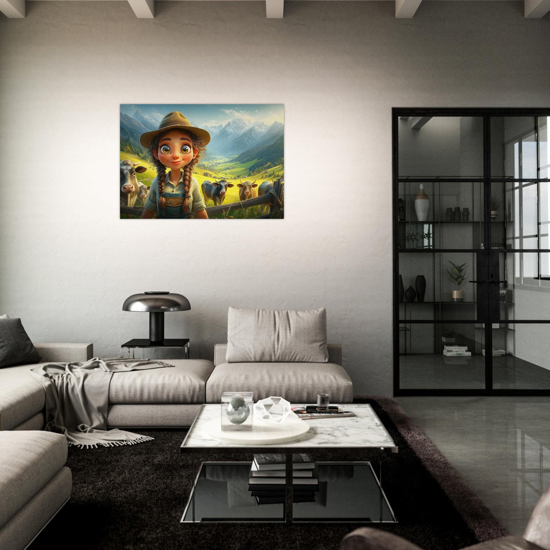 Bring the beauty of the countryside to your child’s room with Whispers of the Meadow, a charming aluminum wall artpiece that celebrates the joy of simple living and the magic of nature. This whimsical illustration features a young girl standing amidst peaceful cows and majestic mountains, bathed in soft light and surrounded by lush greenery. The vibrant colors and cheerful atmosphere perfectly capture the essence of rural life, evoking a sense of serenity and wonder.