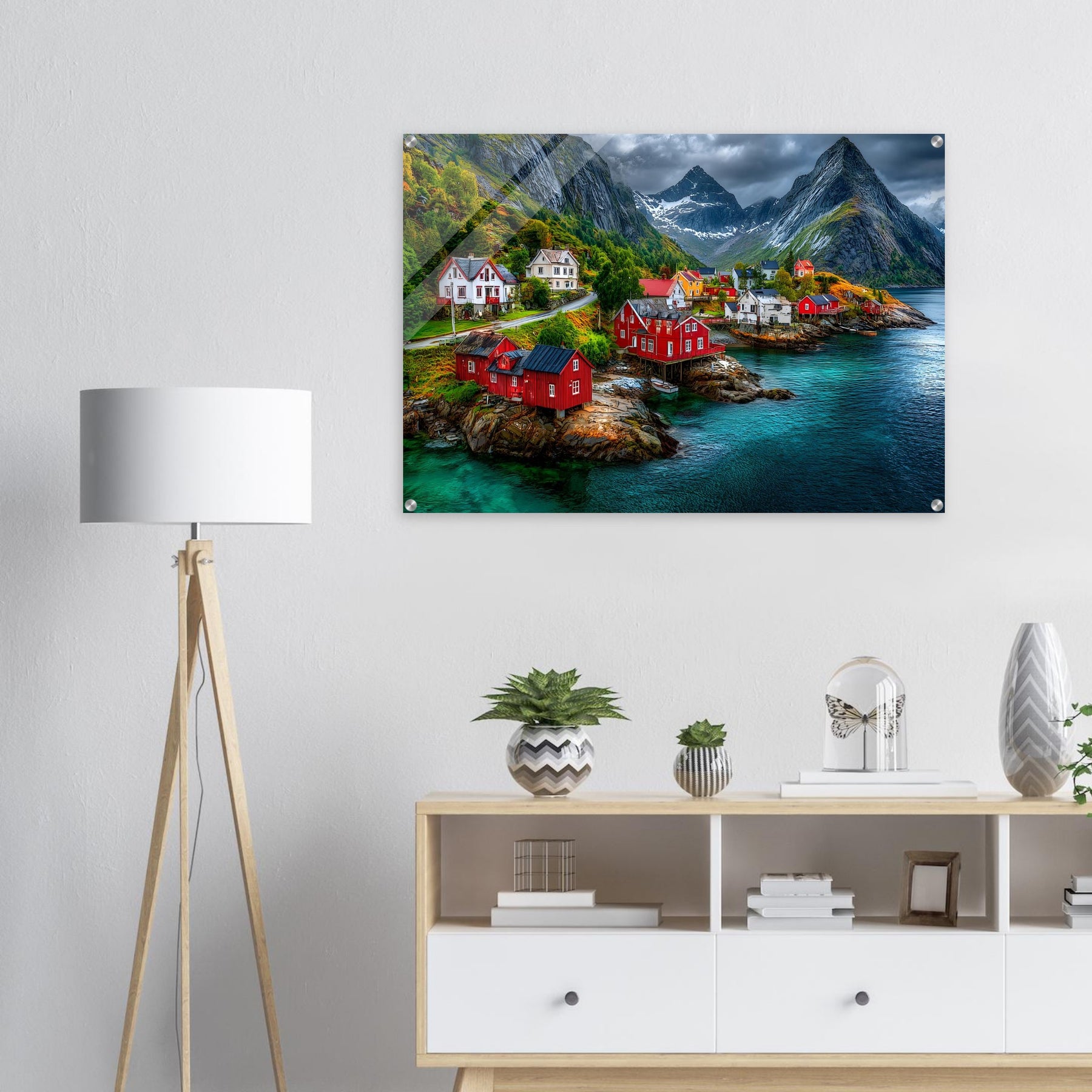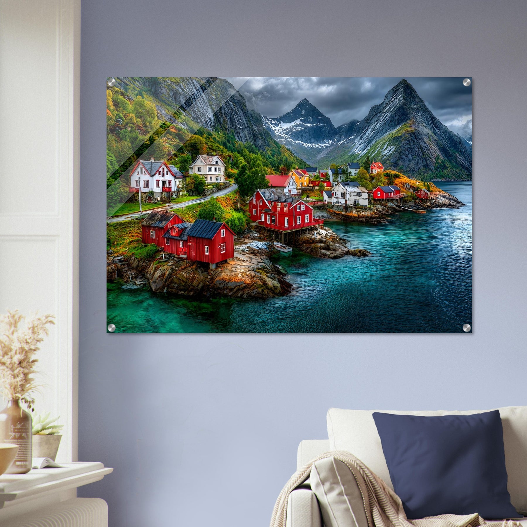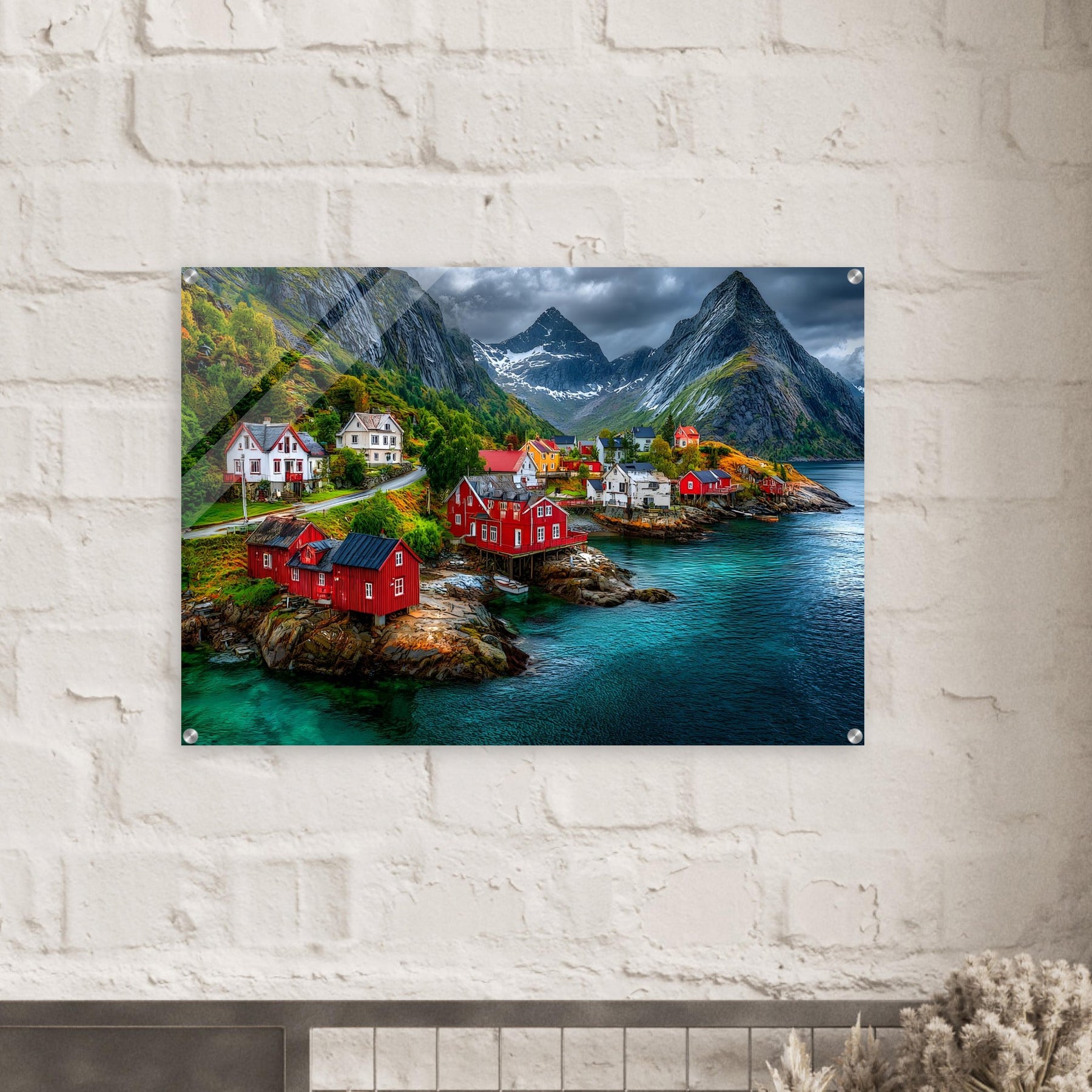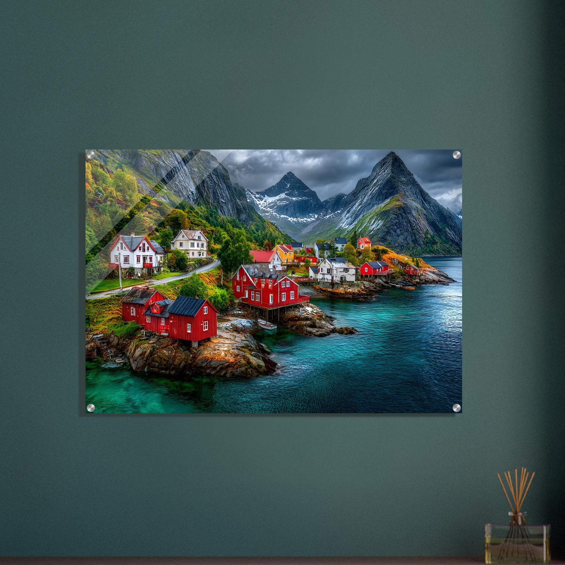 Experience elegance and vibrancy with our Lakeside Serenity Acrylic Wall Art. This captivating artwork highlights a colorful village by the water, with red-roofed houses and blooming hues reflected across a tranquil lake, all set against majestic mountains. The glossy acrylic finish enhances depth and brilliance, making it a sophisticated centerpiece for any room.