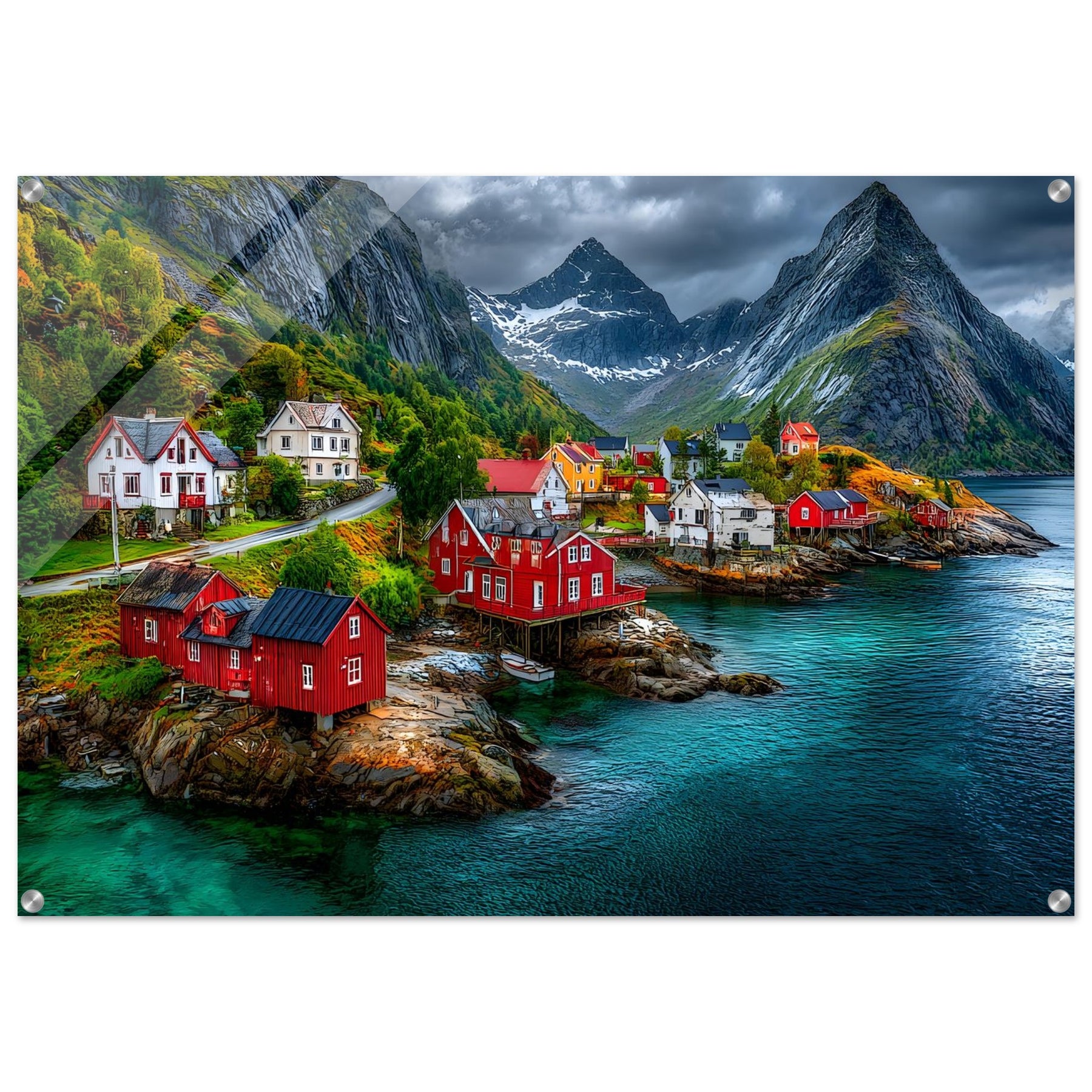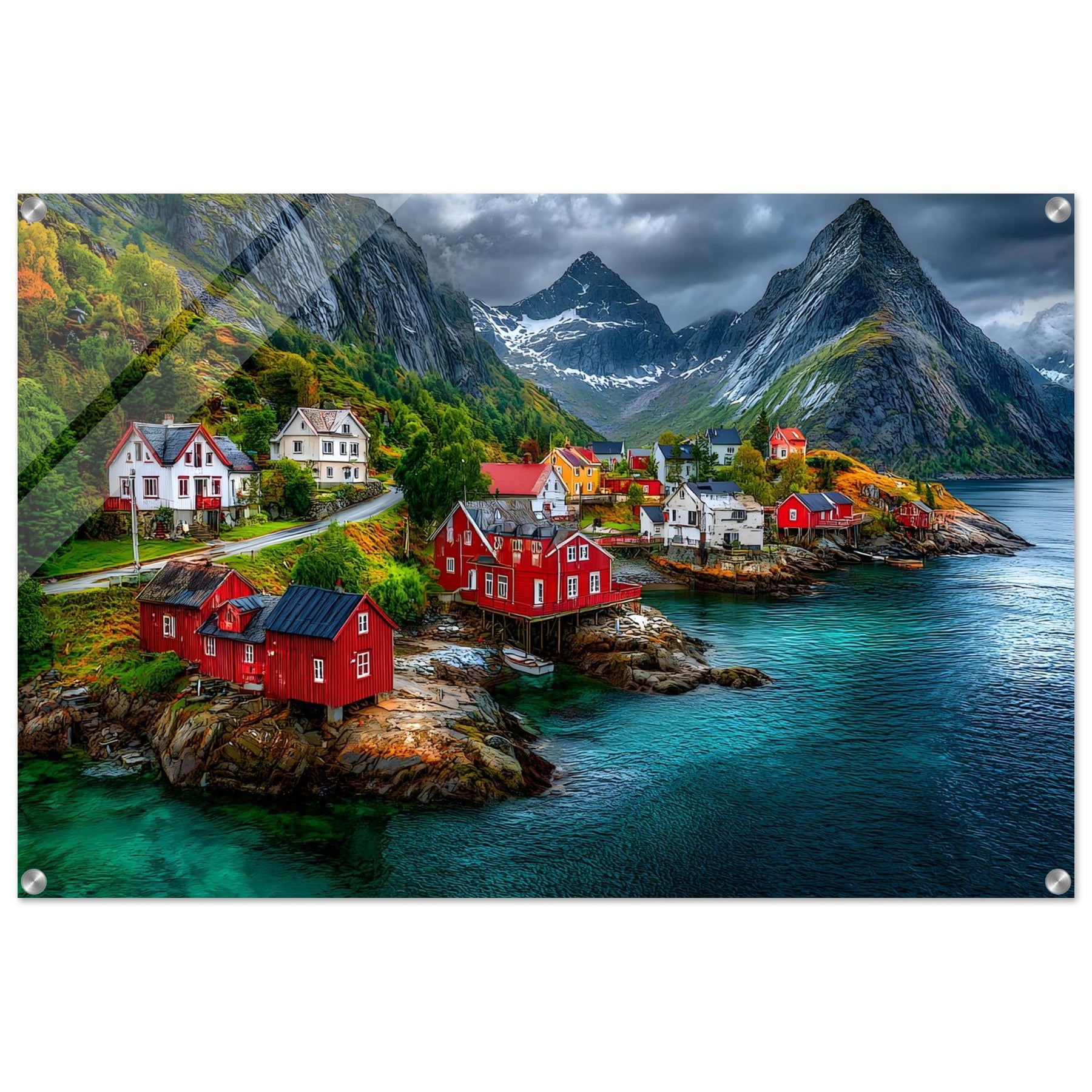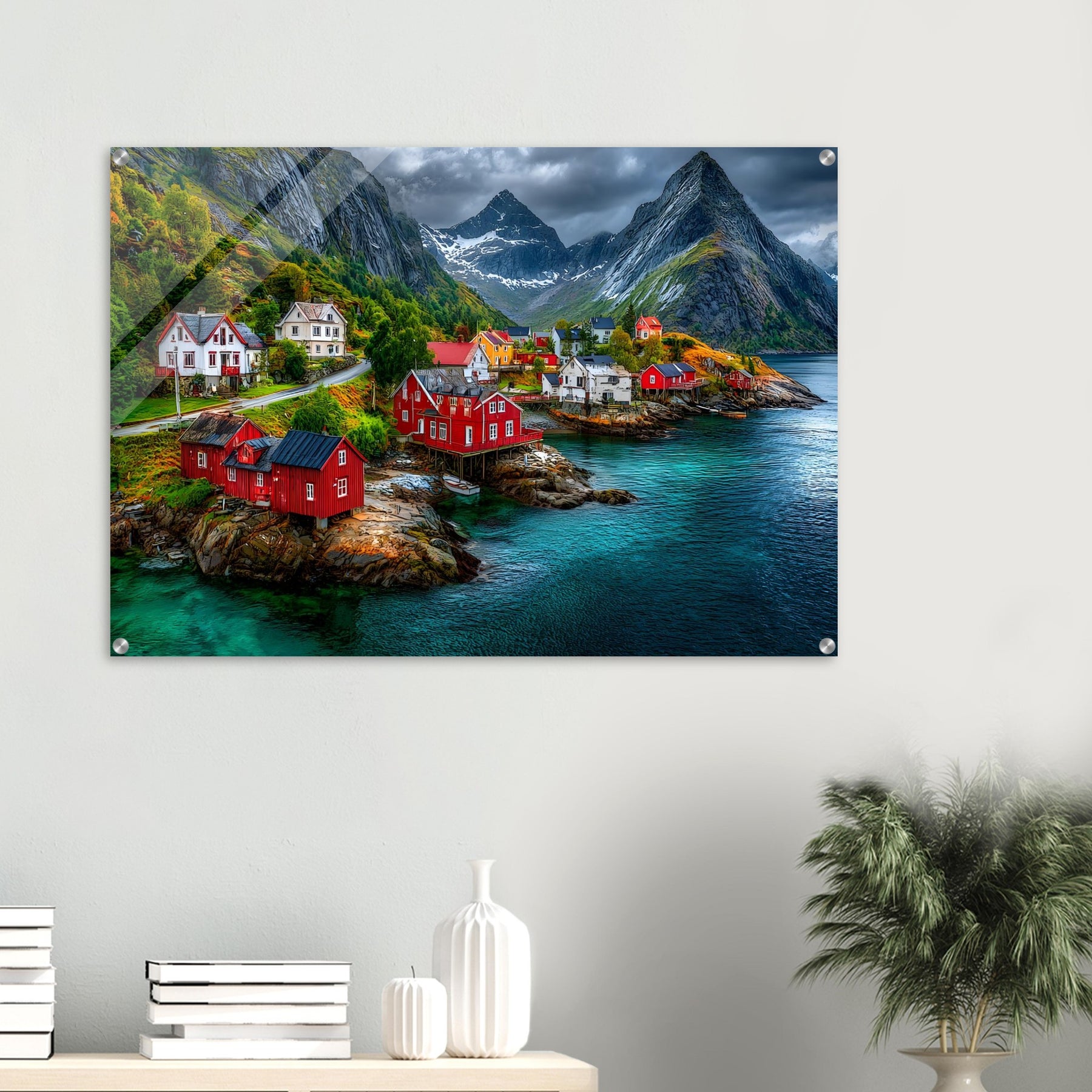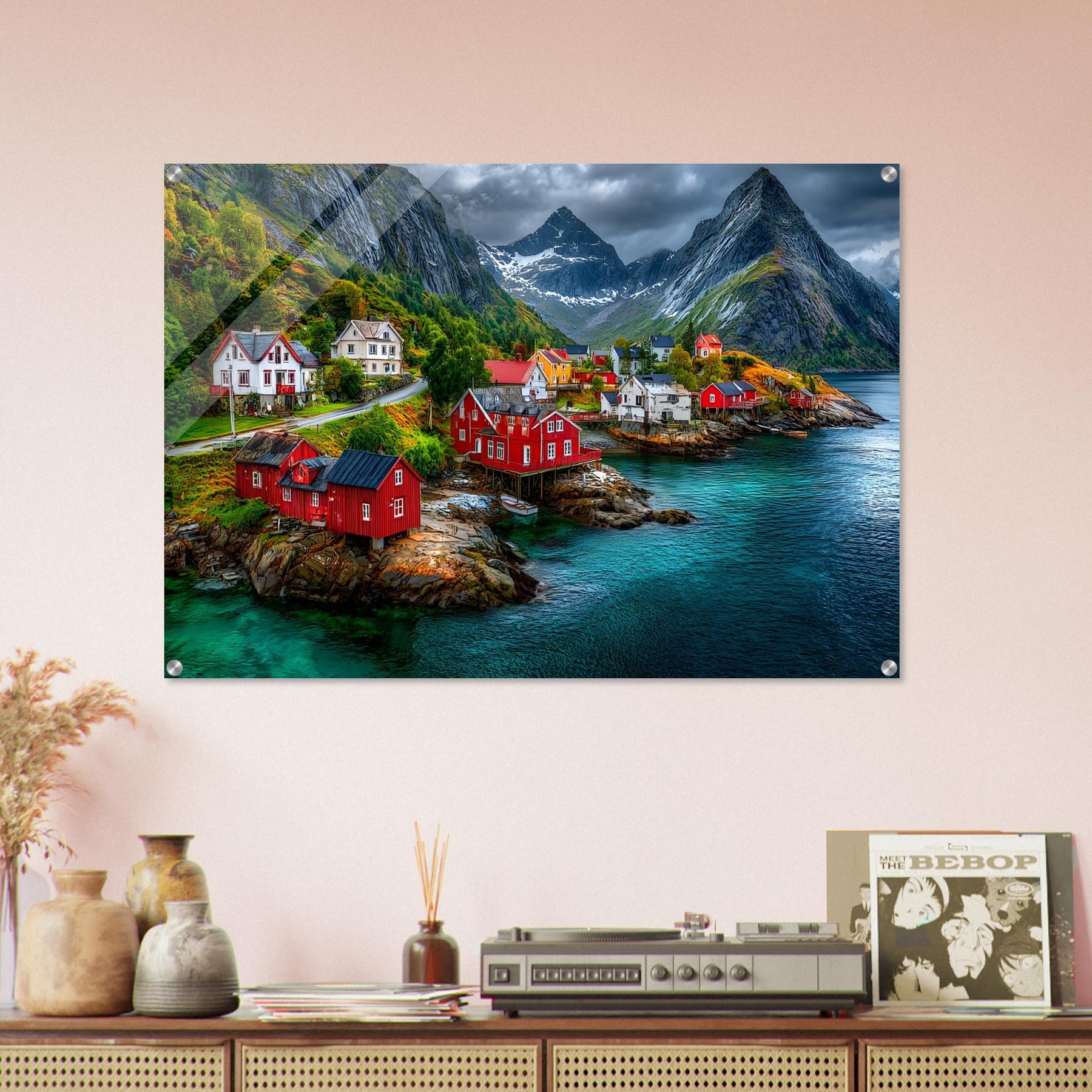 Experience elegance and vibrancy with our Lakeside Serenity Acrylic Wall Art. This captivating artwork highlights a colorful village by the water, with red-roofed houses and blooming hues reflected across a tranquil lake, all set against majestic mountains. The glossy acrylic finish enhances depth and brilliance, making it a sophisticated centerpiece for any room.