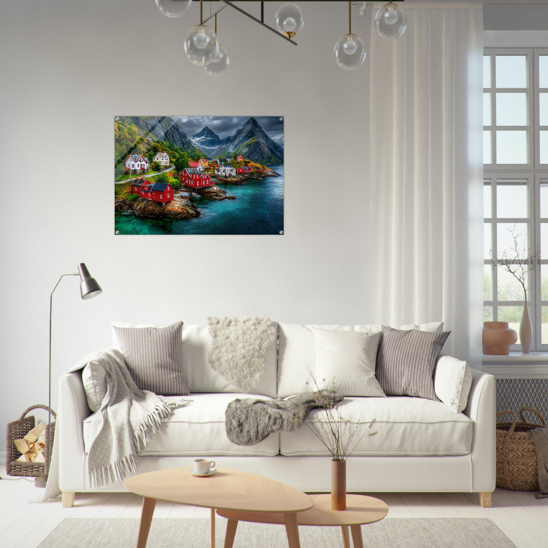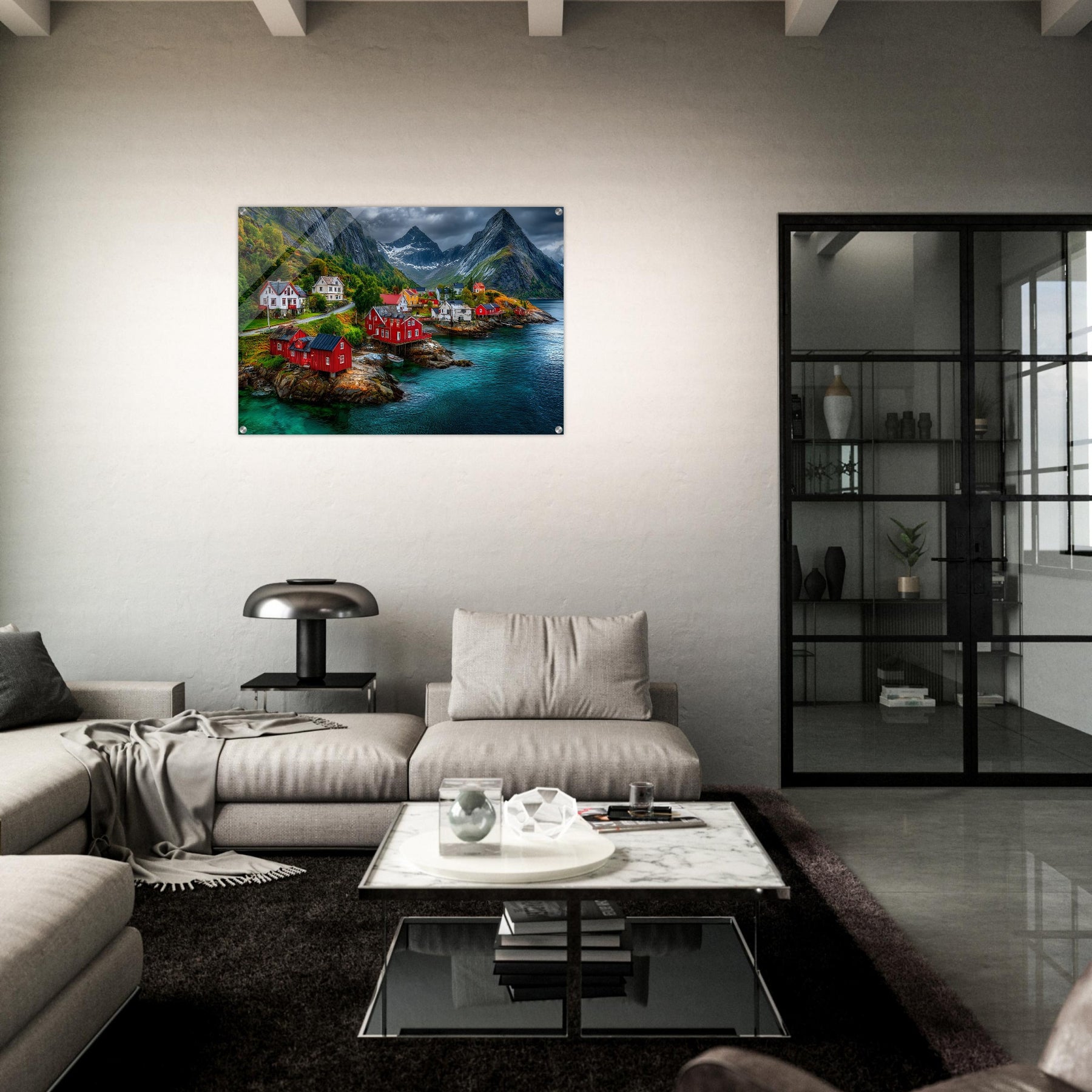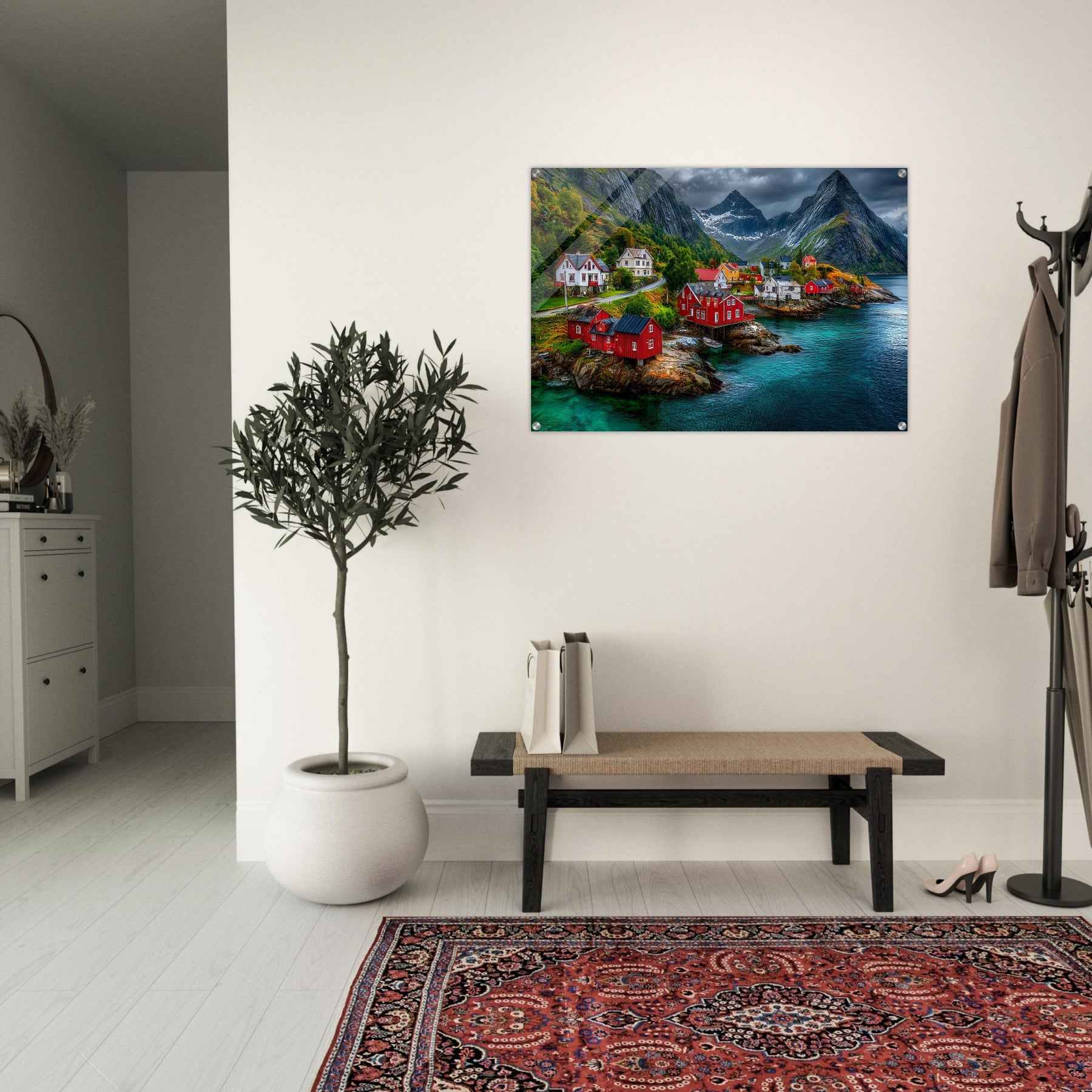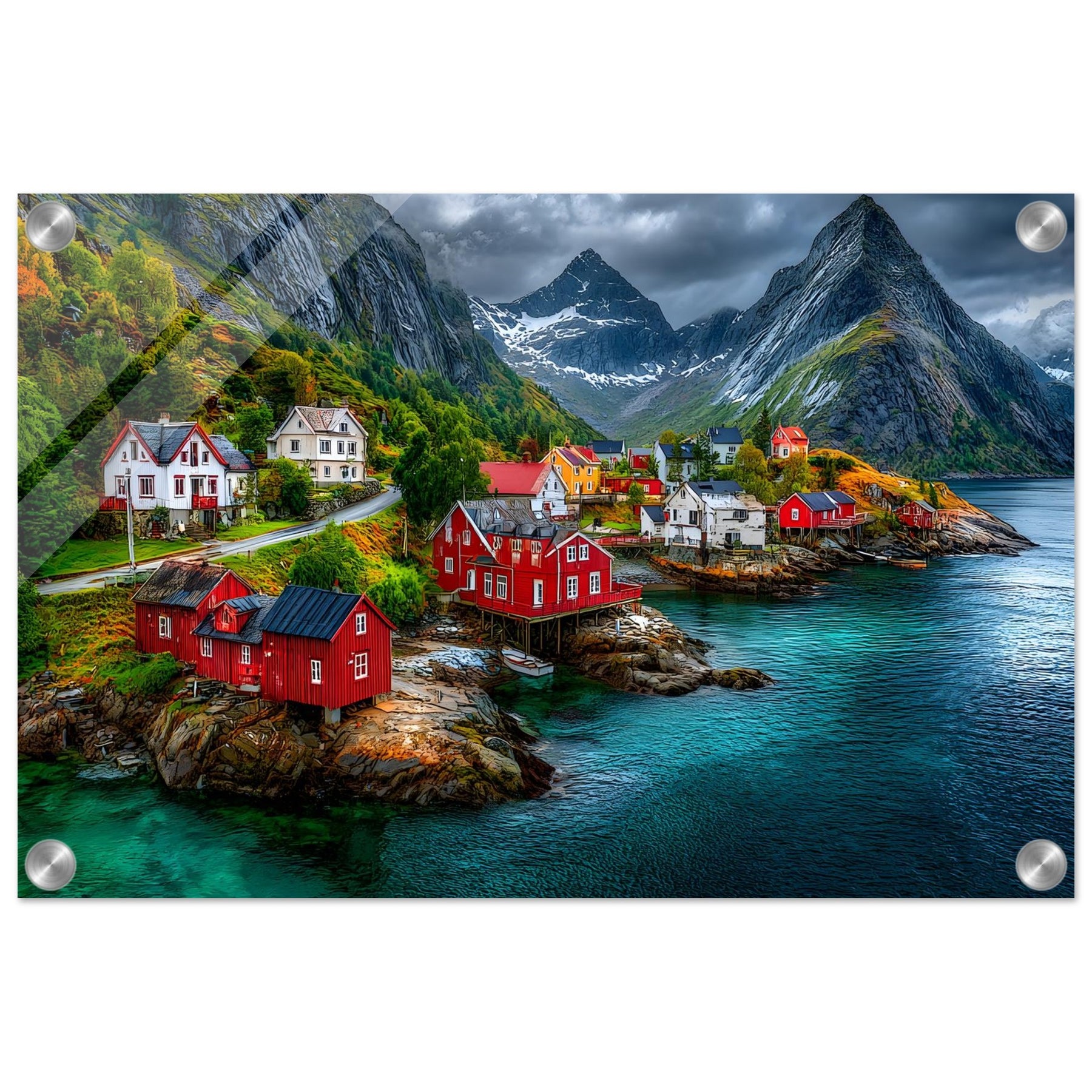 Experience elegance and vibrancy with our Lakeside Serenity Acrylic Wall Art. This captivating artwork highlights a colorful village by the water, with red-roofed houses and blooming hues reflected across a tranquil lake, all set against majestic mountains. The glossy acrylic finish enhances depth and brilliance, making it a sophisticated centerpiece for any room.