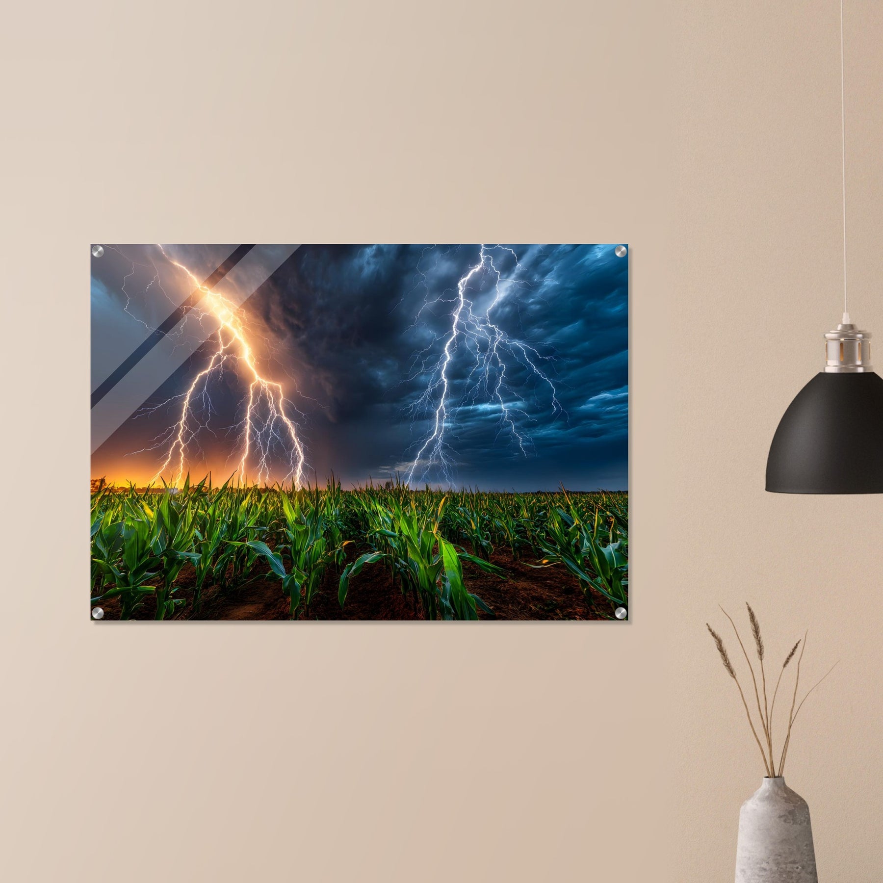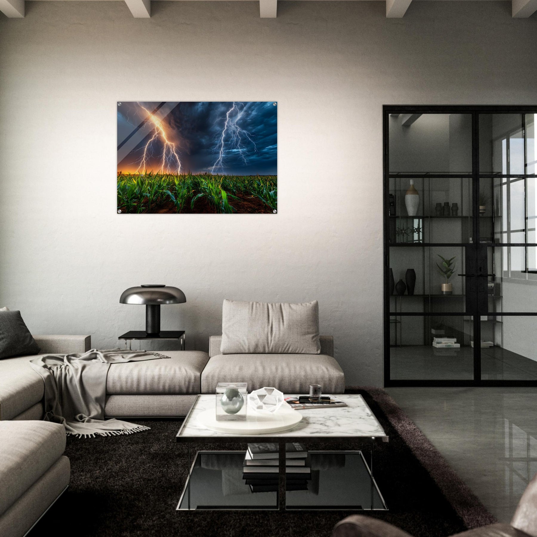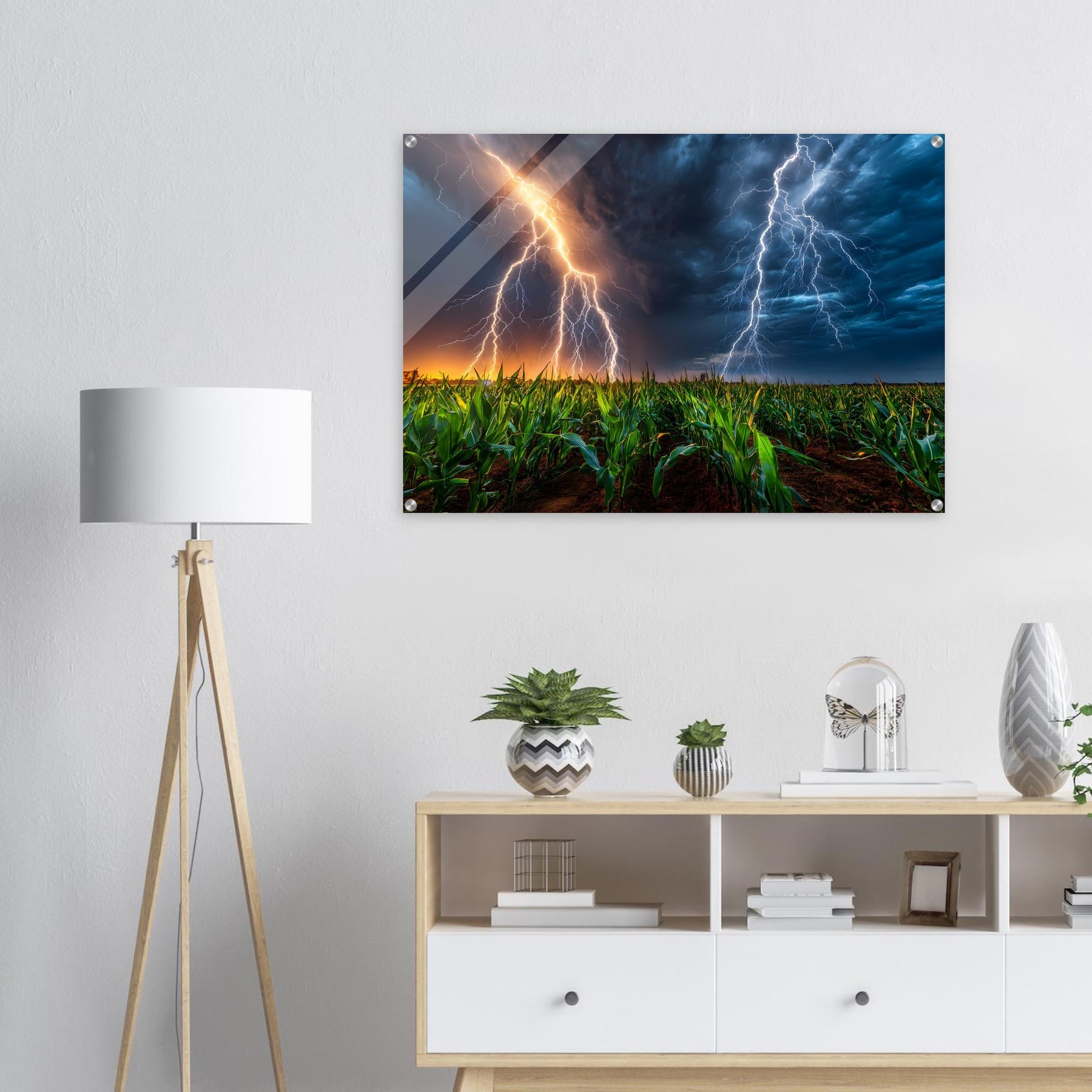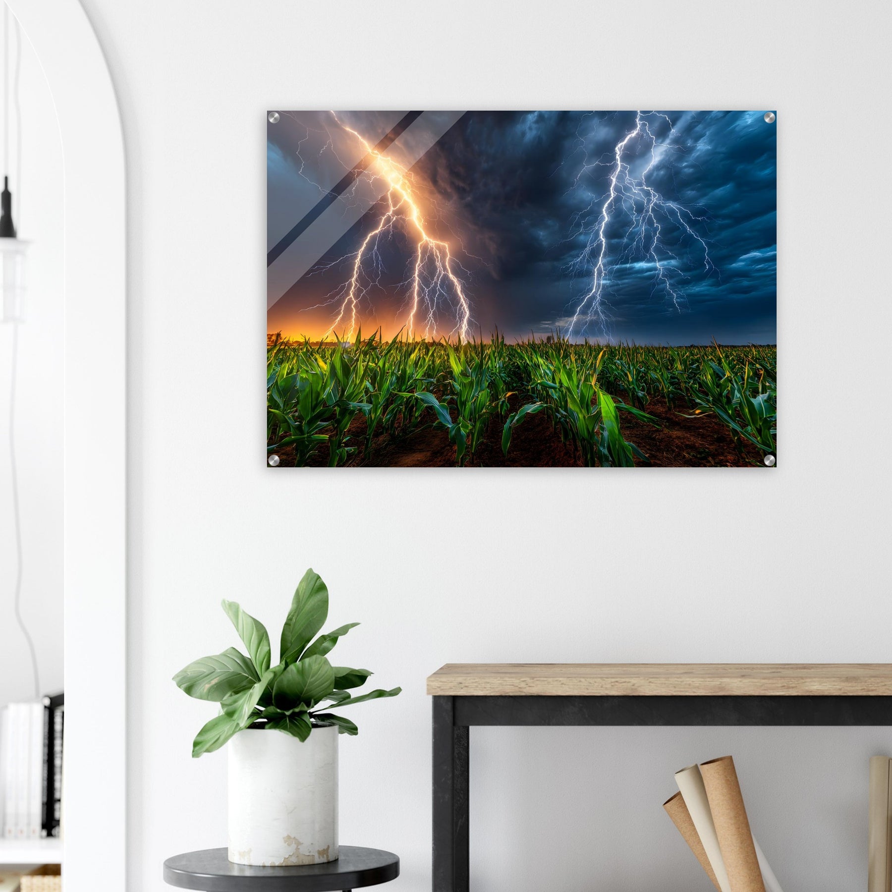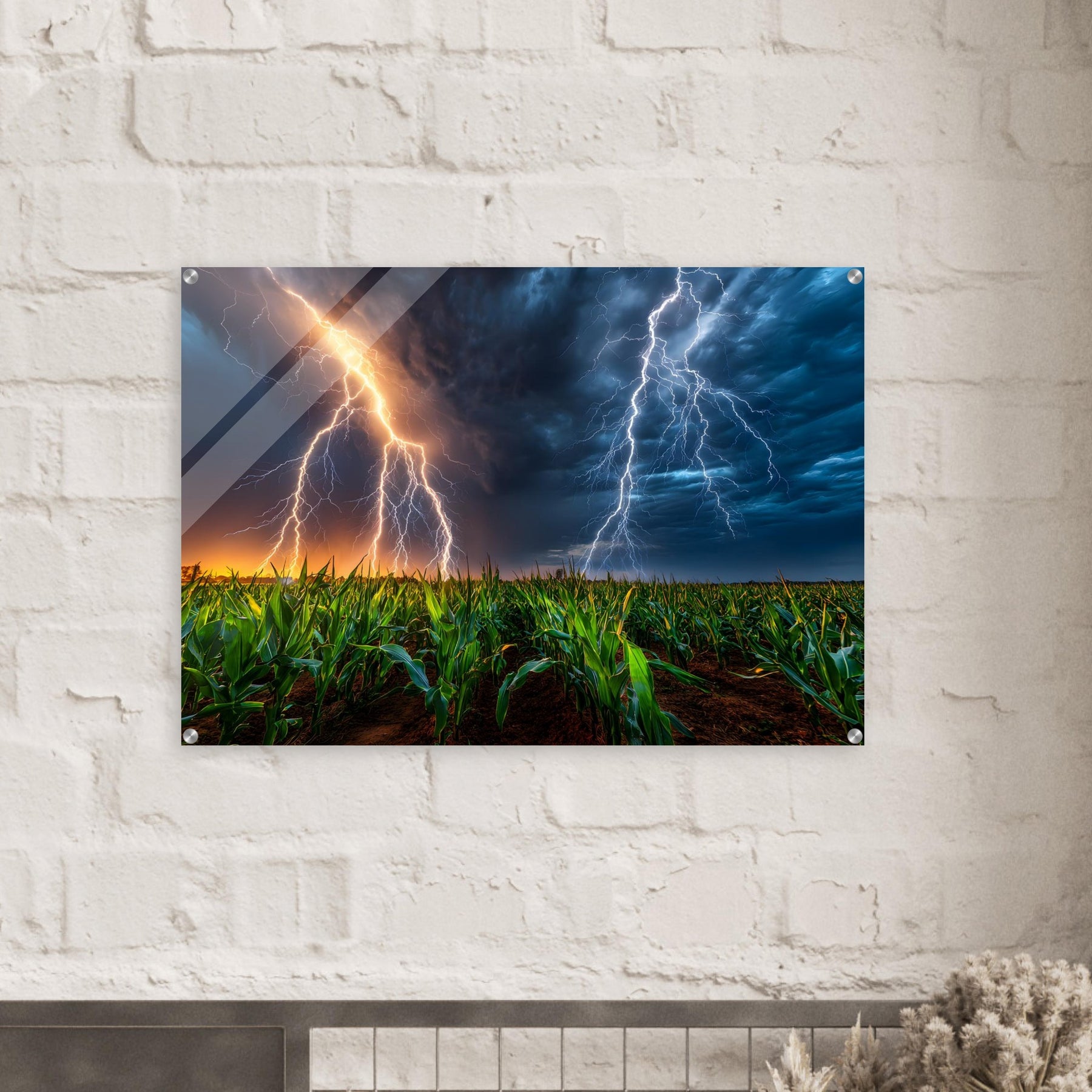 mmerse yourself in the energy of the skies with our Lightning Over the Fields Acrylic Wall Art. Featuring a powerful lightning strike over a golden cornfield, framed by storm clouds and a glowing sunset, this piece bursts with vivid color and striking clarity. The glossy acrylic finish adds depth and brilliance, turning it into a true centerpiece for your home or office.