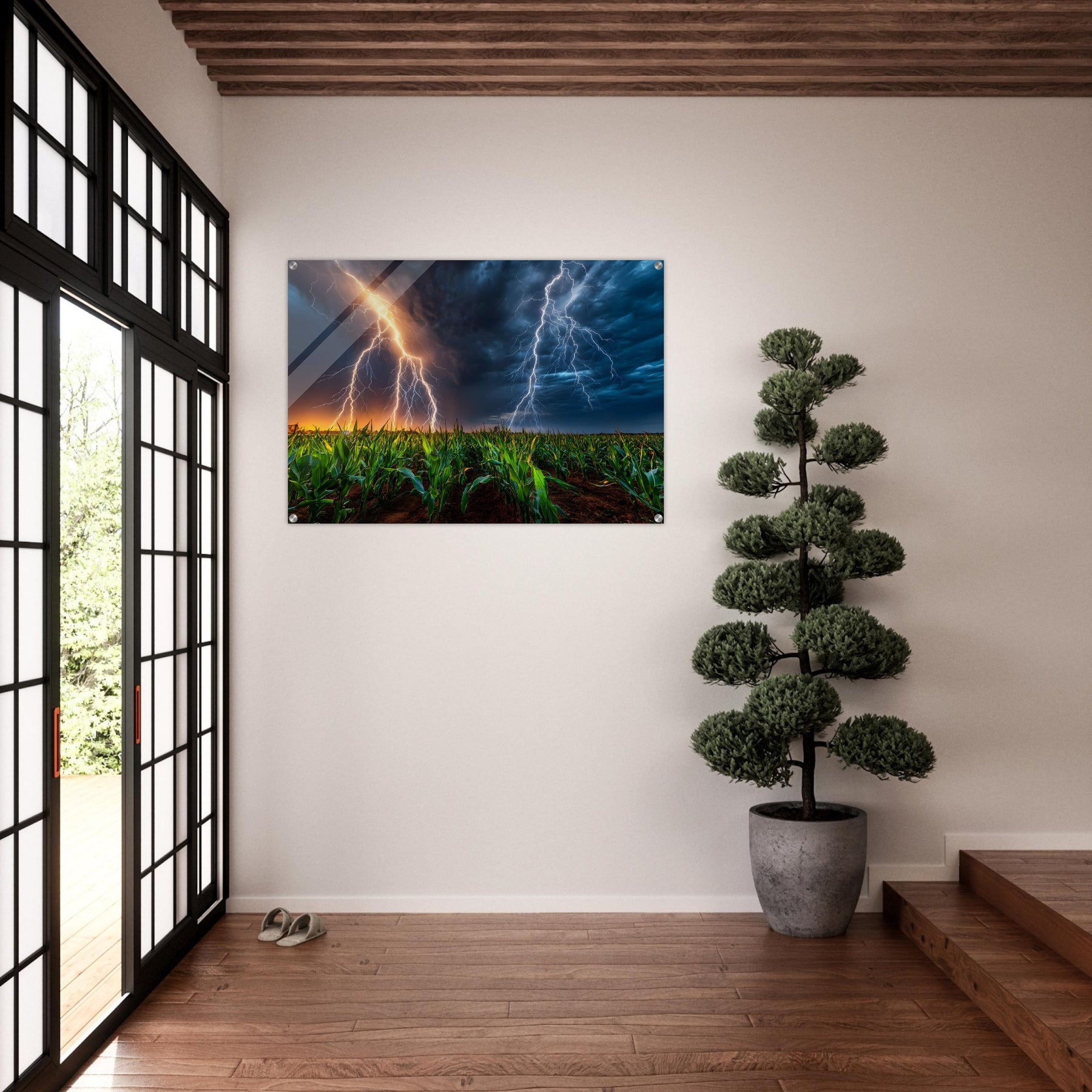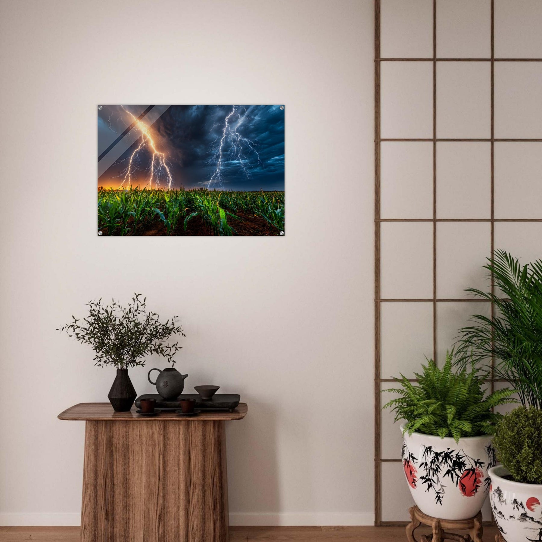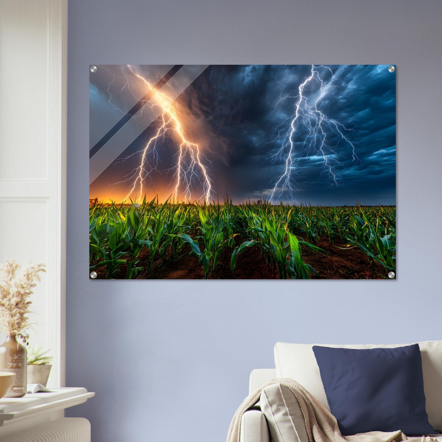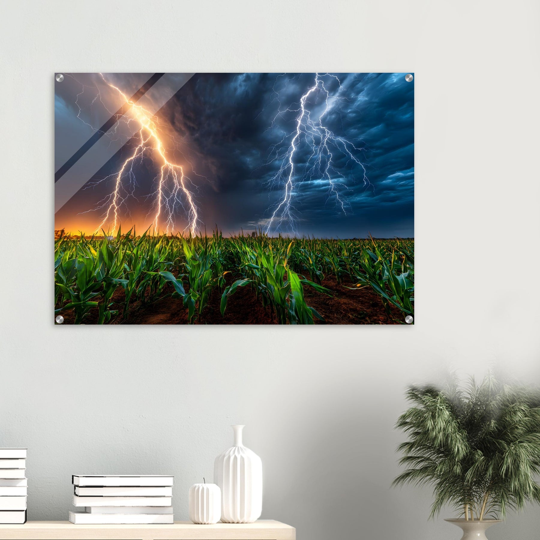 mmerse yourself in the energy of the skies with our Lightning Over the Fields Acrylic Wall Art. Featuring a powerful lightning strike over a golden cornfield, framed by storm clouds and a glowing sunset, this piece bursts with vivid color and striking clarity. The glossy acrylic finish adds depth and brilliance, turning it into a true centerpiece for your home or office.