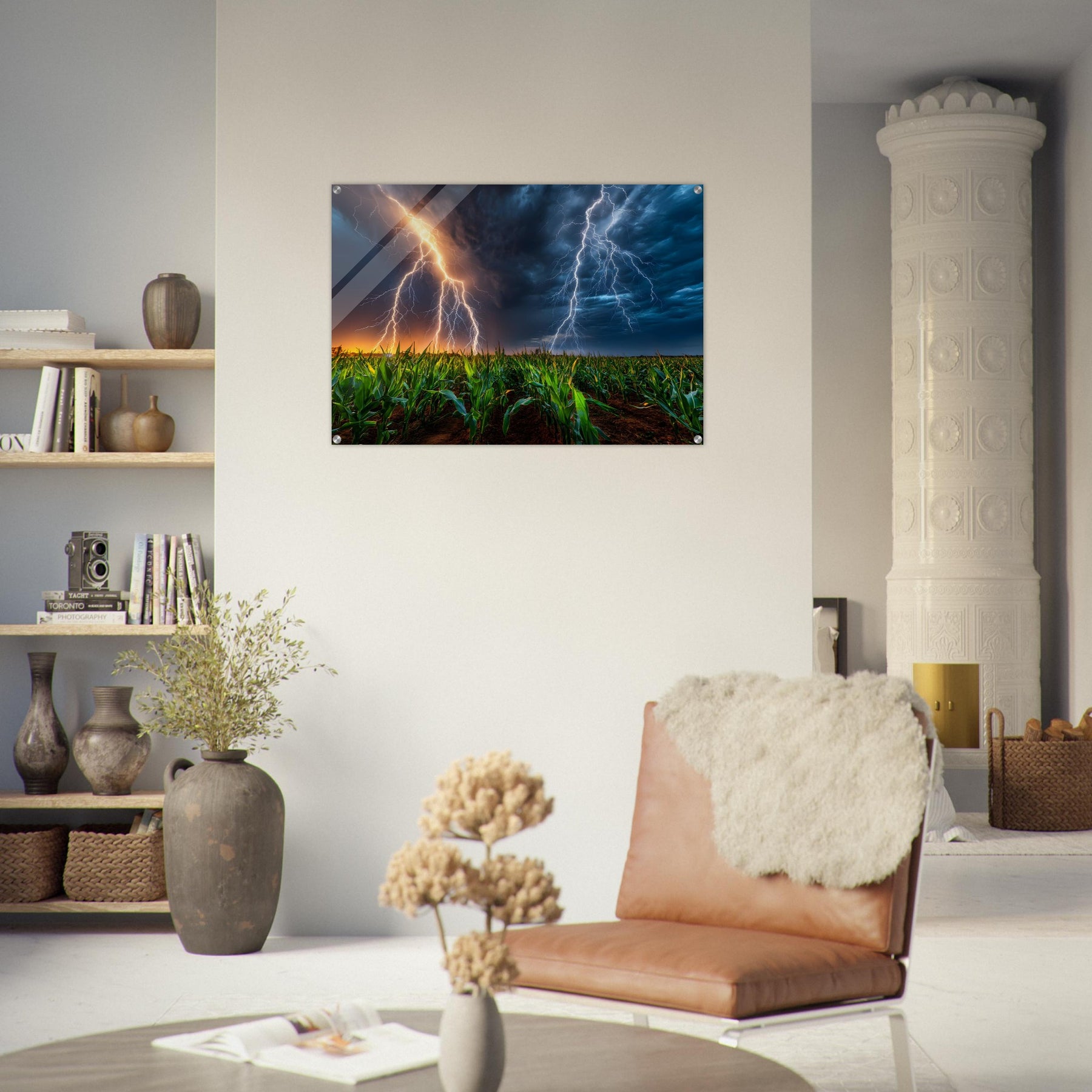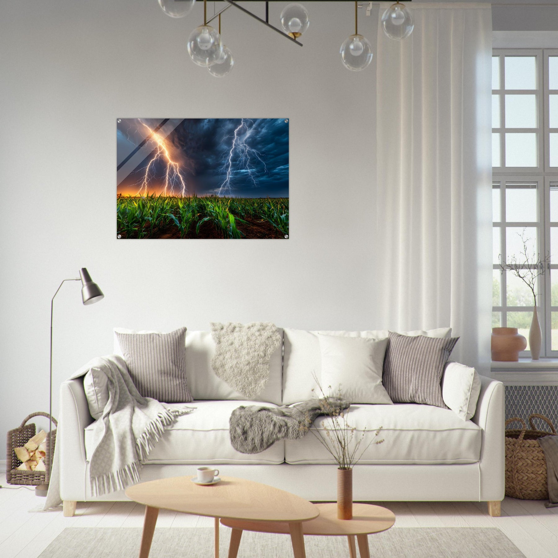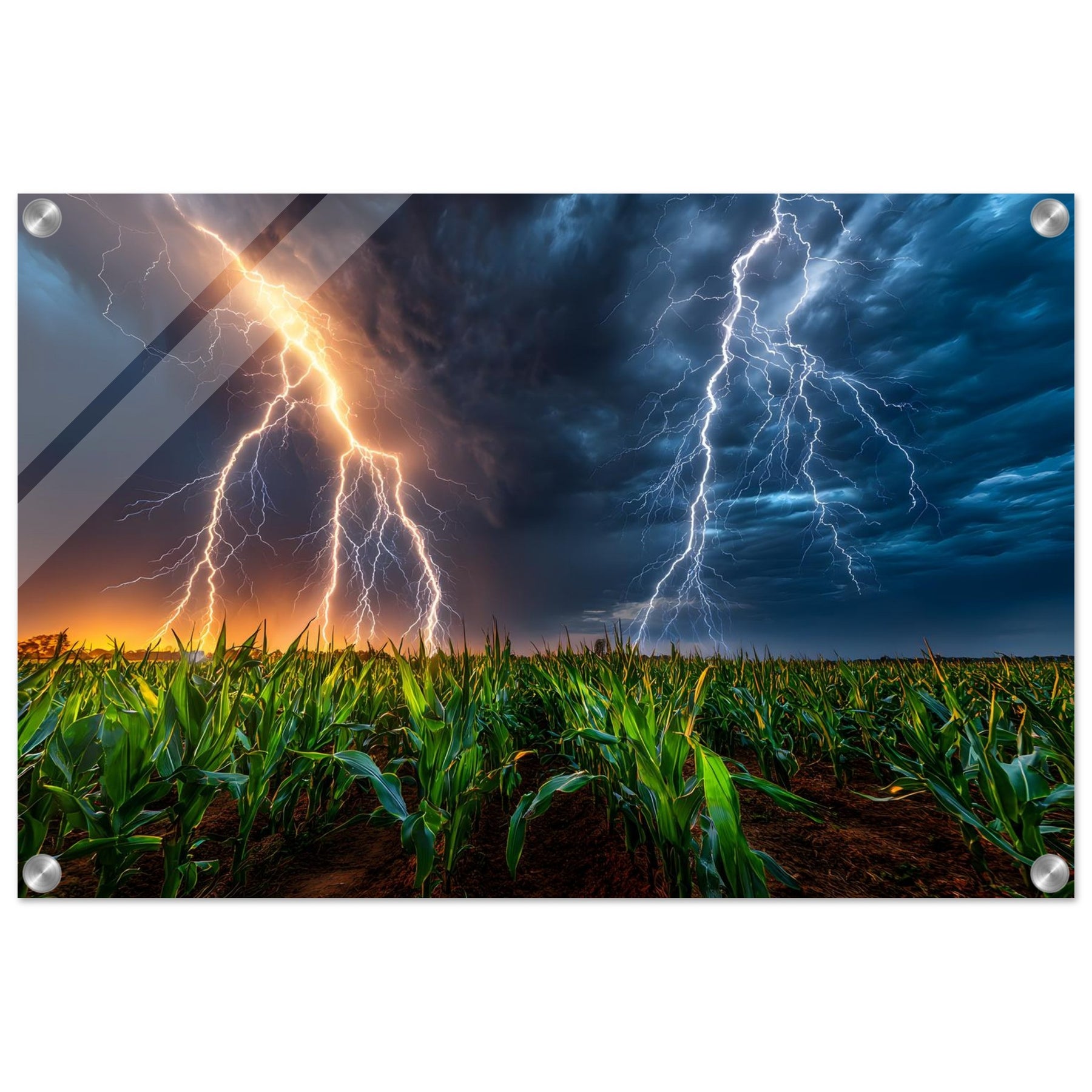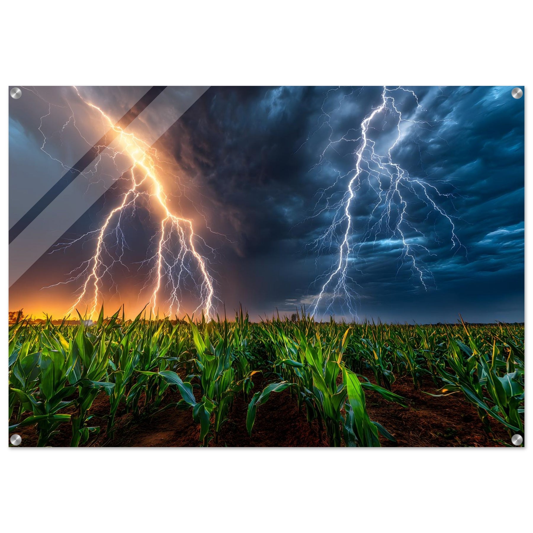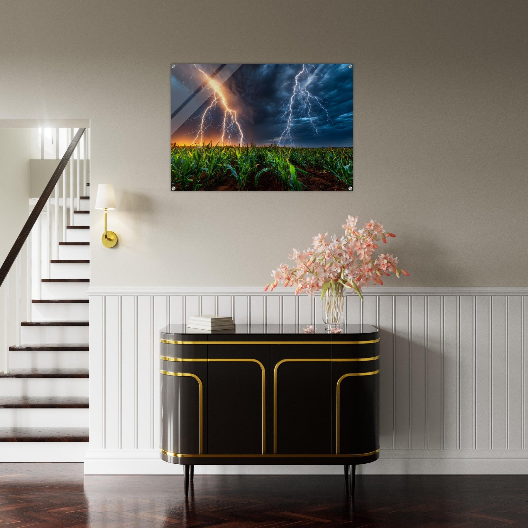 mmerse yourself in the energy of the skies with our Lightning Over the Fields Acrylic Wall Art. Featuring a powerful lightning strike over a golden cornfield, framed by storm clouds and a glowing sunset, this piece bursts with vivid color and striking clarity. The glossy acrylic finish adds depth and brilliance, turning it into a true centerpiece for your home or office.
