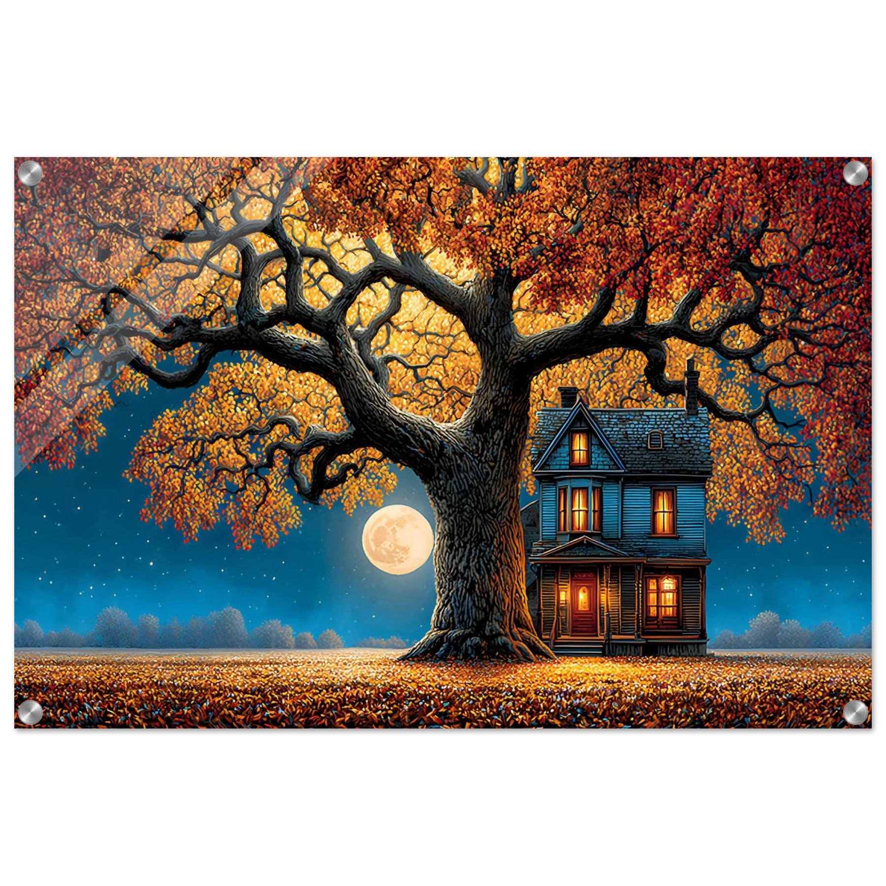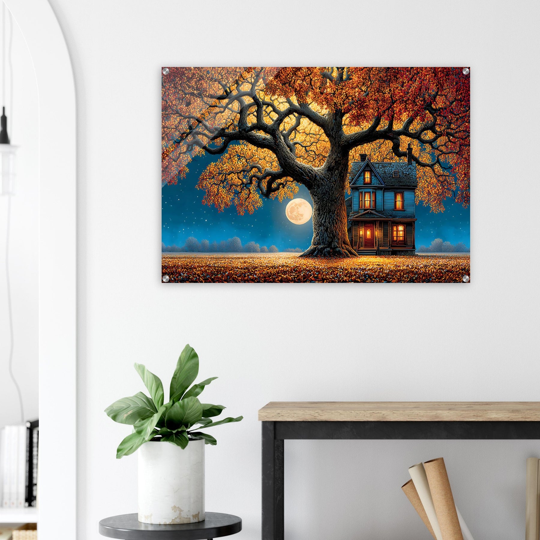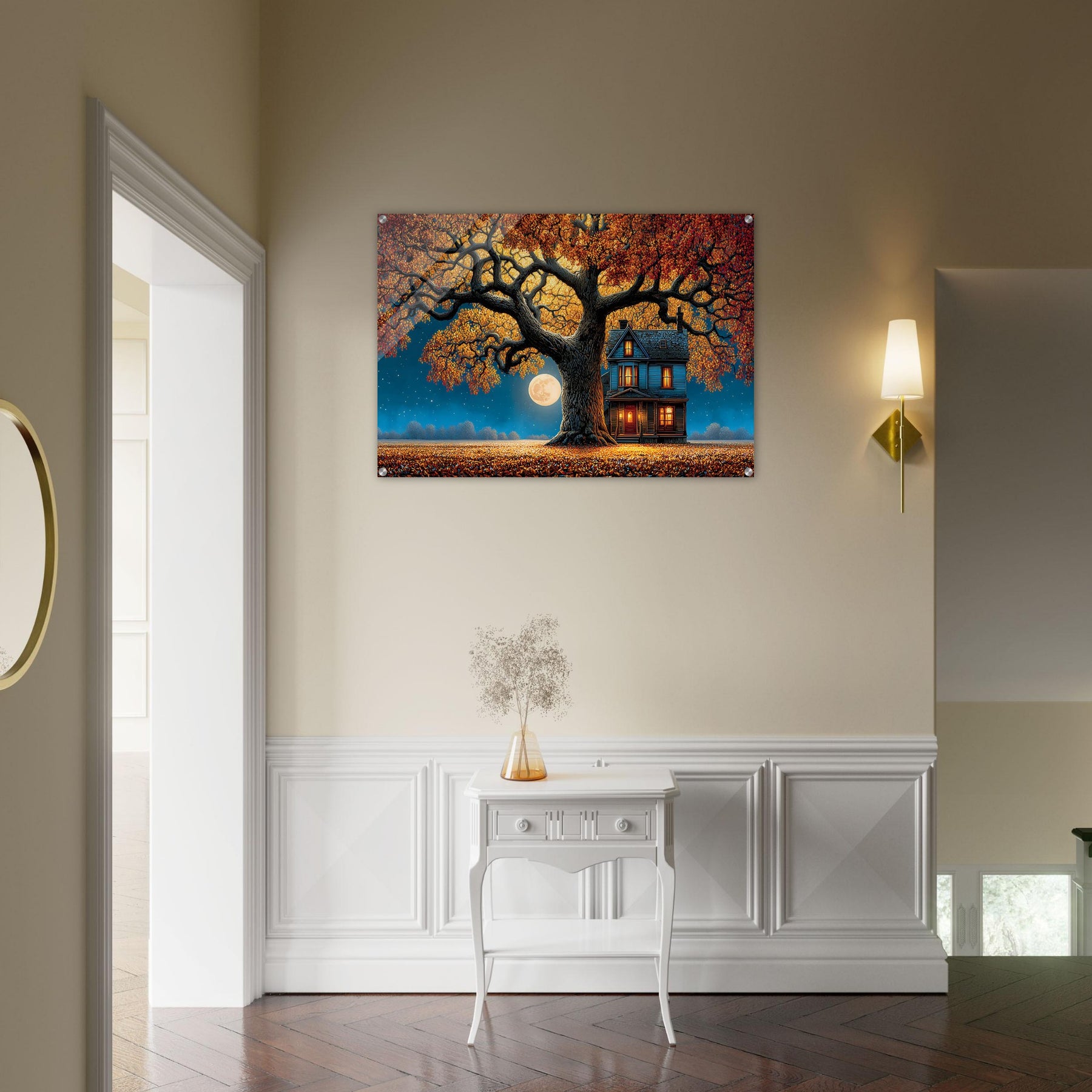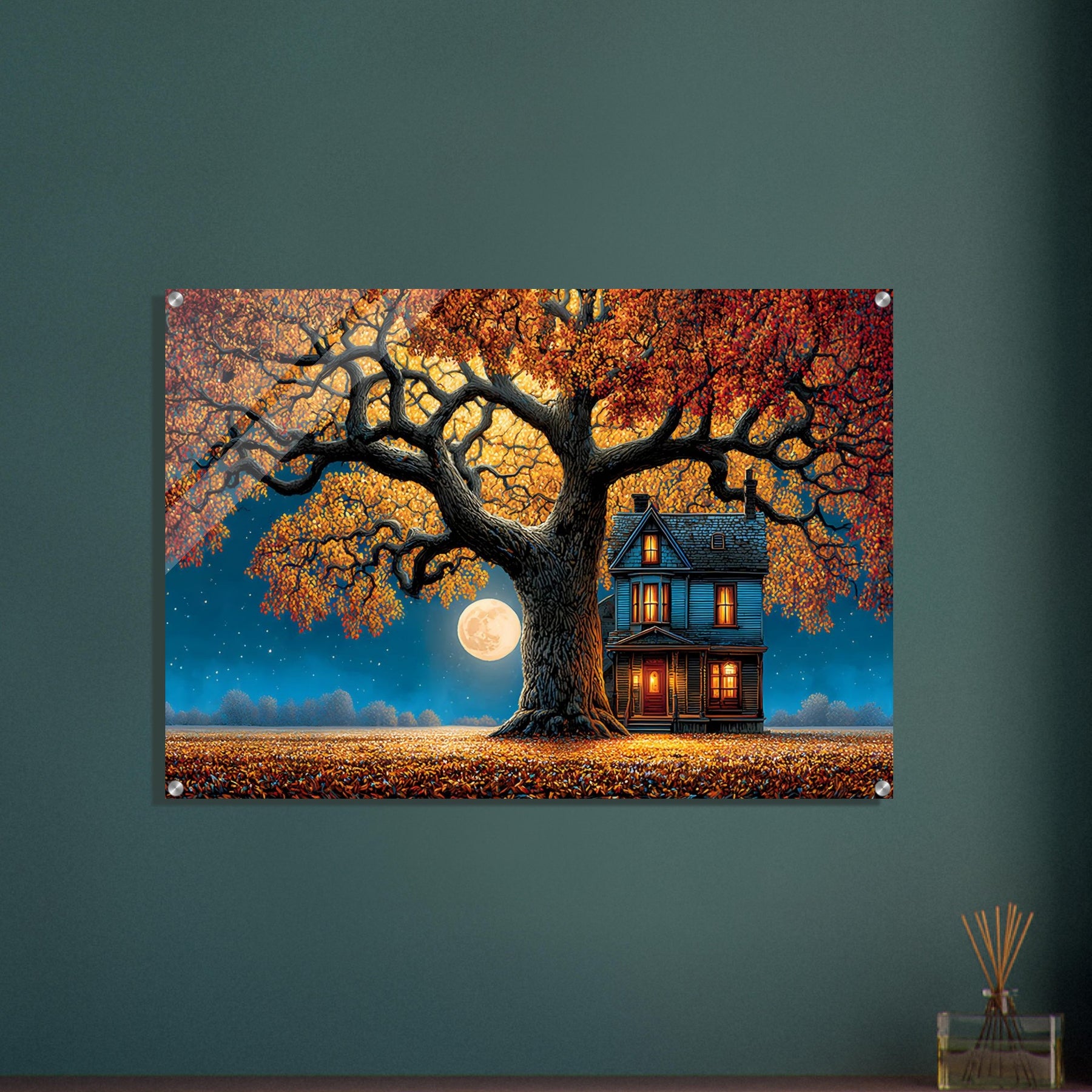Elevate your décor with the Moonlit Autumn Serenity Acrylic Wall Art, where rich autumn hues and the glow of a full moon shine through a sleek glass-like finish. The enchanting scene of a cozy house beneath a vibrant autumn tree is brought to life with striking depth and luminosity, making it a show-stopping centerpiece for any modern home.
