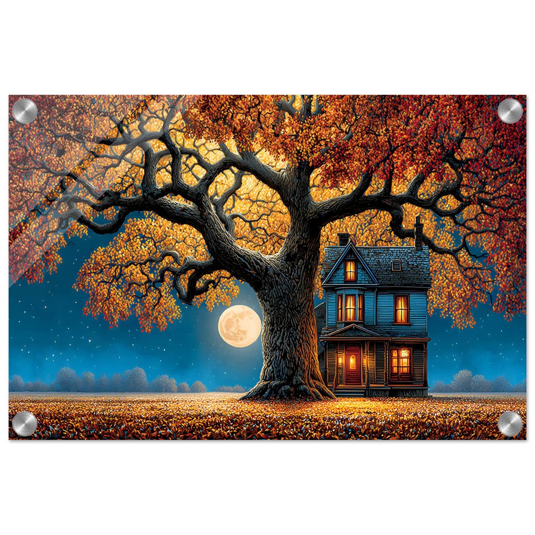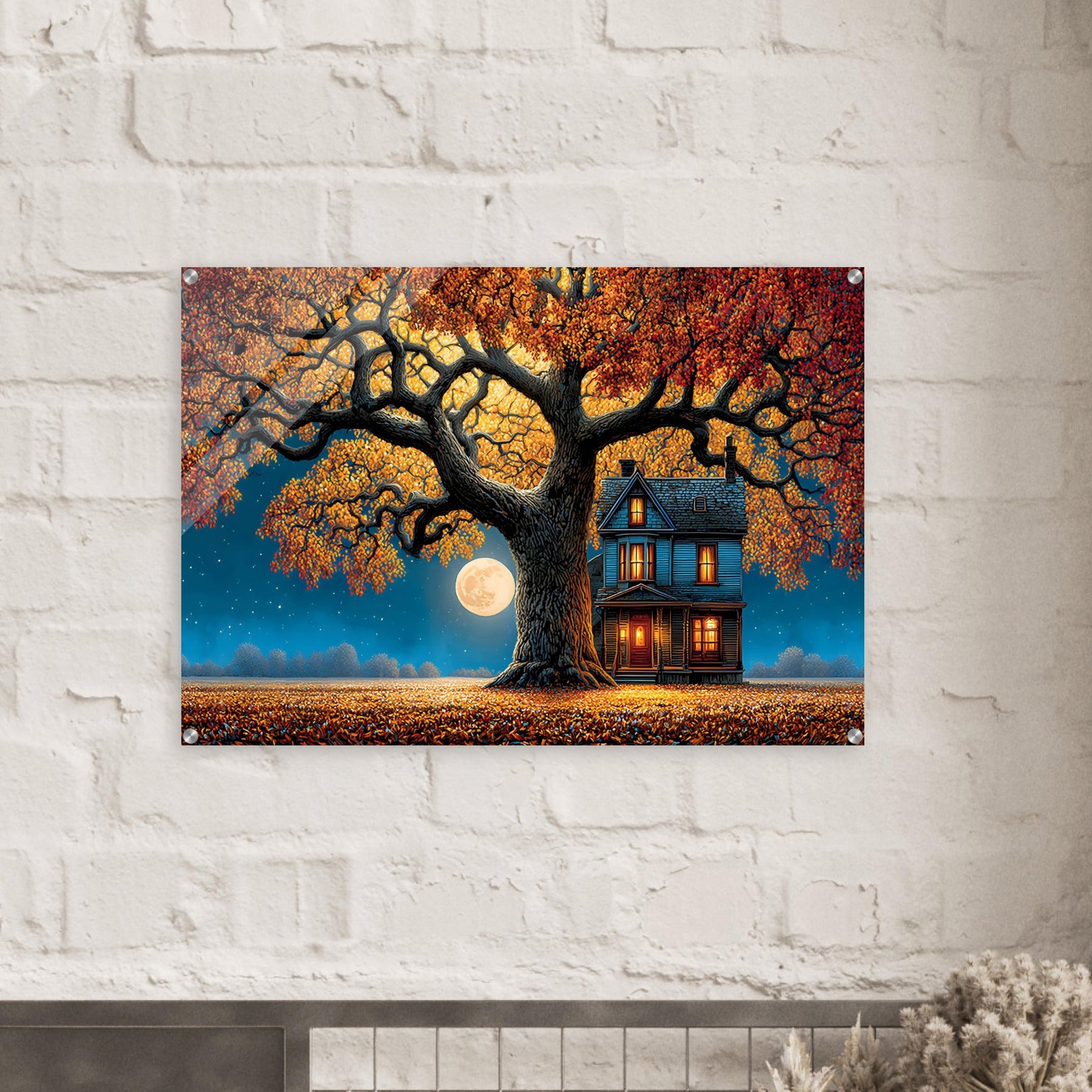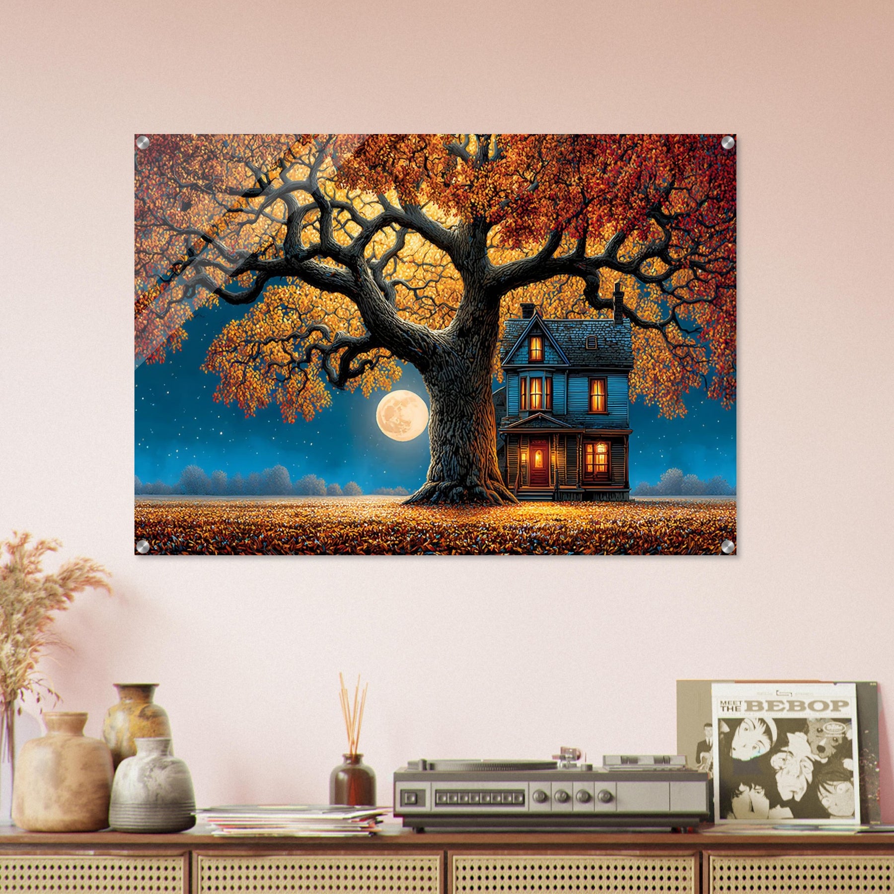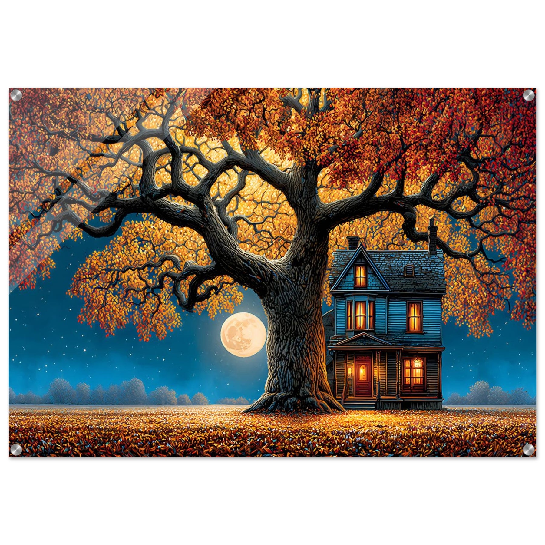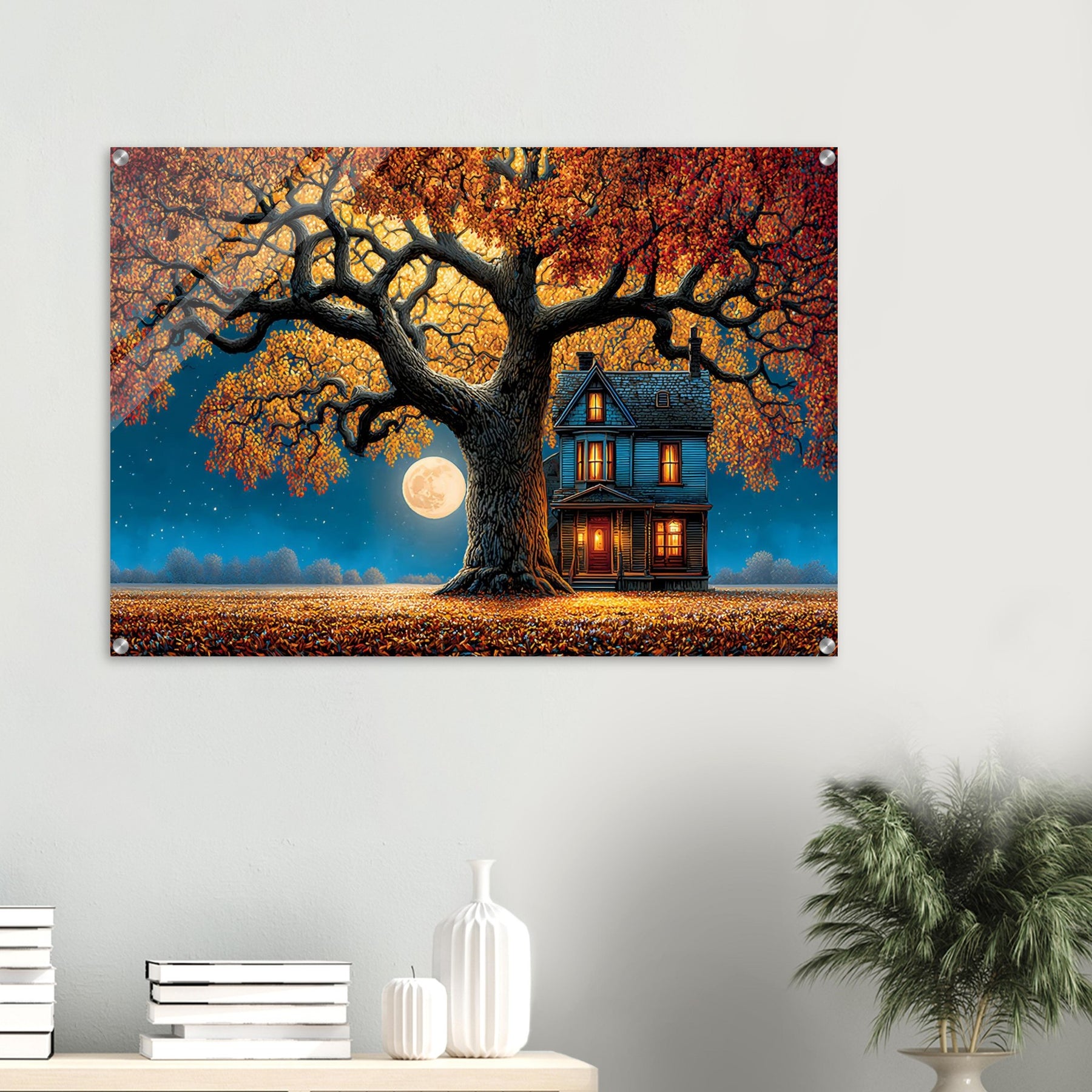 Elevate your décor with the Moonlit Autumn Serenity Acrylic Wall Art, where rich autumn hues and the glow of a full moon shine through a sleek glass-like finish. The enchanting scene of a cozy house beneath a vibrant autumn tree is brought to life with striking depth and luminosity, making it a show-stopping centerpiece for any modern home.