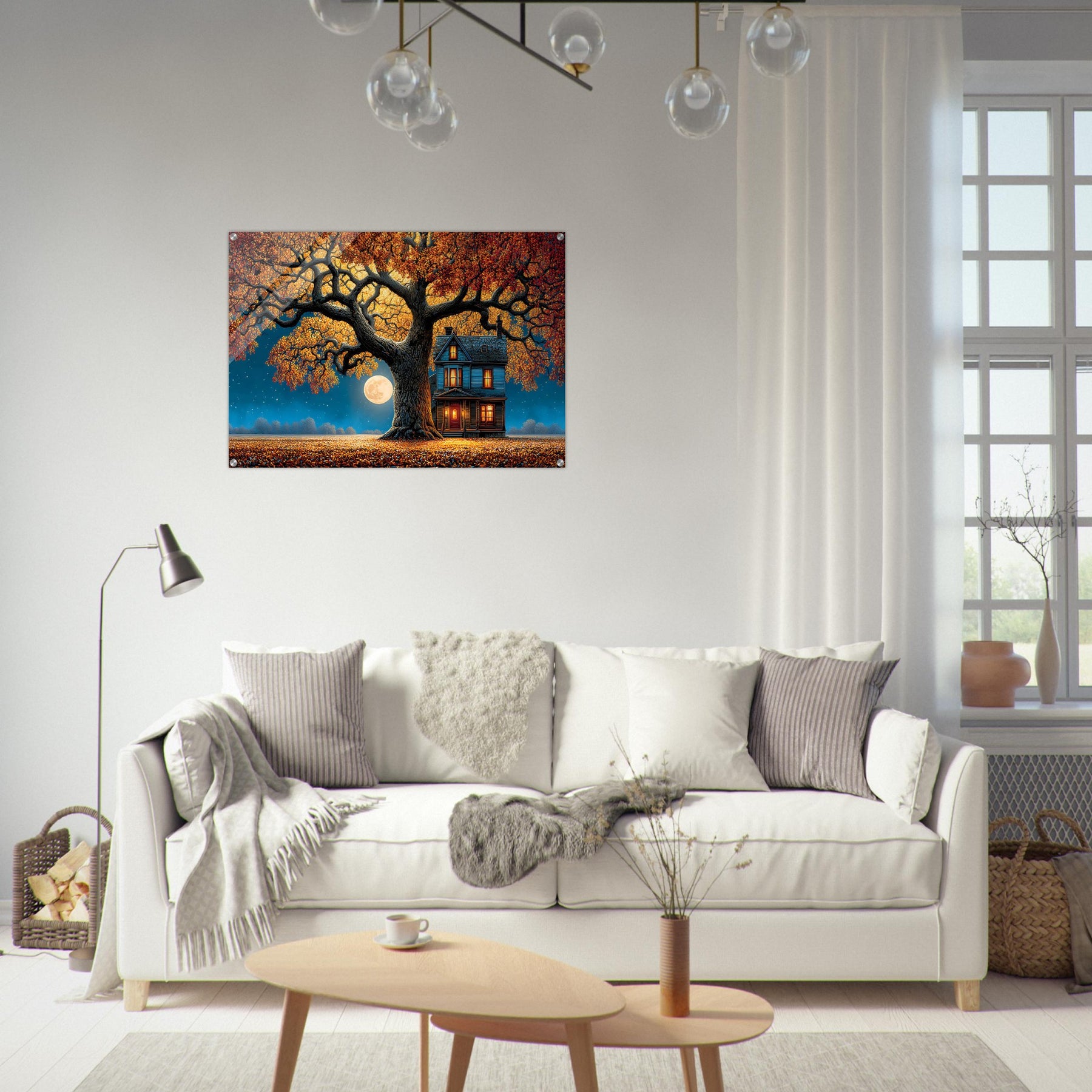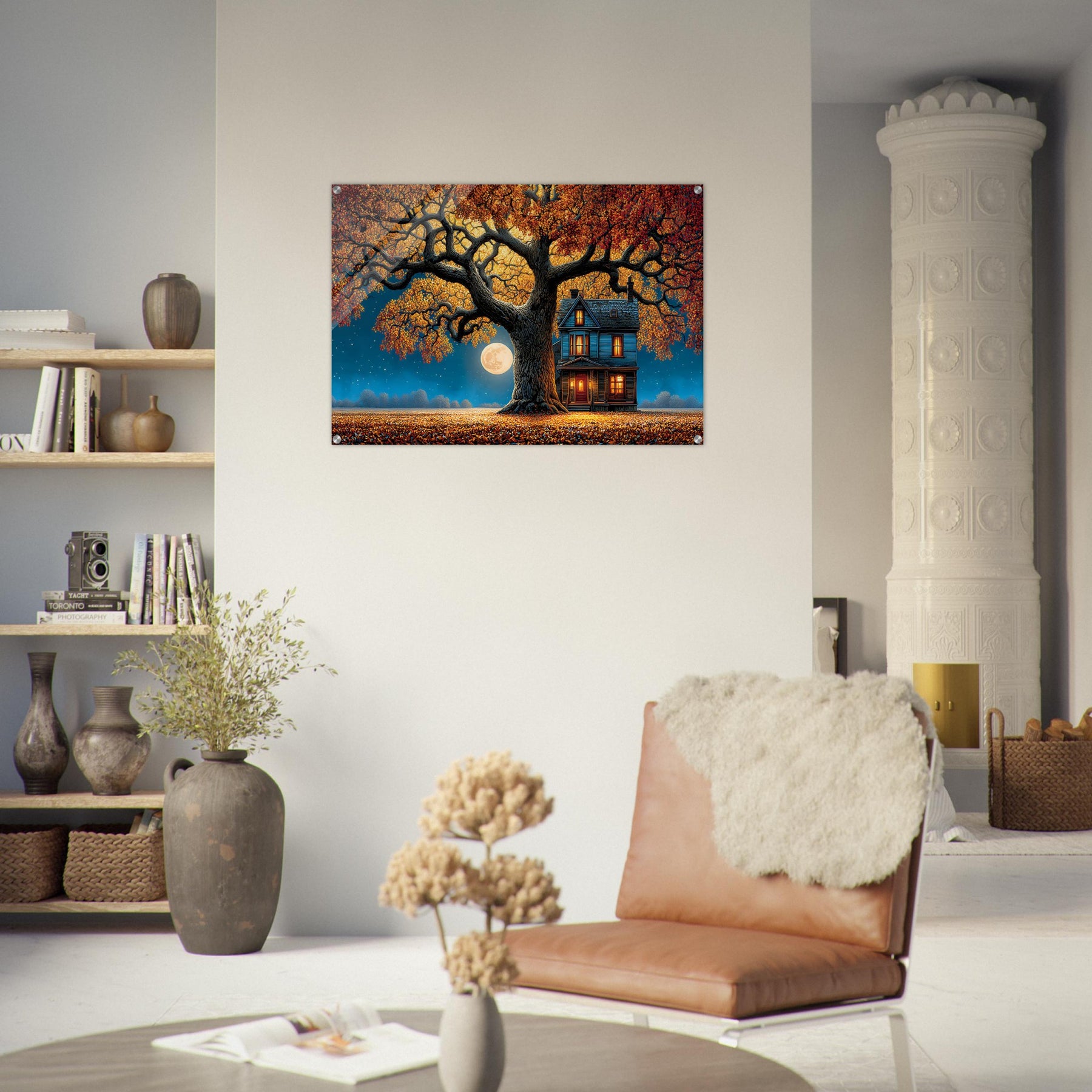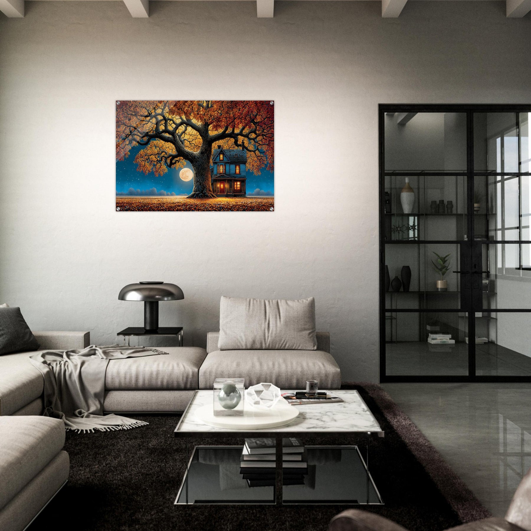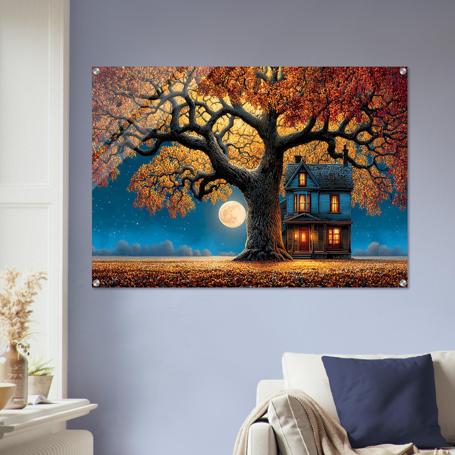 Elevate your décor with the Moonlit Autumn Serenity Acrylic Wall Art, where rich autumn hues and the glow of a full moon shine through a sleek glass-like finish. The enchanting scene of a cozy house beneath a vibrant autumn tree is brought to life with striking depth and luminosity, making it a show-stopping centerpiece for any modern home.