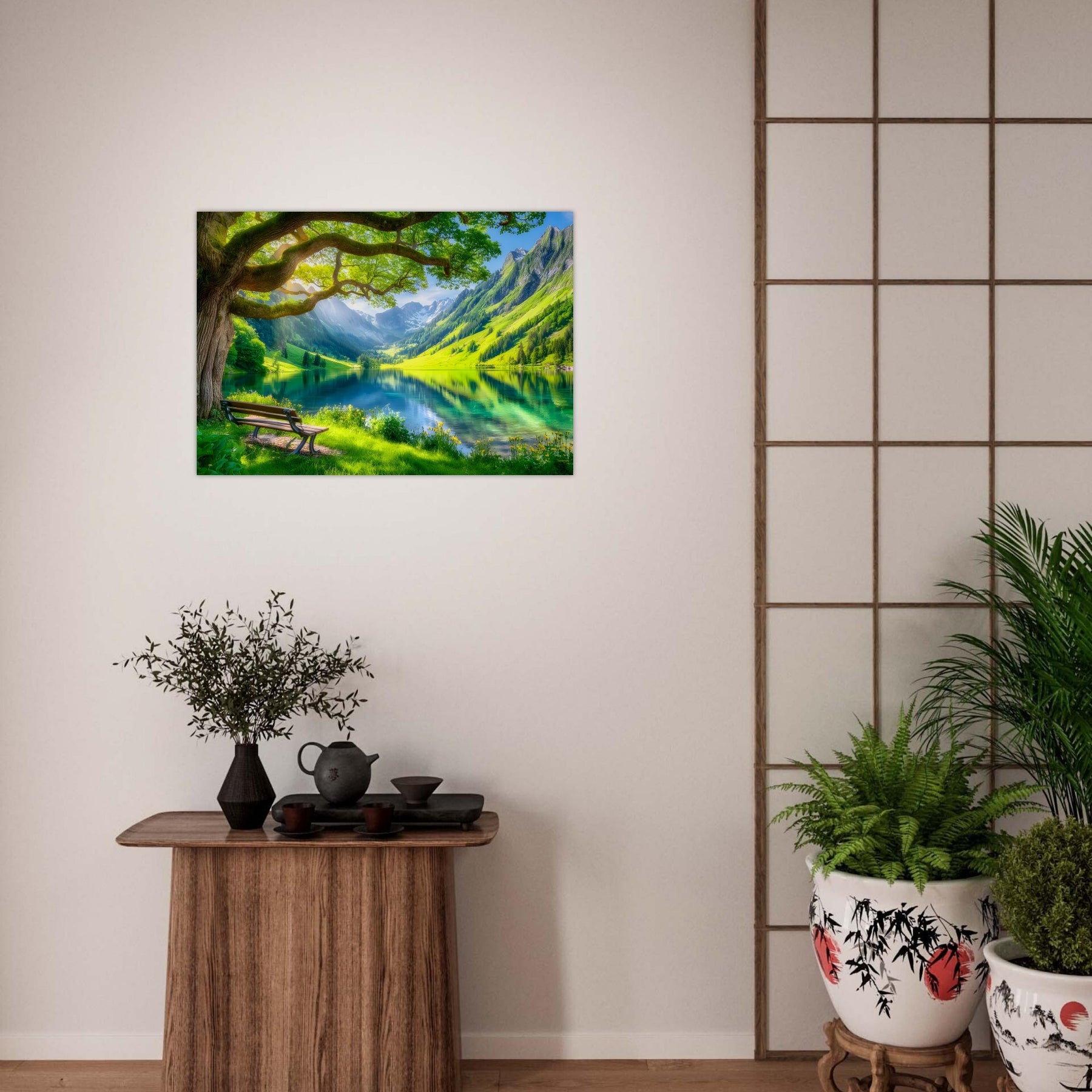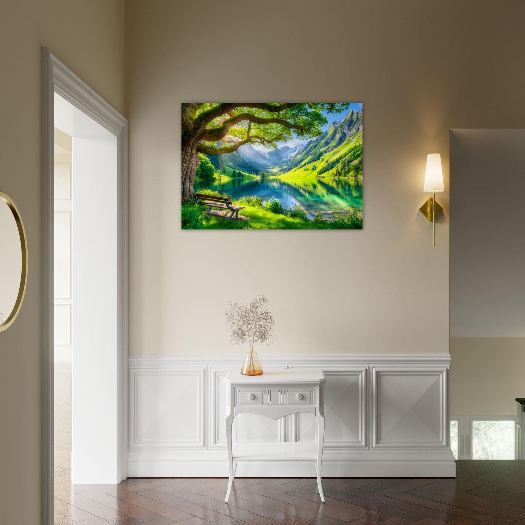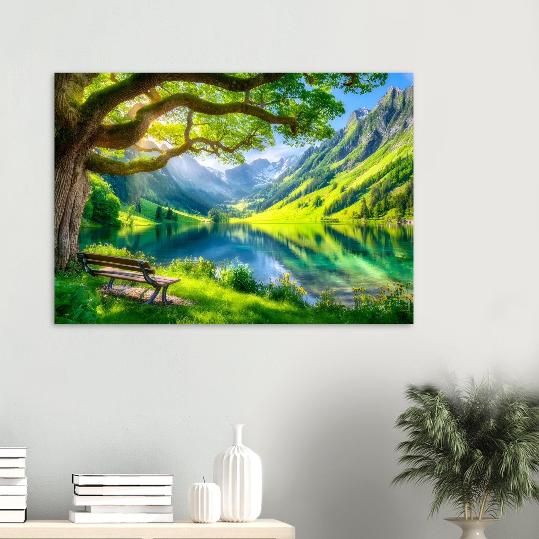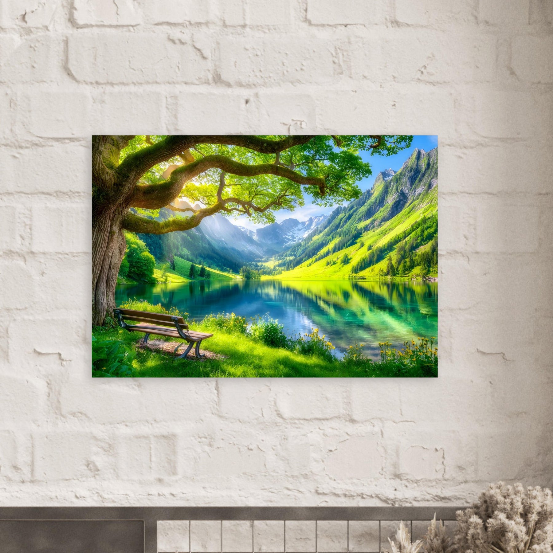 Transform your space with Mountain Lake Serenity, a stunning aluminum wall art piece that captures the calming beauty of untouched nature. This breathtaking scene features a tranquil mountain lake surrounded by lush green meadows, crystal-clear reflections, and majestic towering peaks—creating a peaceful escape perfect for nature lovers and tranquility seekers.