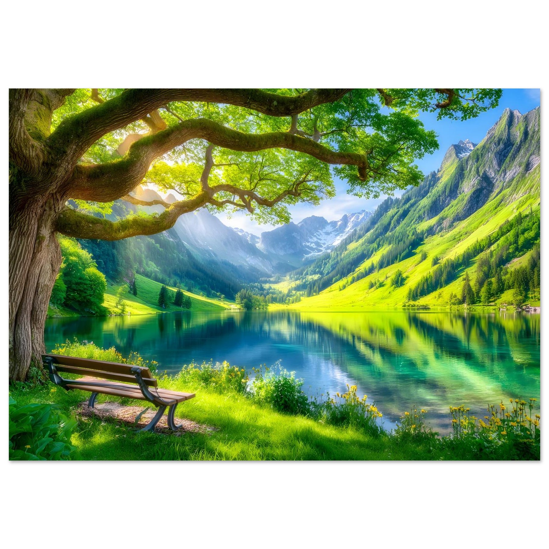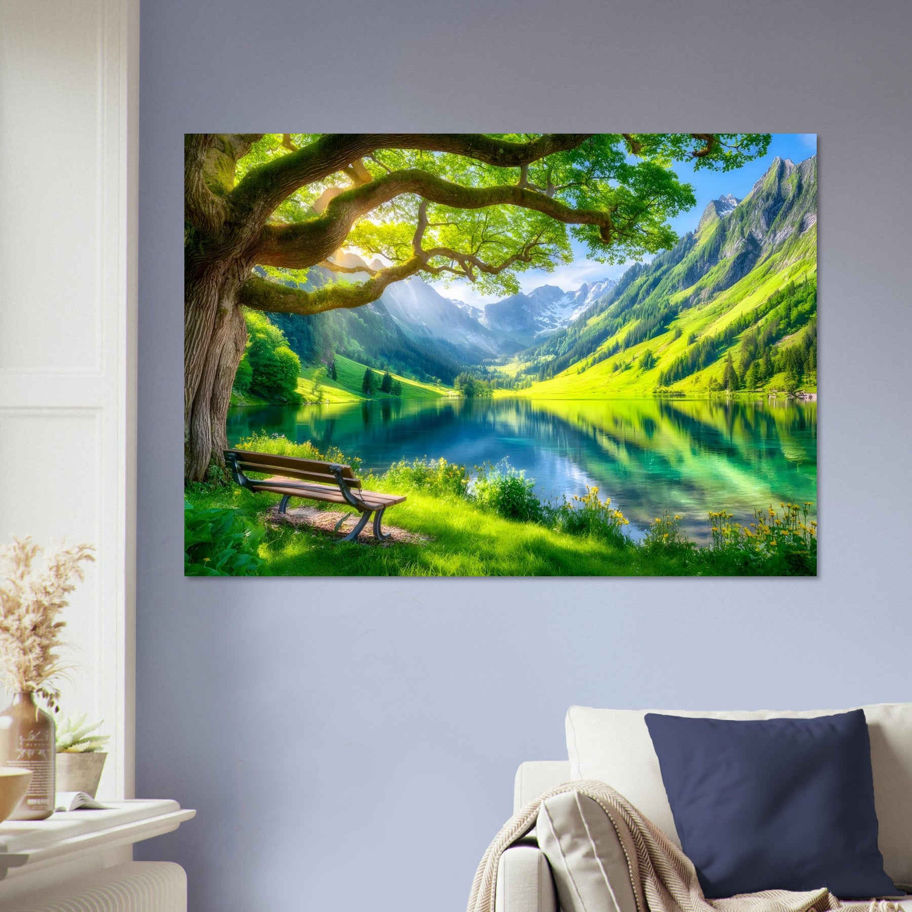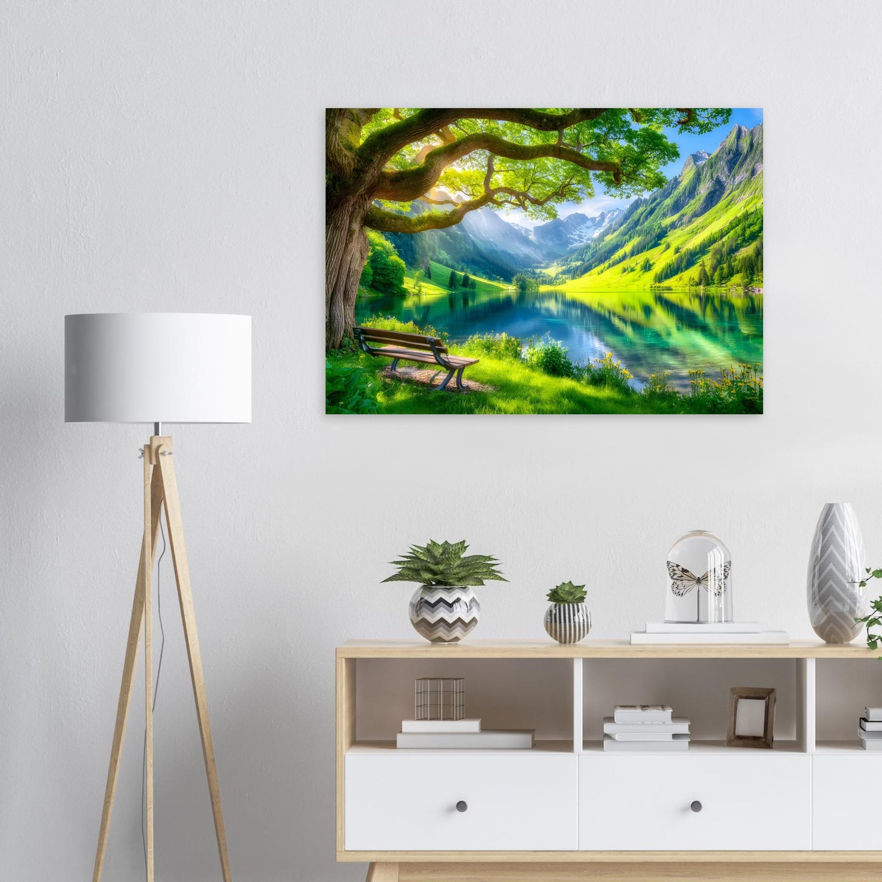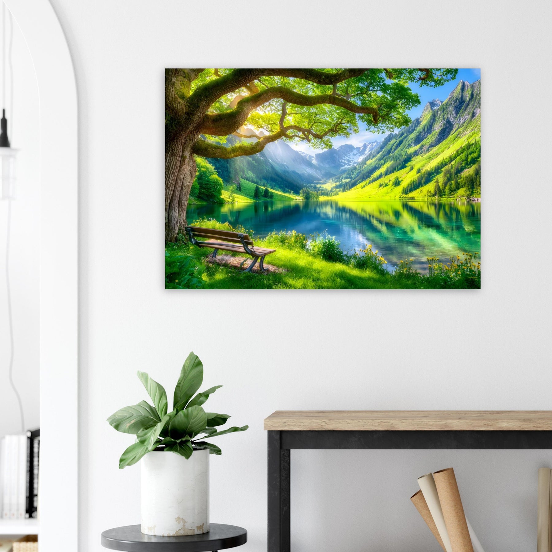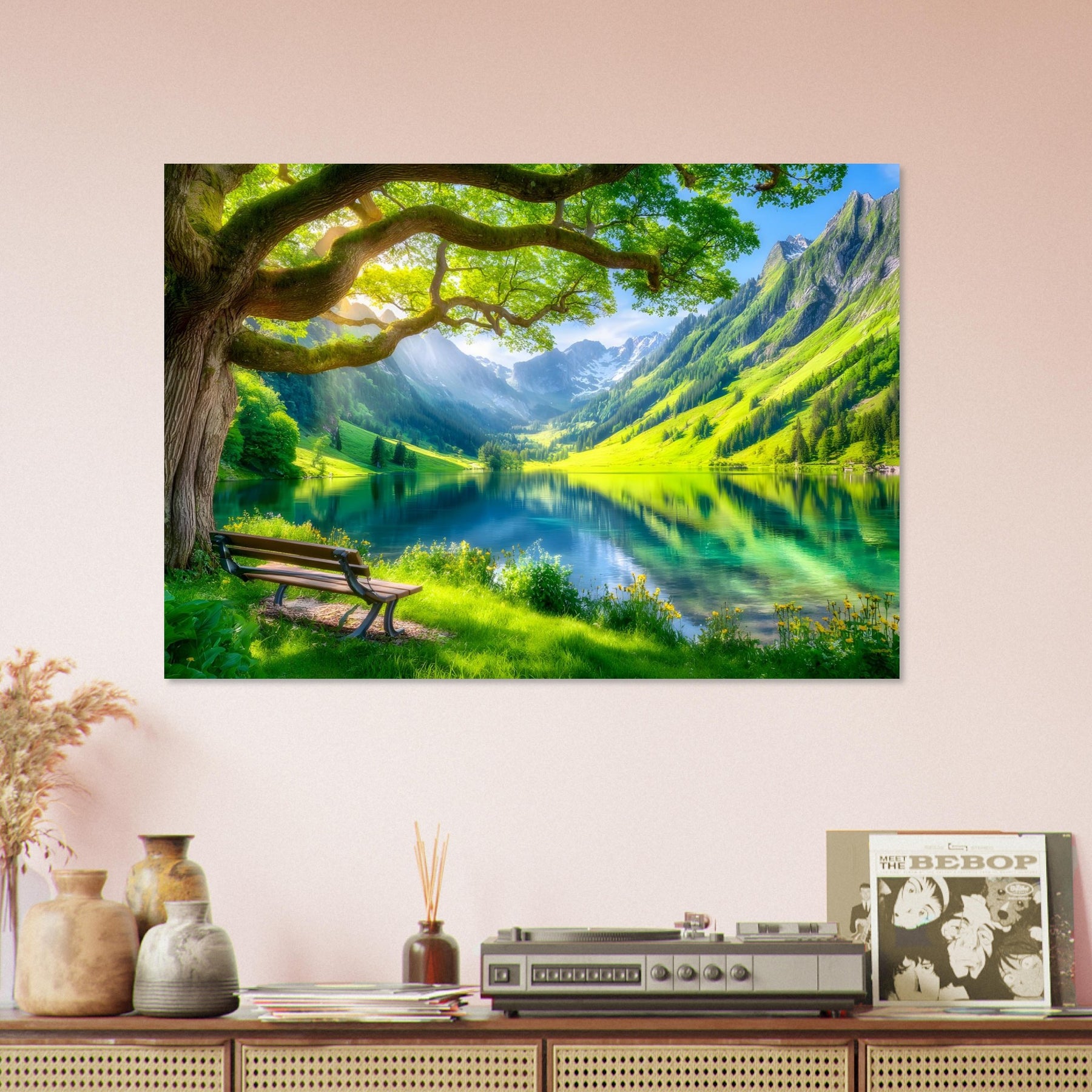 Transform your space with Mountain Lake Serenity, a stunning aluminum wall art piece that captures the calming beauty of untouched nature. This breathtaking scene features a tranquil mountain lake surrounded by lush green meadows, crystal-clear reflections, and majestic towering peaks—creating a peaceful escape perfect for nature lovers and tranquility seekers.