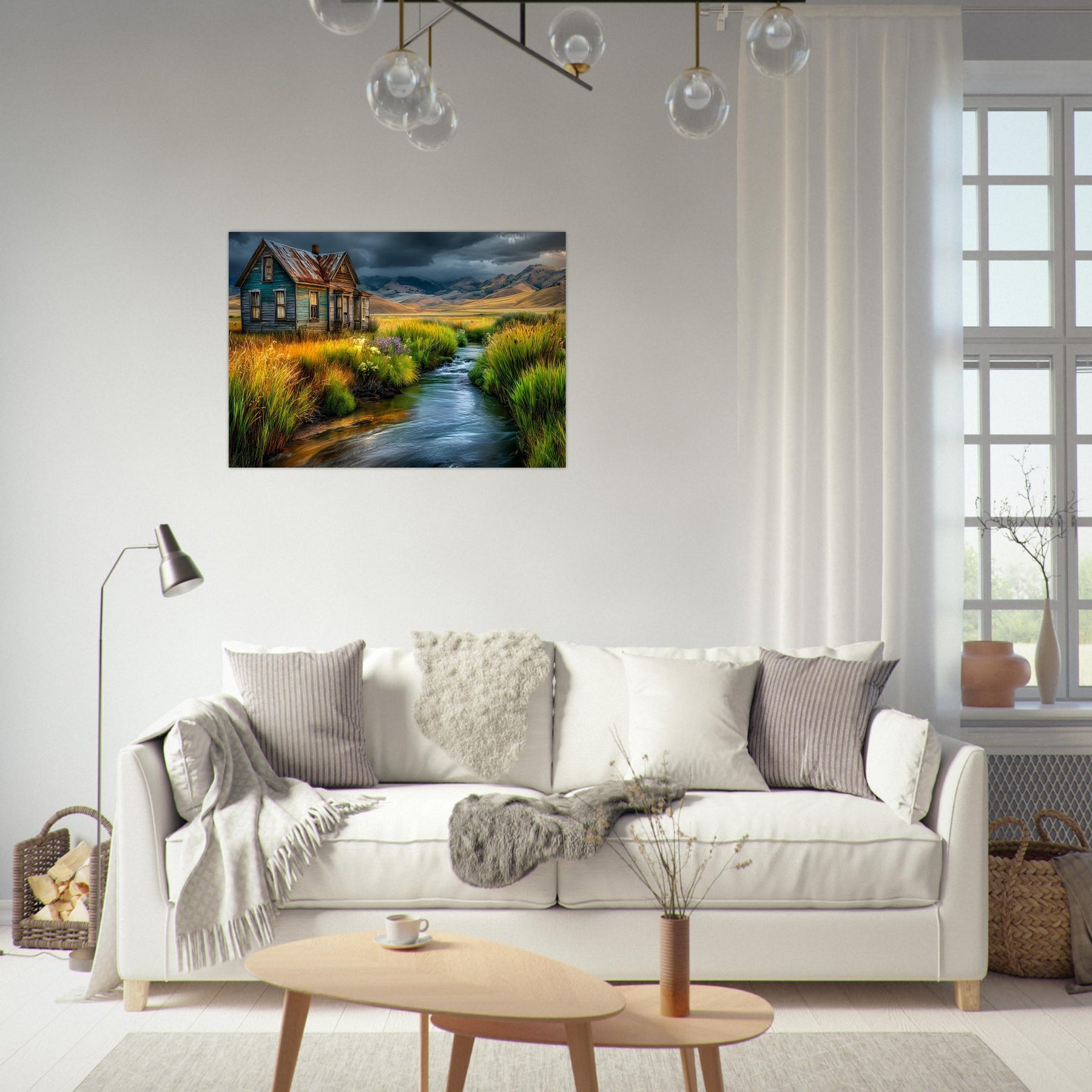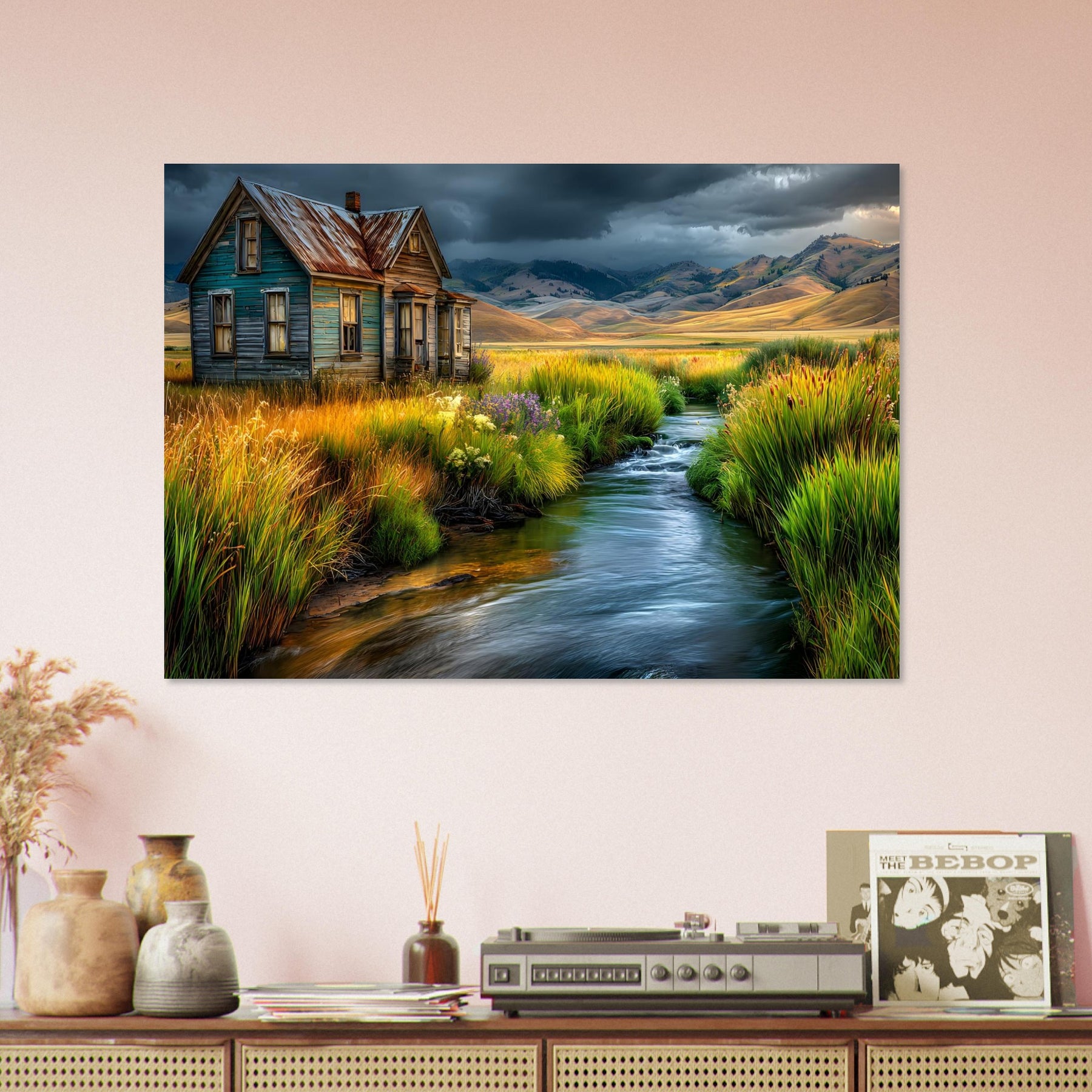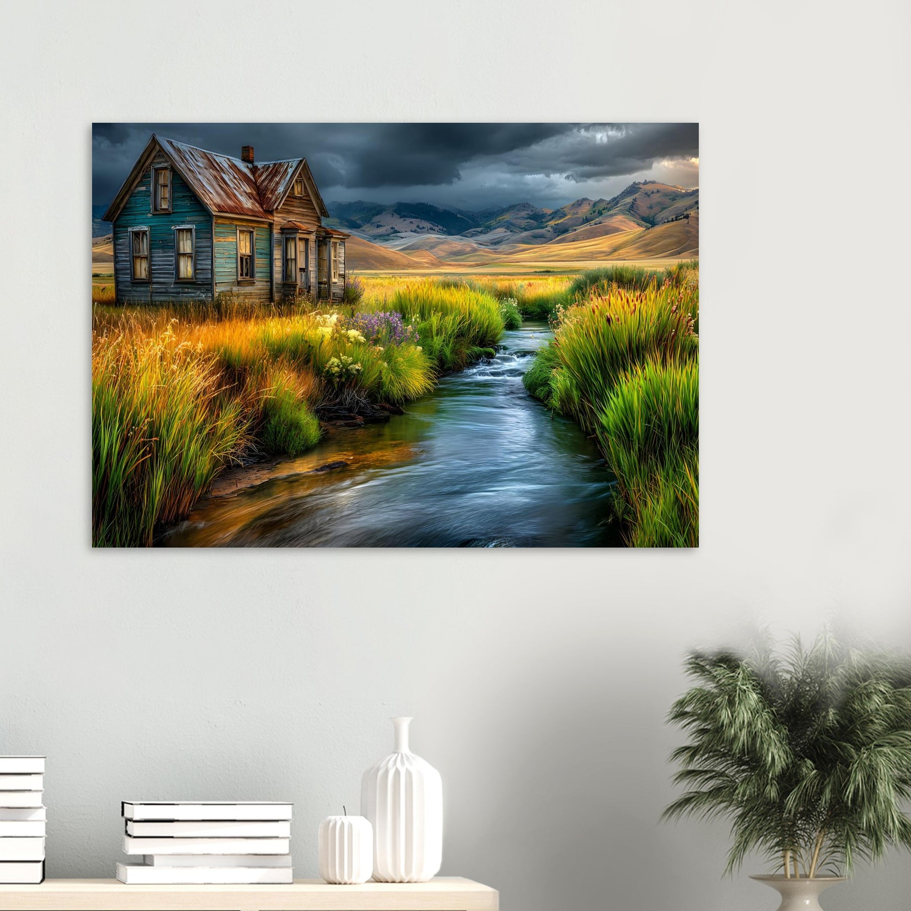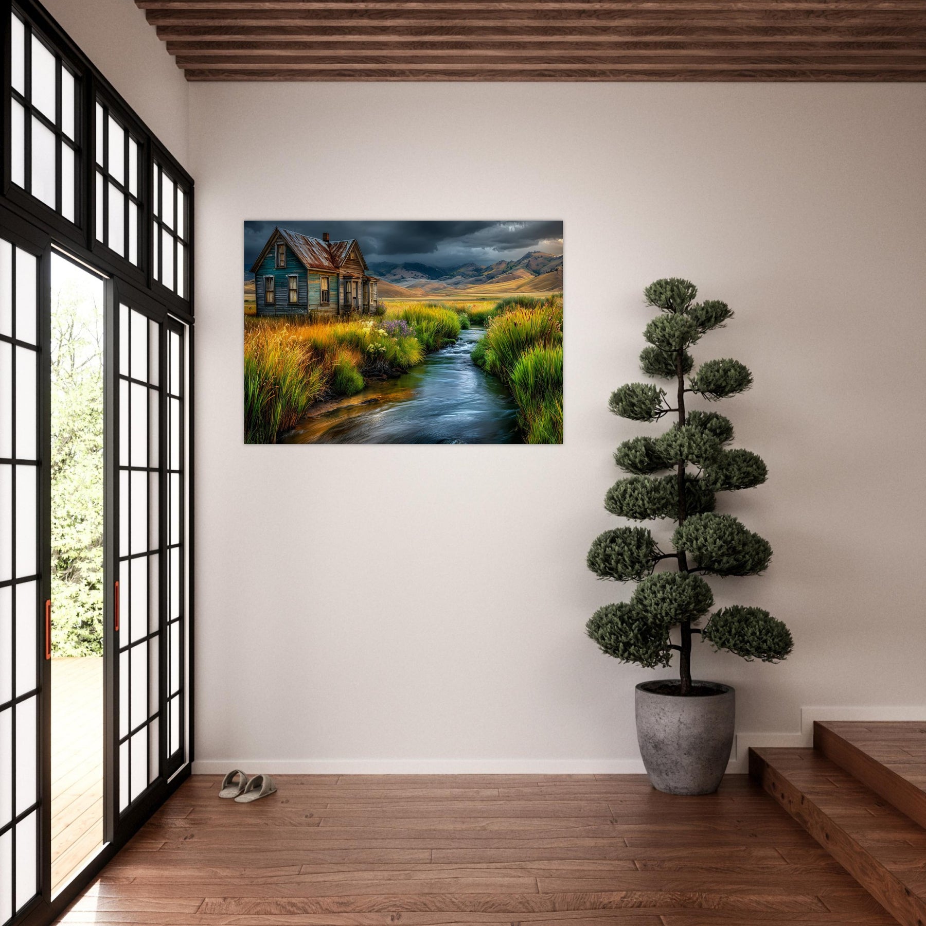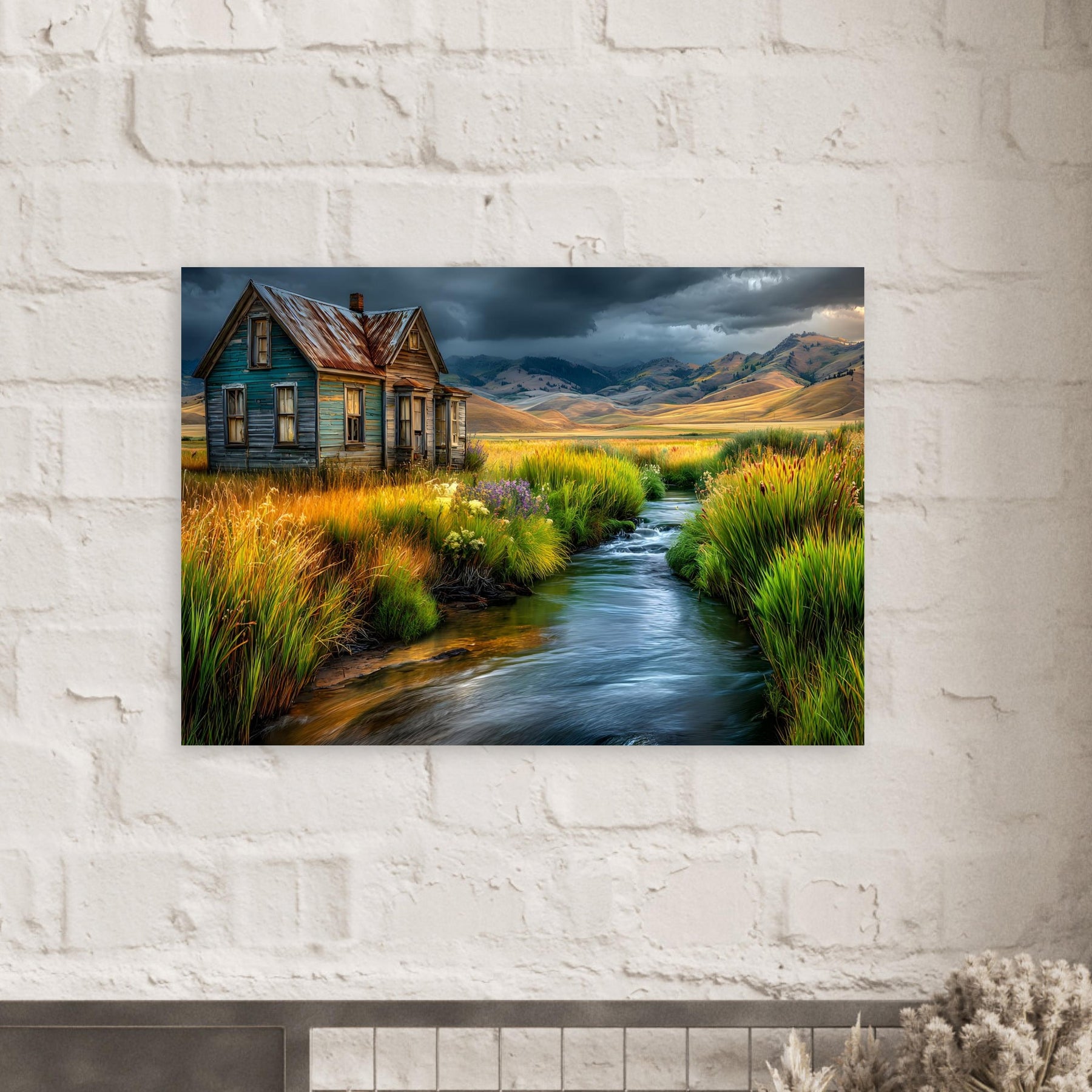 Transform your space with Whispers of the Past, a captivating aluminum wall art piece that blends rustic charm with peaceful natural beauty. This stunning artwork showcases an abandoned countryside house resting quietly beside a gentle stream, surrounded by tall grass, lush greenery, and majestic mountain terrain. The scene evokes a powerful sense of nostalgia, serenity, and timeless simplicity—perfect for anyone who loves nature-inspired décor.