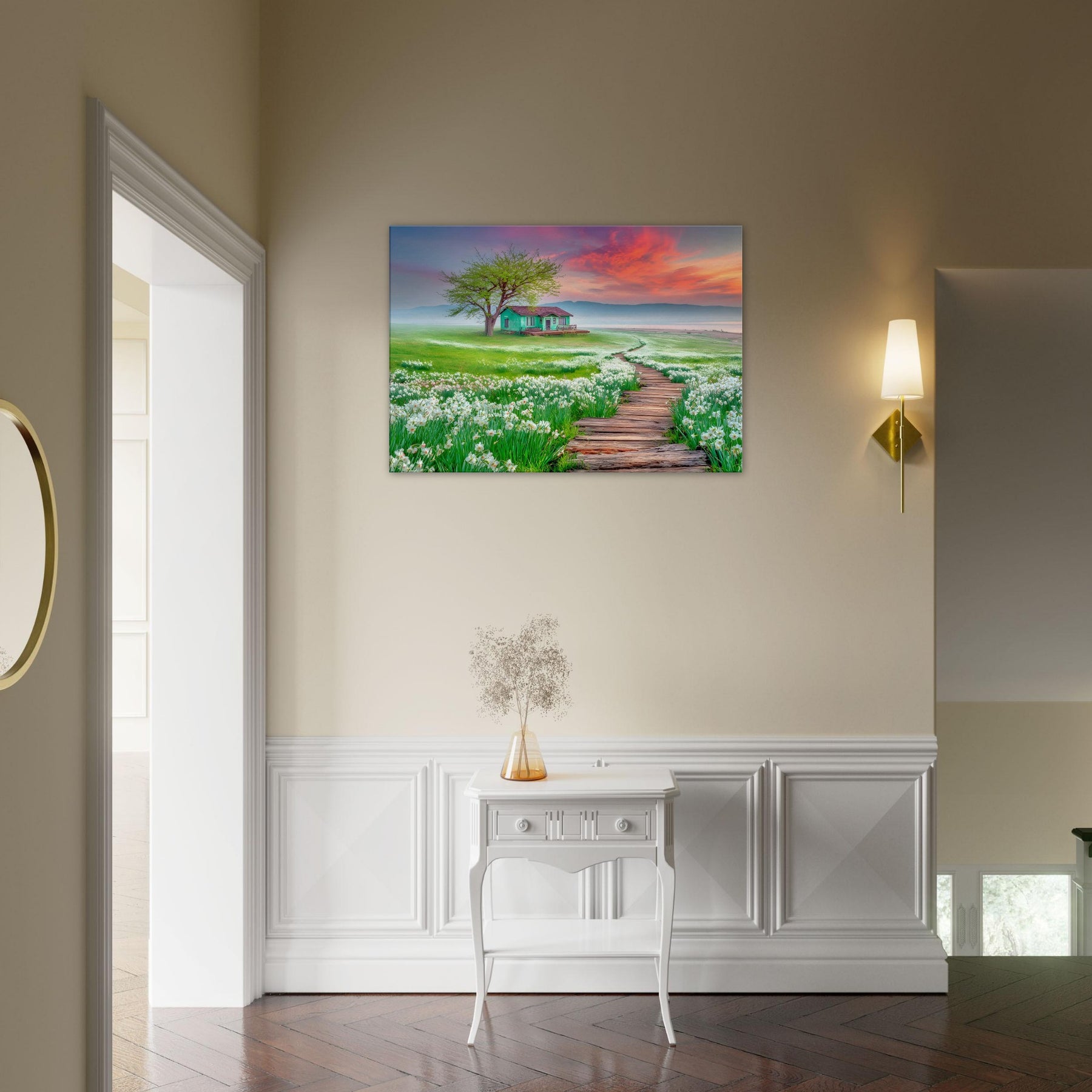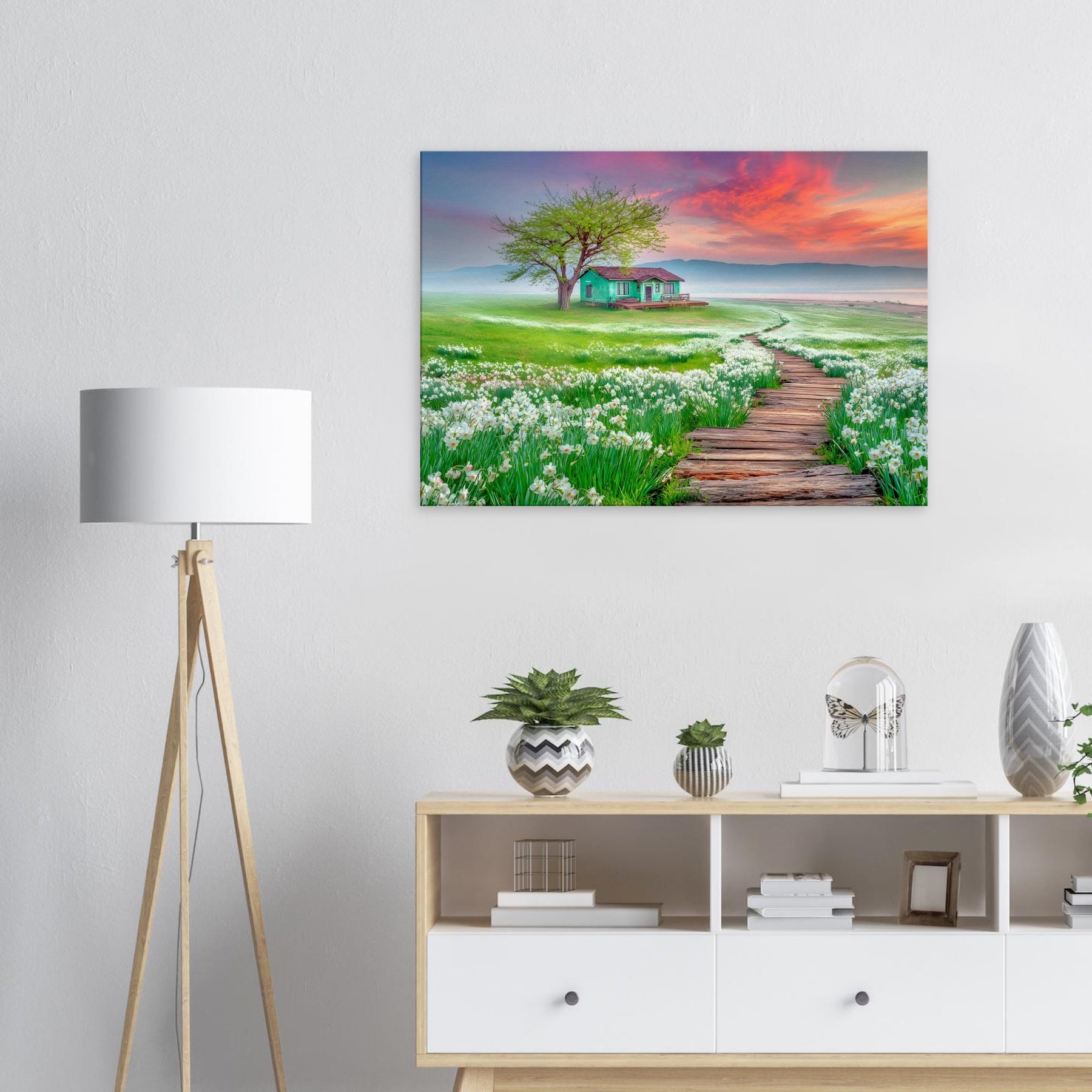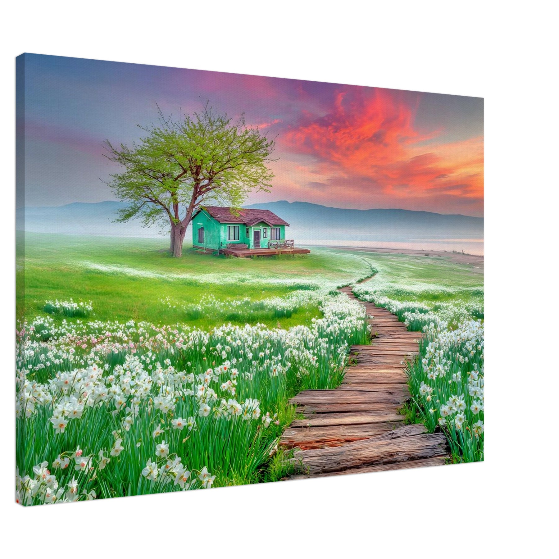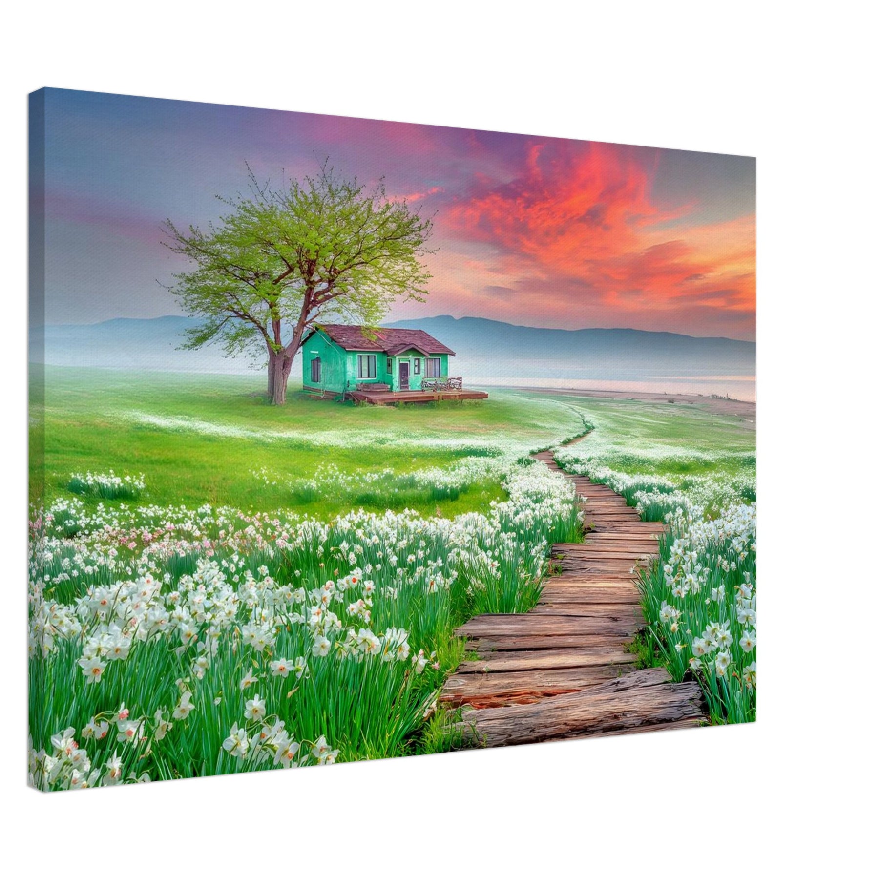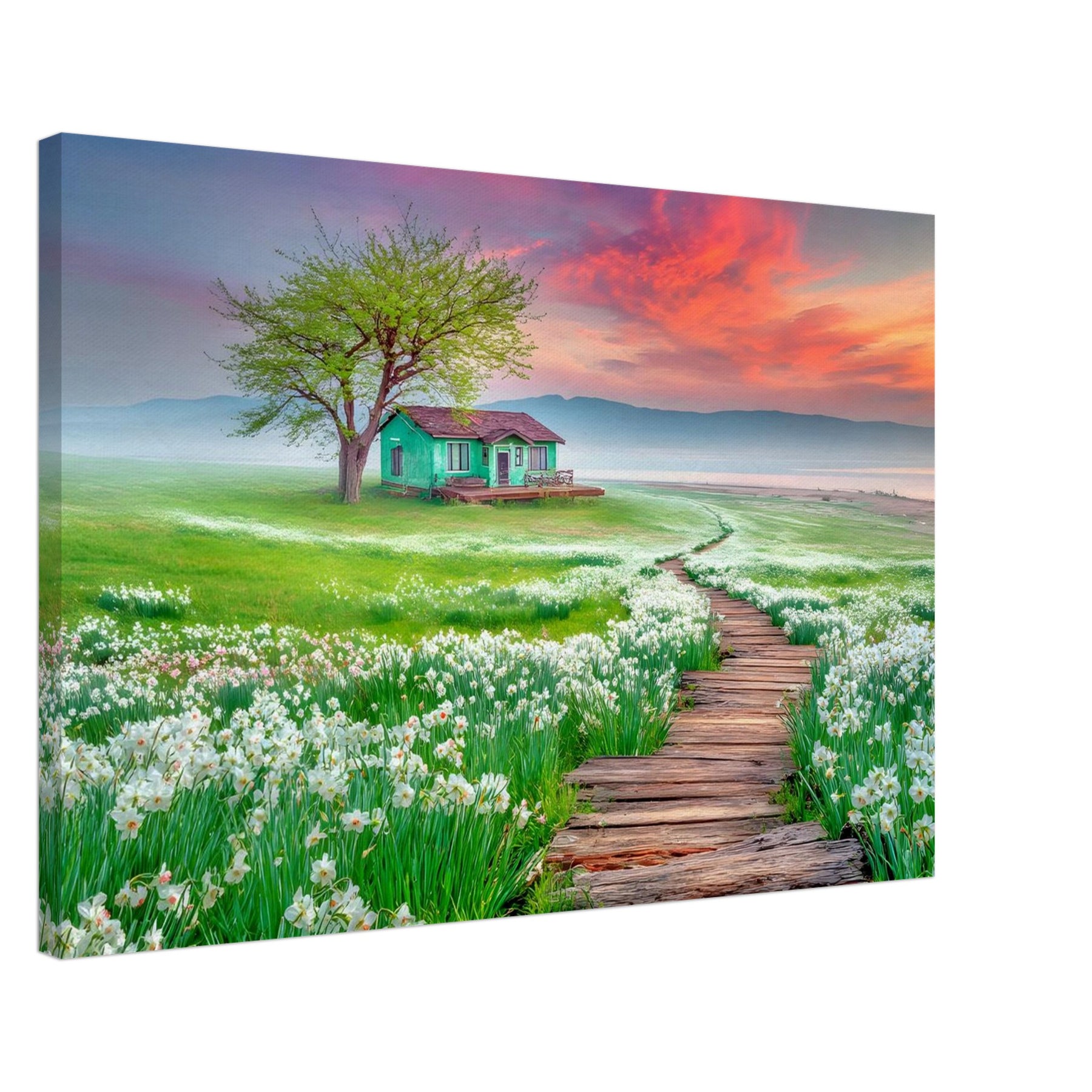 Bring timeless charm to your home with our Tranquil Green Cottage Canvas Wall Art. This serene landscape features a cozy green house surrounded by vibrant flowers beneath a radiant sunset. The textured canvas finish enhances warmth and depth, creating a calming focal point for any room.