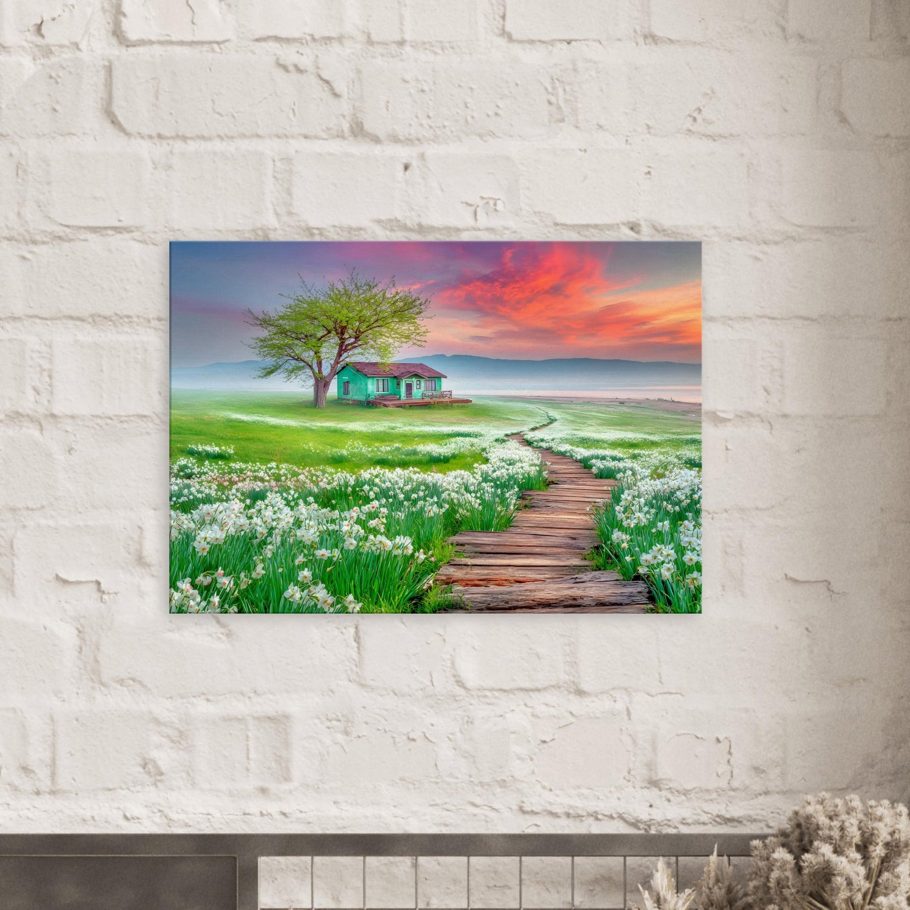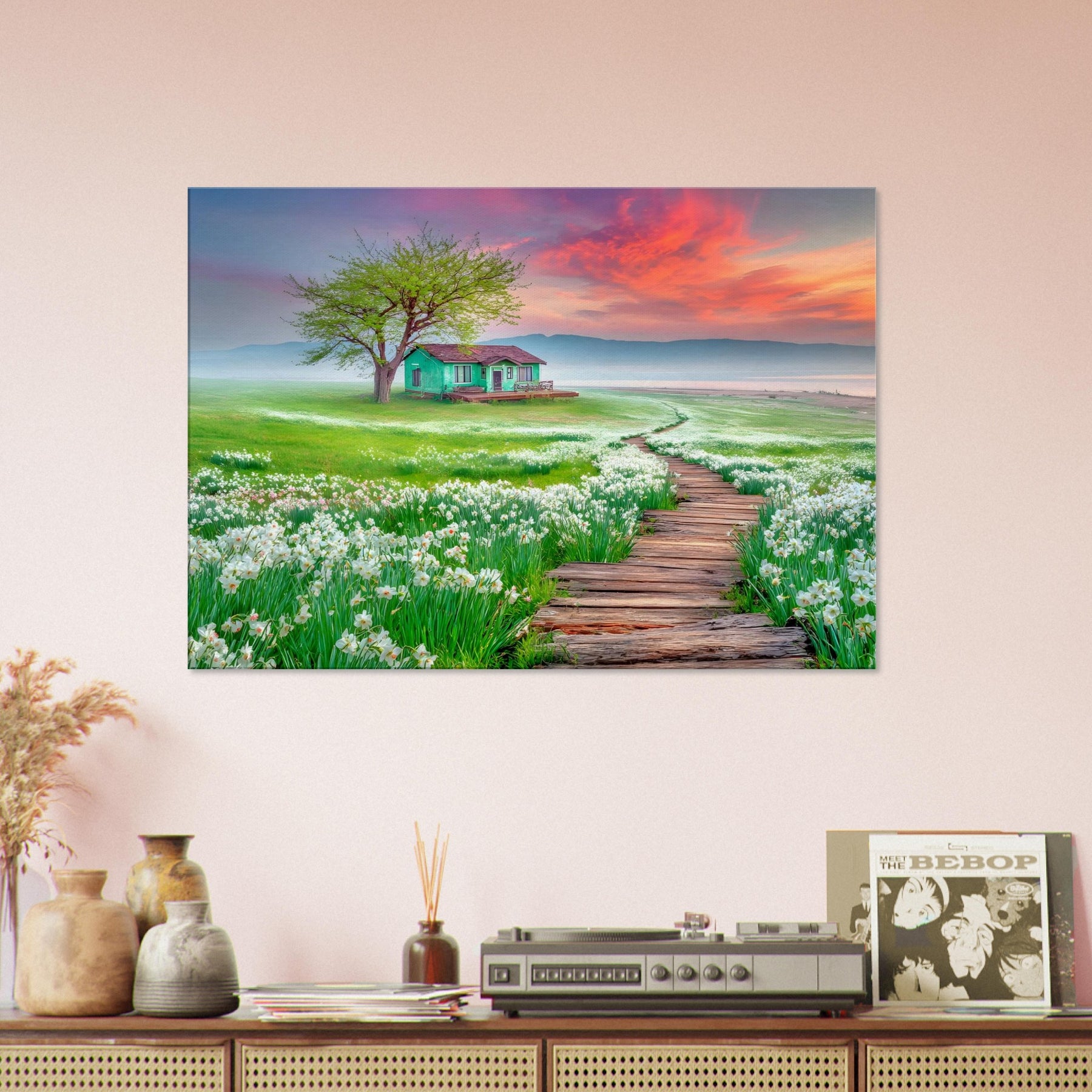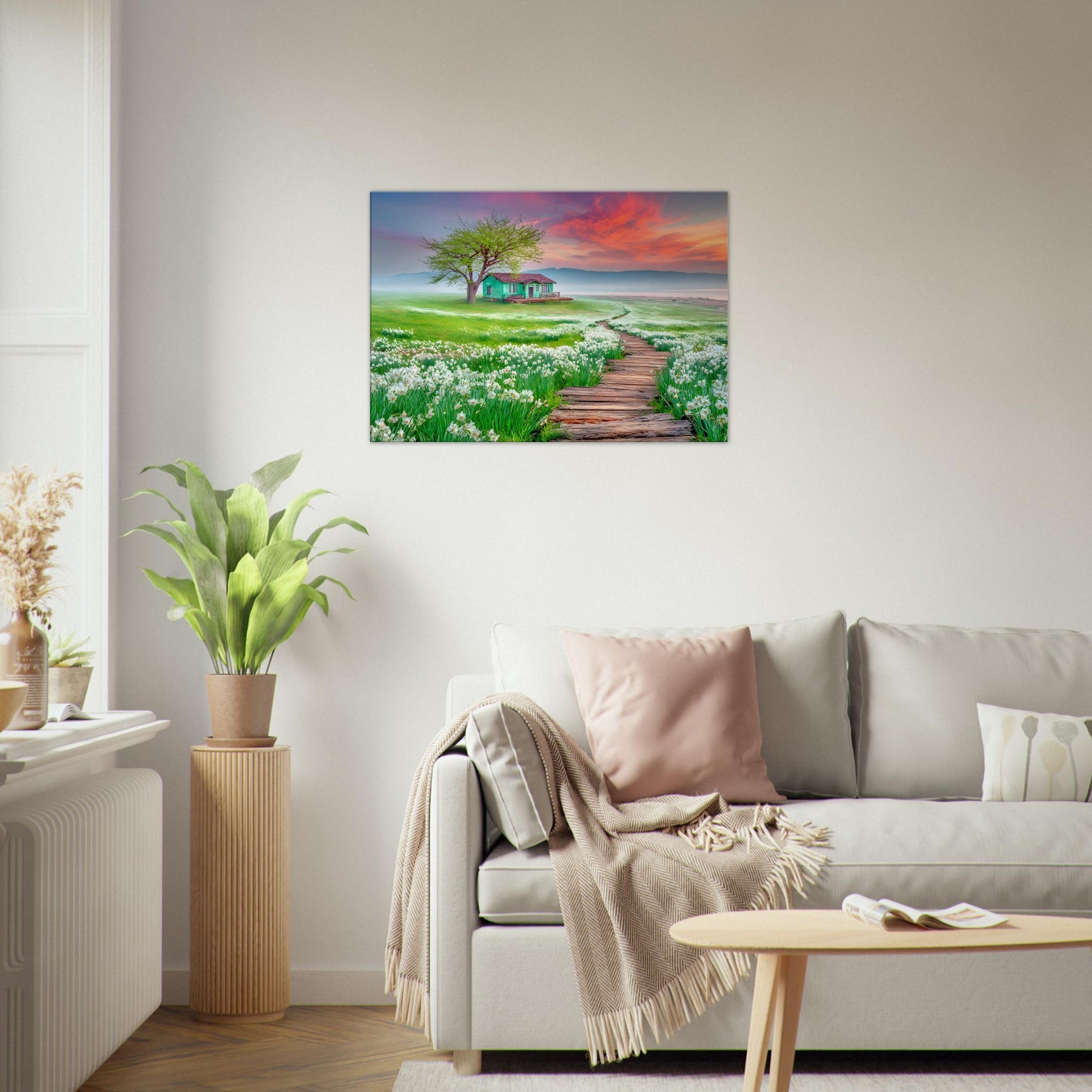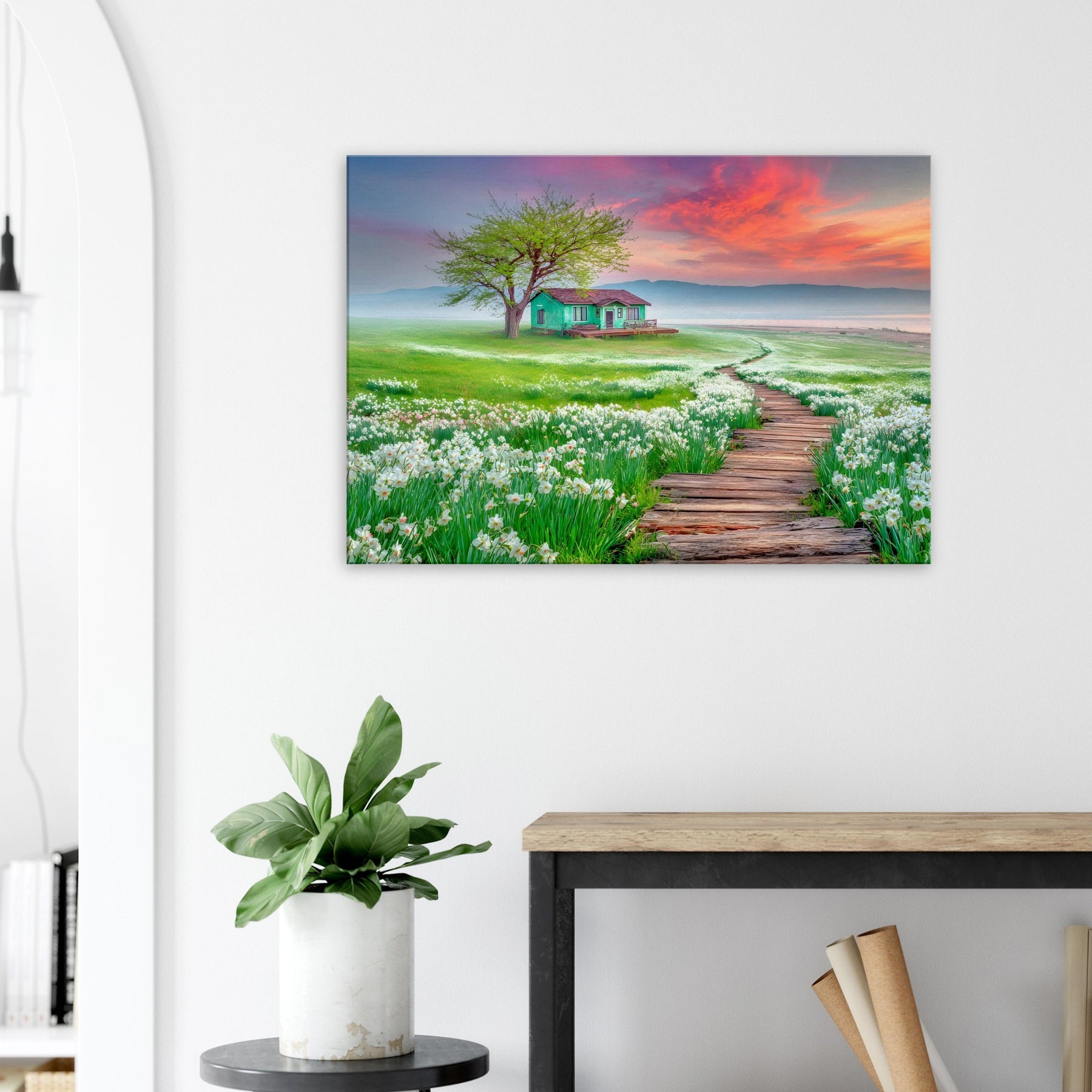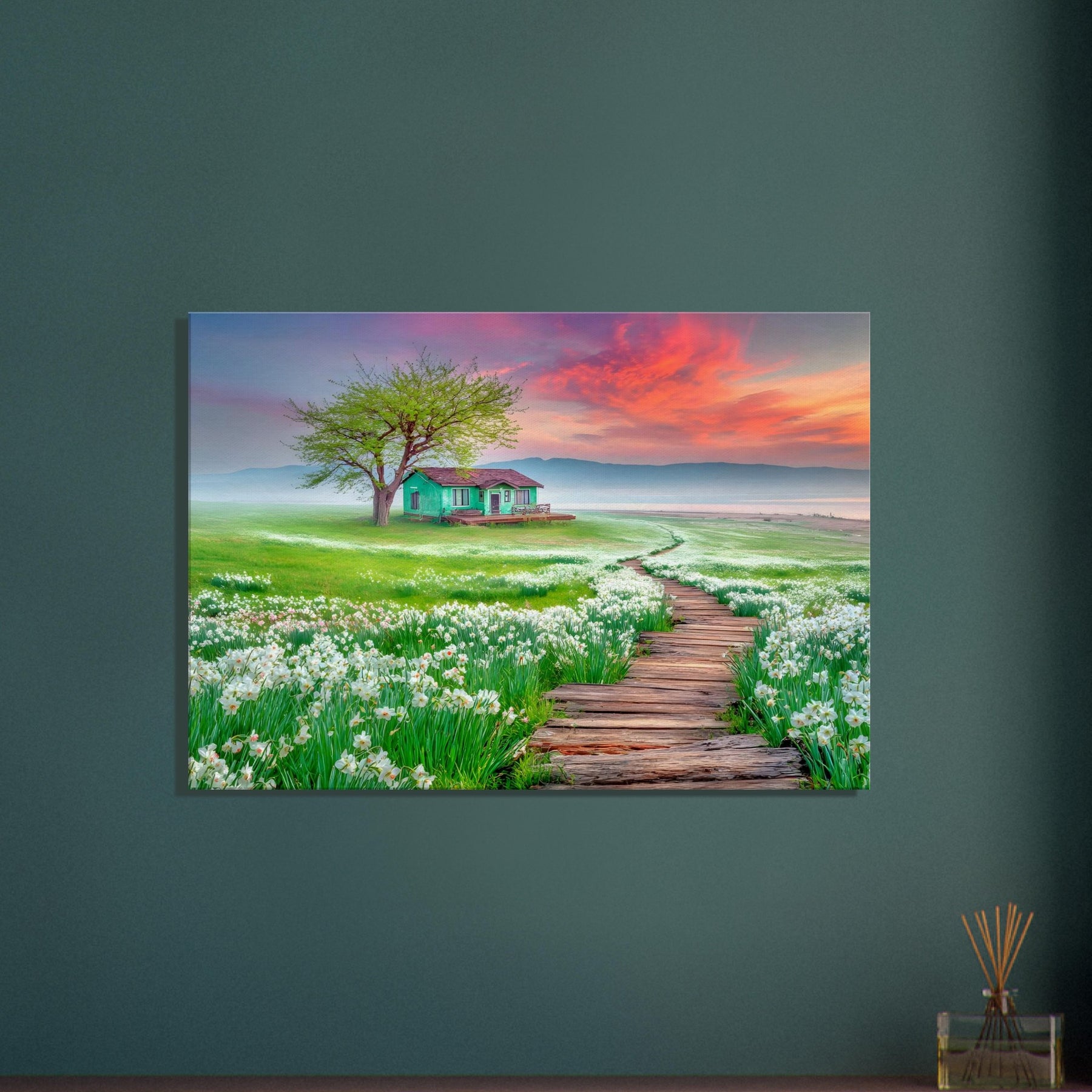 Bring timeless charm to your home with our Tranquil Green Cottage Canvas Wall Art. This serene landscape features a cozy green house surrounded by vibrant flowers beneath a radiant sunset. The textured canvas finish enhances warmth and depth, creating a calming focal point for any room.