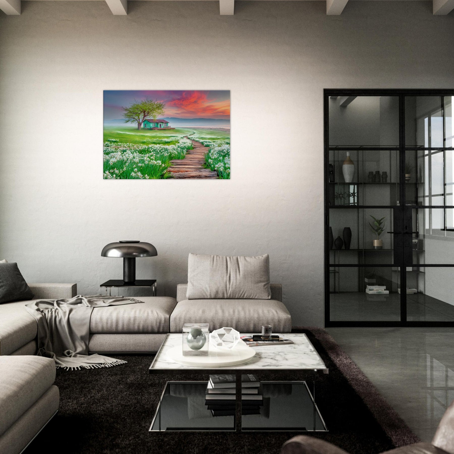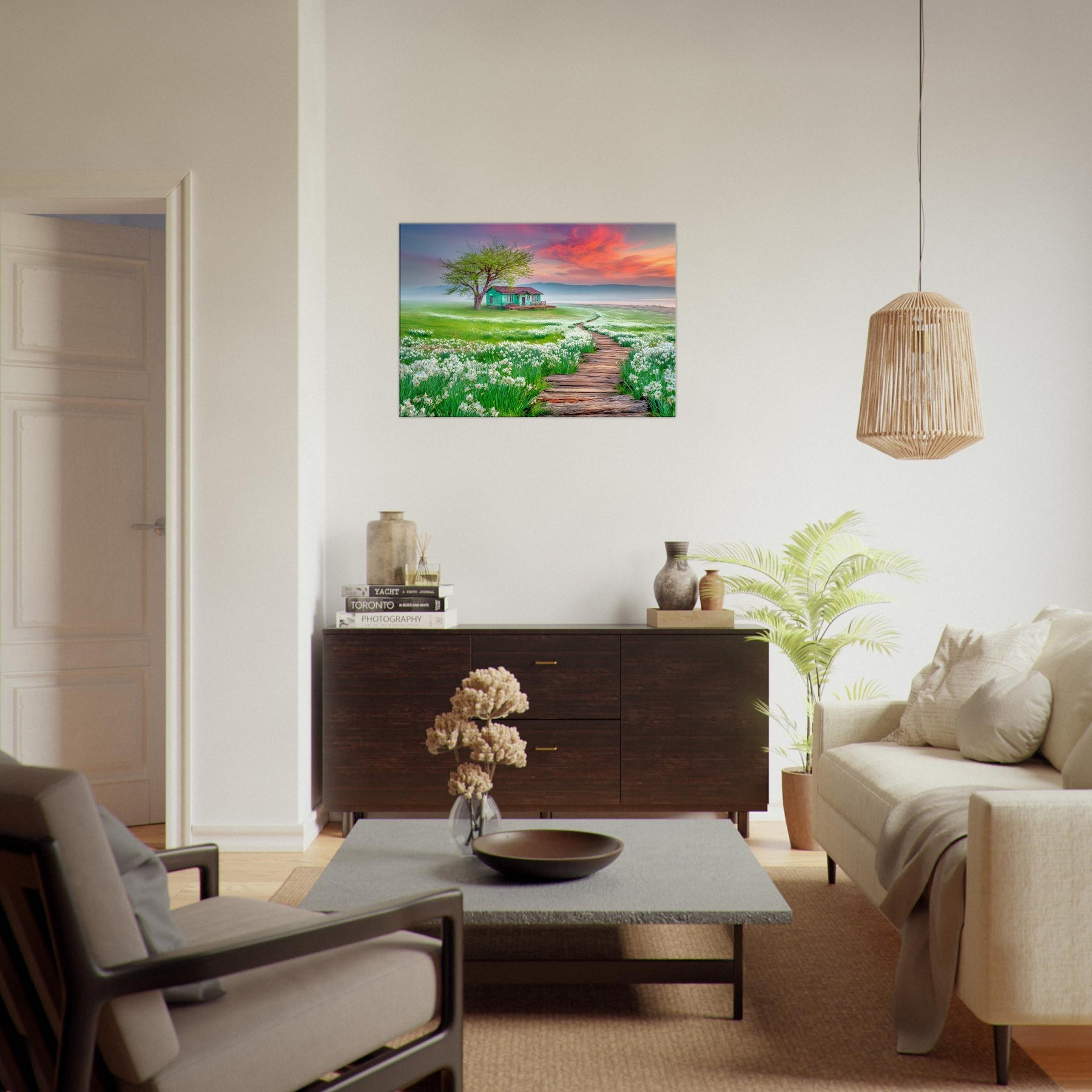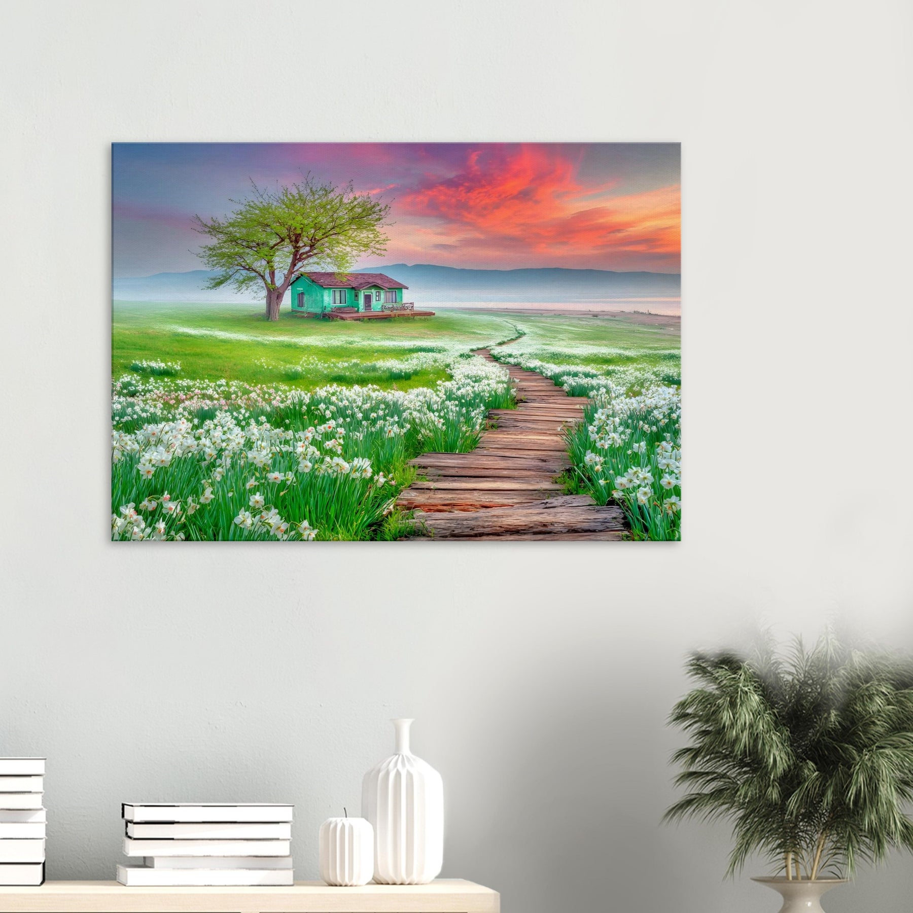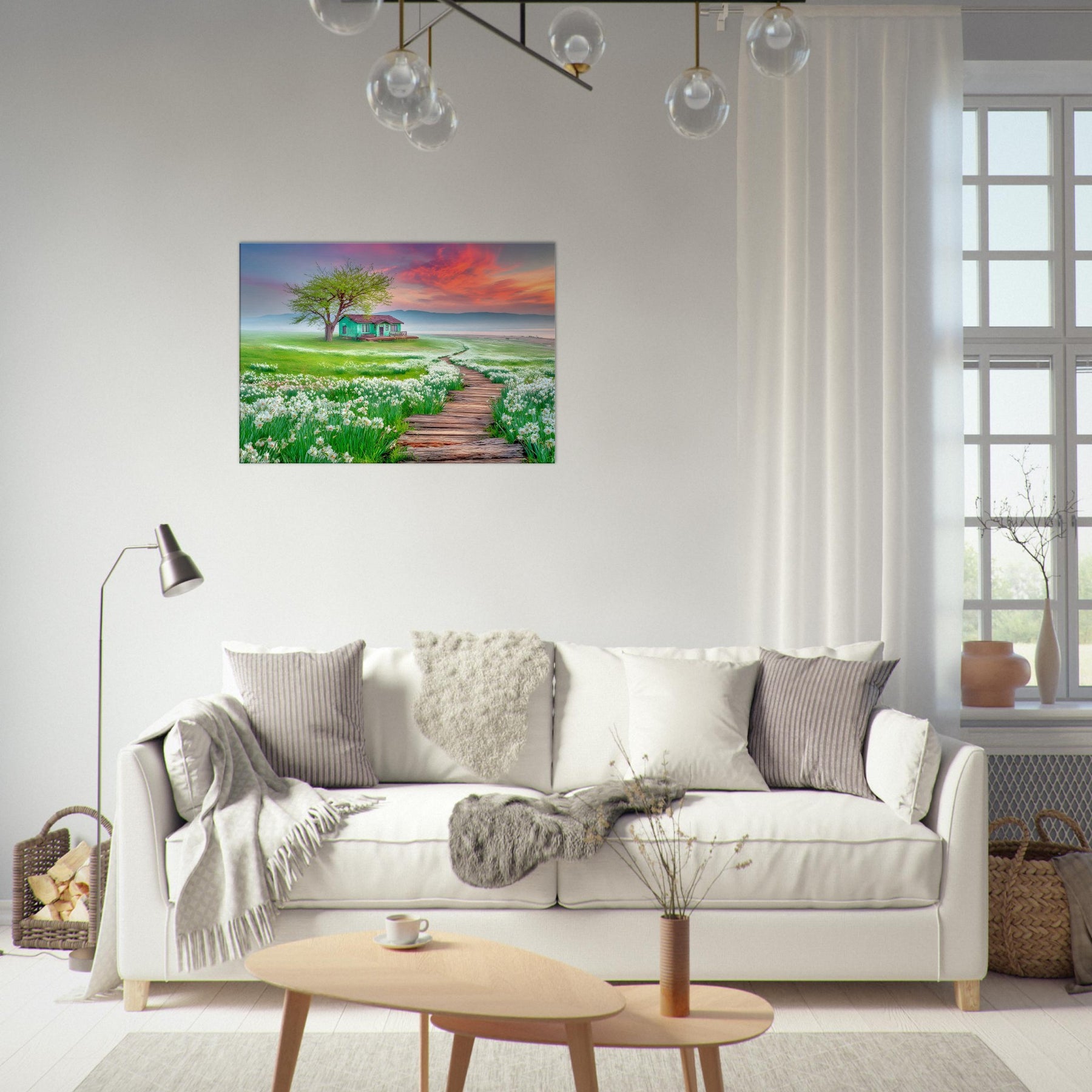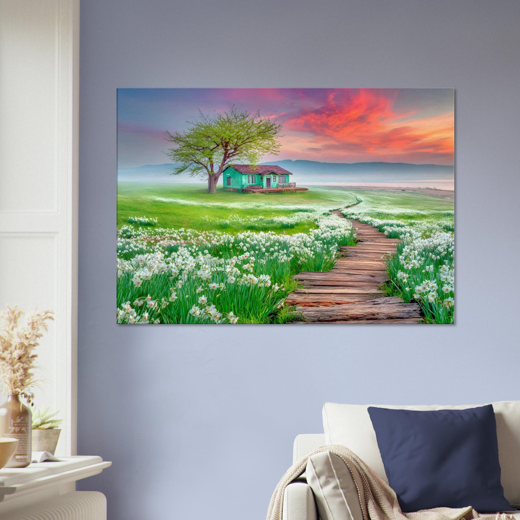 Bring timeless charm to your home with our Tranquil Green Cottage Canvas Wall Art. This serene landscape features a cozy green house surrounded by vibrant flowers beneath a radiant sunset. The textured canvas finish enhances warmth and depth, creating a calming focal point for any room.