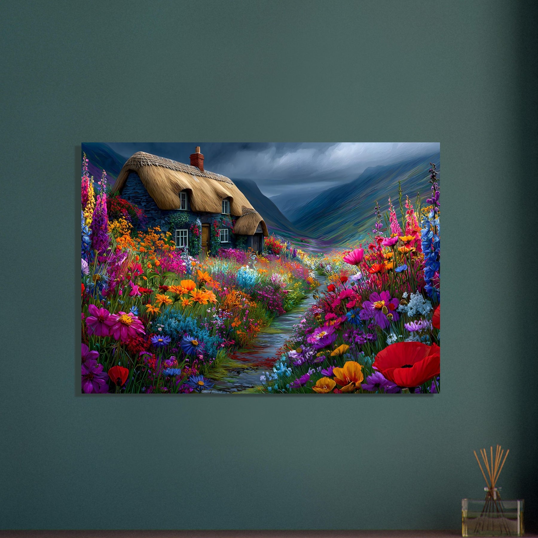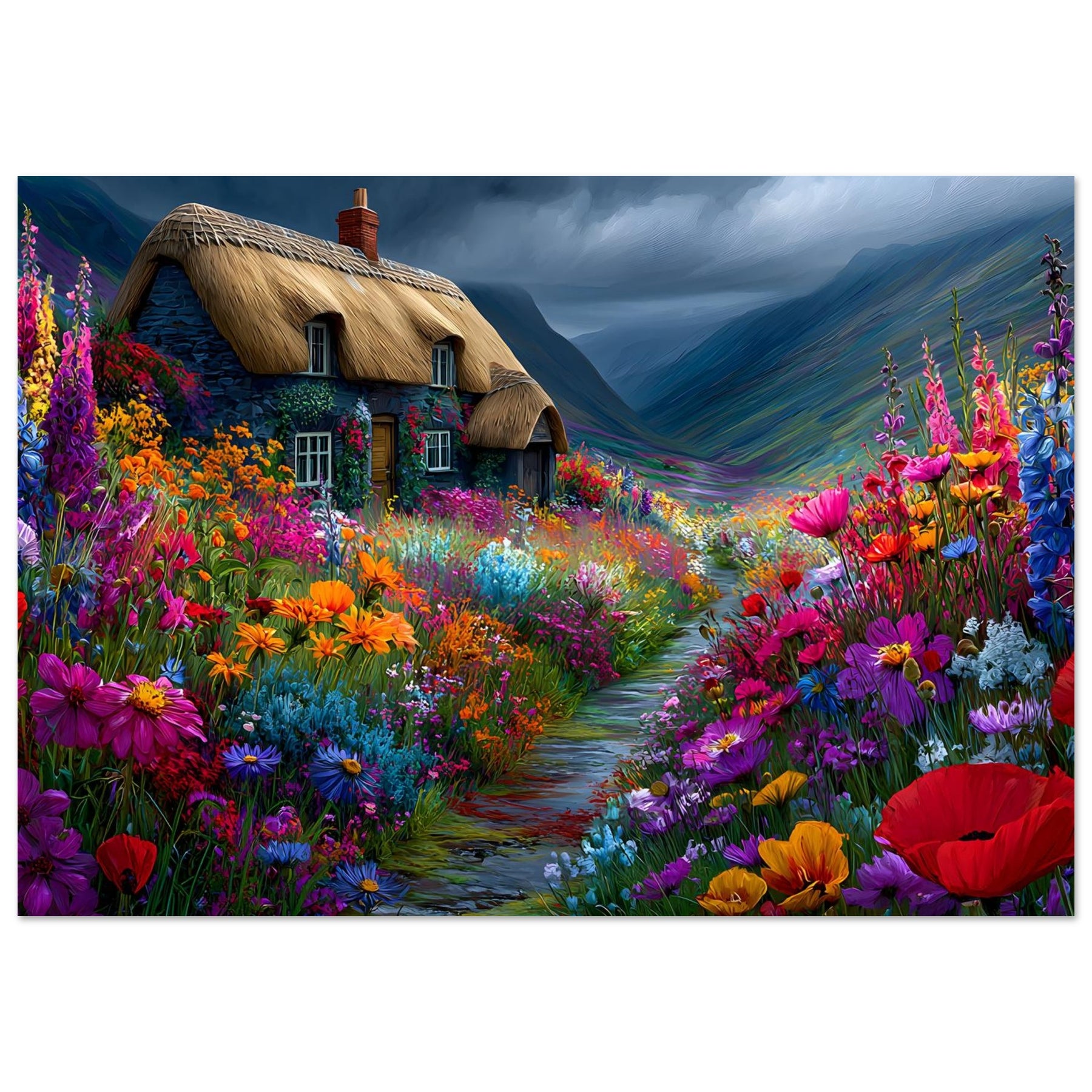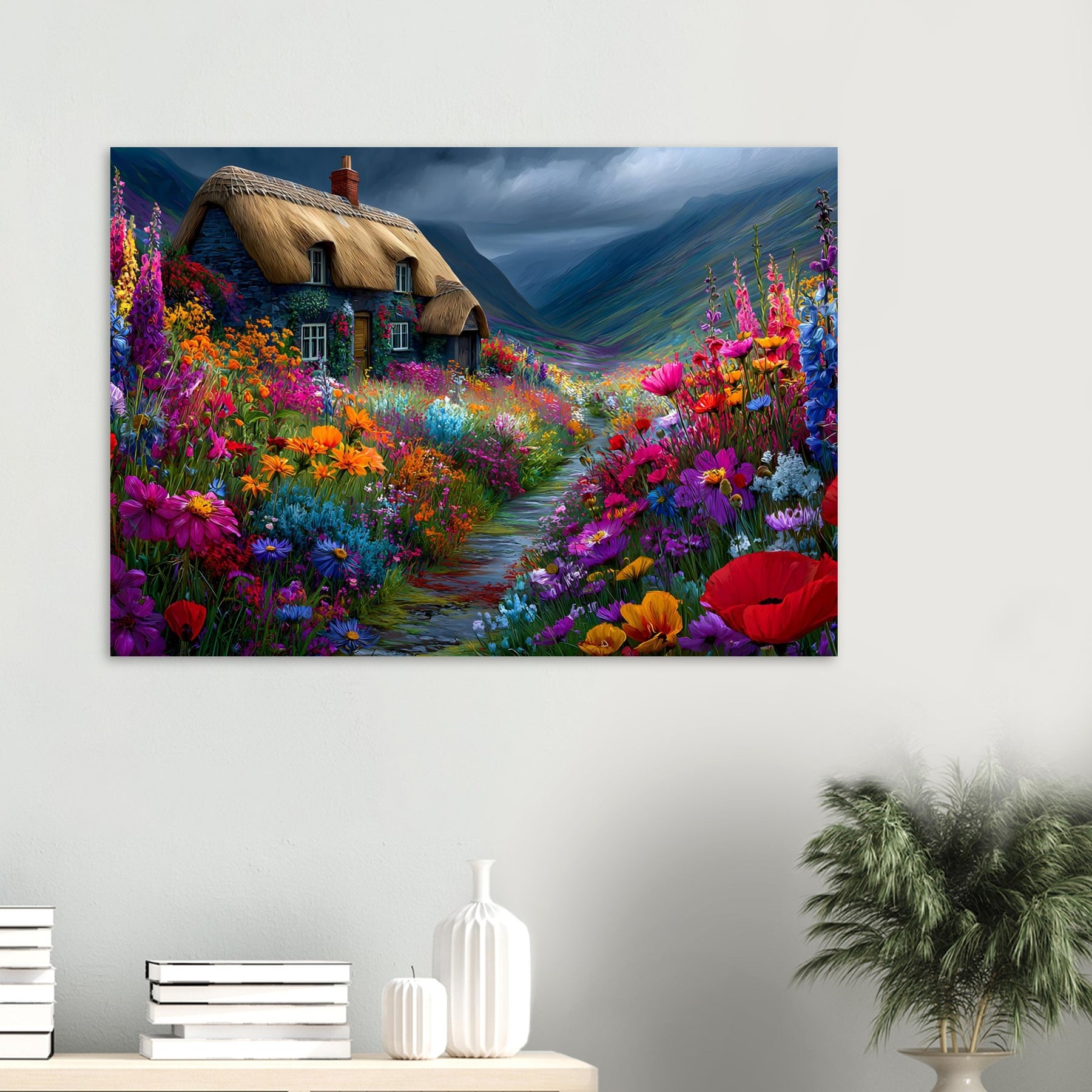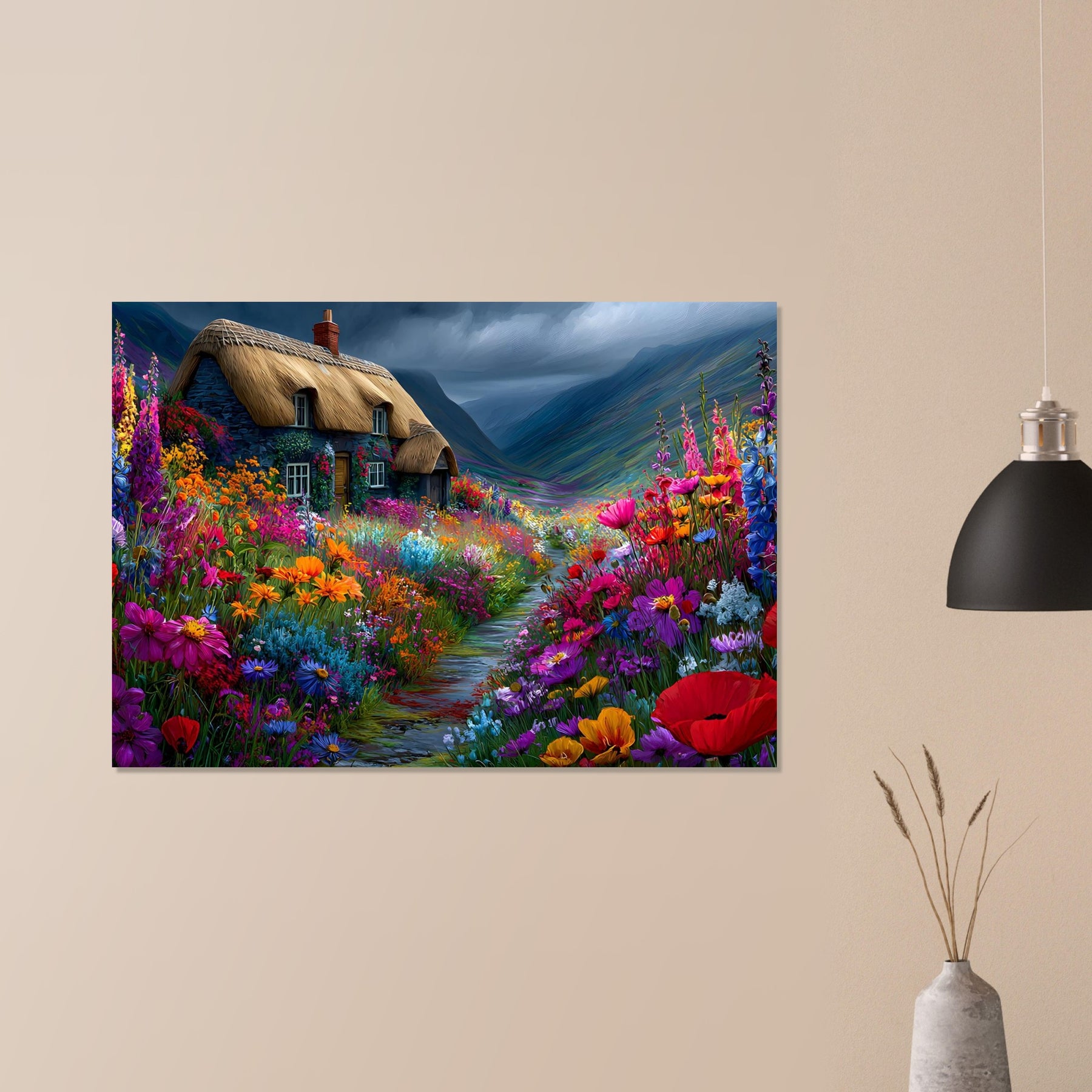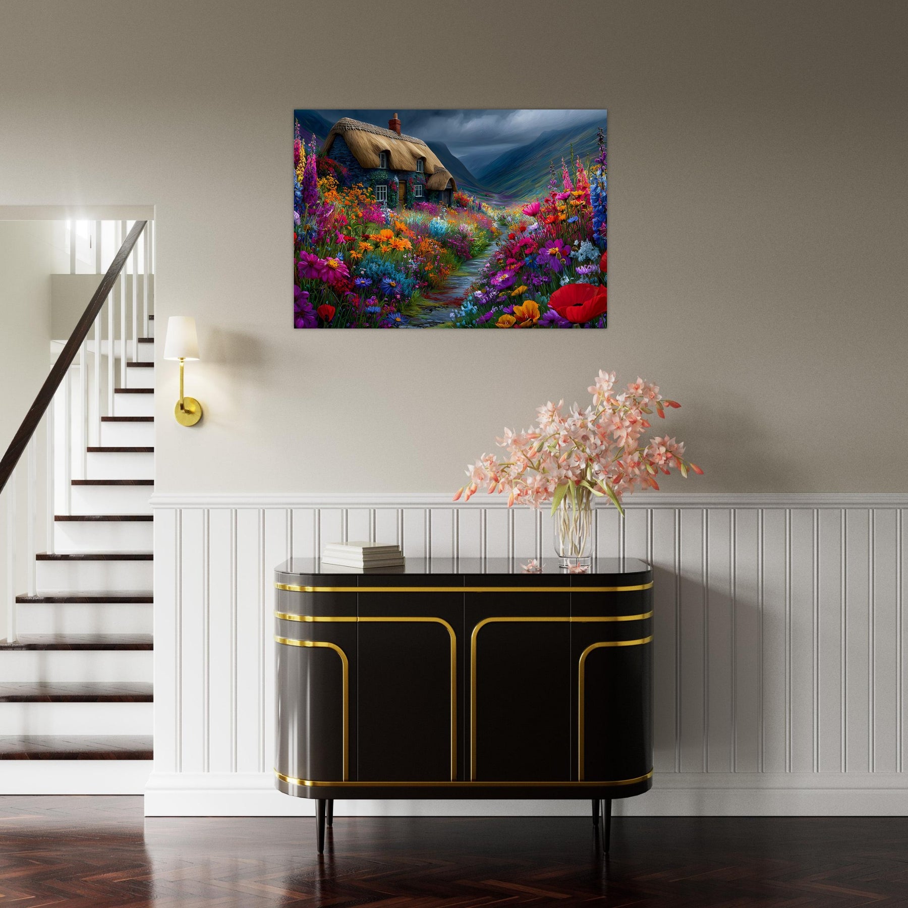 Refresh your space with Wildflower Cottage Calm, a lightweight foam wall art piece inspired by peaceful countryside living. A lovely thatched cottage surrounded by blooming wildflowers under an expressive sky creates a calming and welcoming atmosphere.