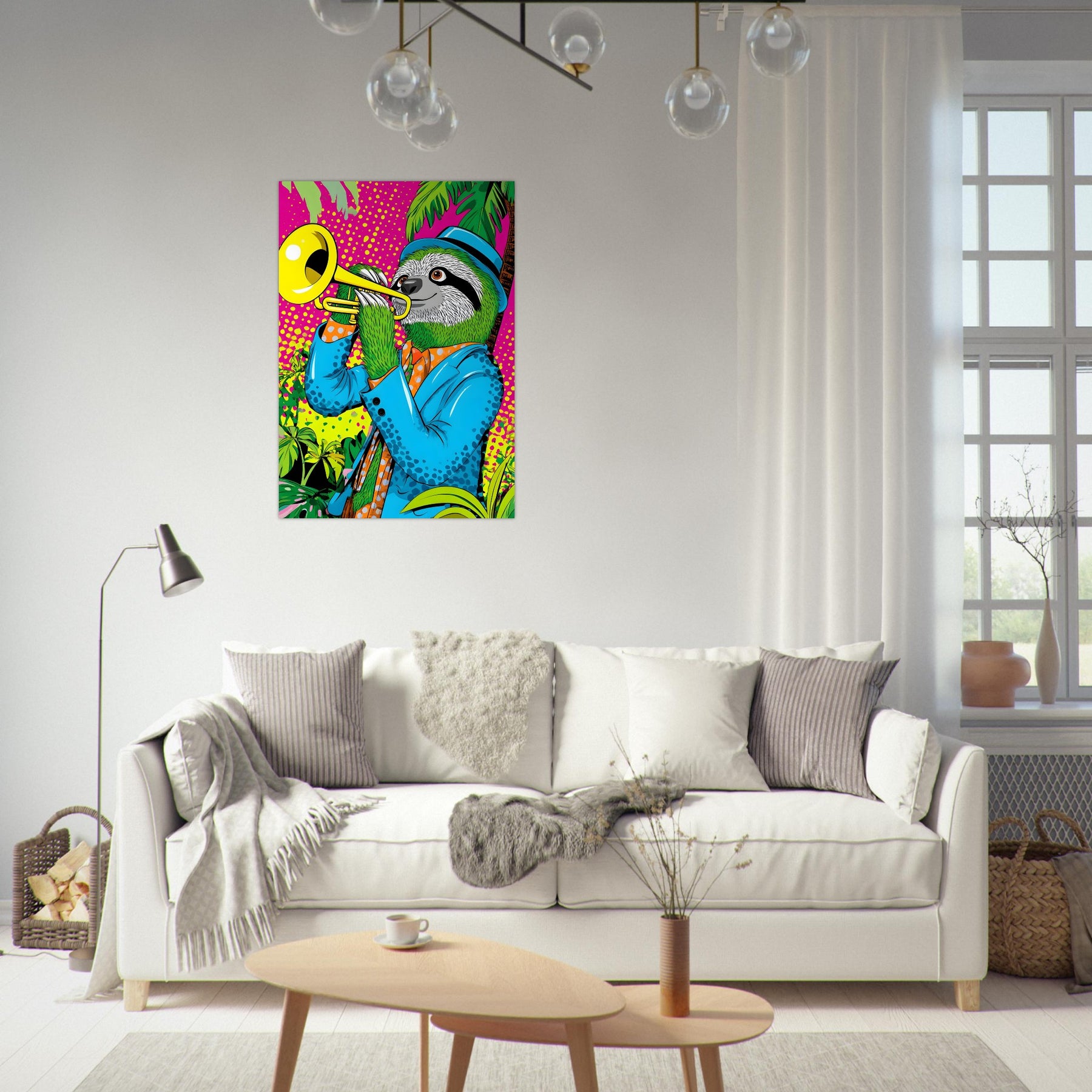 Bring rhythm and charm into your space with Lazy Jazz Sloth, a vibrant pop art aluminum wall art featuring a stylish sloth playing a trumpet in a bright, colorful jungle setting. The playful composition blends relaxed vibes with musical energy, creating a joyful and uplifting atmosphere.
