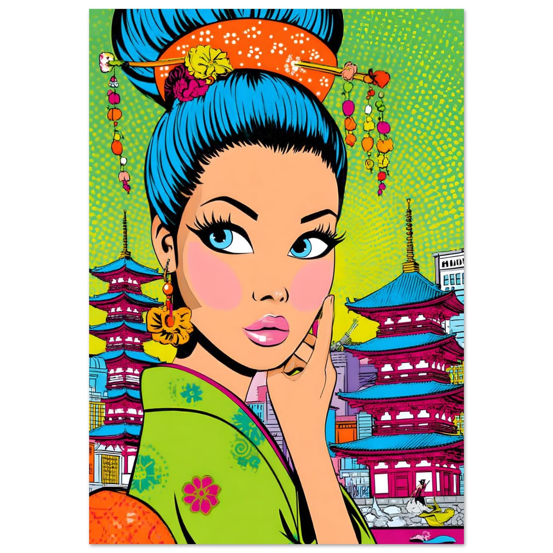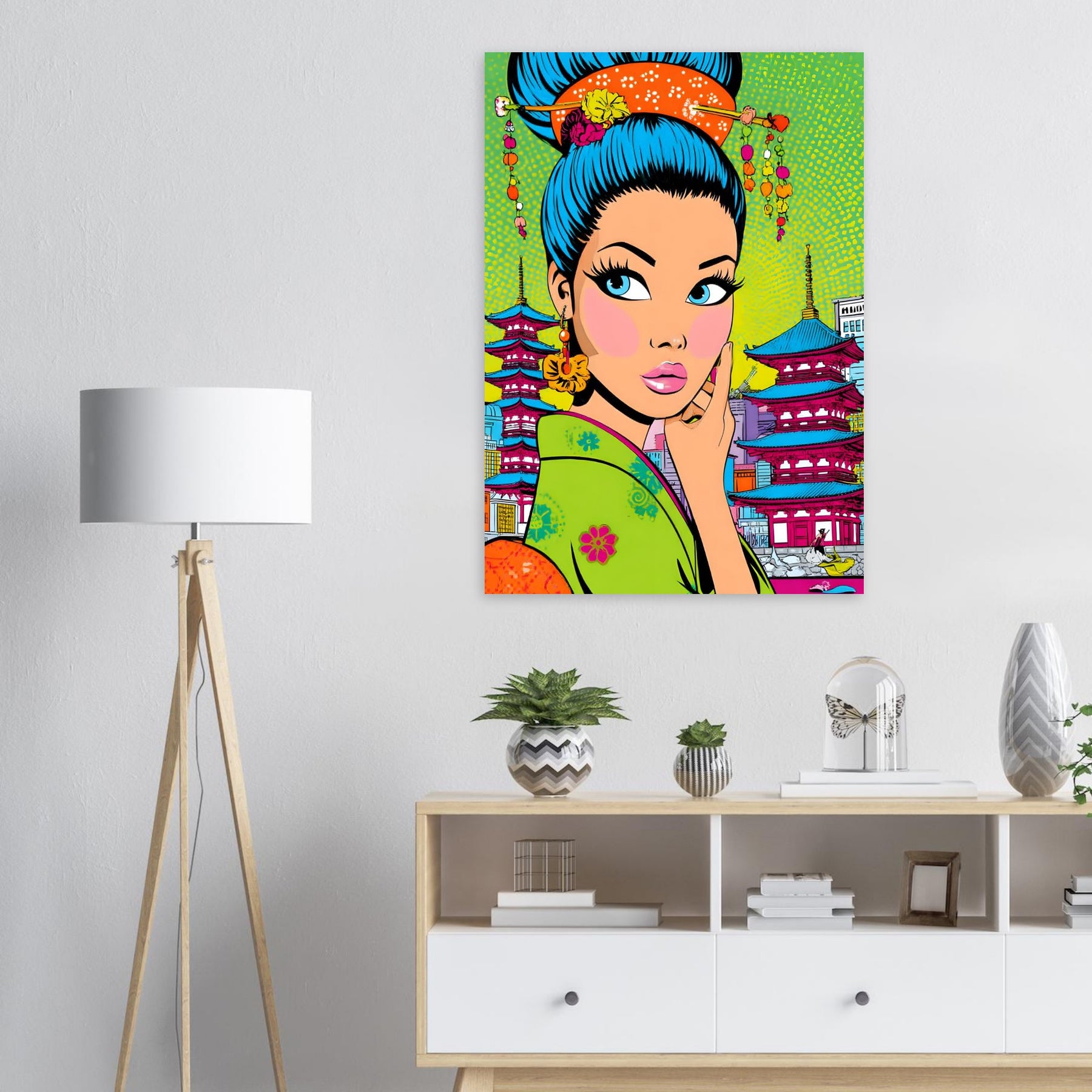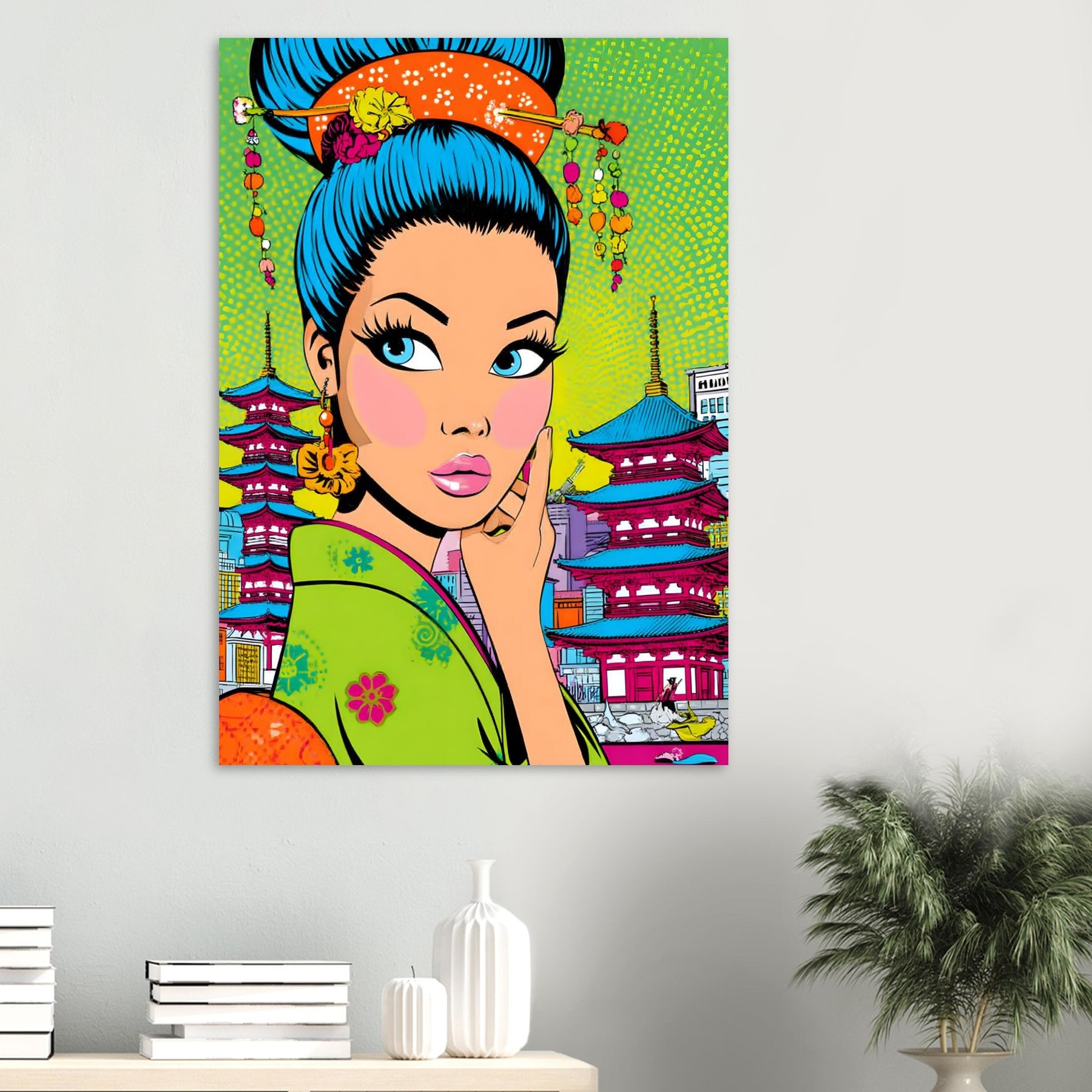 Add bold culture and modern flair to your space with Neon Geisha City, a striking pop art aluminum wall art featuring a vibrant geisha with eye-catching blue hair set against a colorful backdrop of pagodas and a lively cityscape. The fusion of tradition and contemporary design creates a powerful and stylish visual statement.
