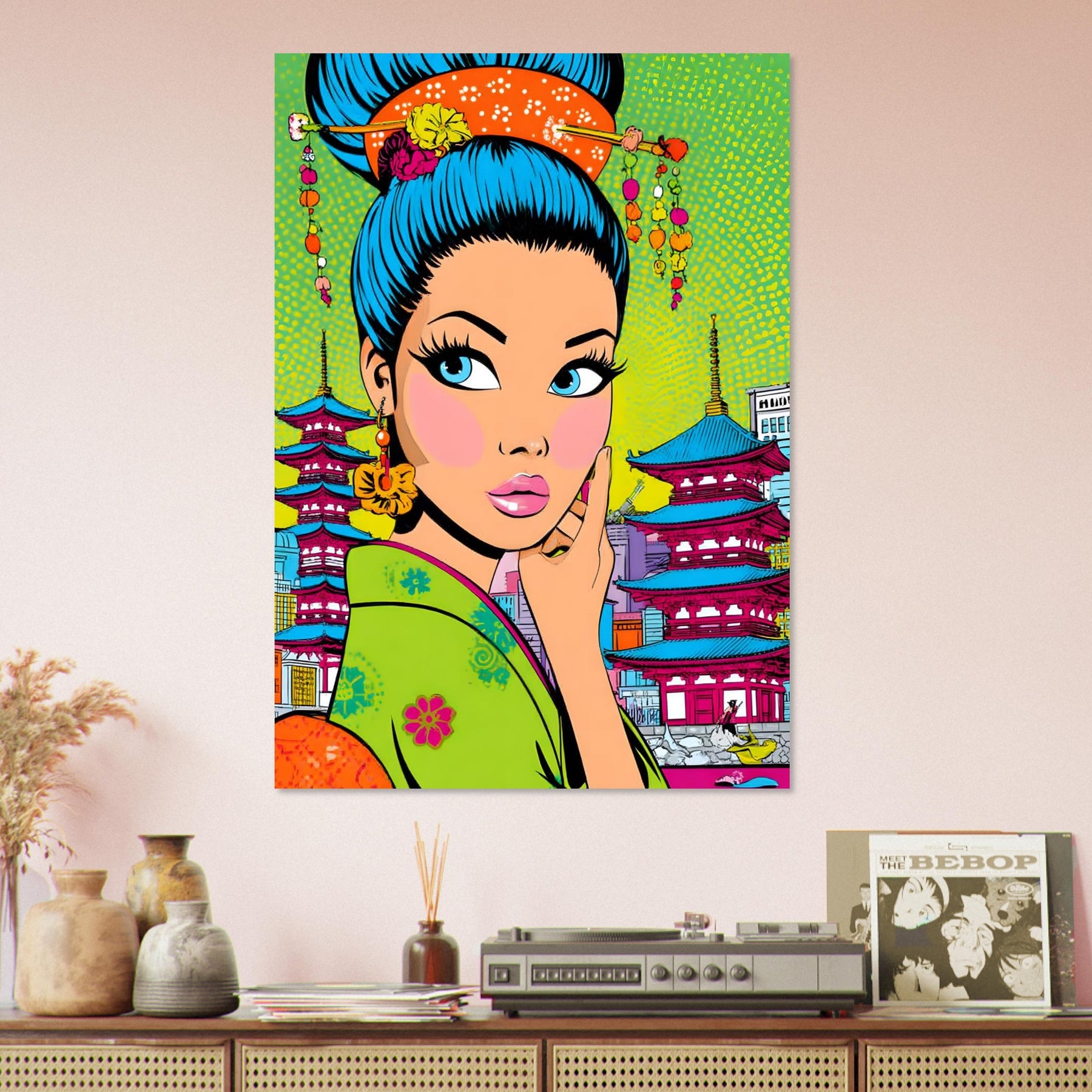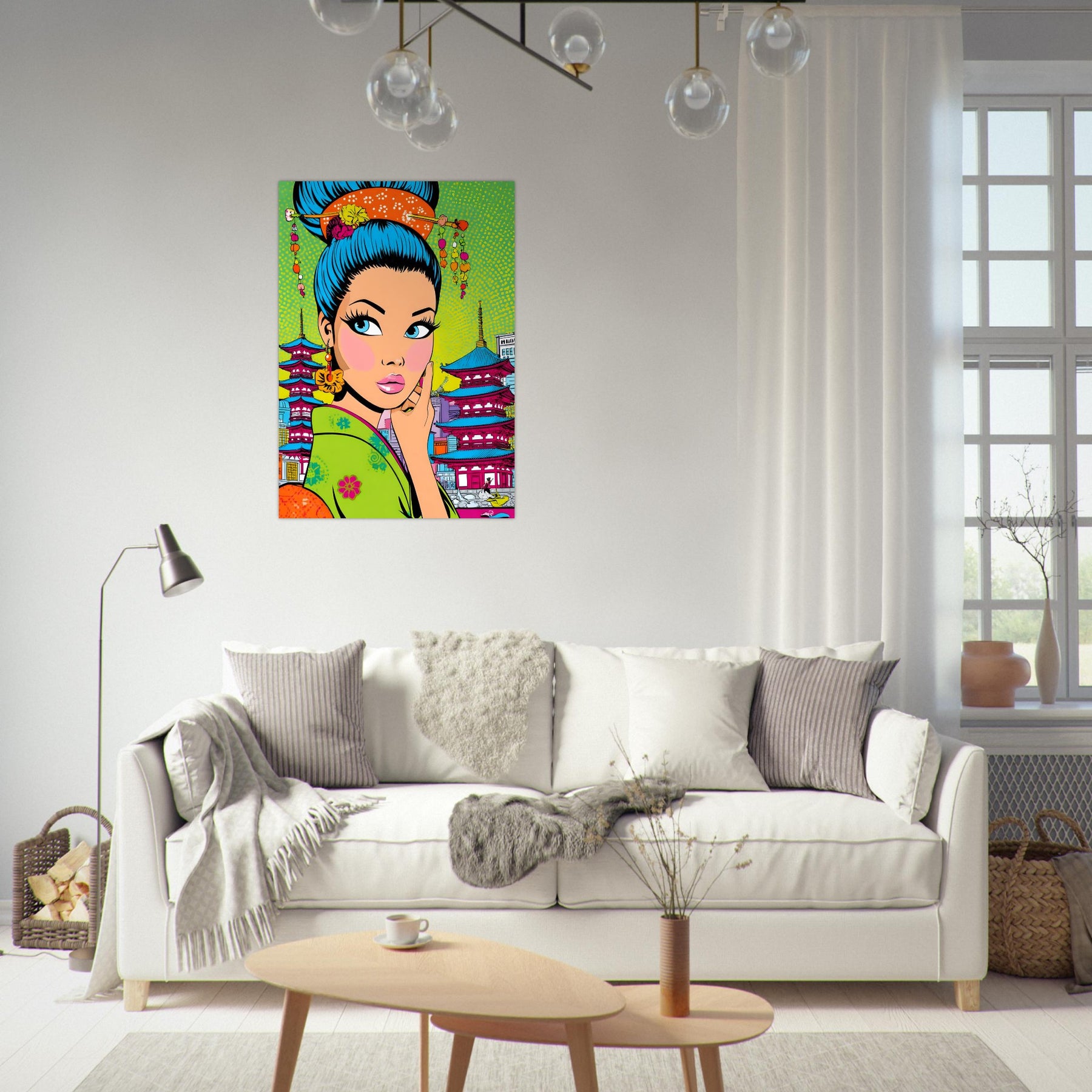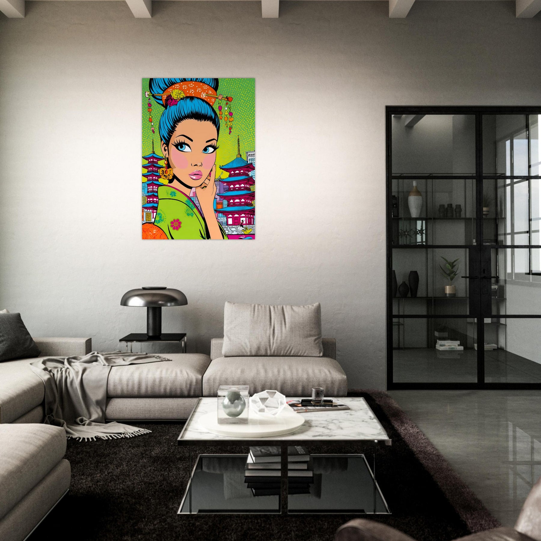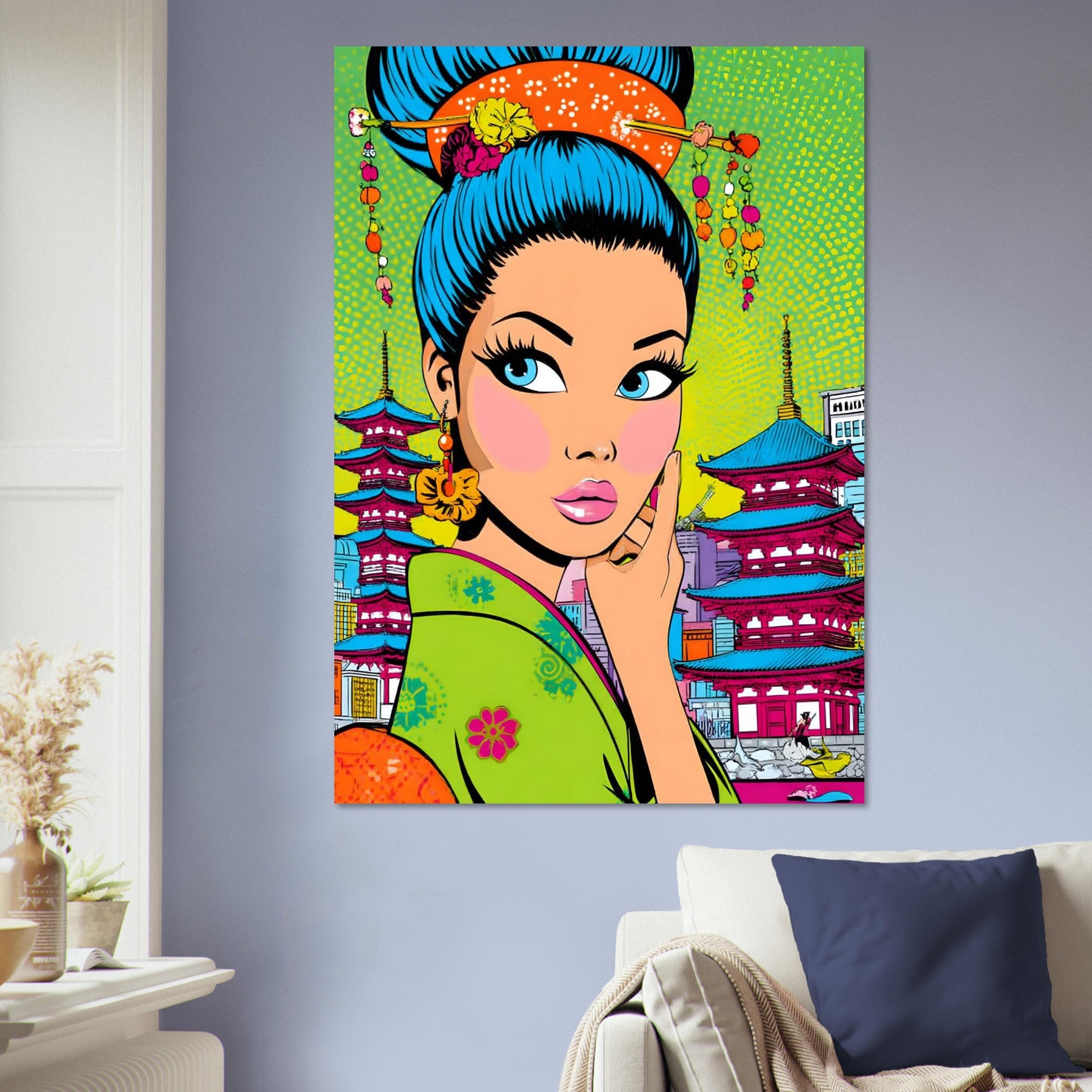 Add bold culture and modern flair to your space with Neon Geisha City, a striking pop art aluminum wall art featuring a vibrant geisha with eye-catching blue hair set against a colorful backdrop of pagodas and a lively cityscape. The fusion of tradition and contemporary design creates a powerful and stylish visual statement.