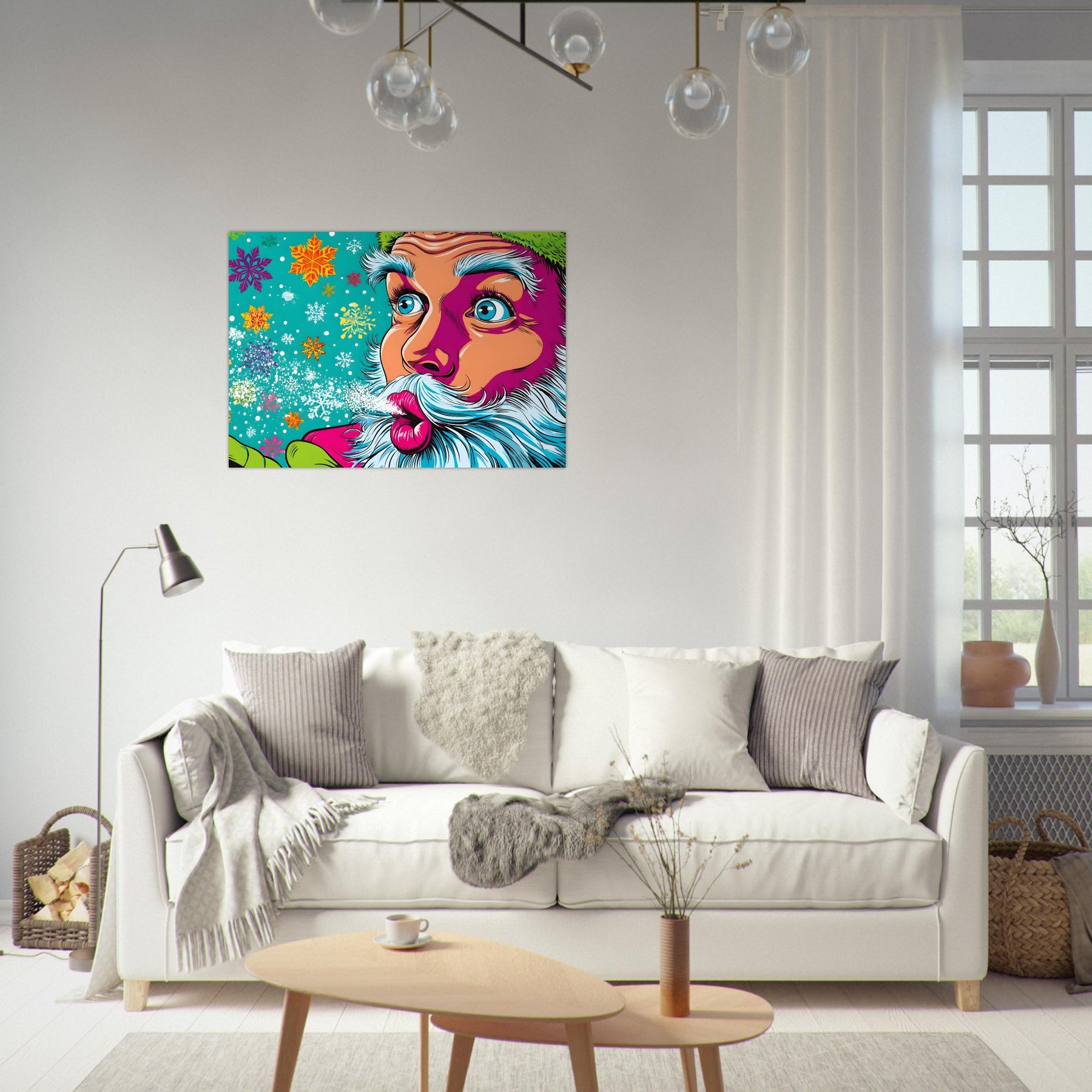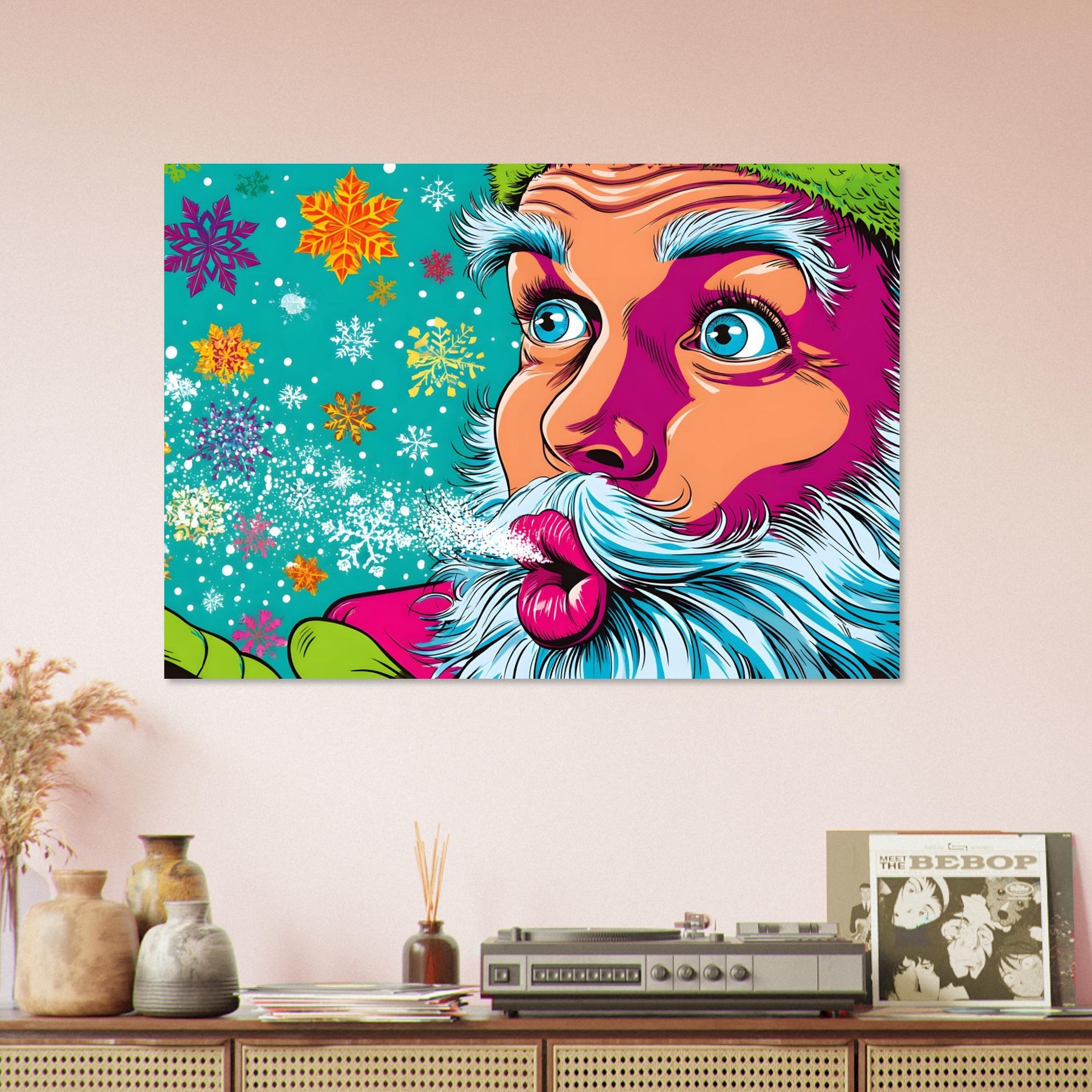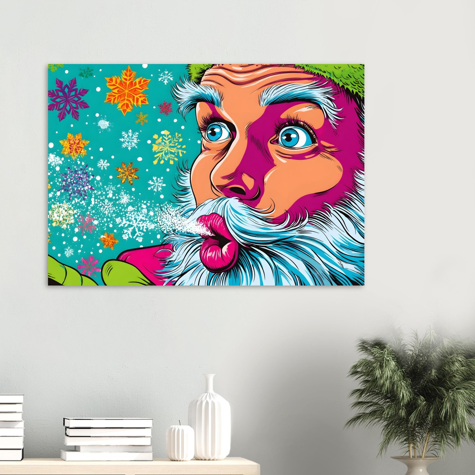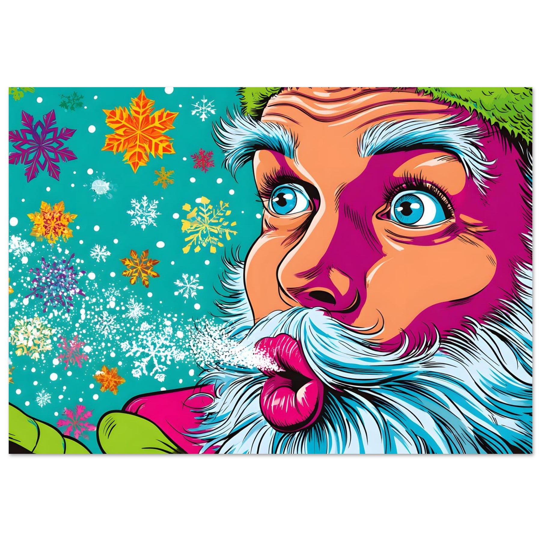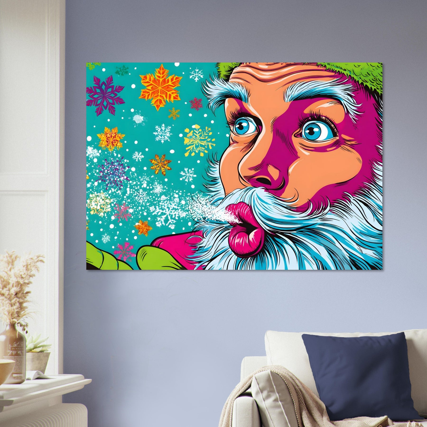 Bring festive joy and bold color into your space with Snowflake Santa Pop, a vibrant pop art aluminum wall art showcasing a stylized Santa Claus blowing playful snowflakes. Set against a bright blue background filled with colorful snowflakes and twinkling stars, the artwork radiates holiday cheer with a fun, modern pop art twist.
